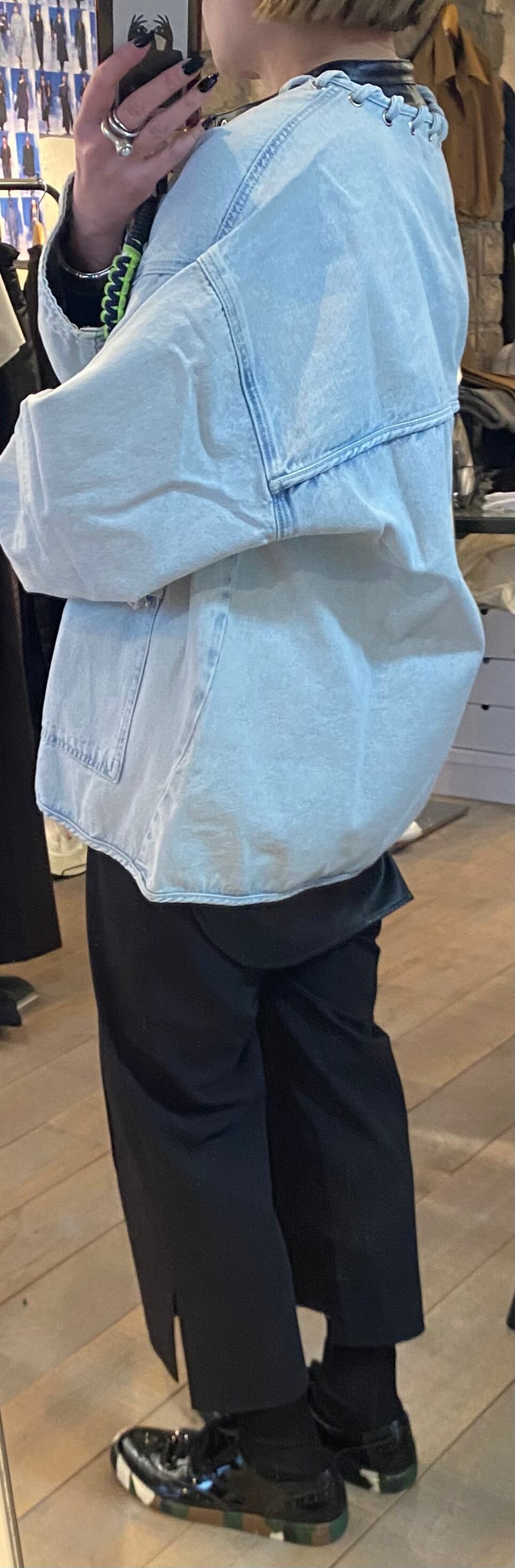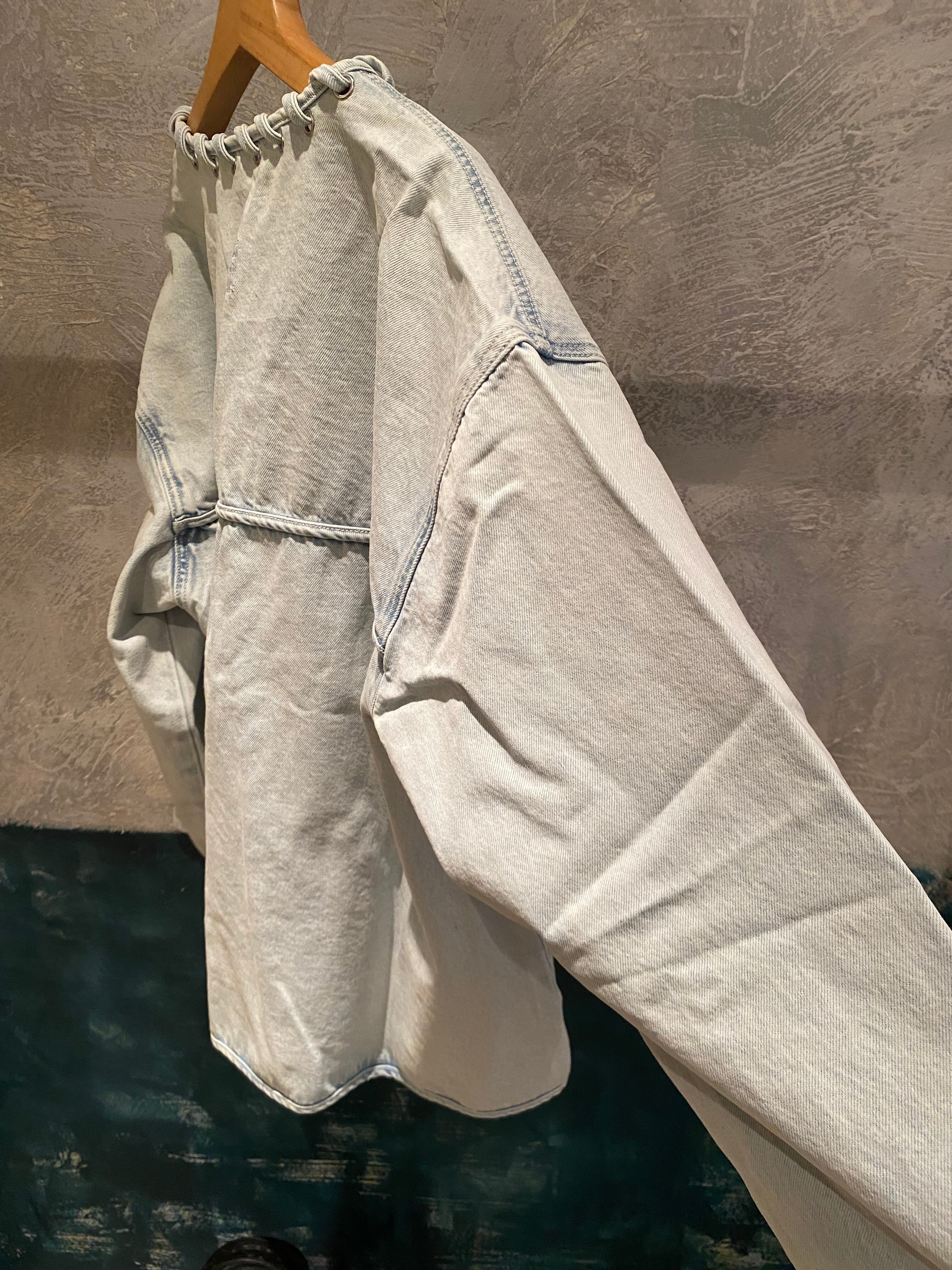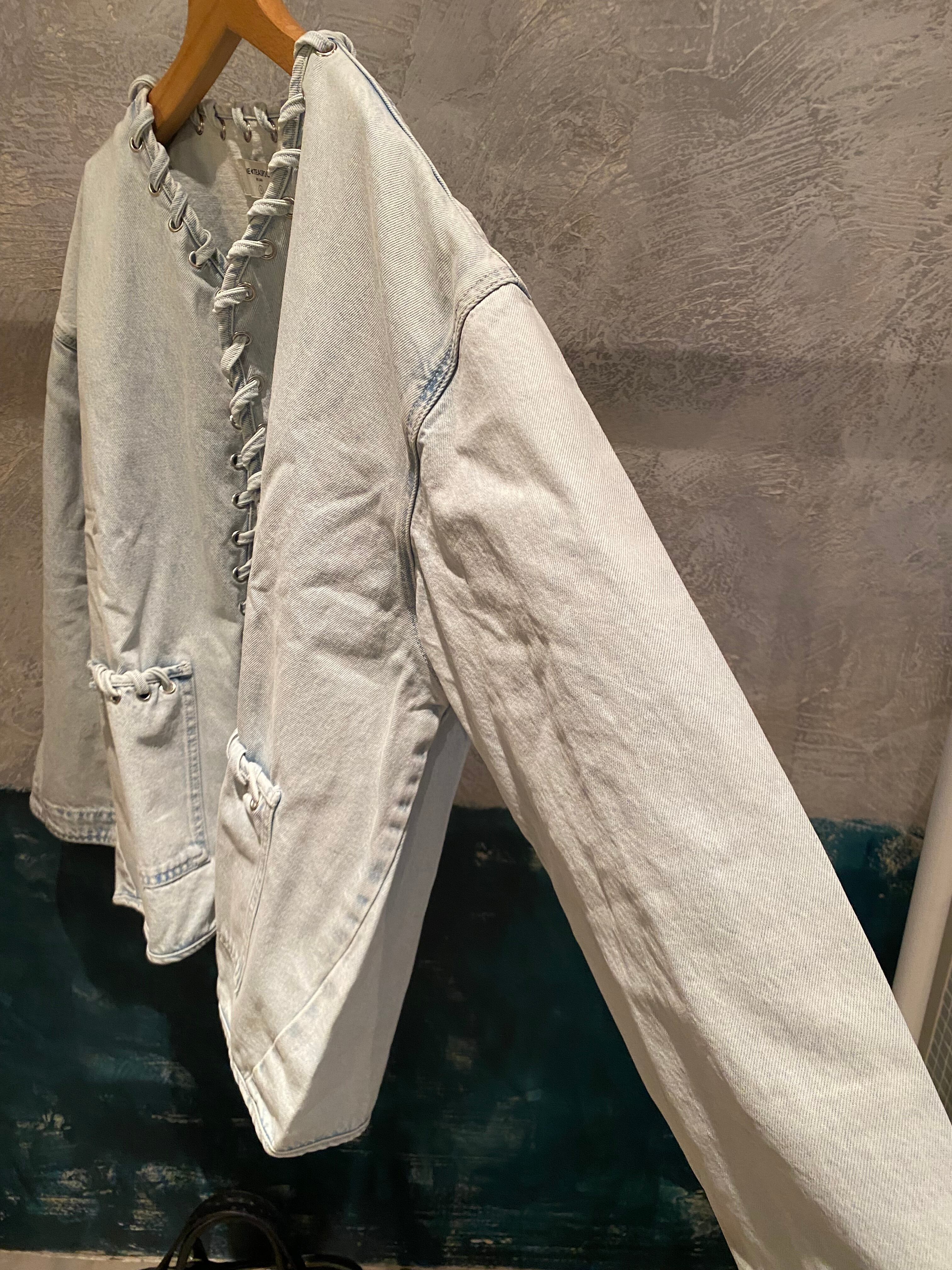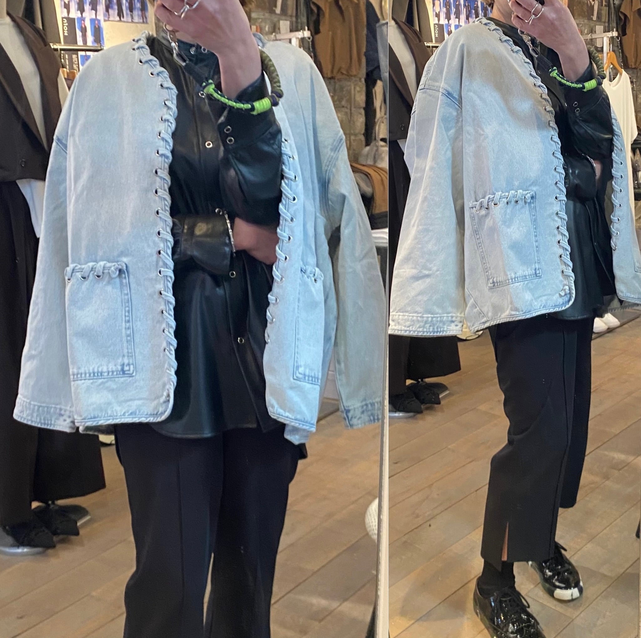 オーバーサイズのデニムジャケット。軽やかなBLEACHカラー。ボタンなどで閉めるのではなくサラッとノーボタンで羽織って頂くデザイン。フロントサイドポケット2箇所。ヒップが隠れるぐらいの着丈で、あらゆるボトムスとも合わせやすいシルエット。襟元からリングに編み込まれたデザインがポイントの着回し力抜群のジャケットです♪