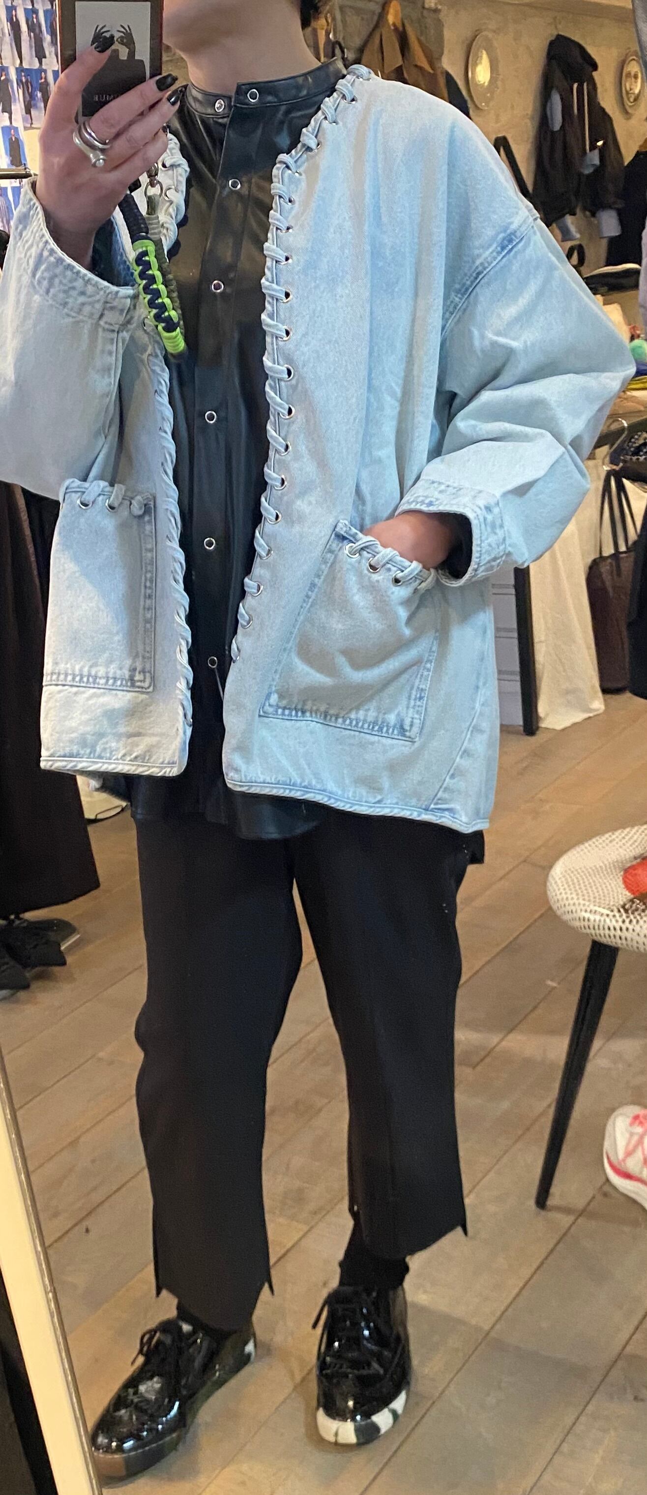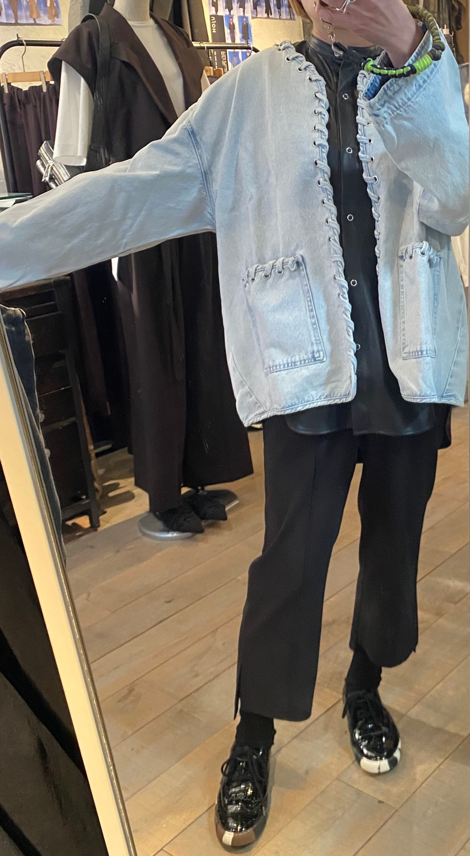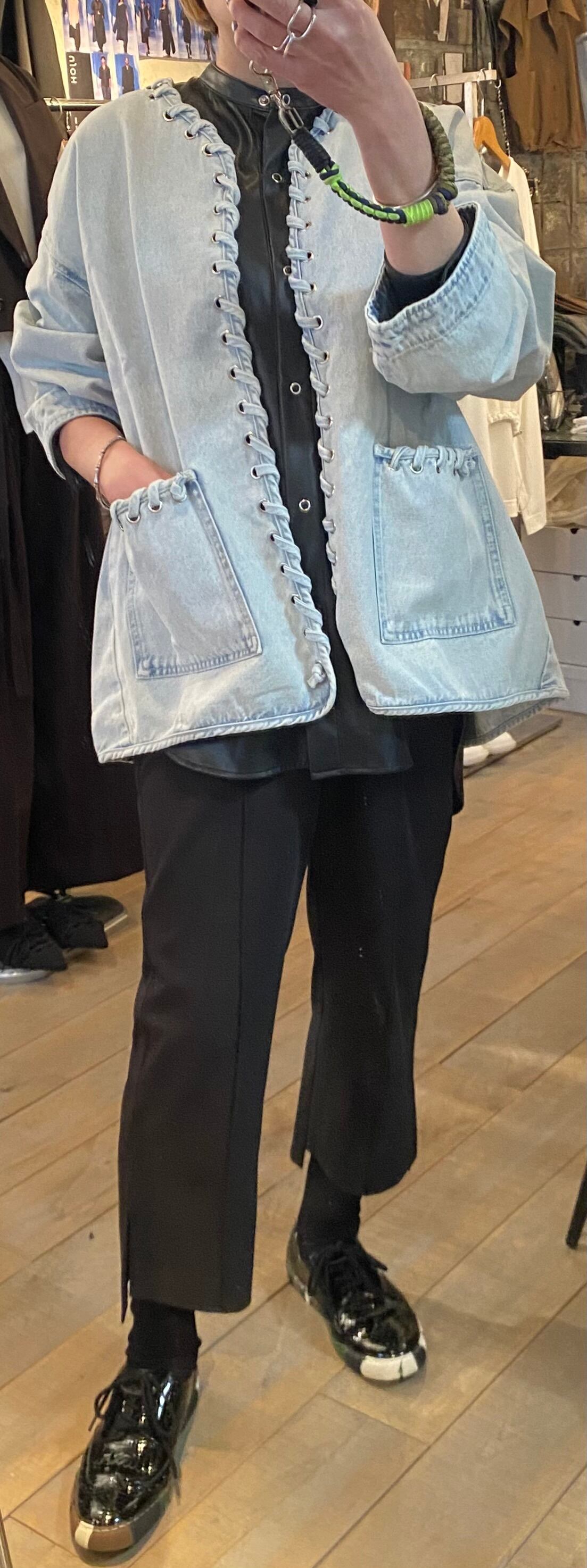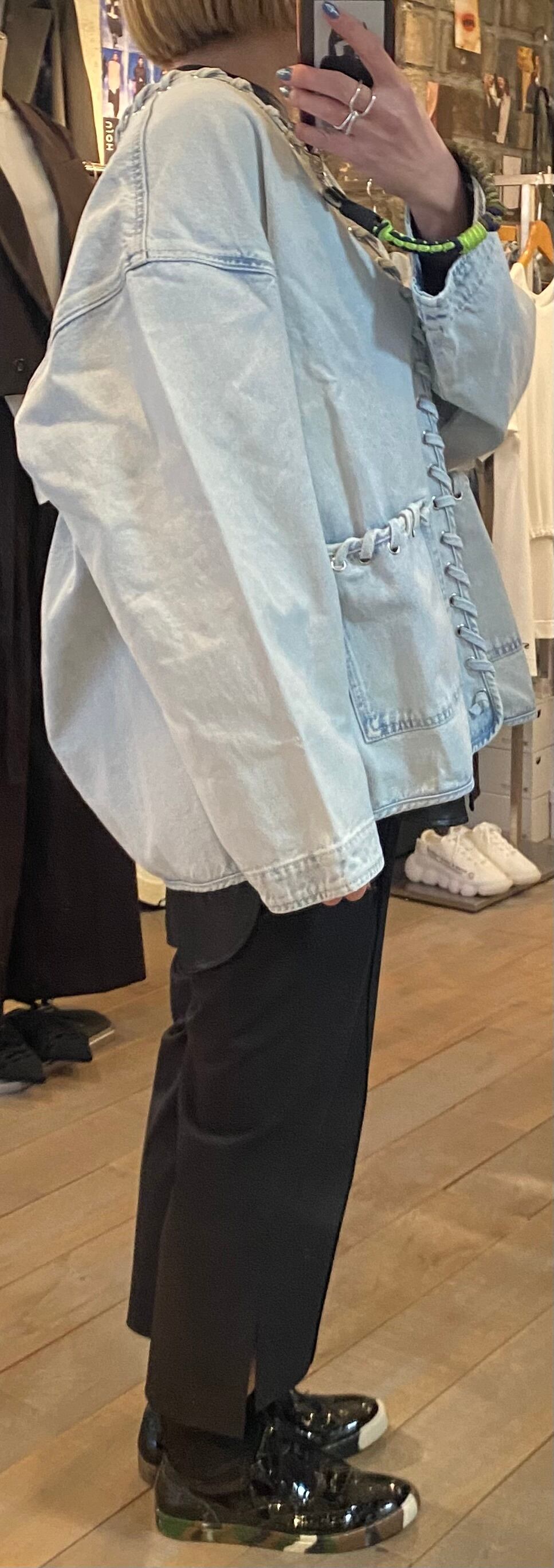 オーバーサイズのデニムジャケット。軽やかなBLEACHカラー。ボタンなどで閉めるのではなくサラッとノーボタンで羽織って頂くデザイン。フロントサイドポケット2箇所。ヒップが隠れるぐらいの着丈で、あらゆるボトムスとも合わせやすいシルエット。襟元からリングに編み込まれたデザインがポイントの着回し力抜群のジャケットです♪