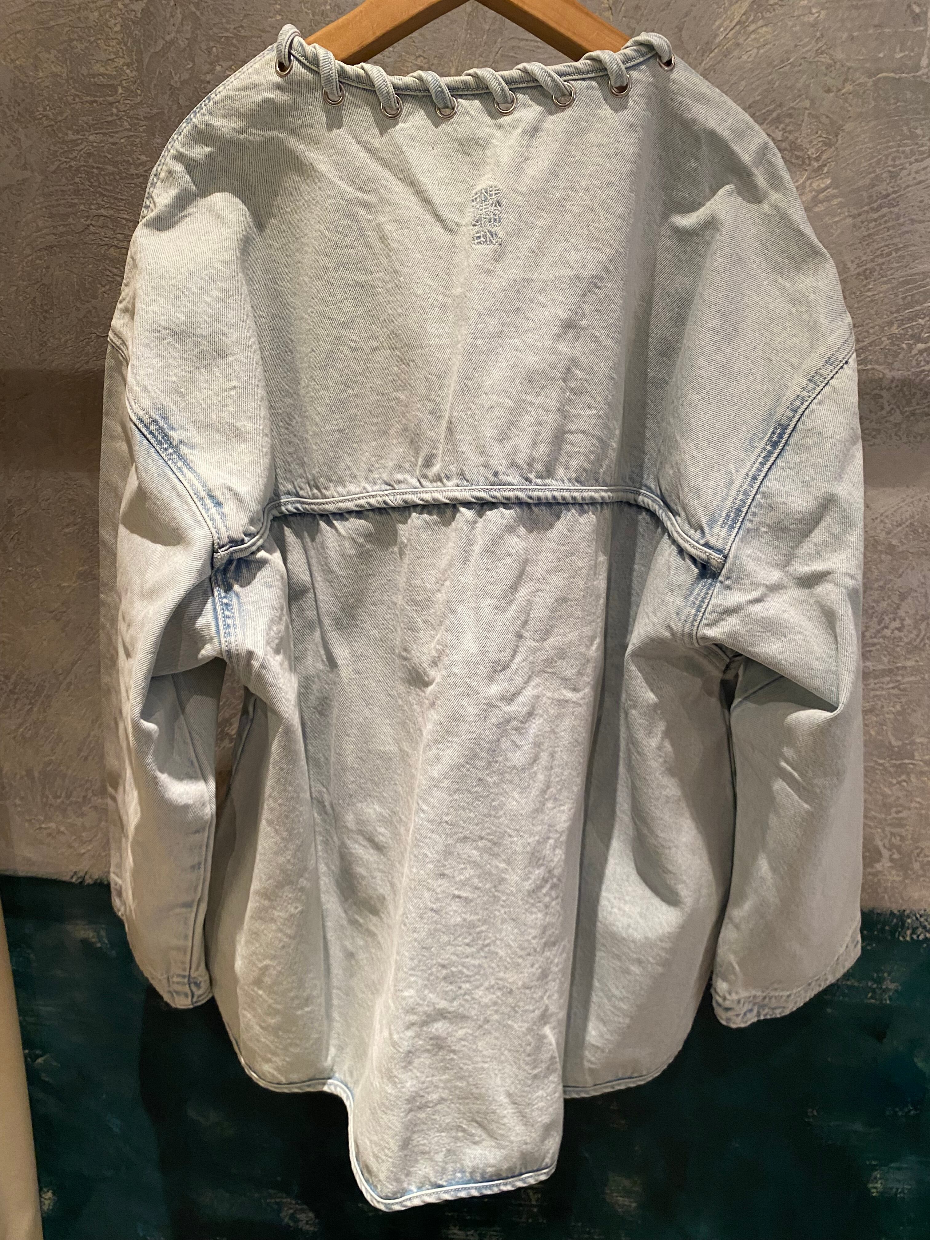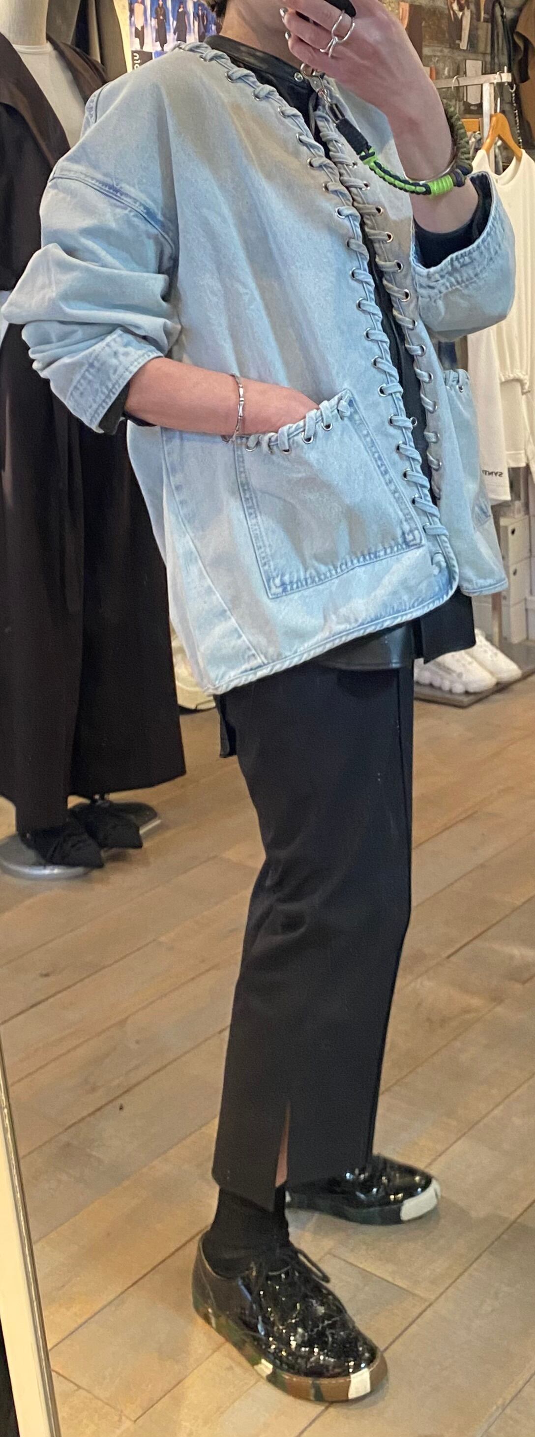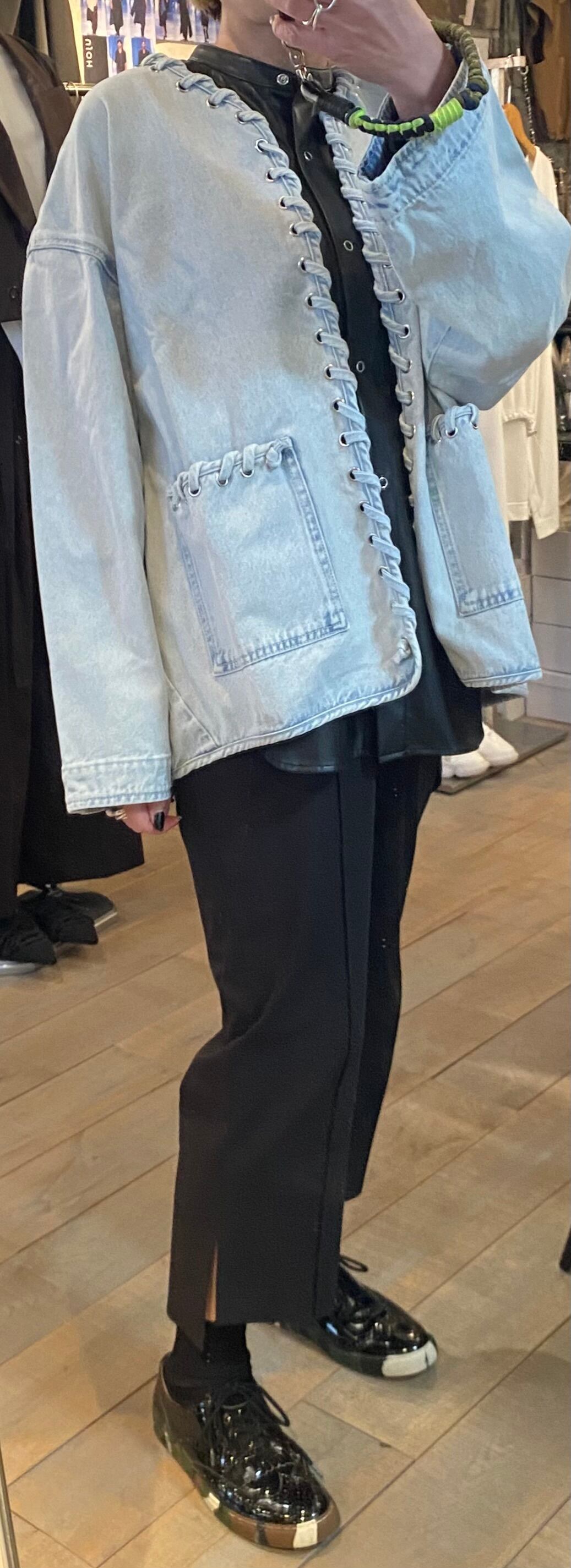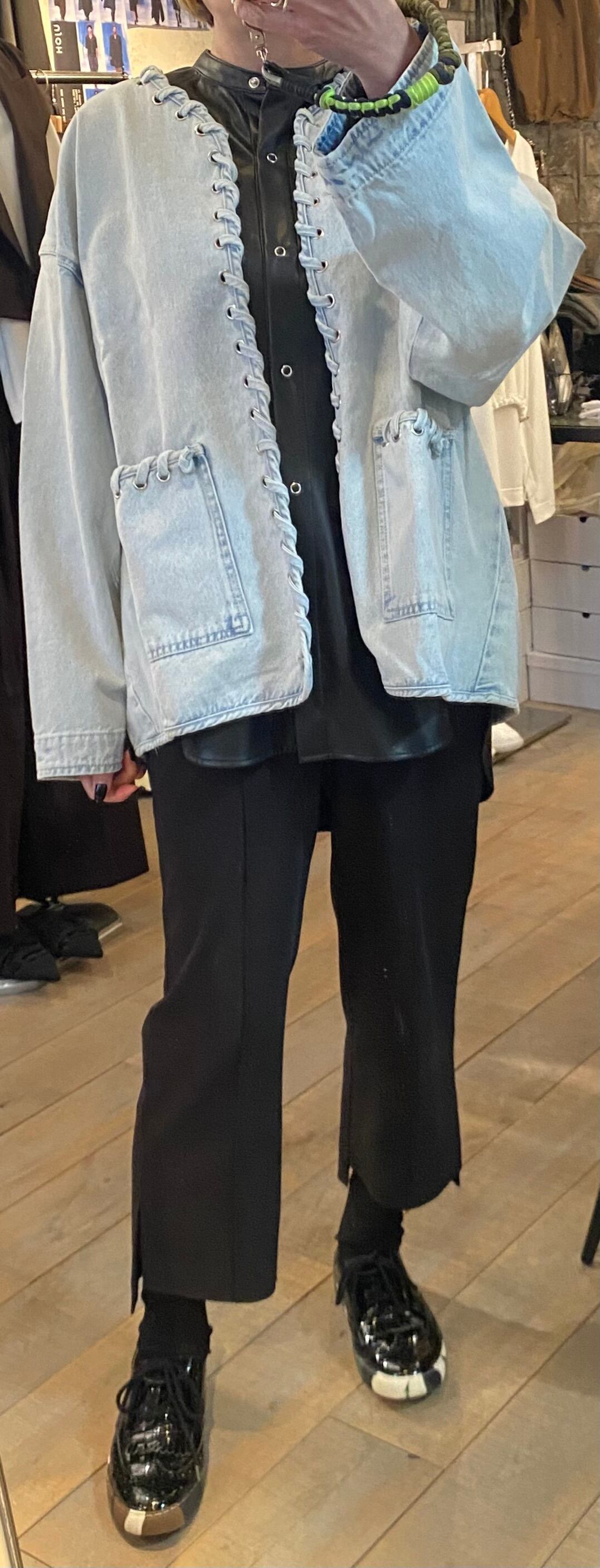 オーバーサイズのデニムジャケット。軽やかなBLEACHカラー。ボタンなどで閉めるのではなくサラッとノーボタンで羽織って頂くデザイン。フロントサイドポケット2箇所。ヒップが隠れるぐらいの着丈で、あらゆるボトムスとも合わせやすいシルエット。襟元からリングに編み込まれたデザインがポイントの着回し力抜群のジャケットです♪