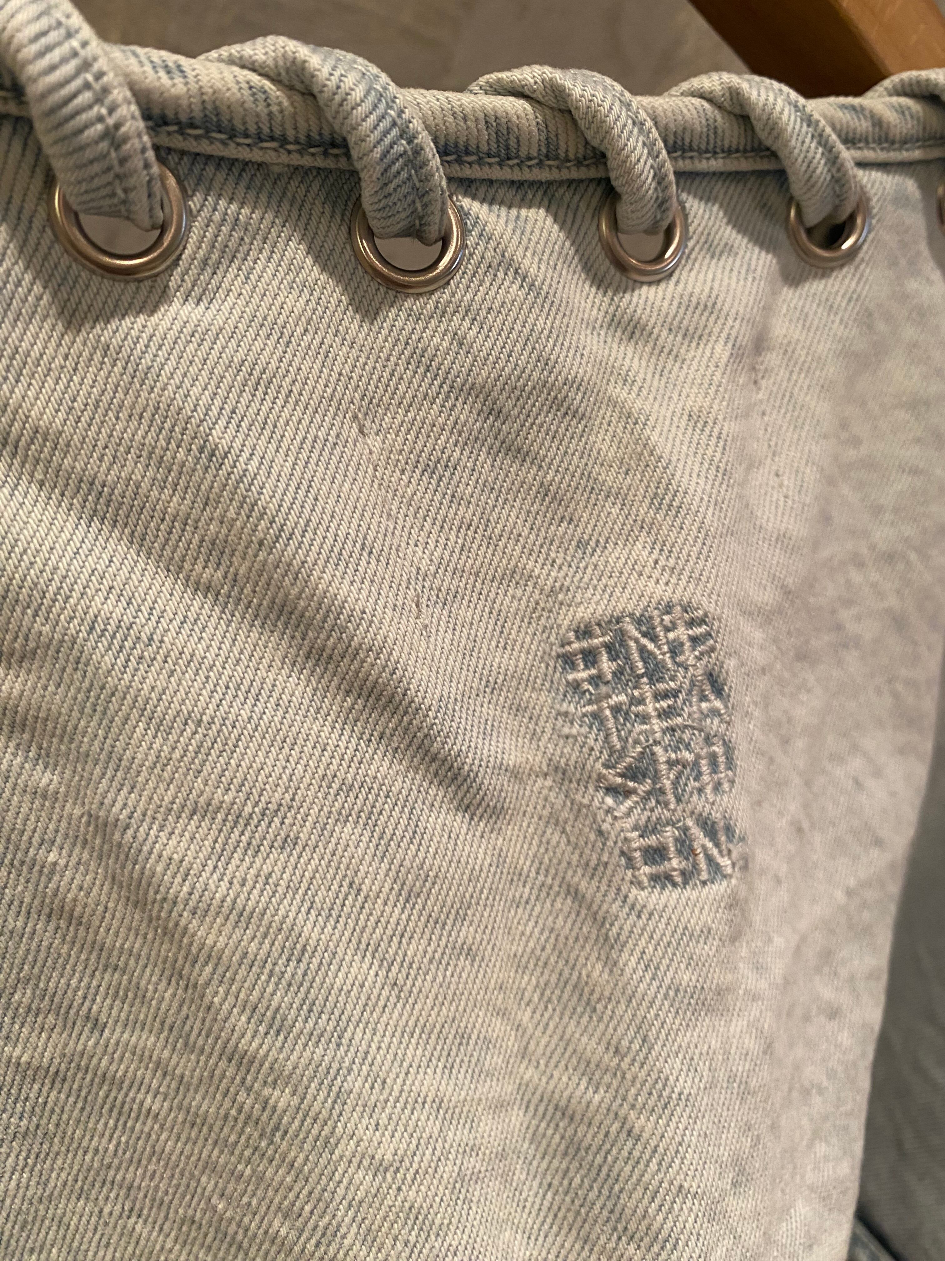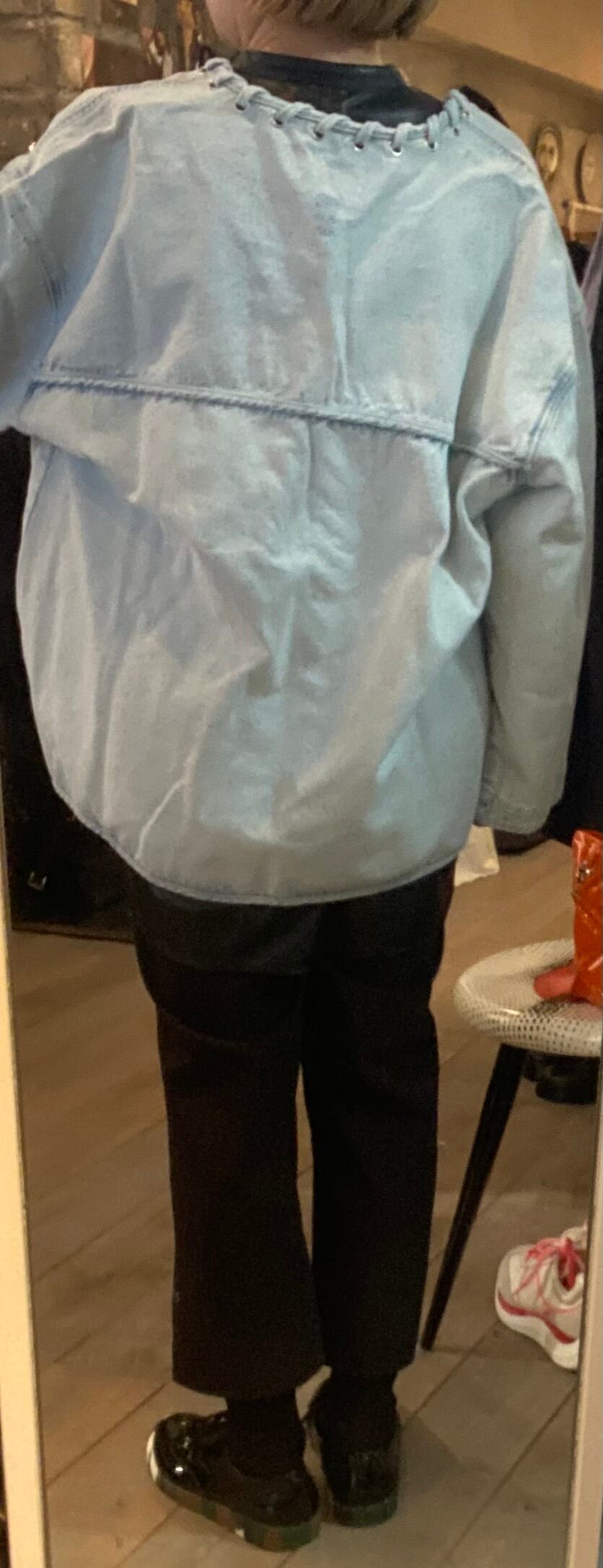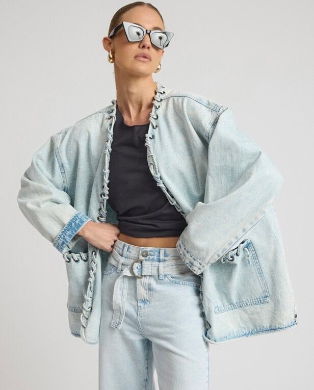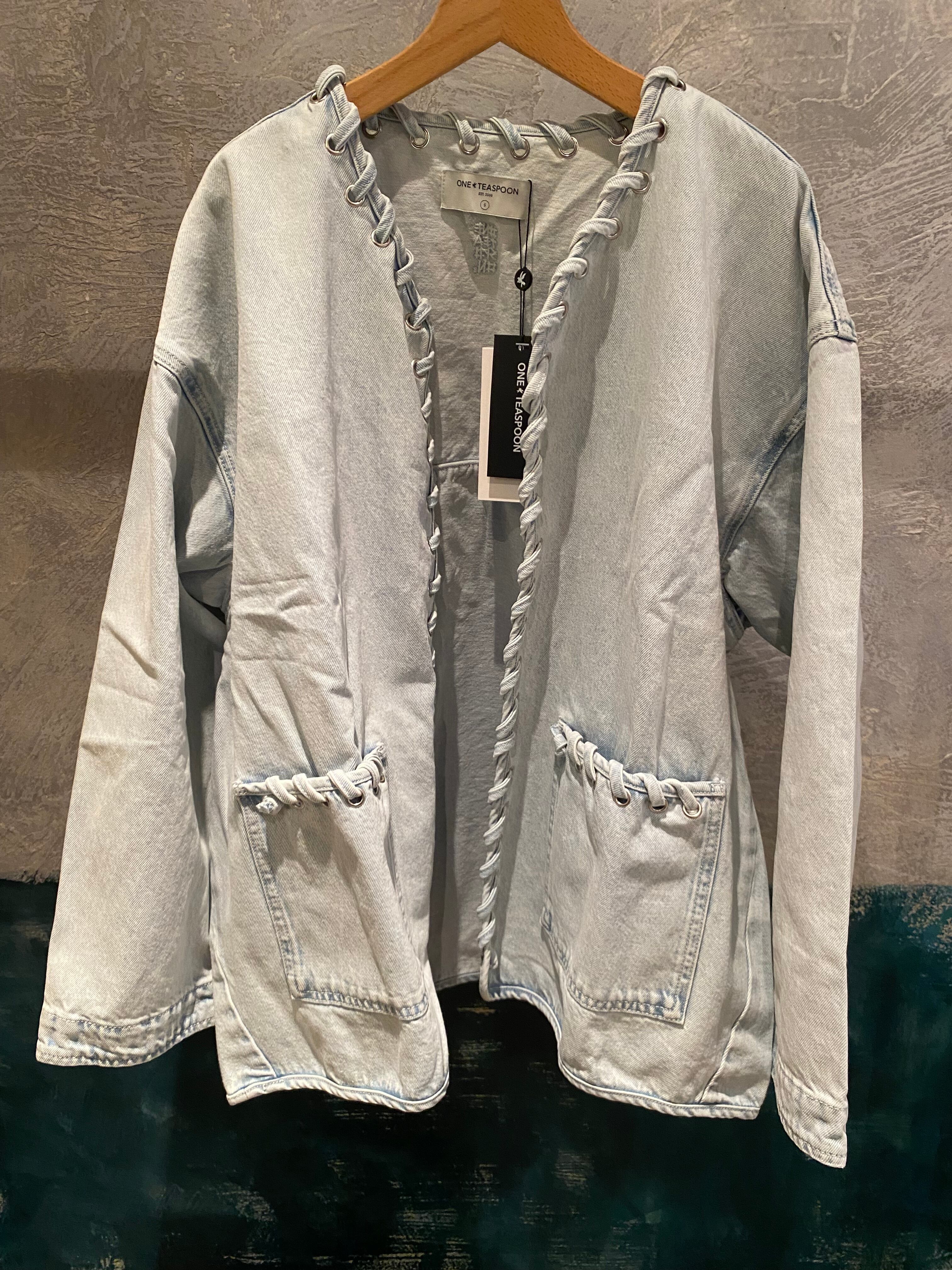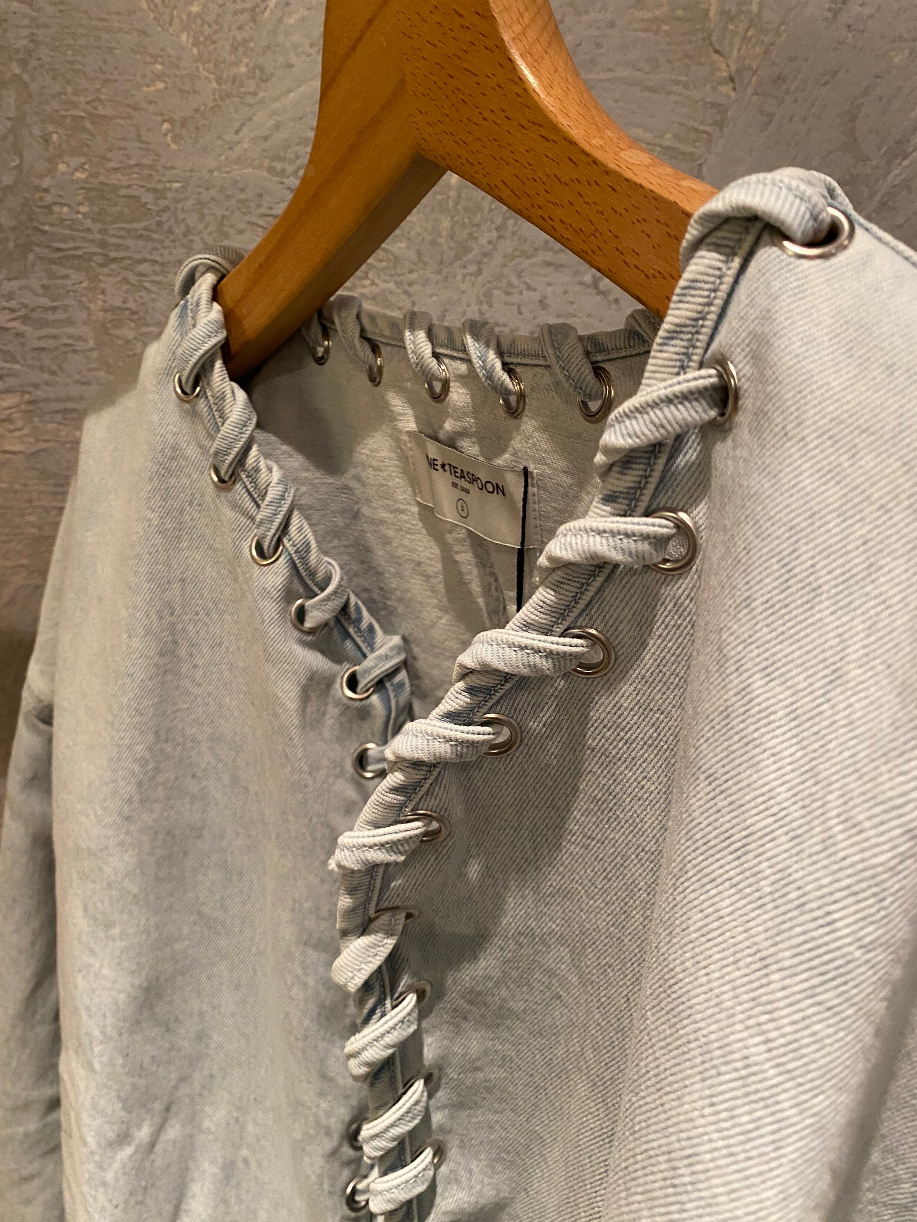 オーバーサイズのデニムジャケット。軽やかなBLEACHカラー。ボタンなどで閉めるのではなくサラッとノーボタンで羽織って頂くデザイン。フロントサイドポケット2箇所。ヒップが隠れるぐらいの着丈で、あらゆるボトムスとも合わせやすいシルエット。襟元からリングに編み込まれたデザインがポイントの着回し力抜群のジャケットです♪