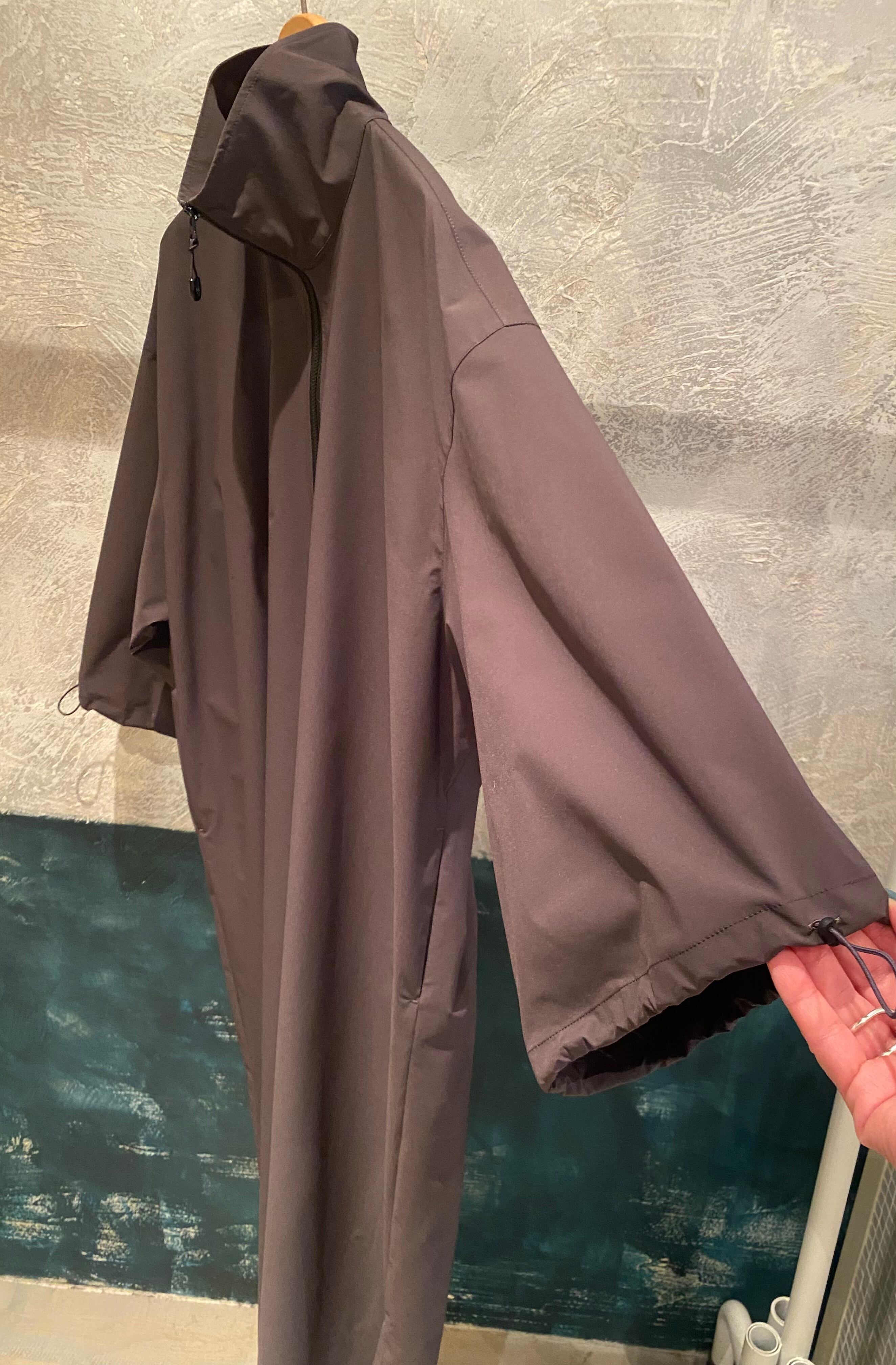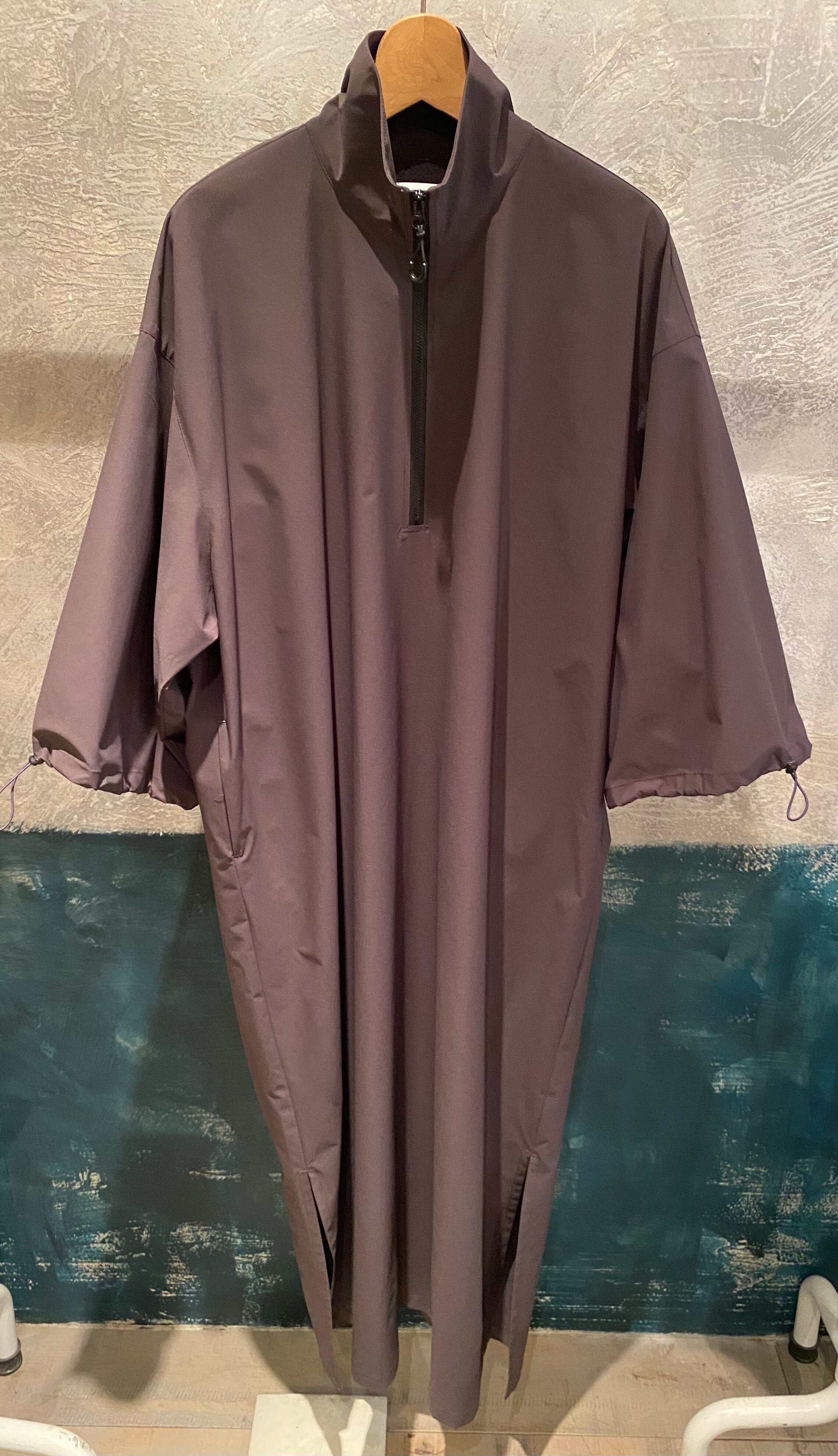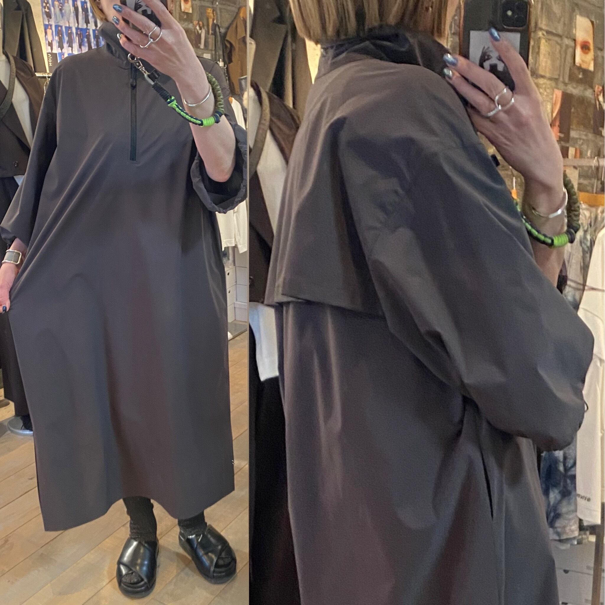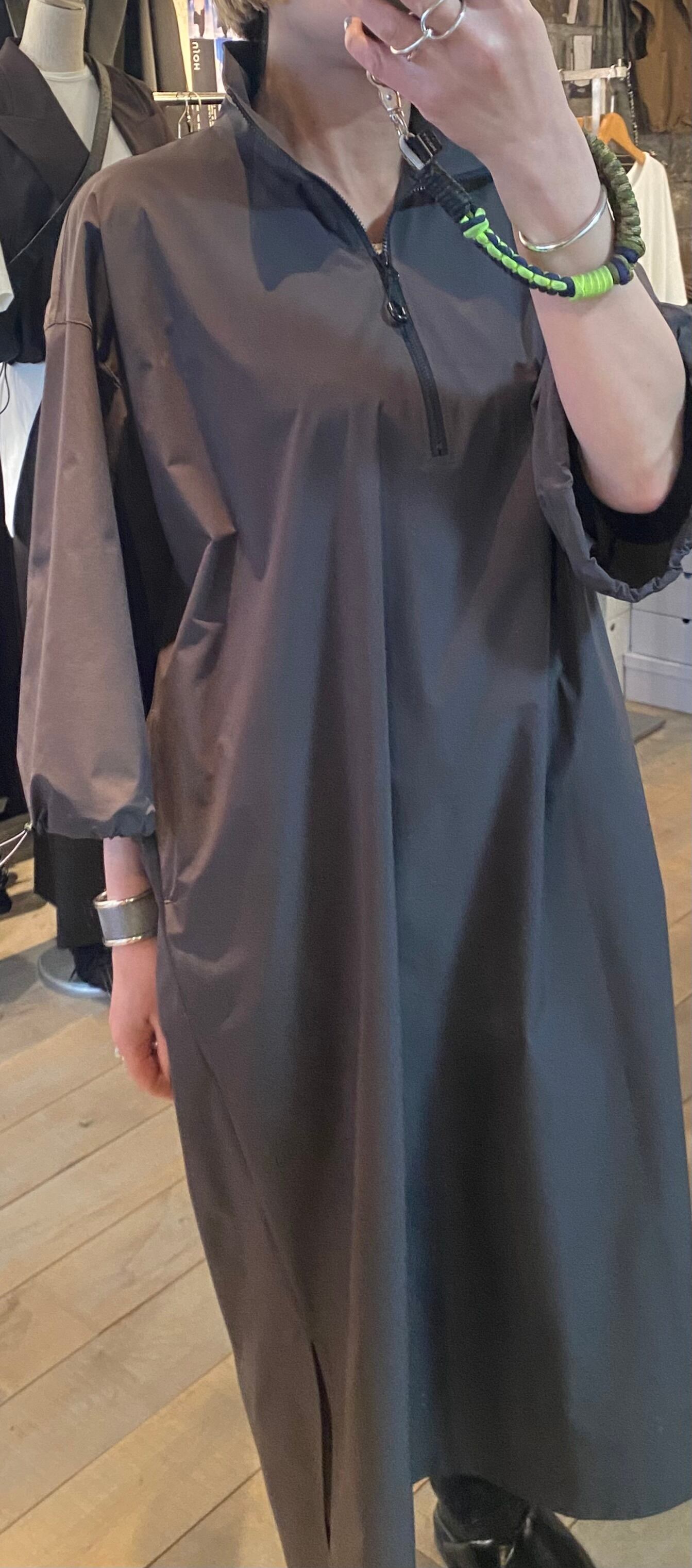 サラッとしたとても軽い質感のジップアップワンピース。ネックのジップの開け具合で印象を変えて頂けます。袖口のドローコードでシルエットの変化も楽しめます。両サイドポケット有り。