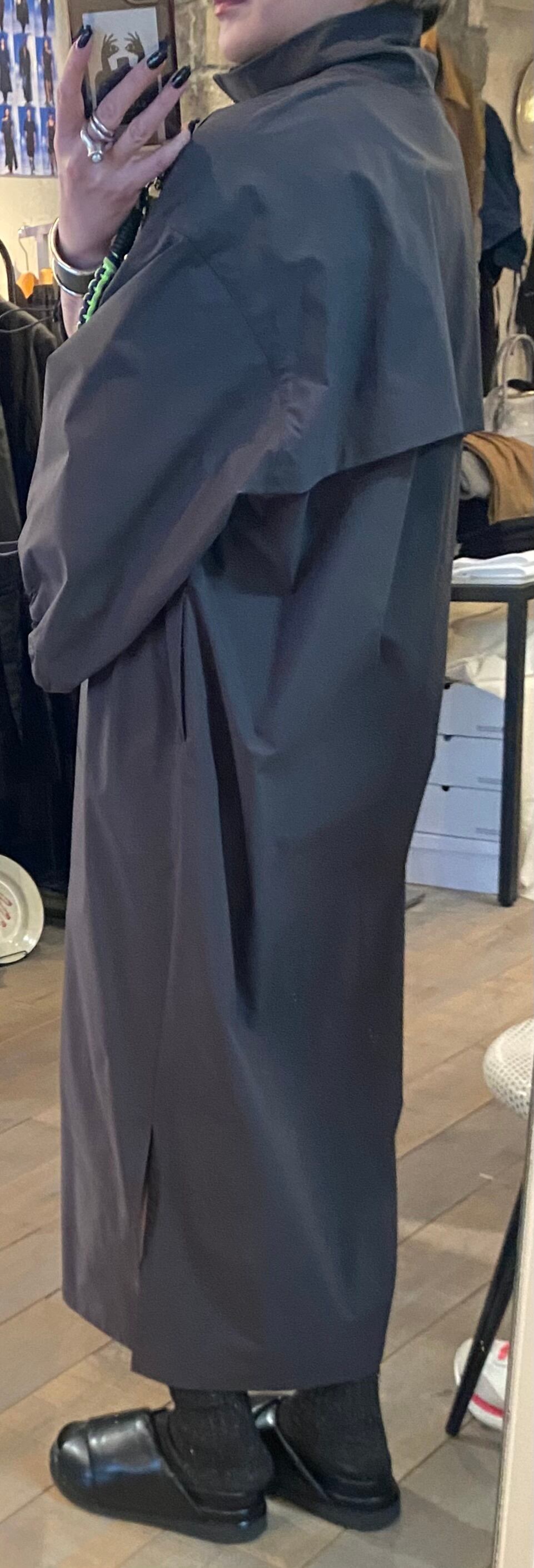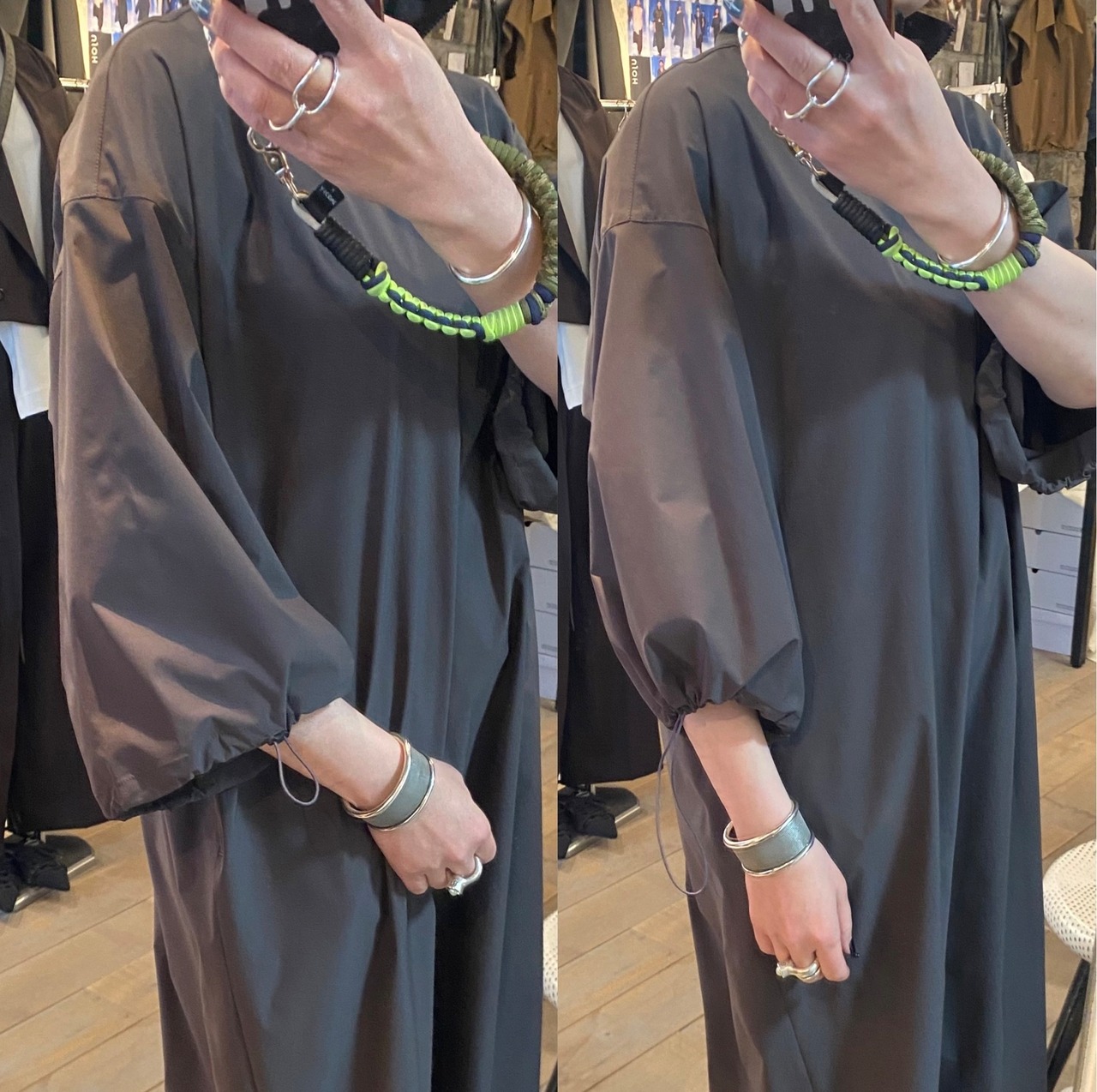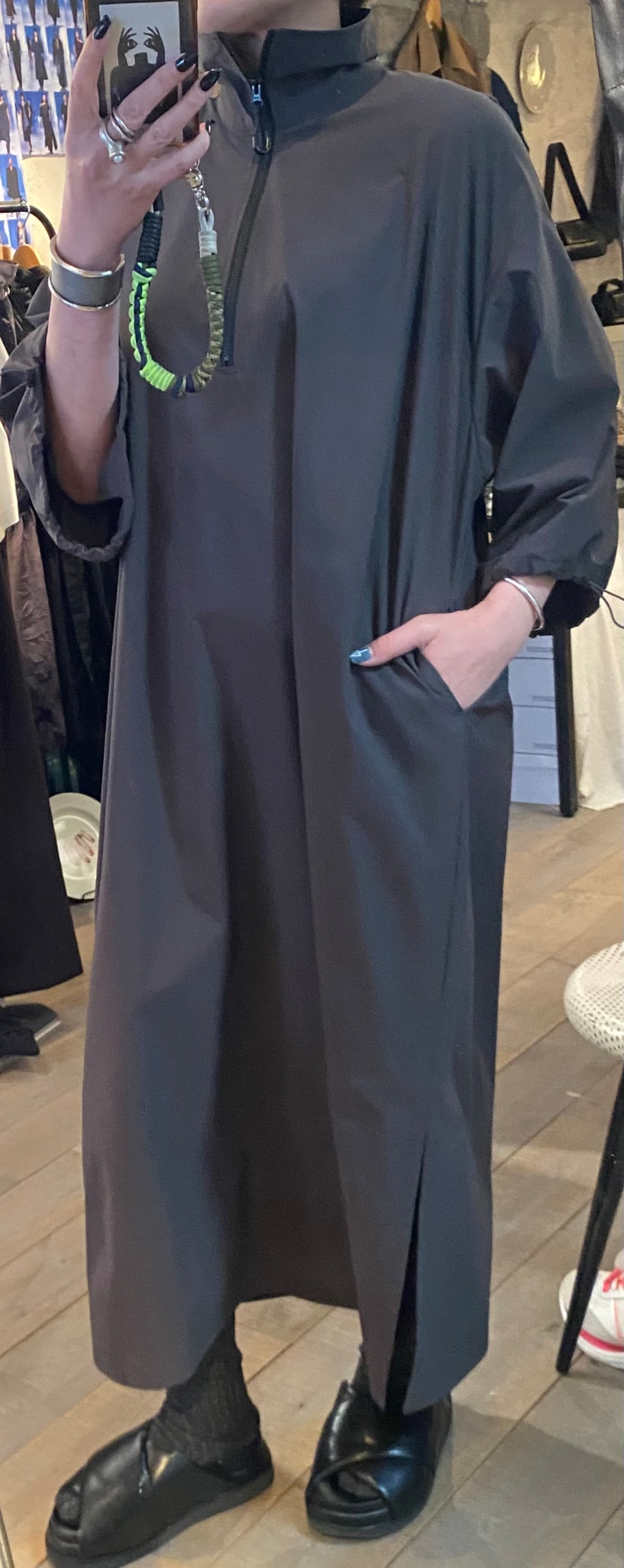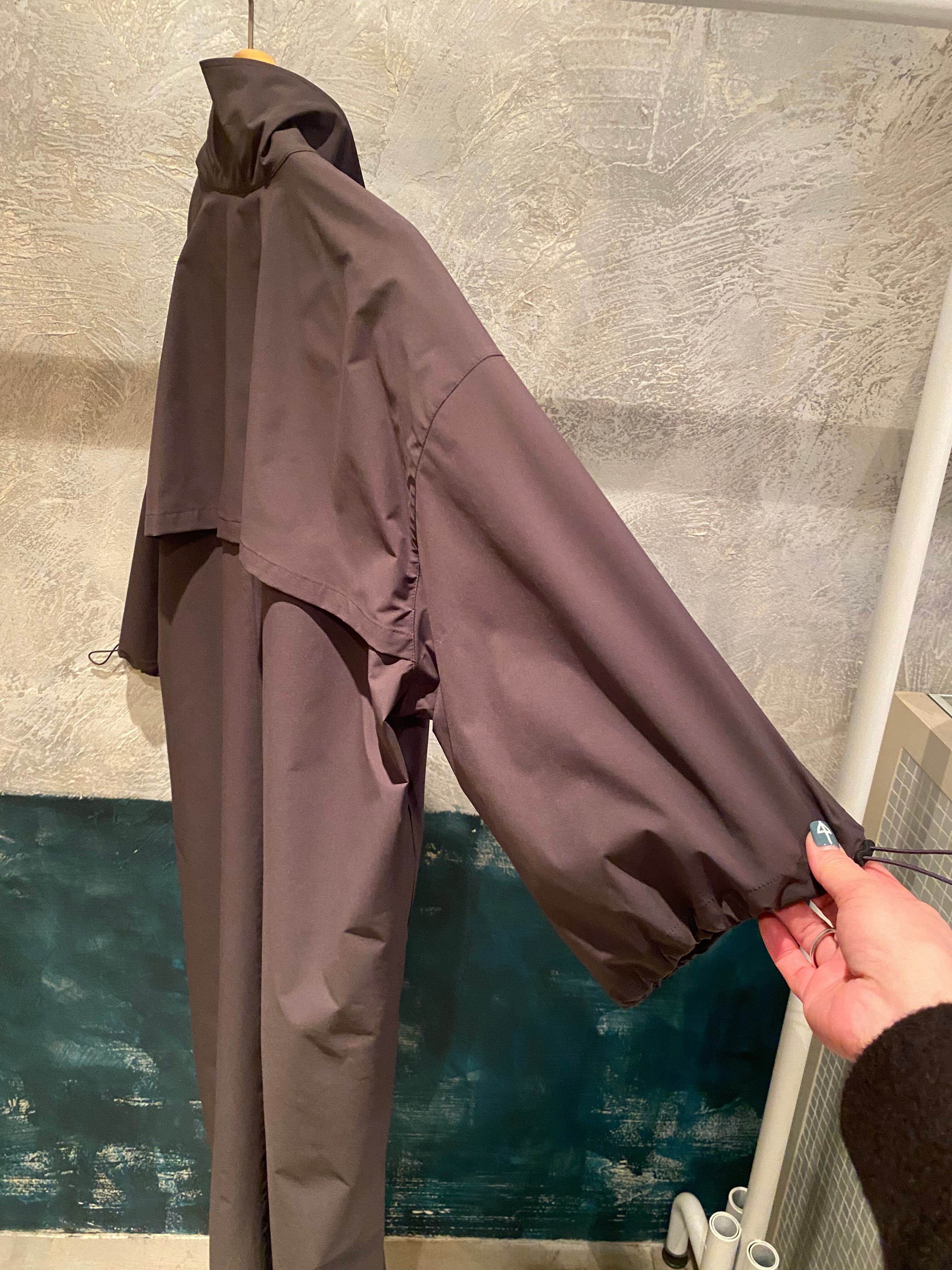 サラッとしたとても軽い質感のジップアップワンピース。ネックのジップの開け具合で印象を変えて頂けます。袖口のドローコードでシルエットの変化も楽しめます。両サイドポケット有り。