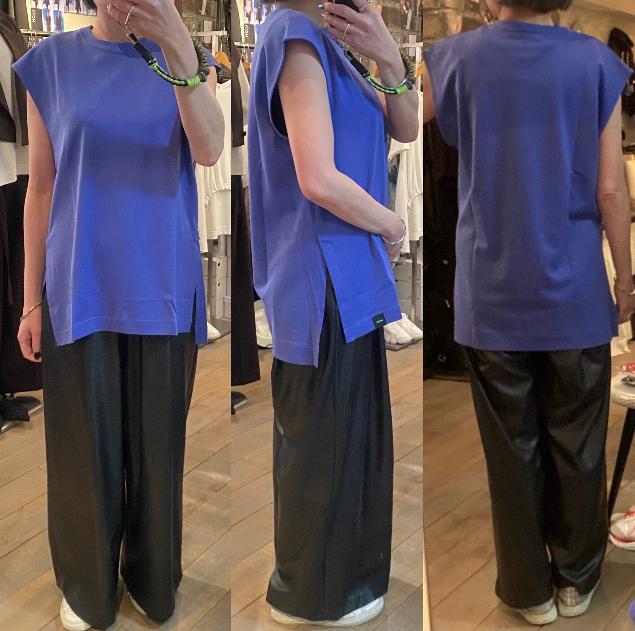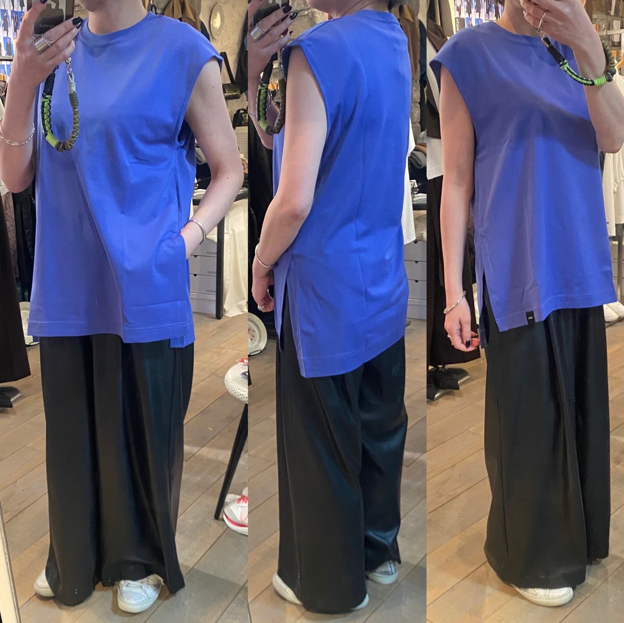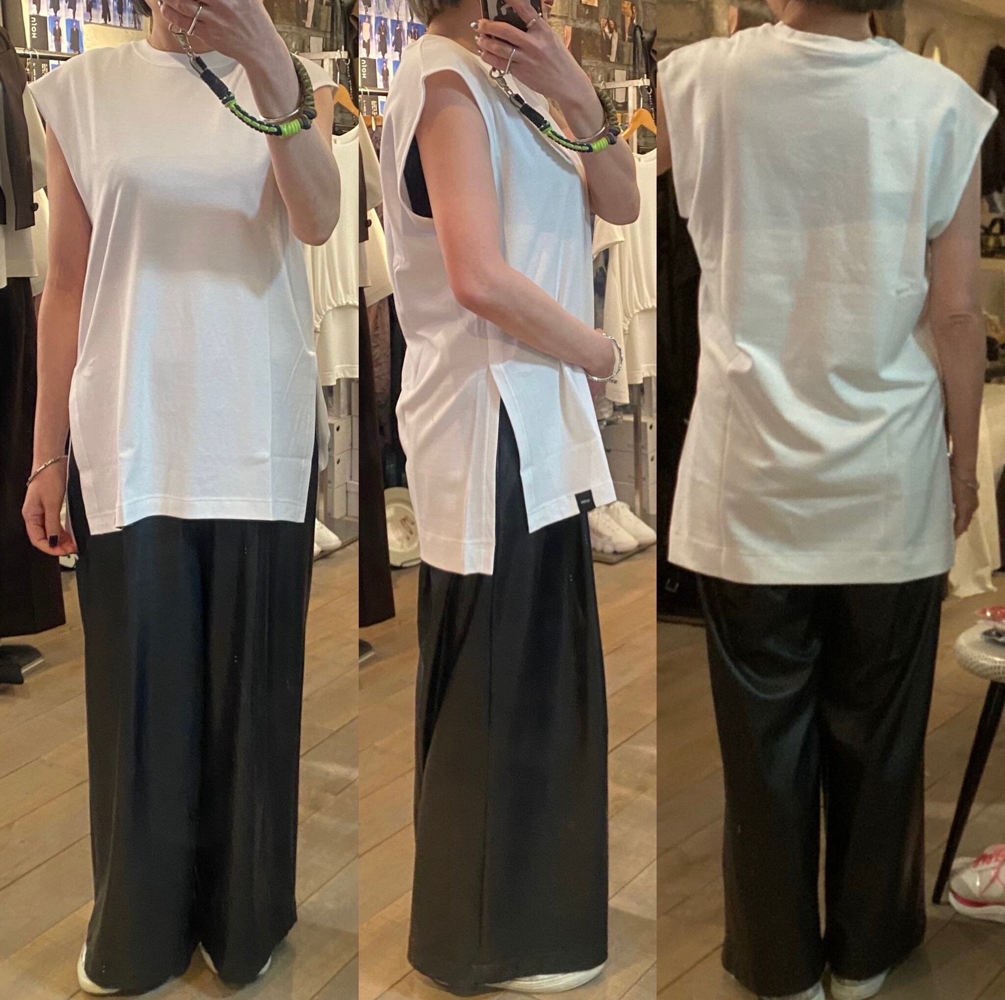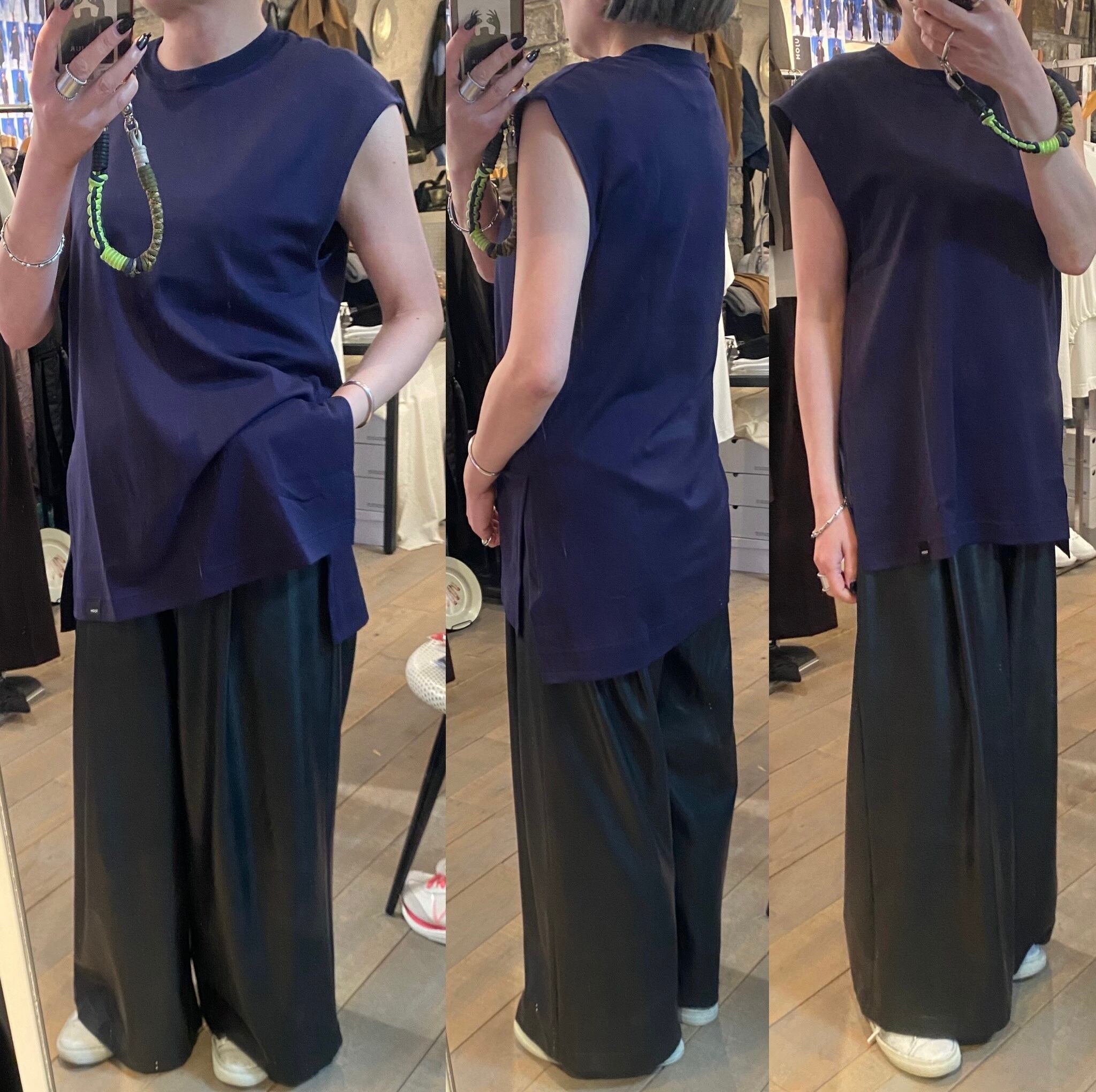 程よいサイズ感のノースリーブTシャツ。1枚でもレイヤードスタイルのインナーにも着回しのきくアイテムです。両脇のスリットや段差のついた着丈もポイント。