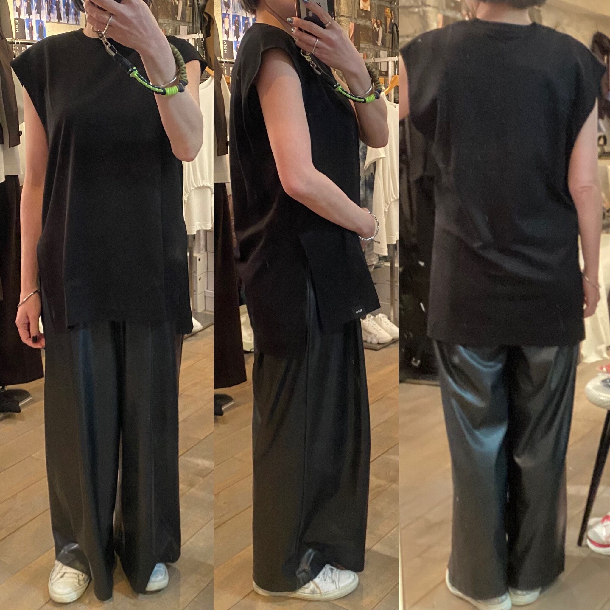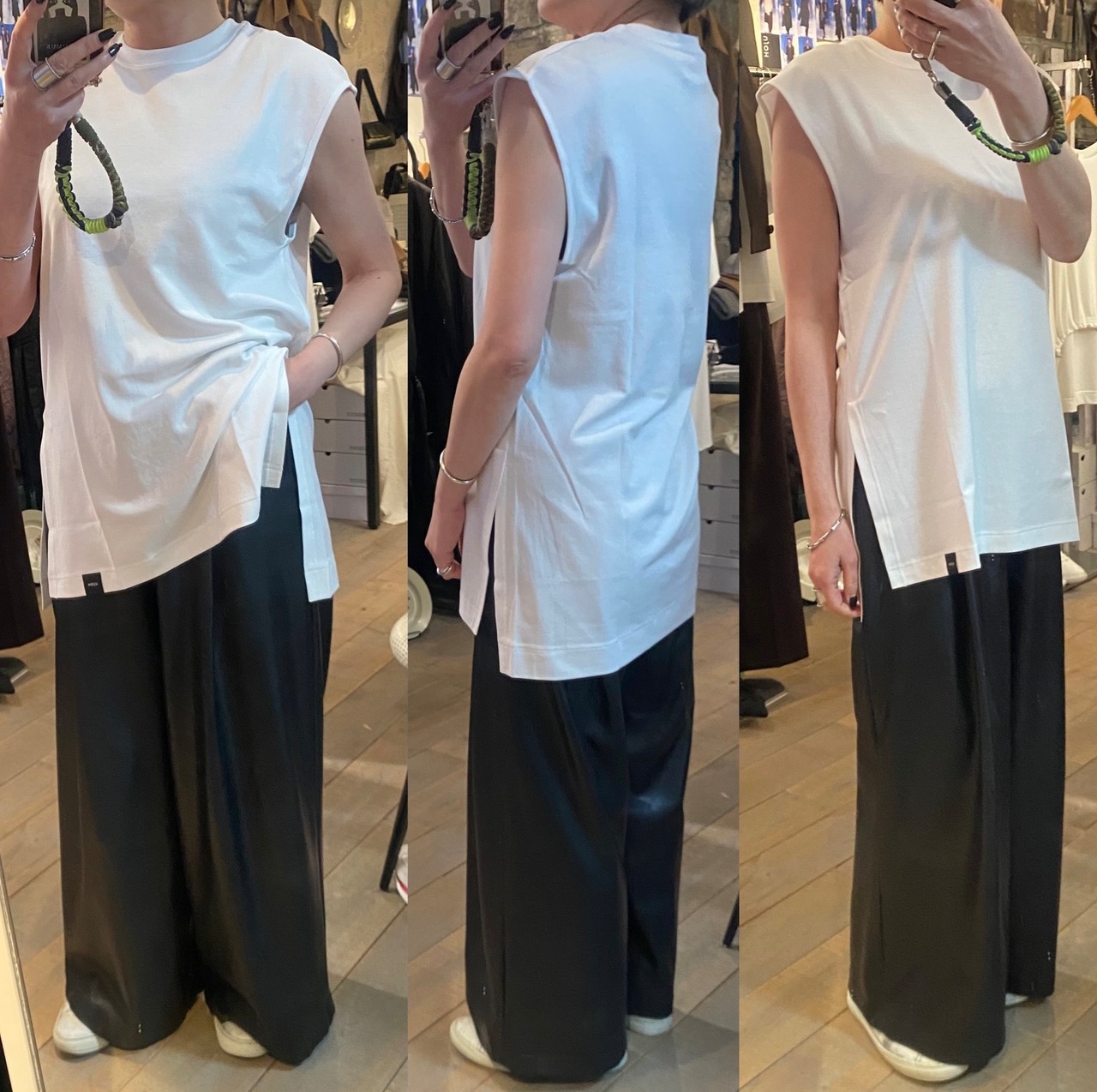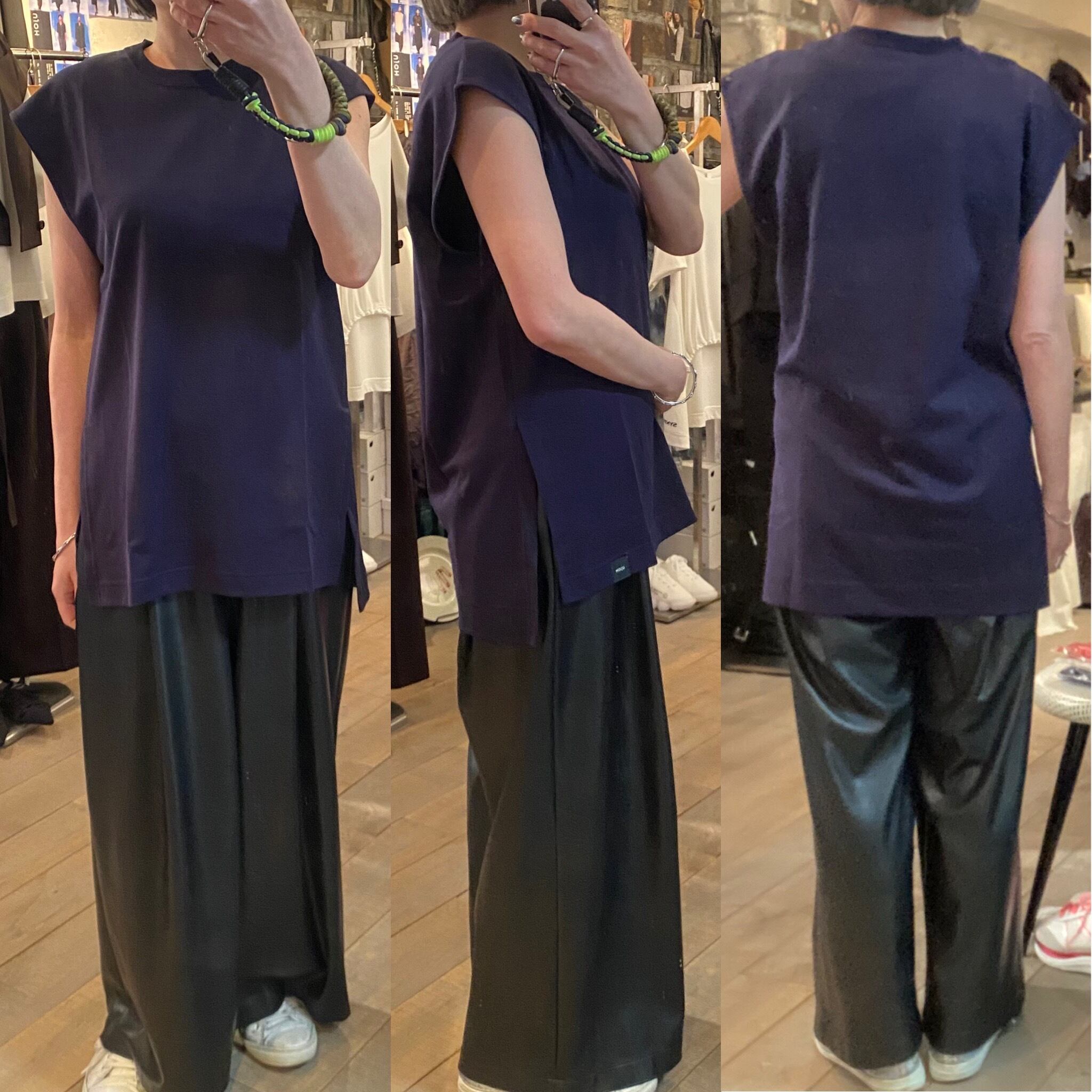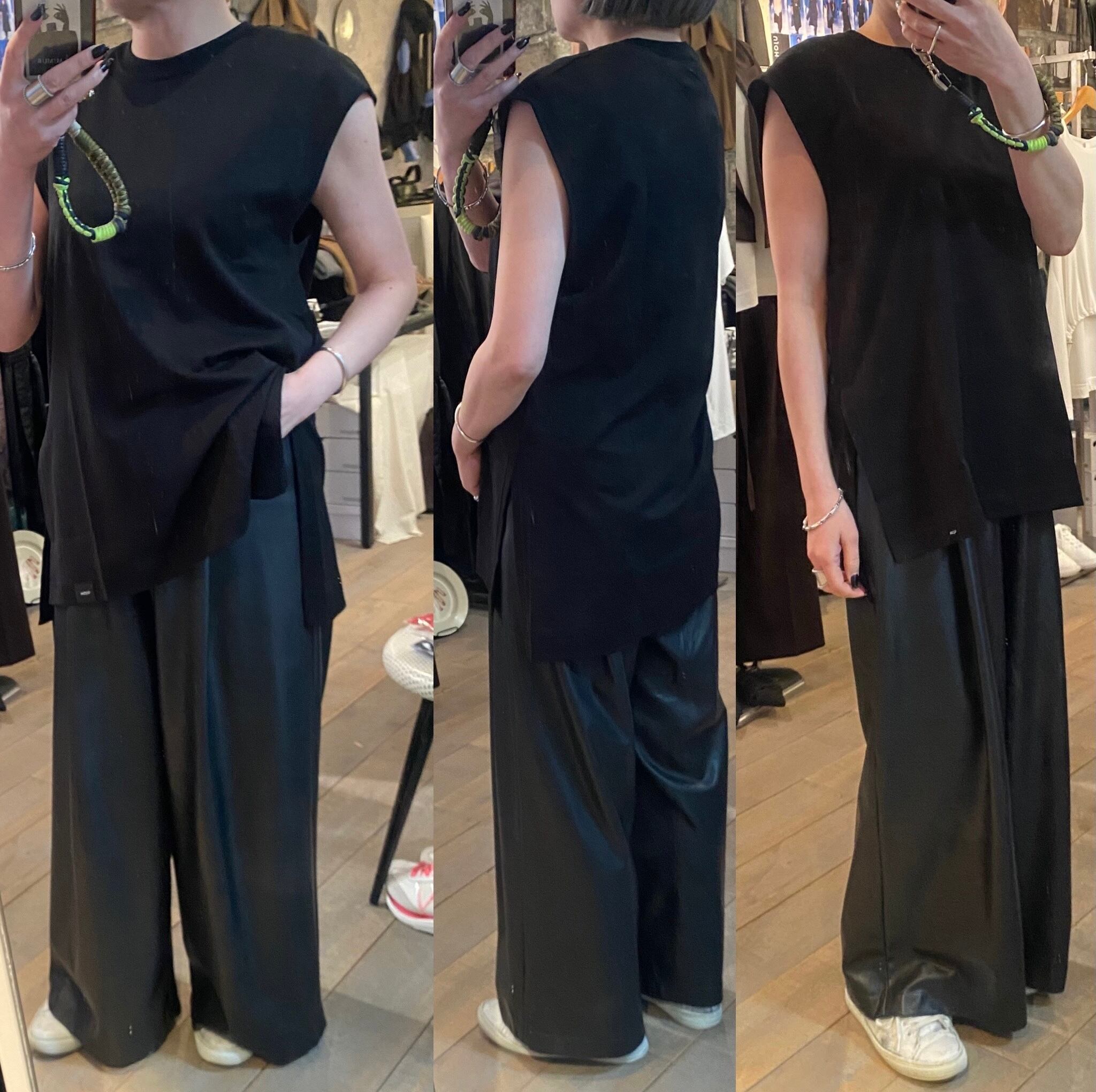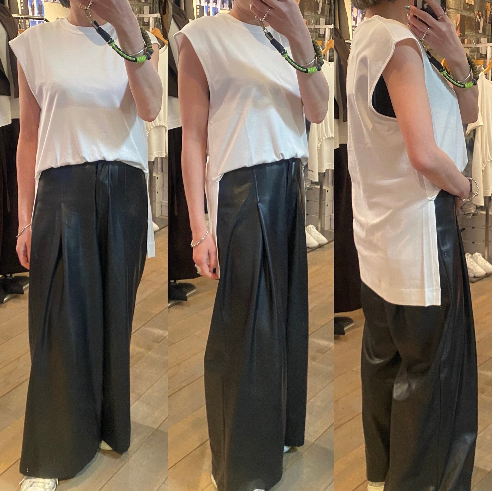 程よいサイズ感のノースリーブTシャツ。1枚でもレイヤードスタイルのインナーにも着回しのきくアイテムです。両脇のスリットや段差のついた着丈もポイント。