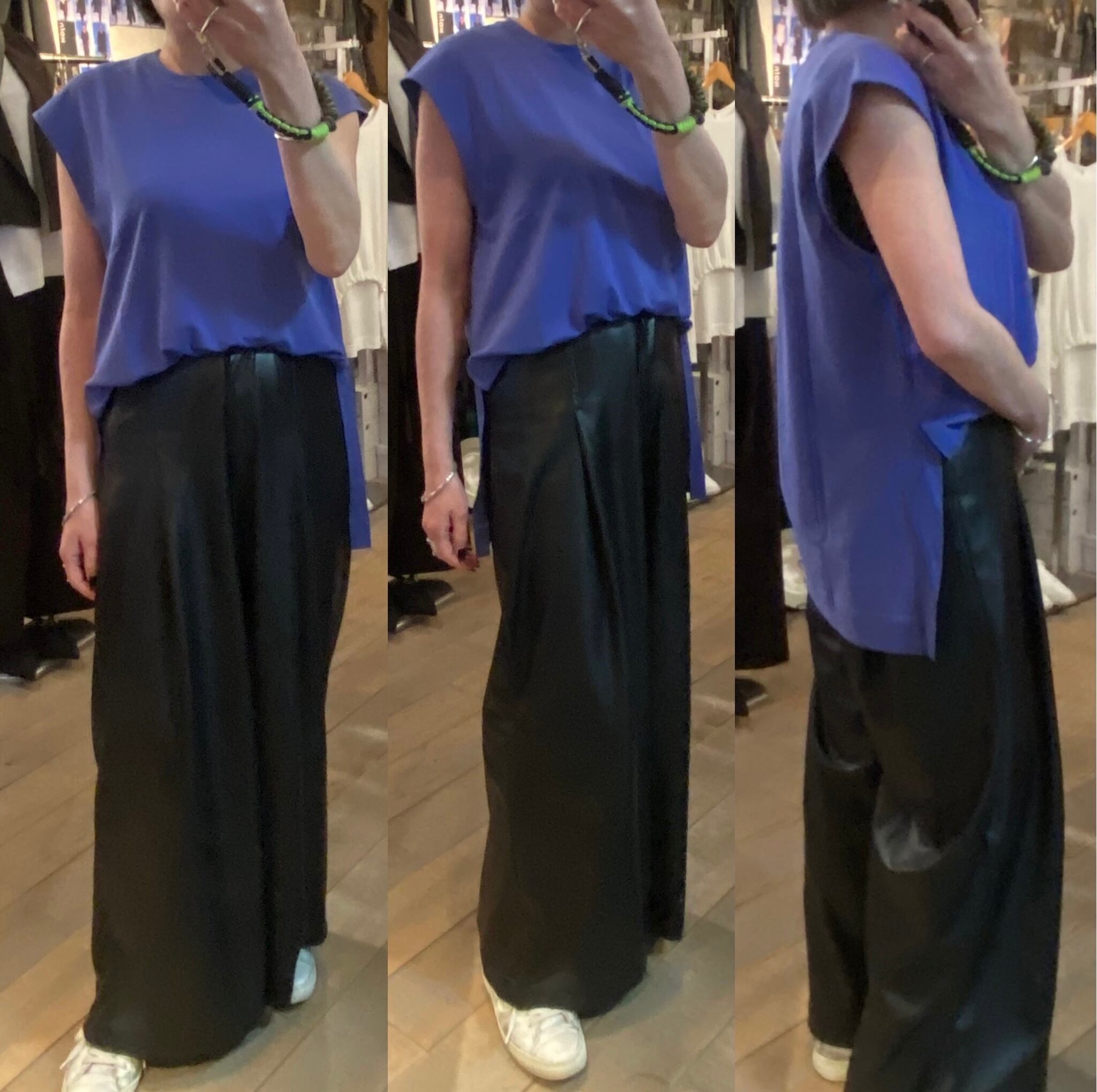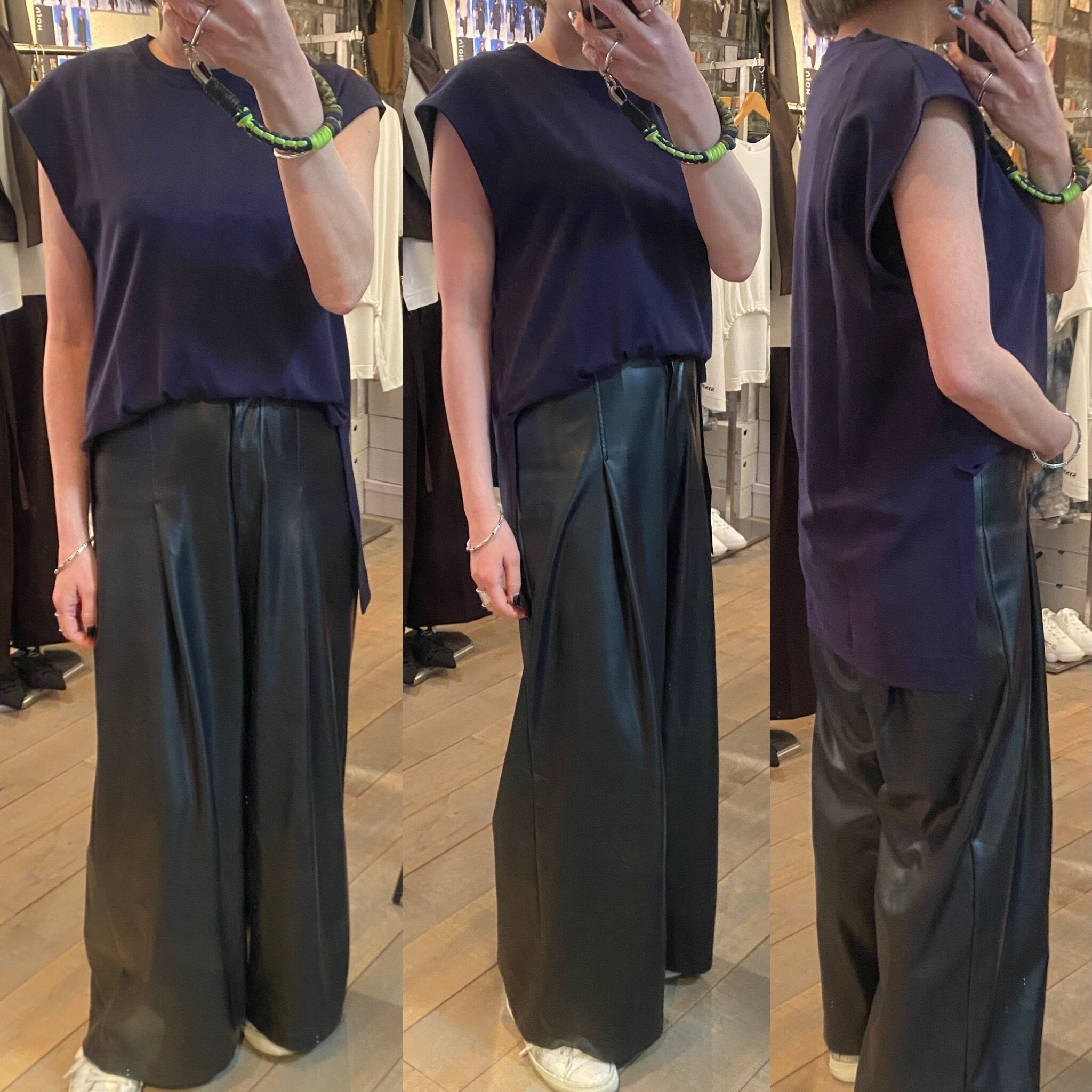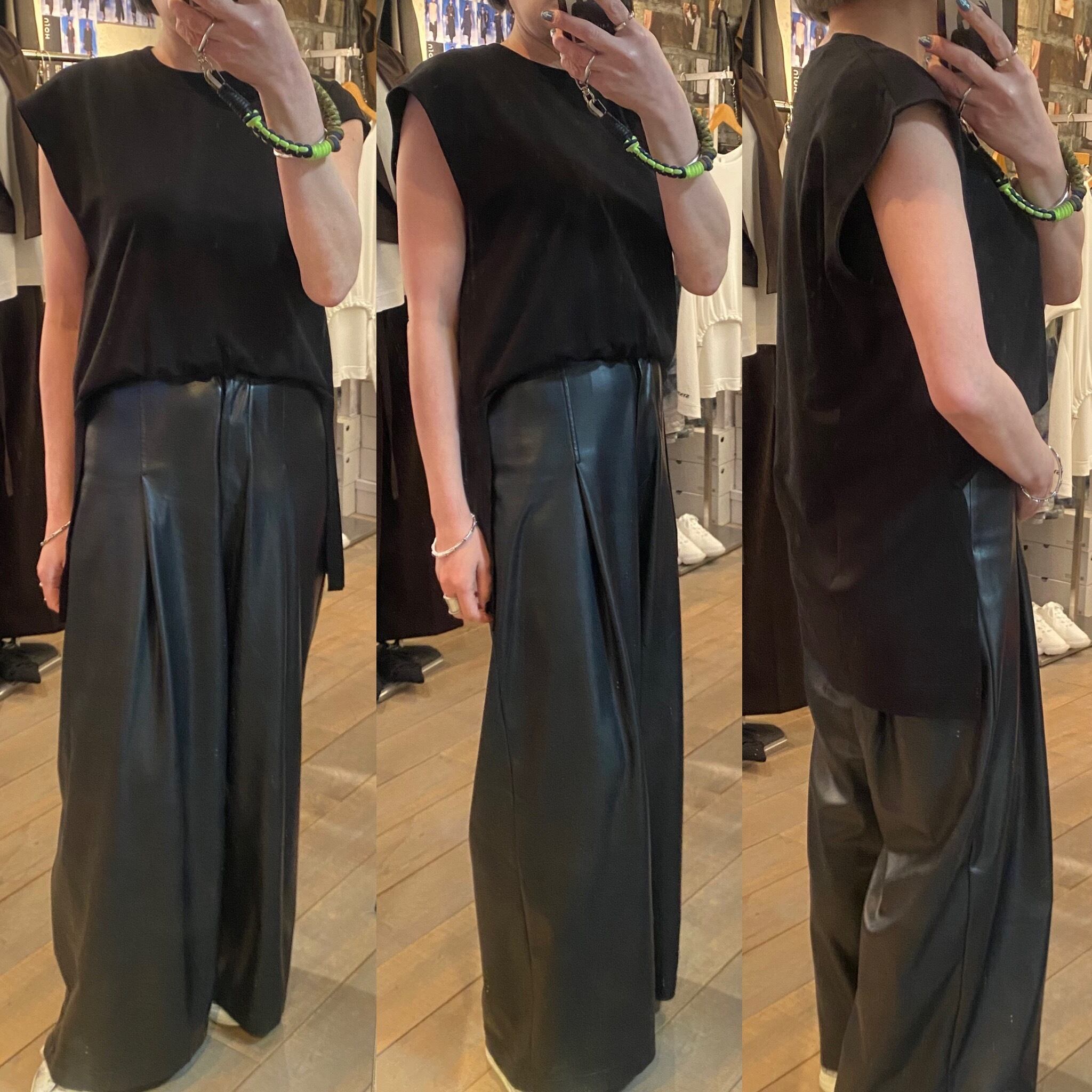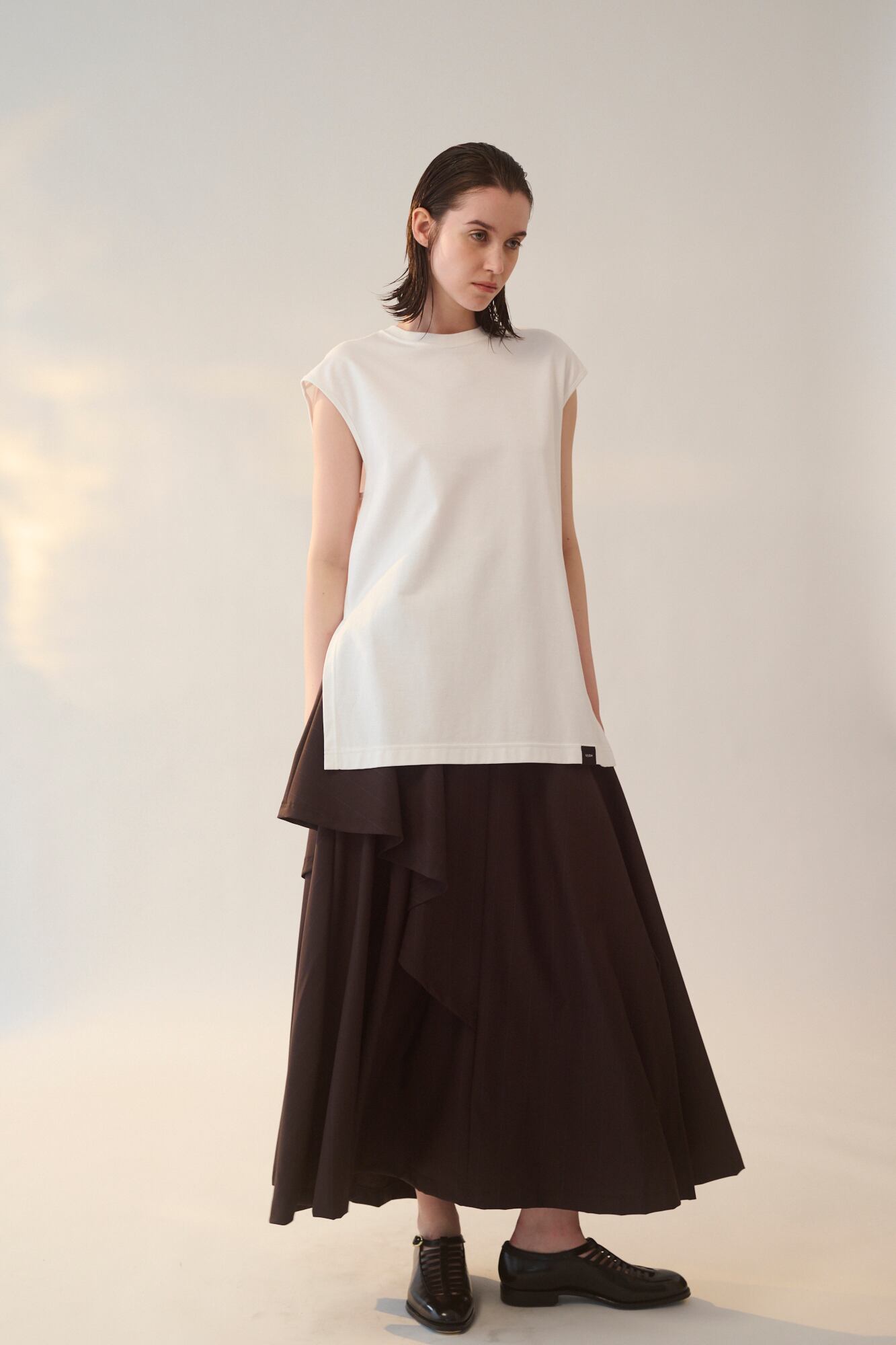程よいサイズ感のノースリーブTシャツ。1枚でもレイヤードスタイルのインナーにも着回しのきくアイテムです。両脇のスリットや段差のついた着丈もポイント。