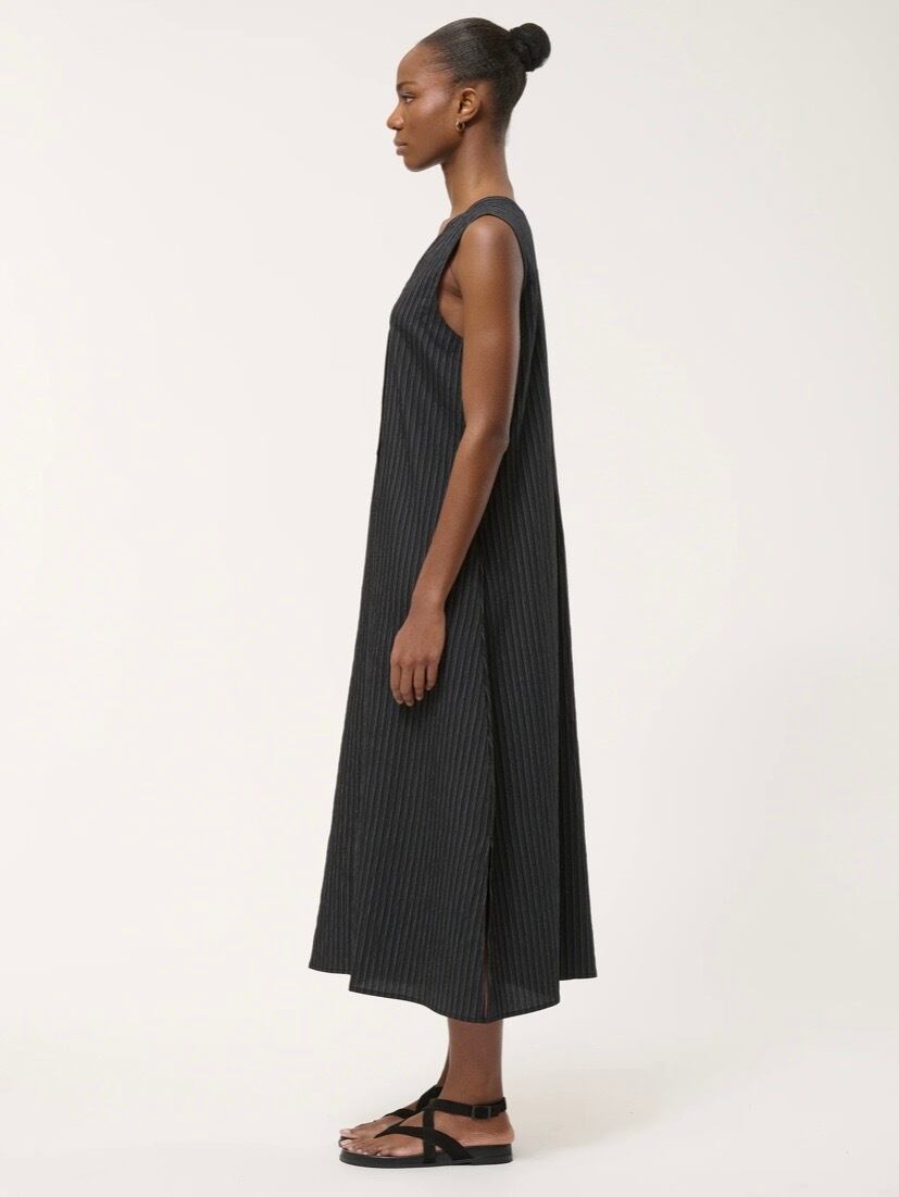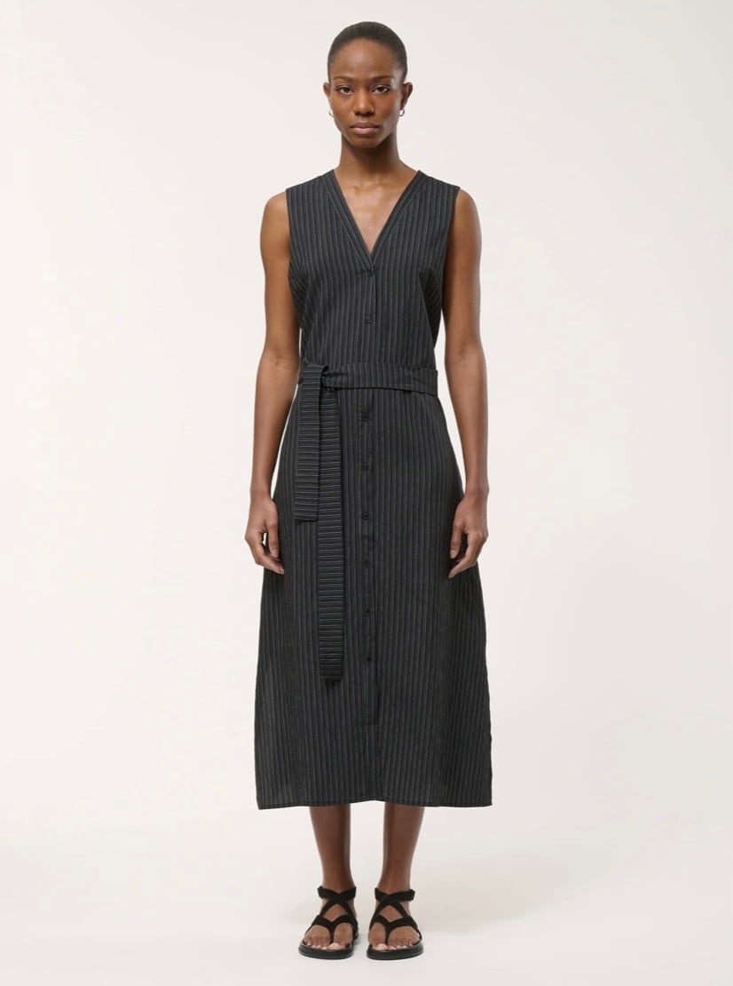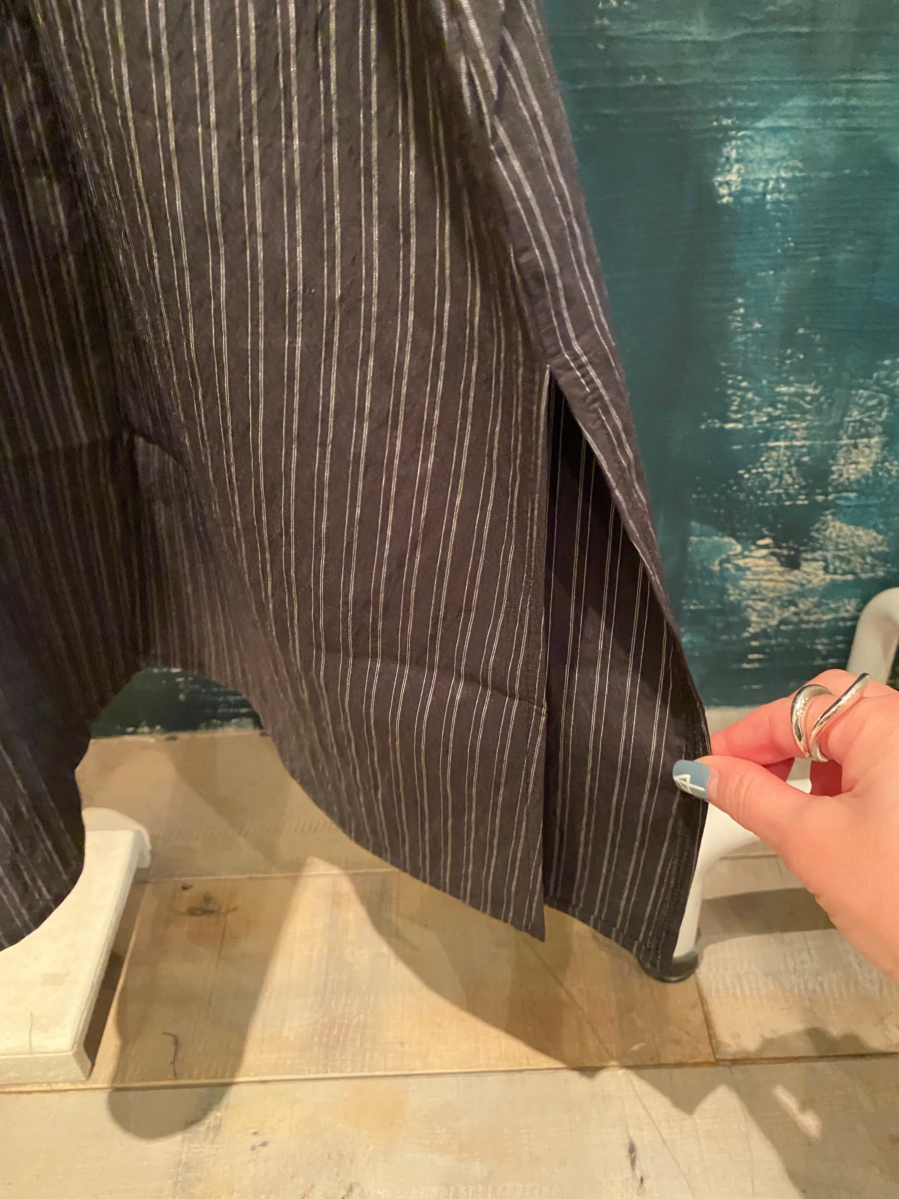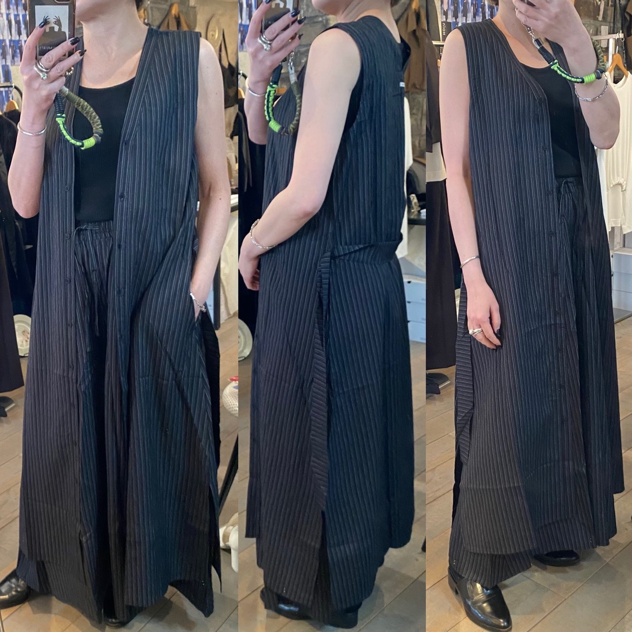 ロングジレはフロントボタン仕様、開けてサラッと着ても、閉めてワンピース見えする着方でも◎両サイドポケット有り、両サイド裾にスリットが入っているのでパンツやスカートなどともレイヤードしやすいです。