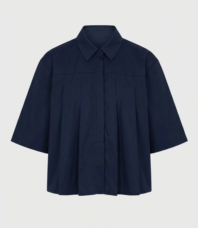 フロント部分のプリーツデザインがポイントのハーフスリーブブラウス。着丈や身巾など合わせるボトムを選ばないシルエット。重ね着無しで1枚で着れる、真夏でもキチンと見えしてくれるトップスです♪