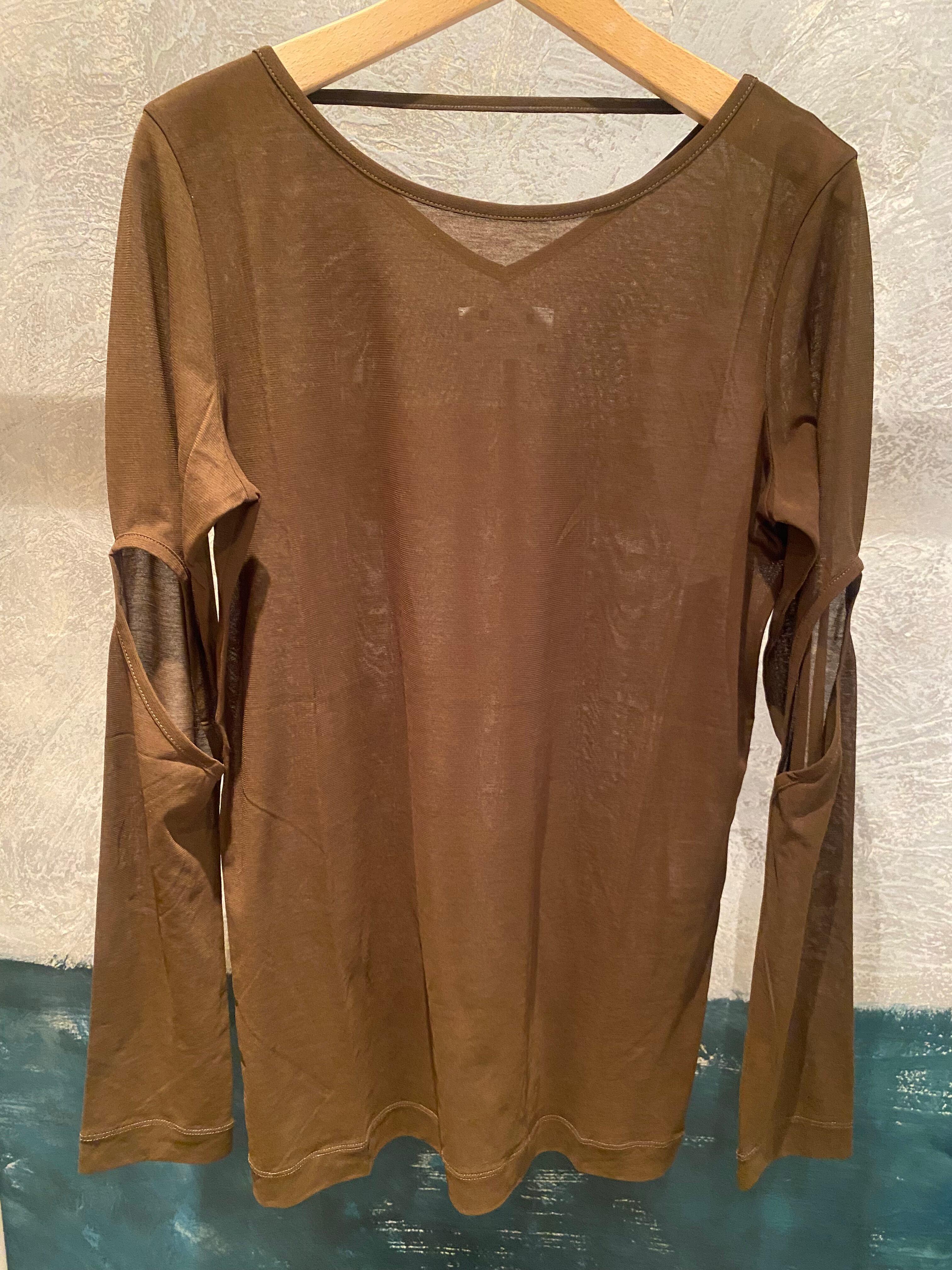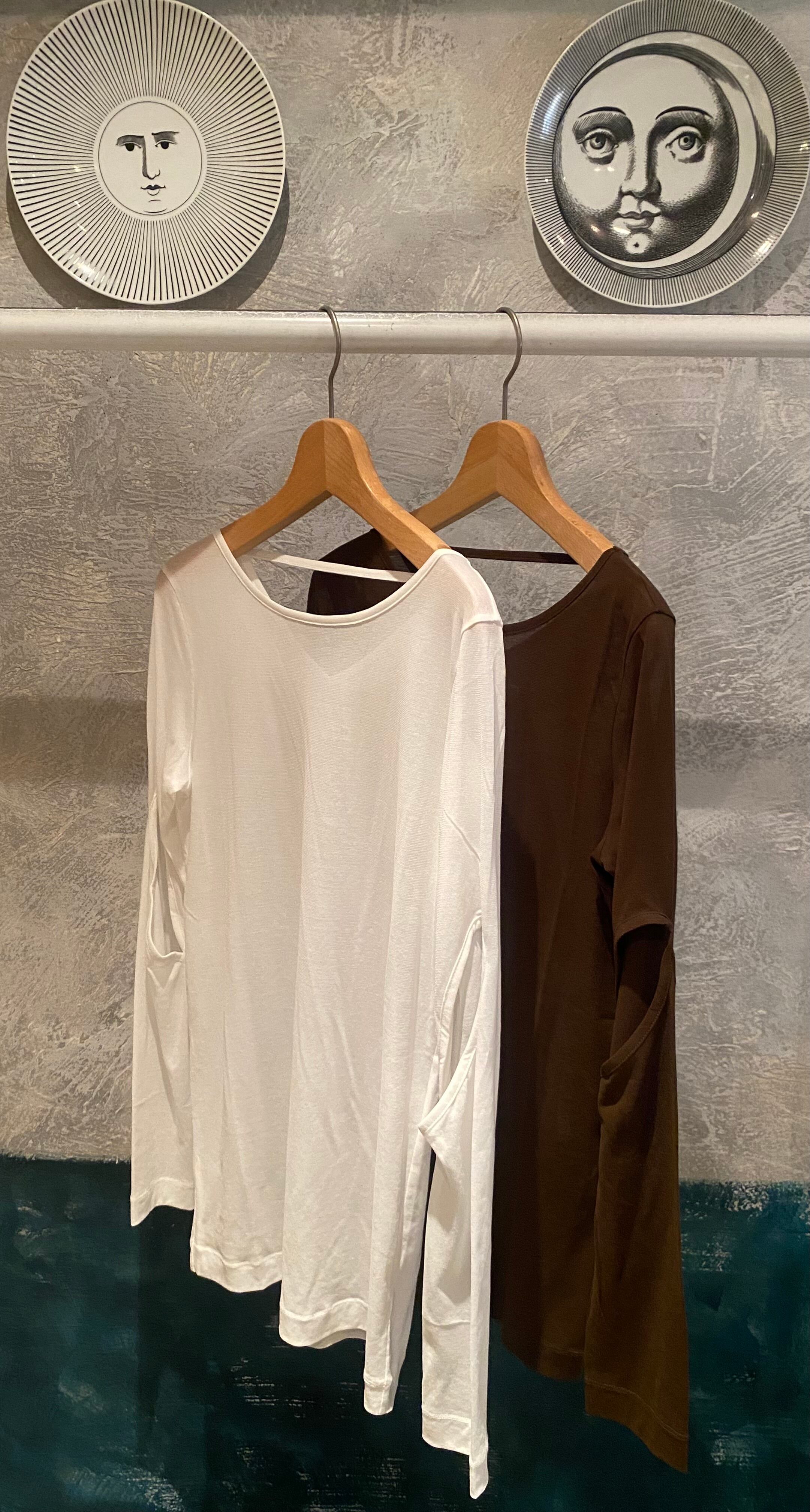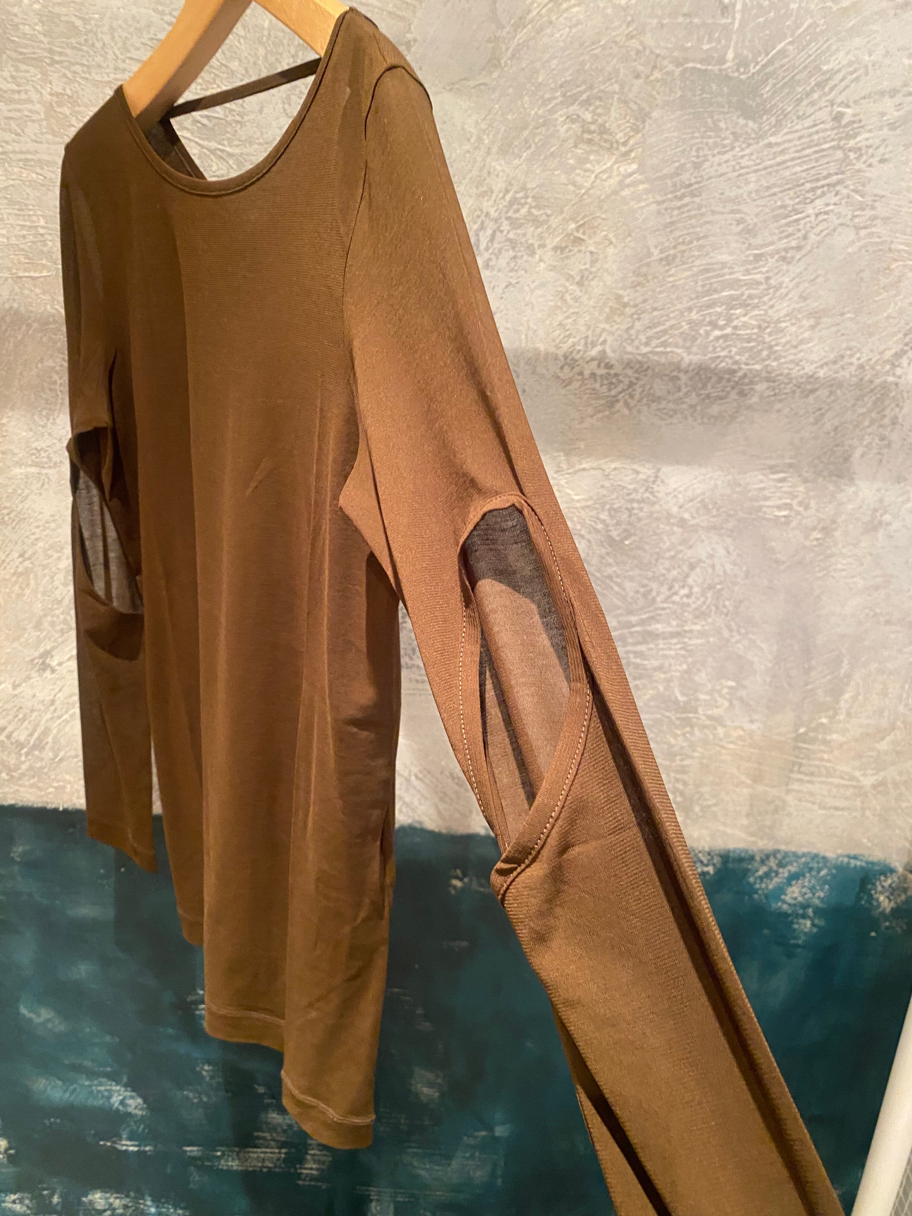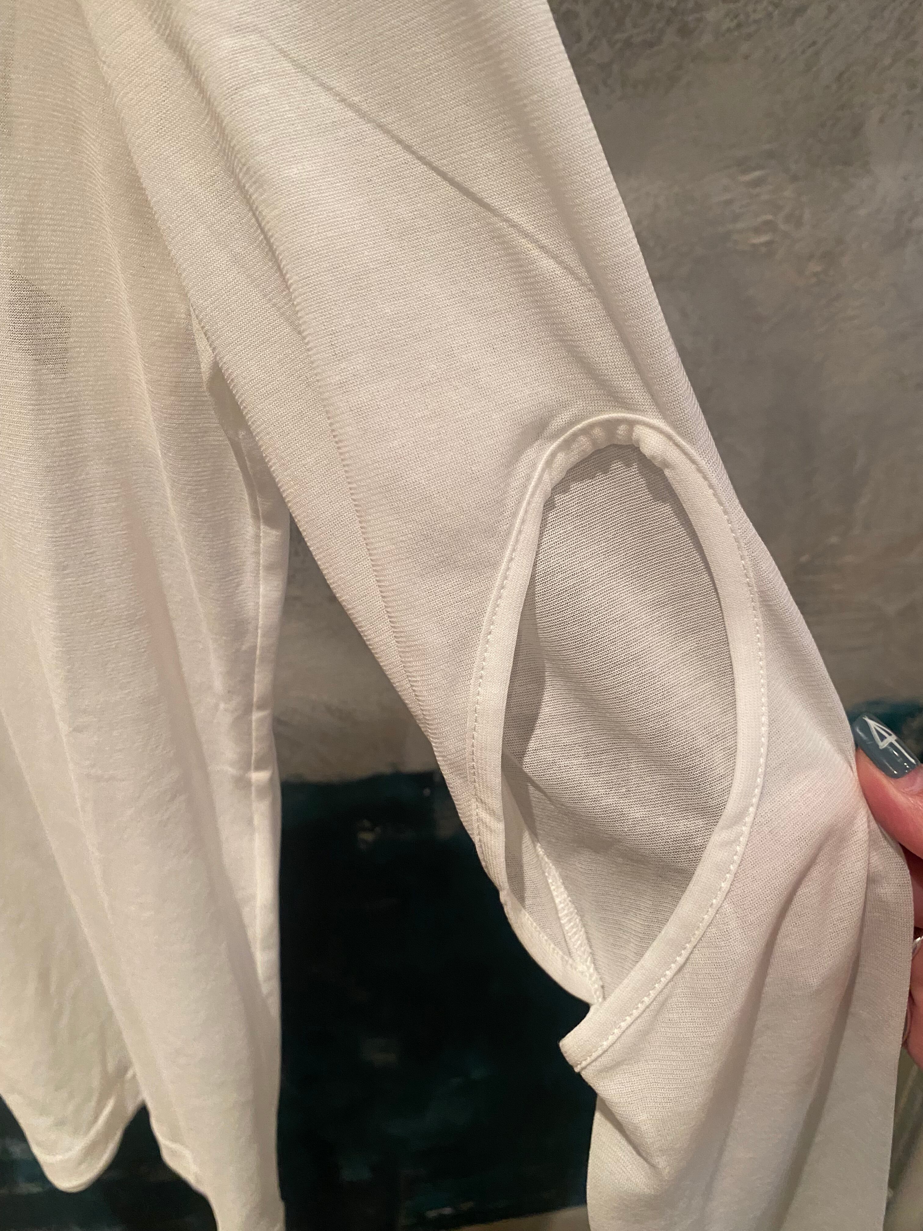 カットアウトスリーブのカットソー。強撚コットンでケバがなく、滑らかな表面のジャージー素材。お袖のカットアウトが特徴的なデザイン。後ろ衿ぐりに飾りテープデザイン。薄手のコットン素材でオールシーズン着回せ、レイヤードに便利です。