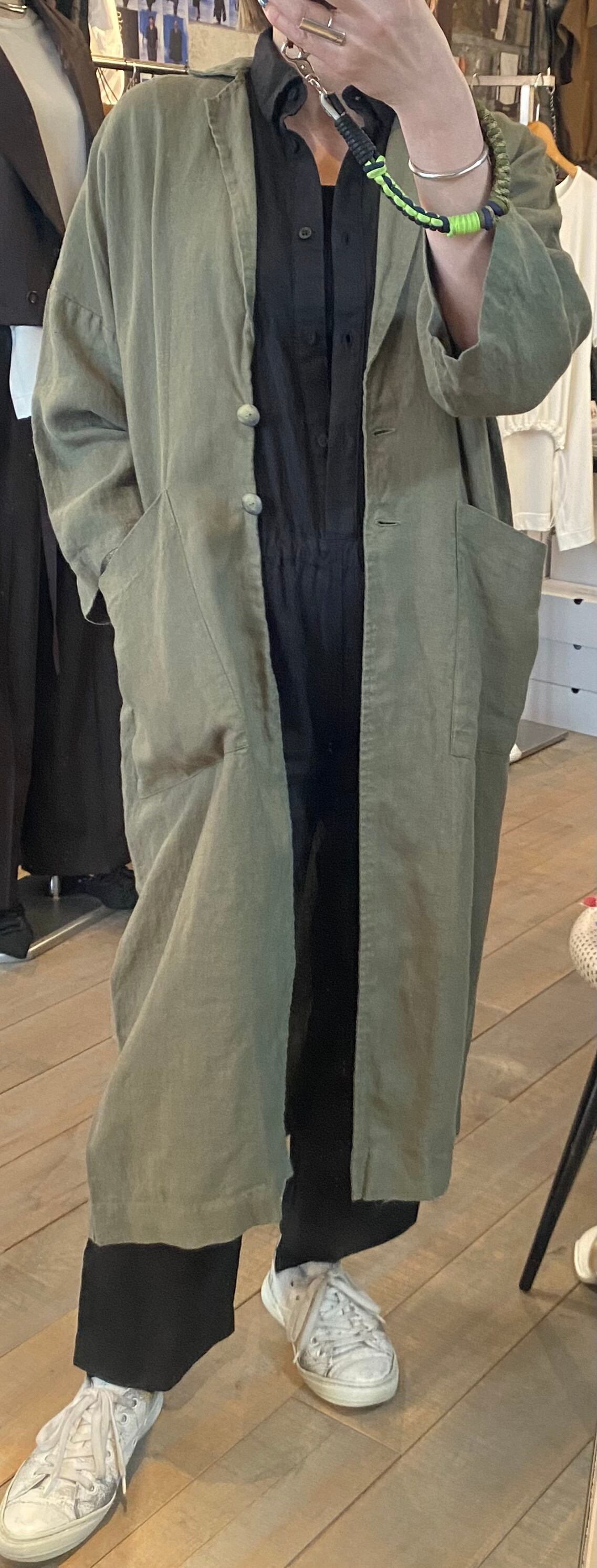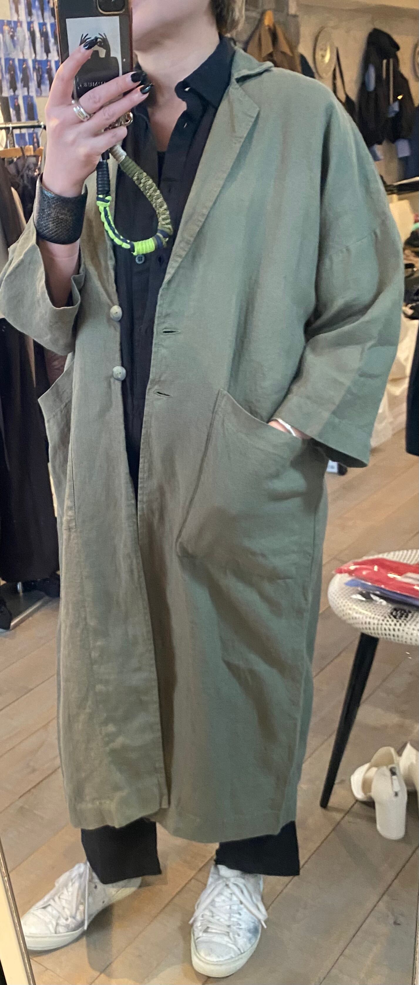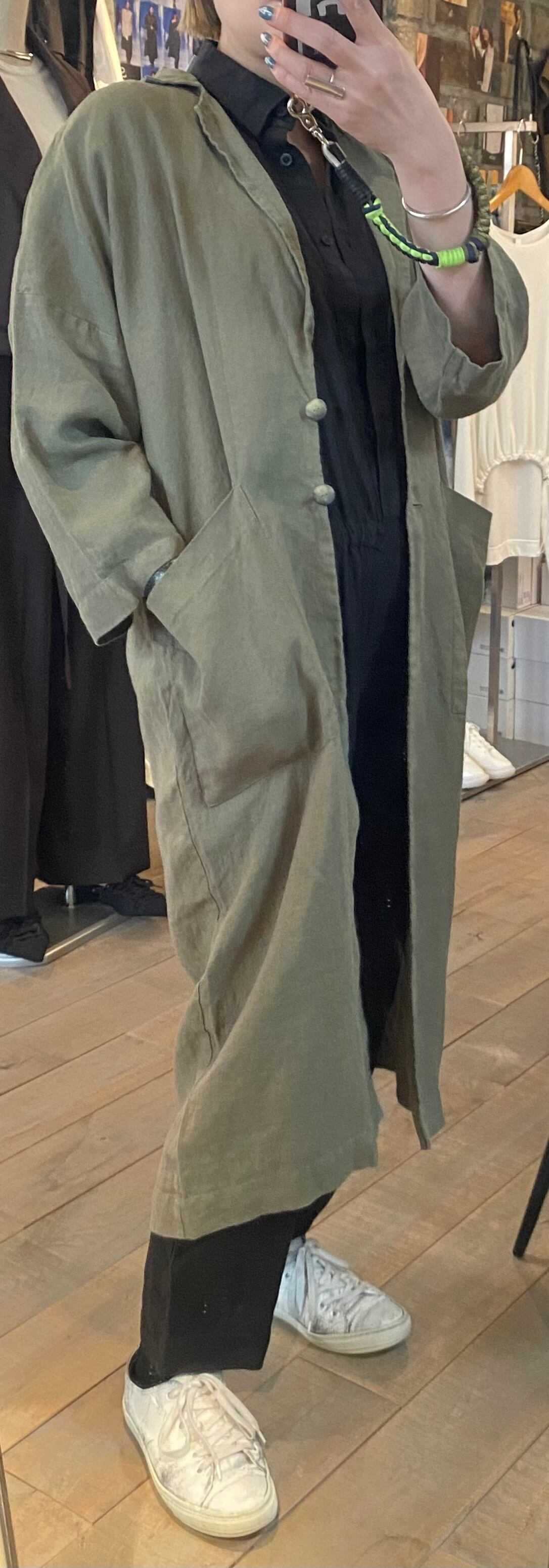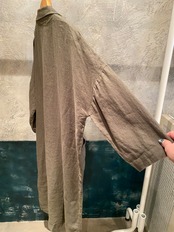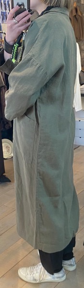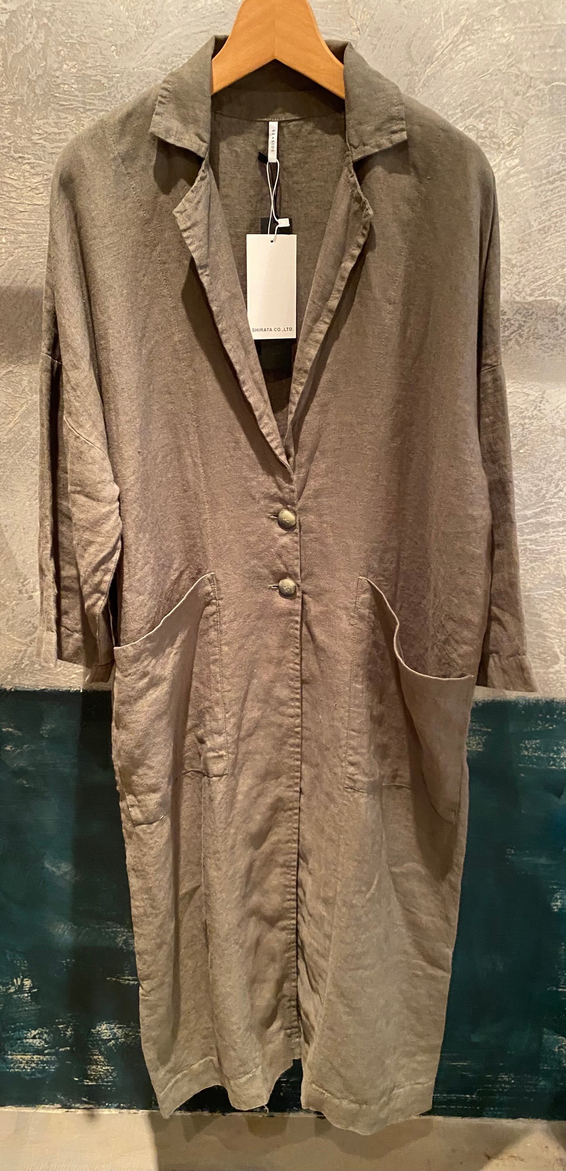 テーラードでサラッと羽織れるリネン素材の軽めのコート。麻素材なので夏に向けても活躍するアウター。程よくオーバーサイズでどなたでも取り入れやすいシルエット。両サイドポケット有り。