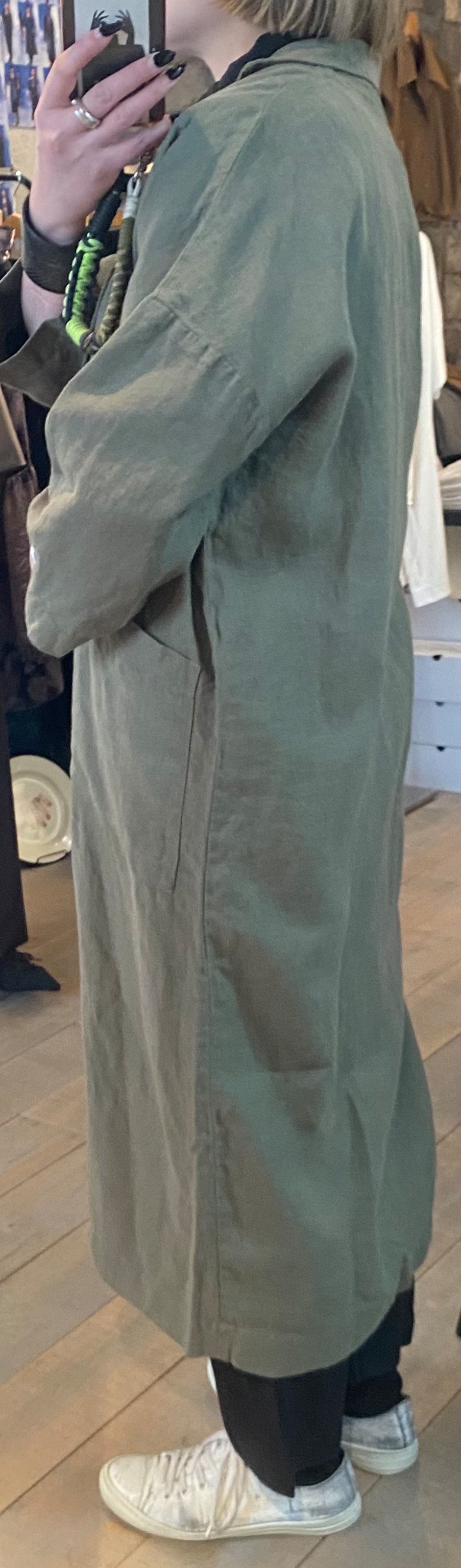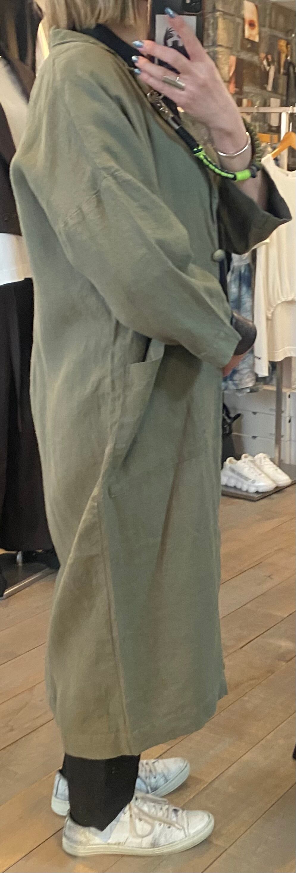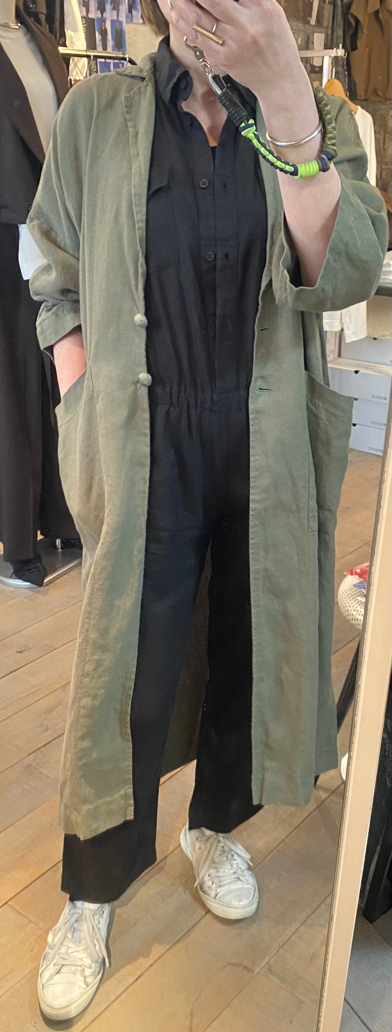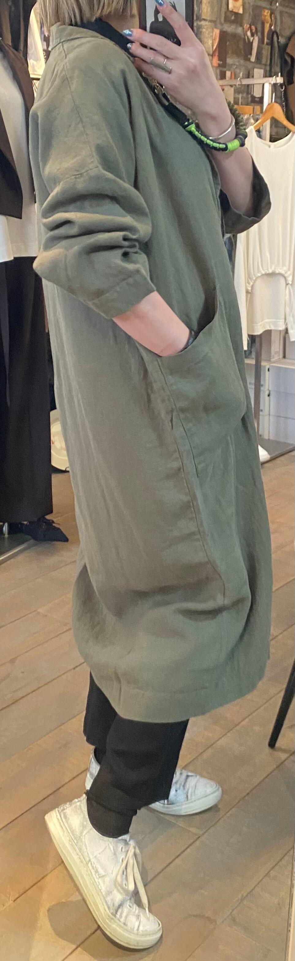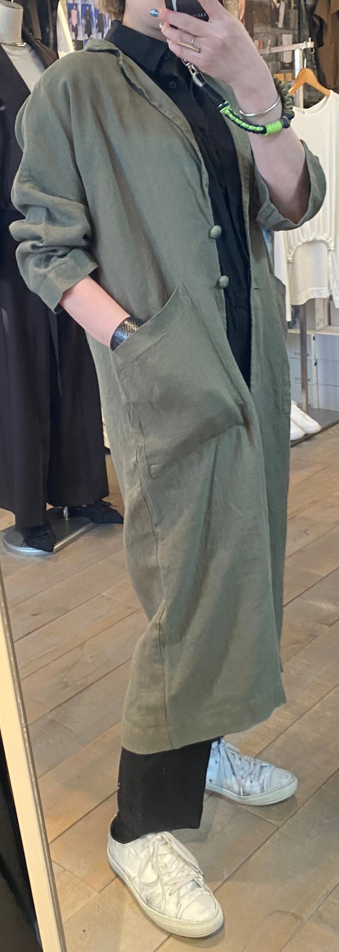 テーラードでサラッと羽織れるリネン素材の軽めのコート。麻素材なので夏に向けても活躍するアウター。程よくオーバーサイズでどなたでも取り入れやすいシルエット。両サイドポケット有り。