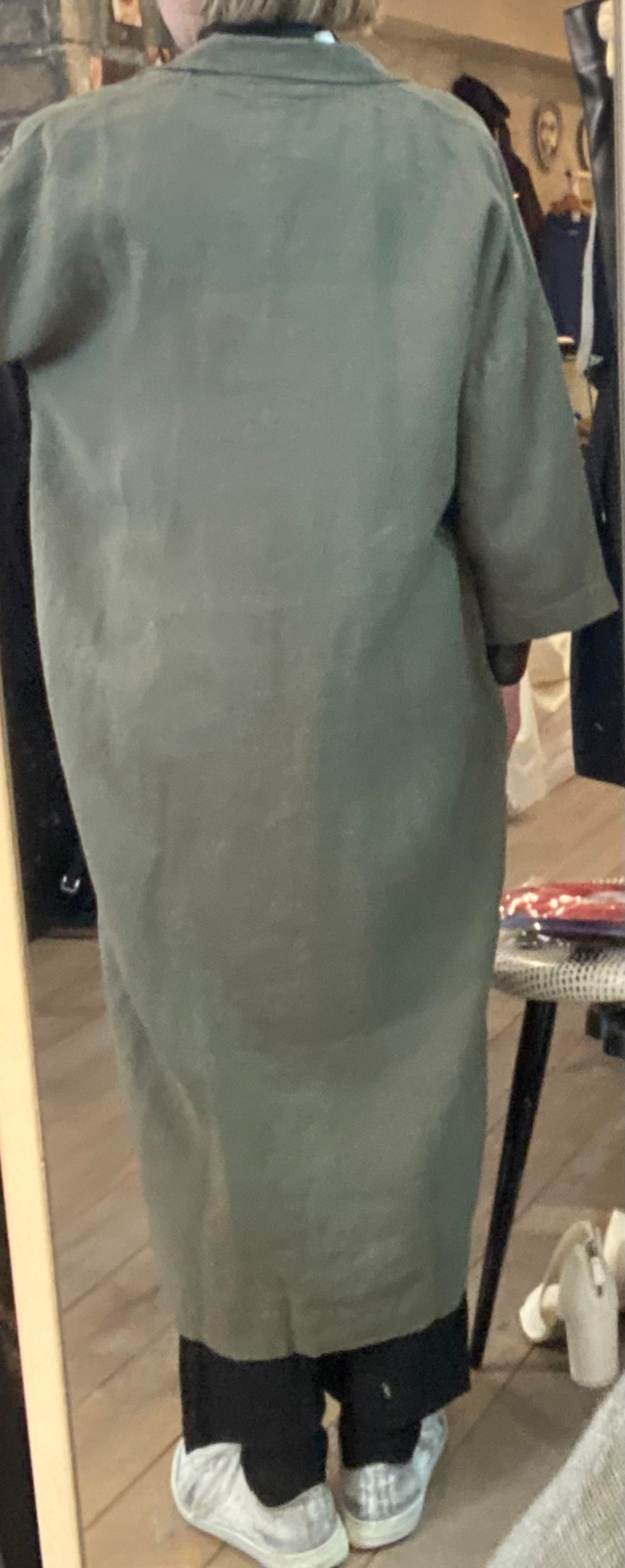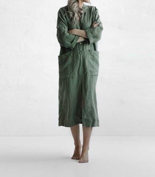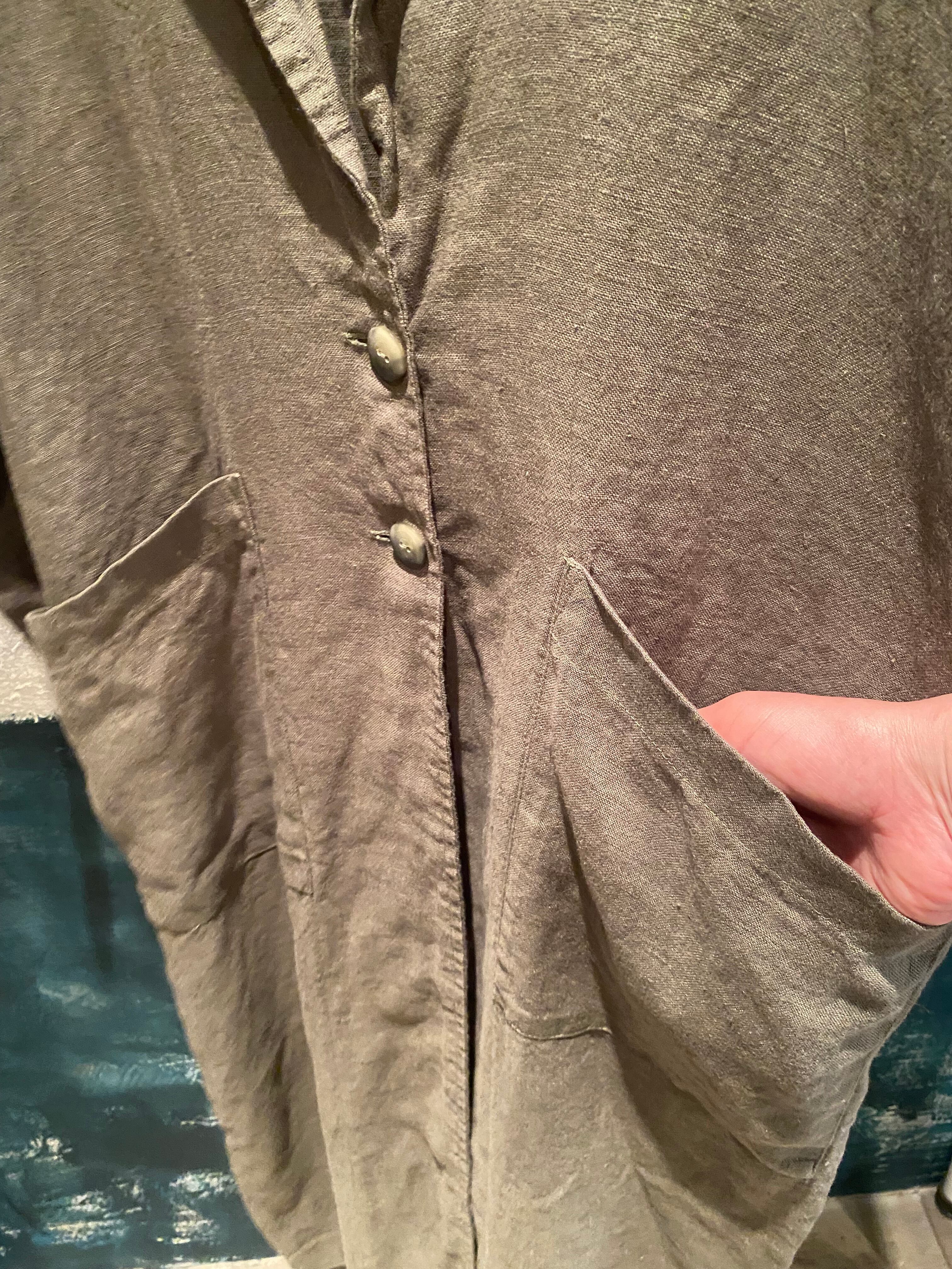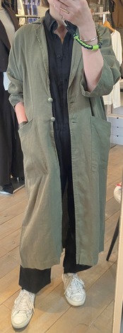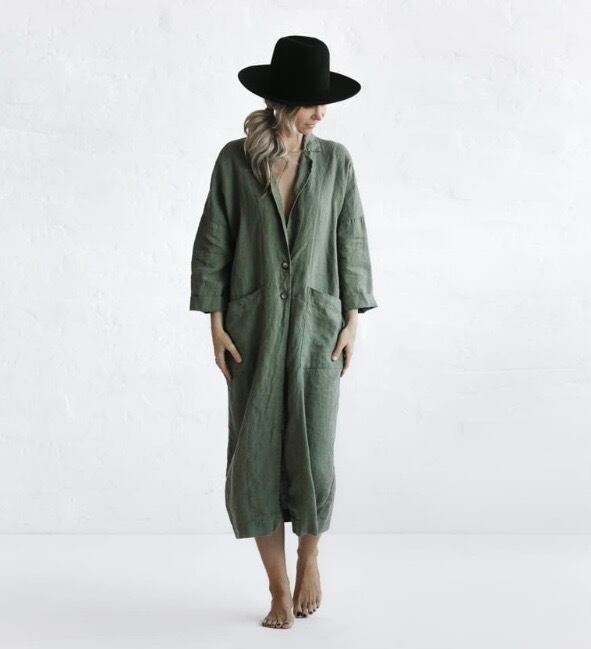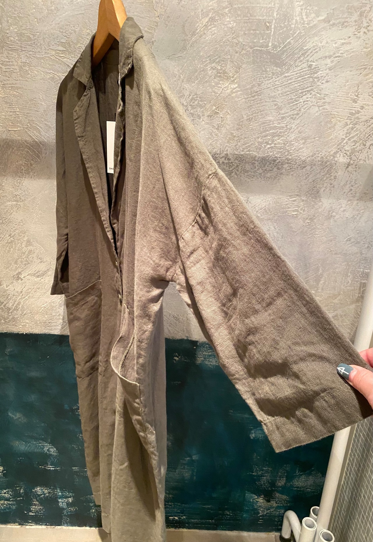 テーラードでサラッと羽織れるリネン素材の軽めのコート。麻素材なので夏に向けても活躍するアウター。程よくオーバーサイズでどなたでも取り入れやすいシルエット。両サイドポケット有り。