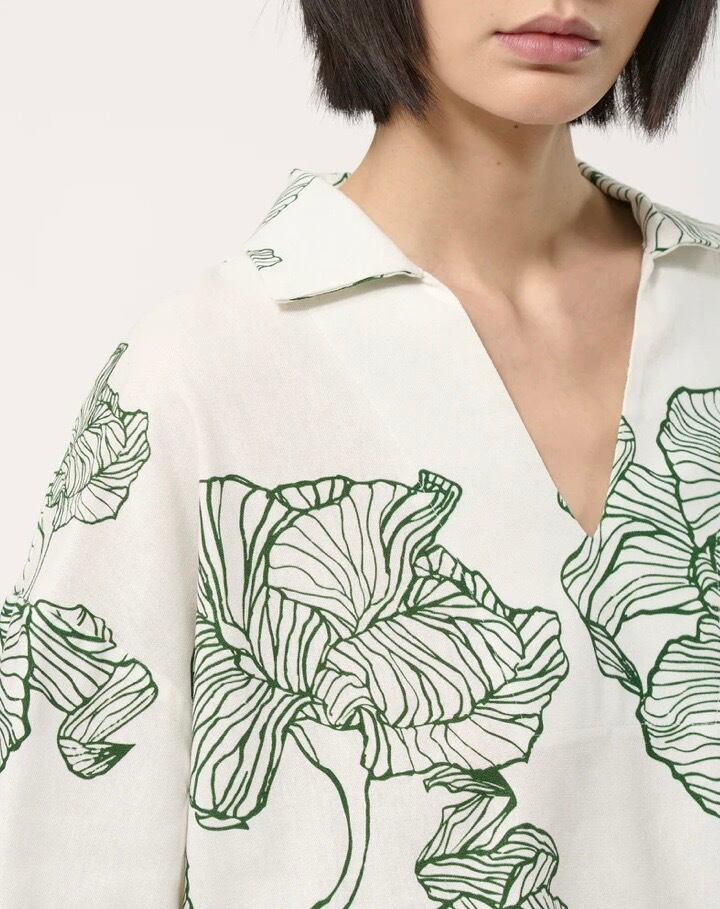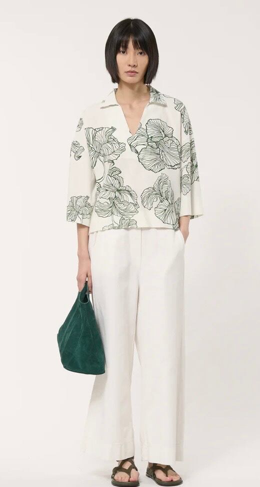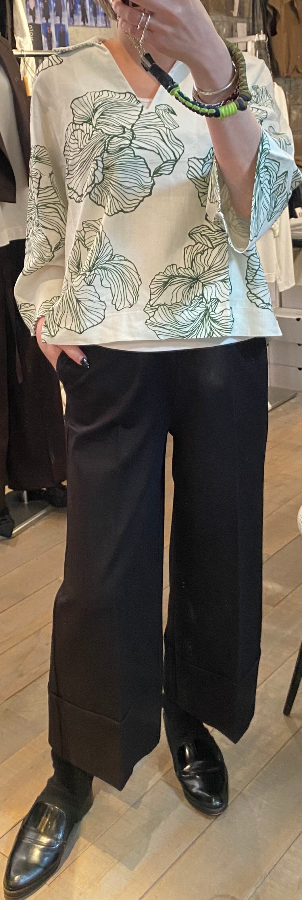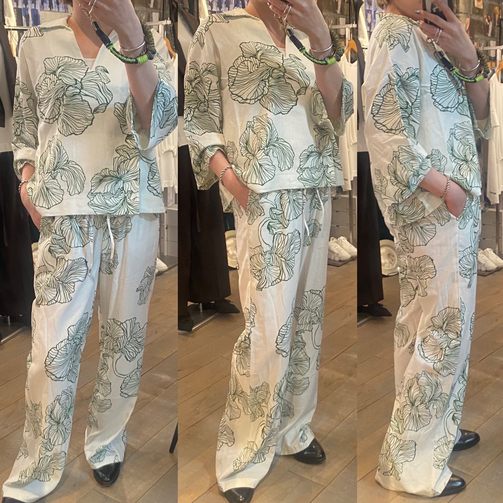 2トーンでまとまったプリントが目を引くレーヨンリネン素材のトップスとパンツ。真夏に活躍するイージーケアアイテム。
