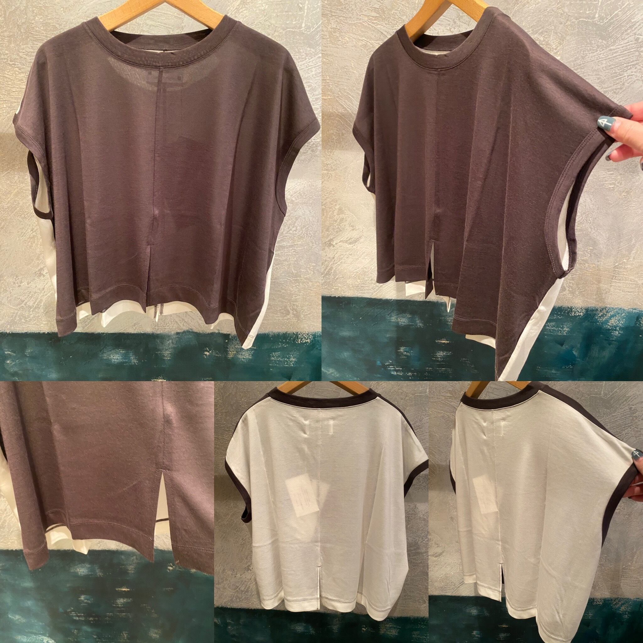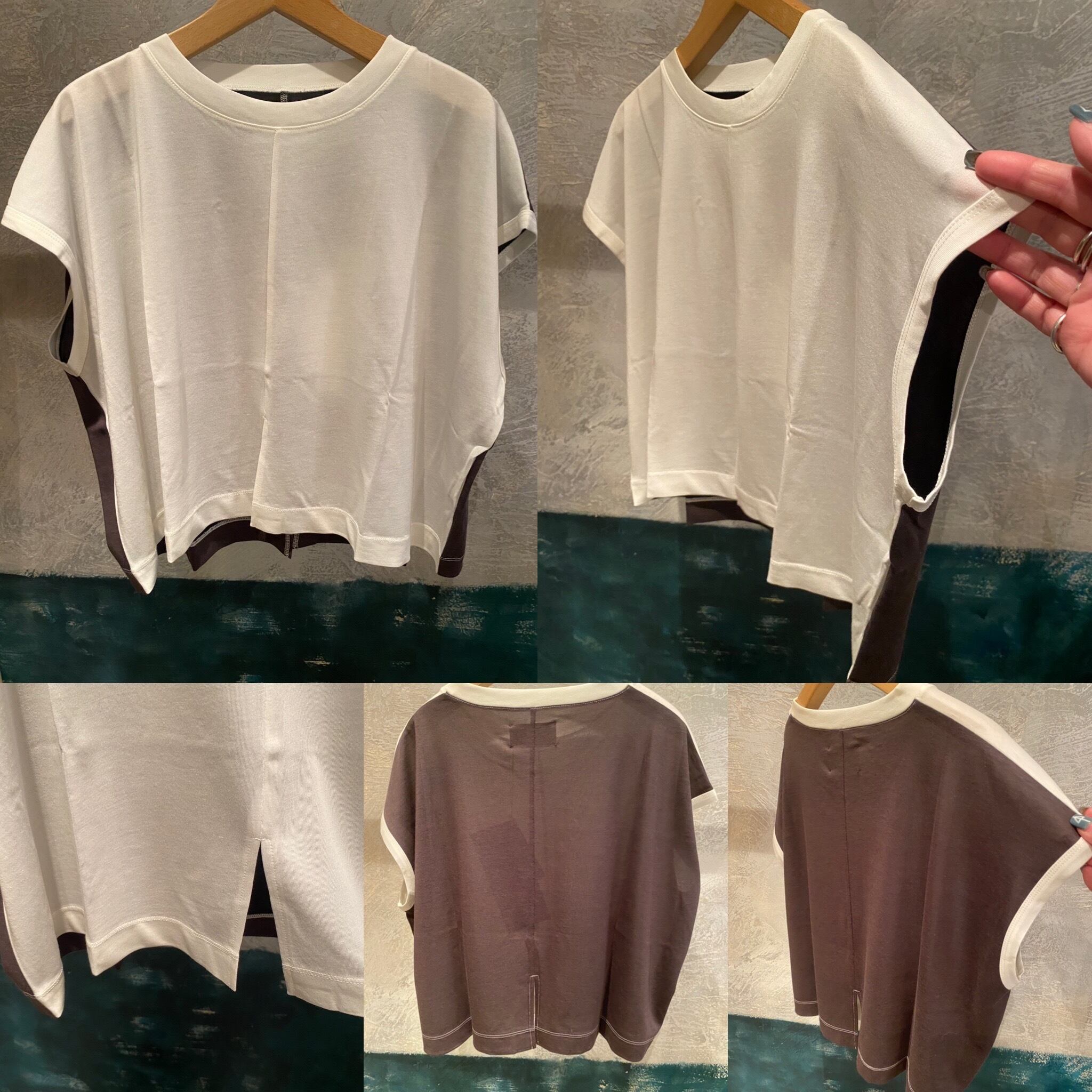 バランスのとりやすいショート丈のプルオーバーTeeは、前後で配色を変えたデザインが特徴的。前後の裾にスリットを入れているデザインもポイントに。やや透け感があるぐらいの生地感で、着心地抜群。