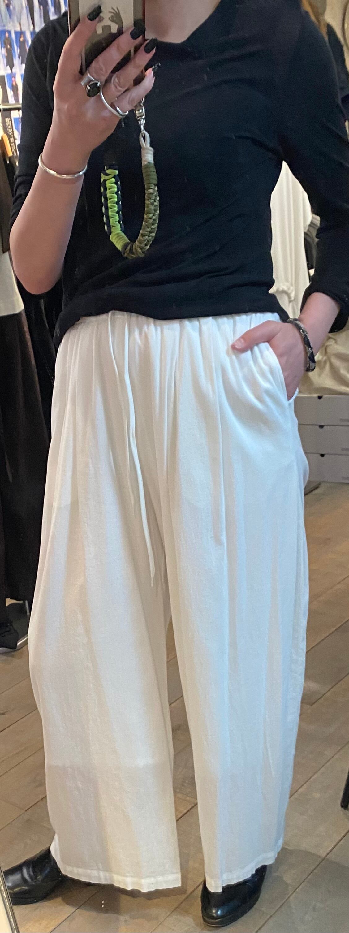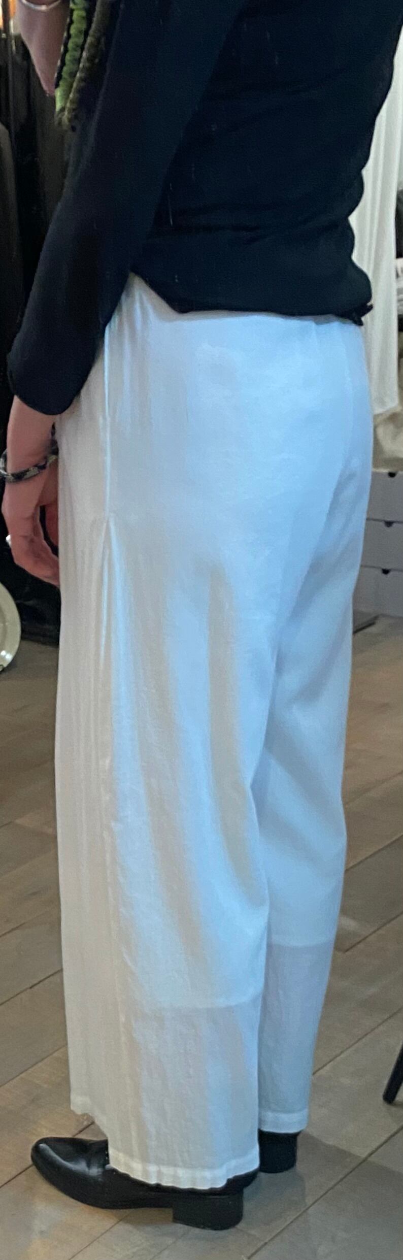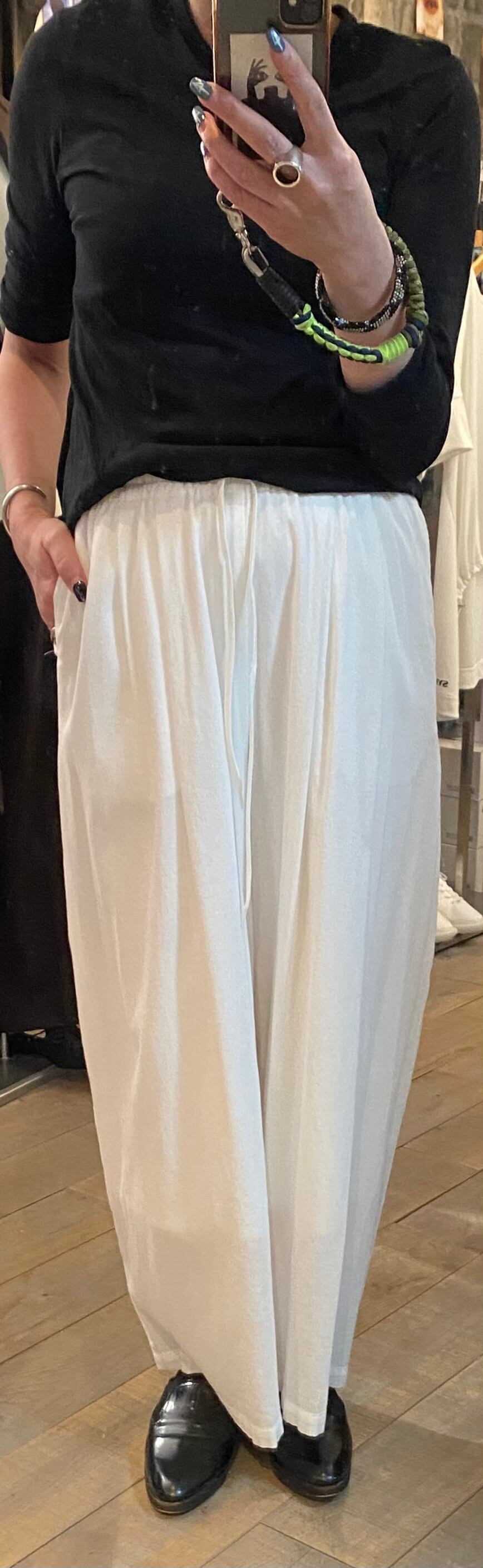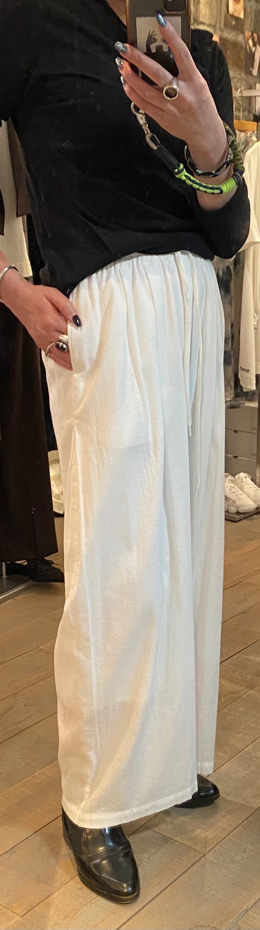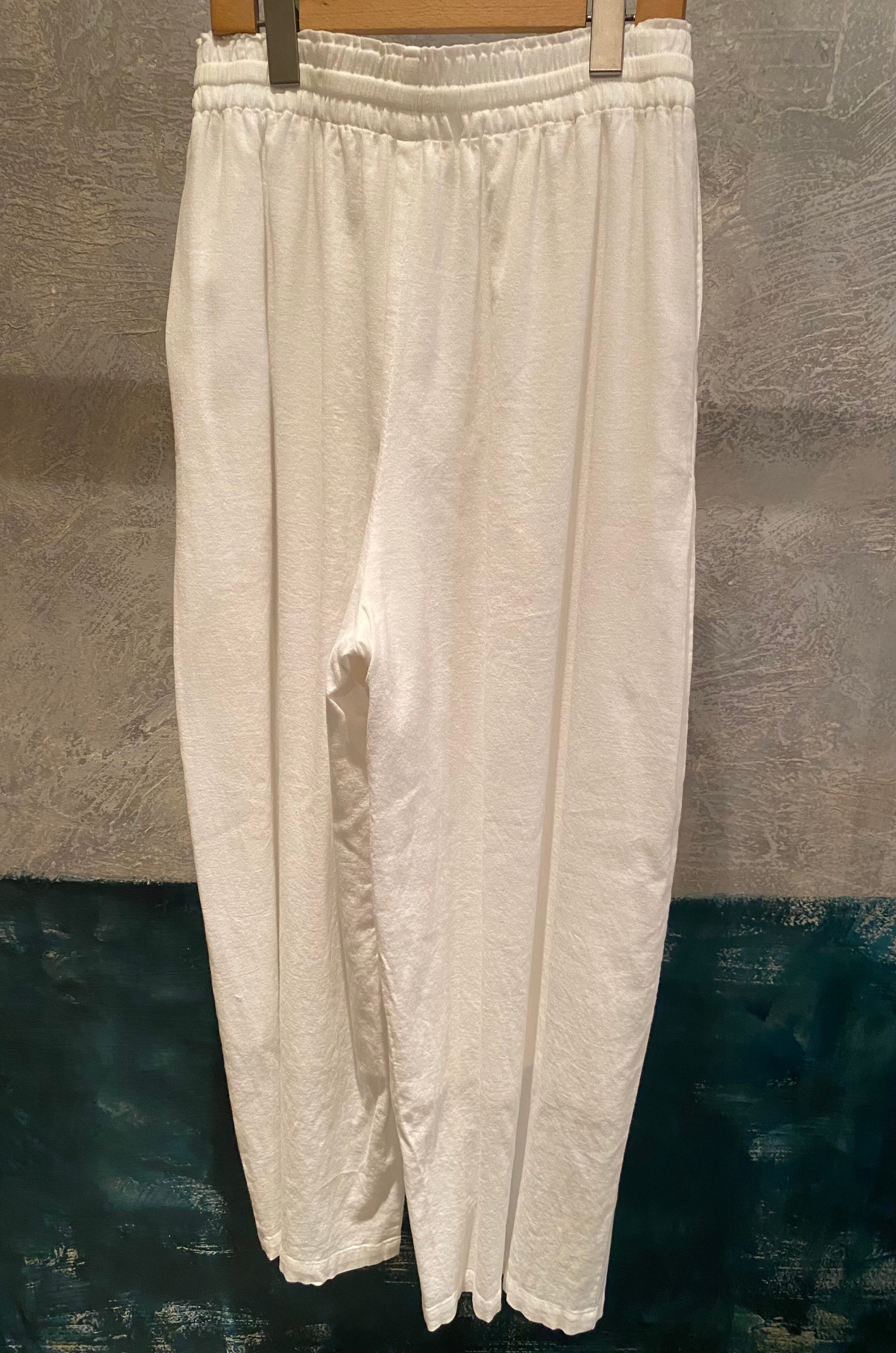 TAKASHIMA CHIJIMIの素材を使用したパンツ。裾に向かって緩やかに細くなるテーパードシルエットのイージーパンツ。