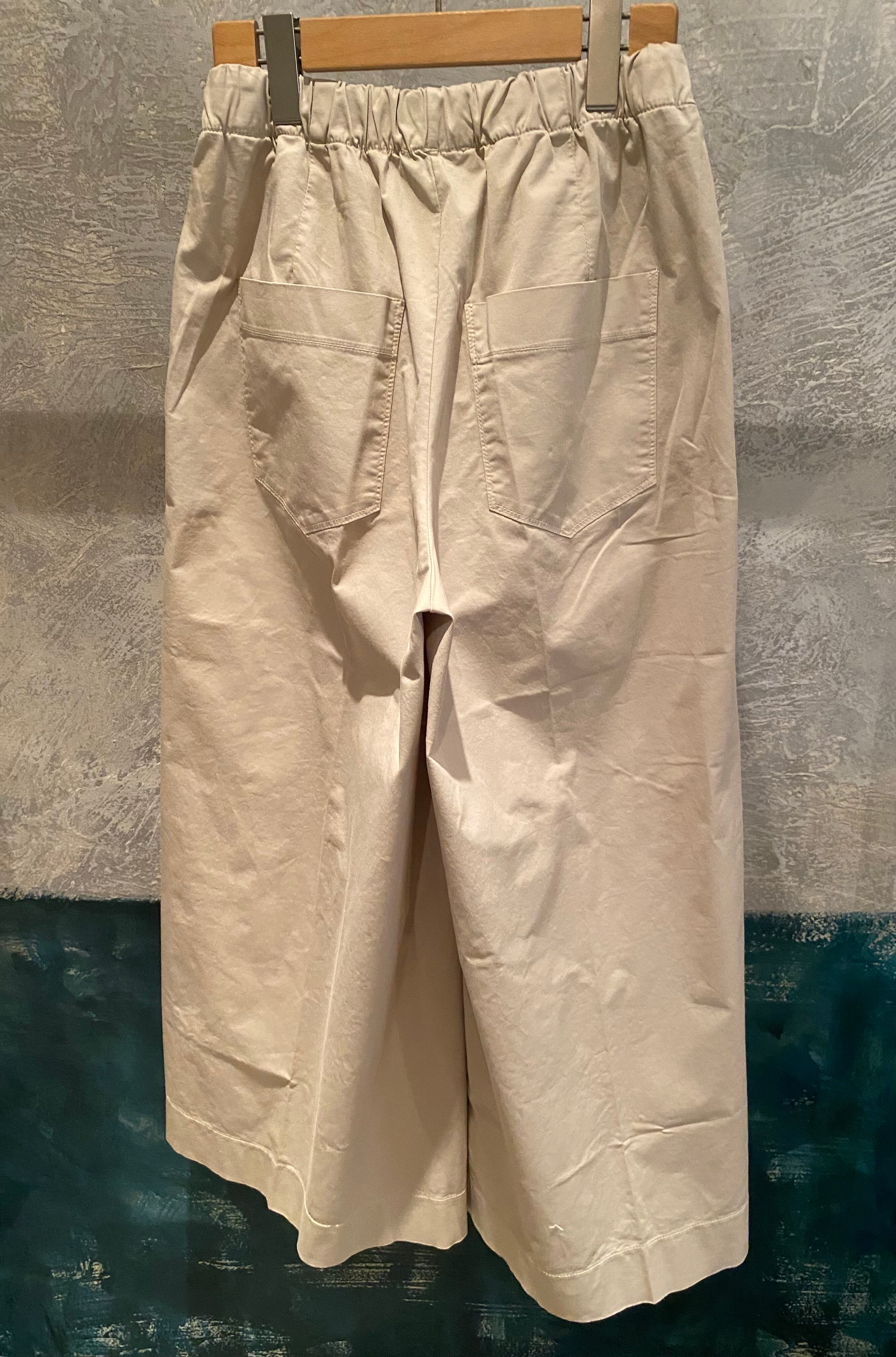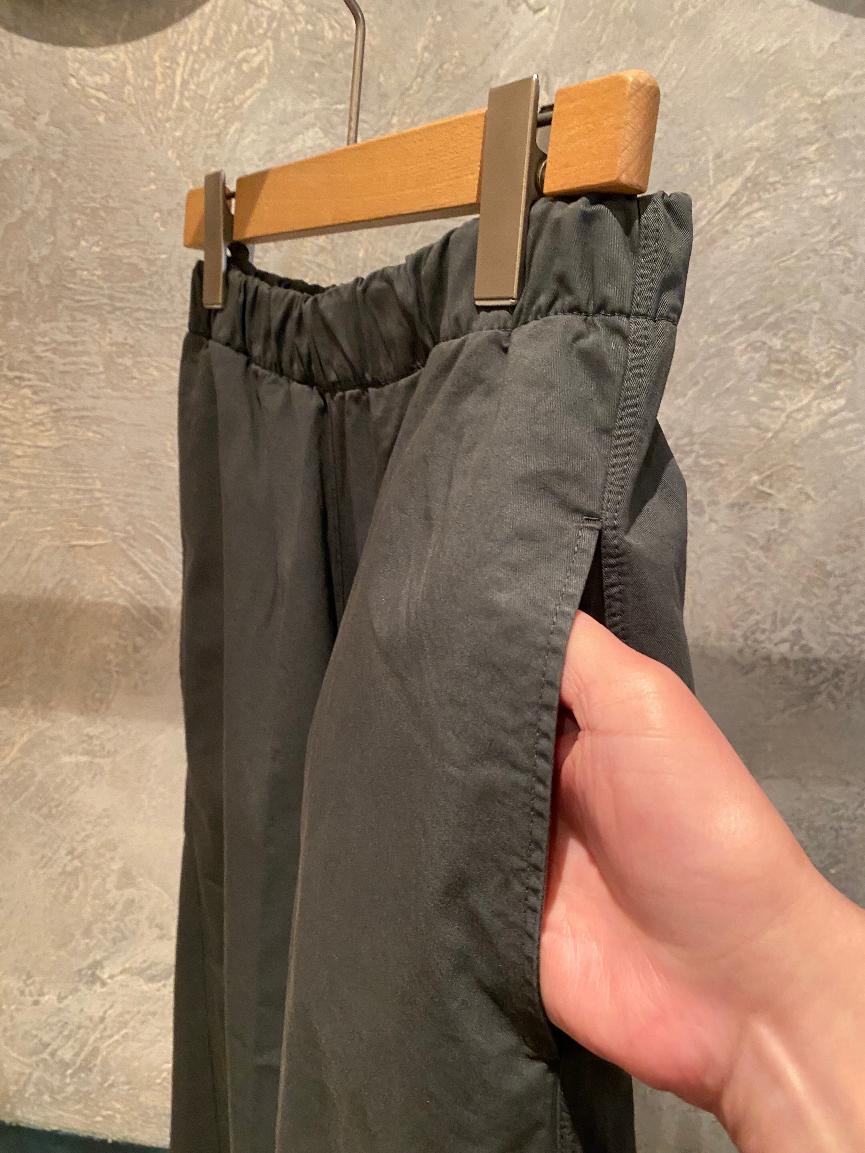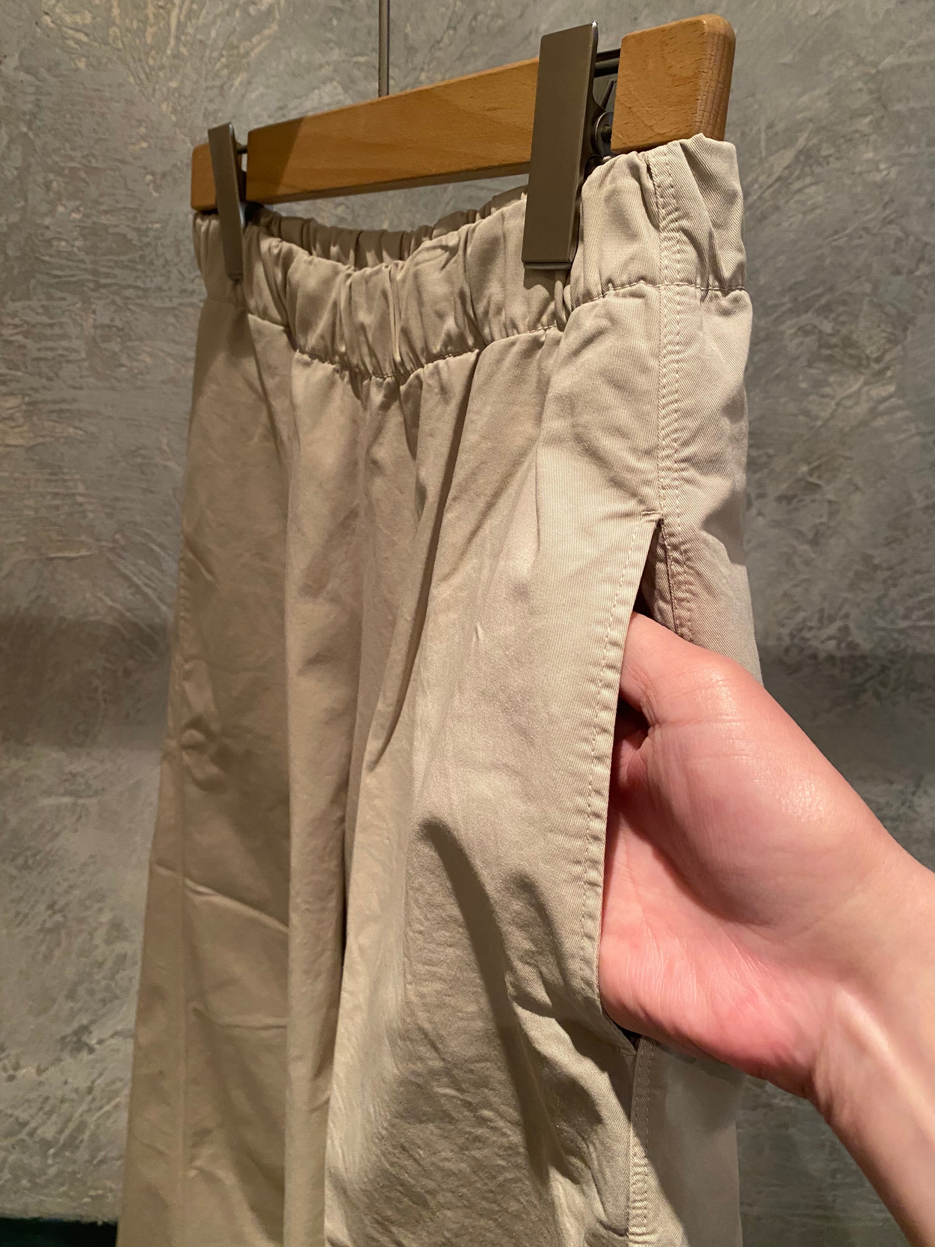 コットンツイル素材で軽くて履き心地の良いバギーパンツ。腰回りはスッキリで、裾に行くほど広がるバギーパンツは脚長効果◎ウエストは総ゴムでストレッチも効いている楽チンパンツ。これからの季節のヘビロテパンツです。摩擦に強く耐久性も良くシワになりにくく日常使いに適してるのが特徴的な素材。適度なハリと光沢感があり、カジュアルながらキレイめな印象を与えてくれます。