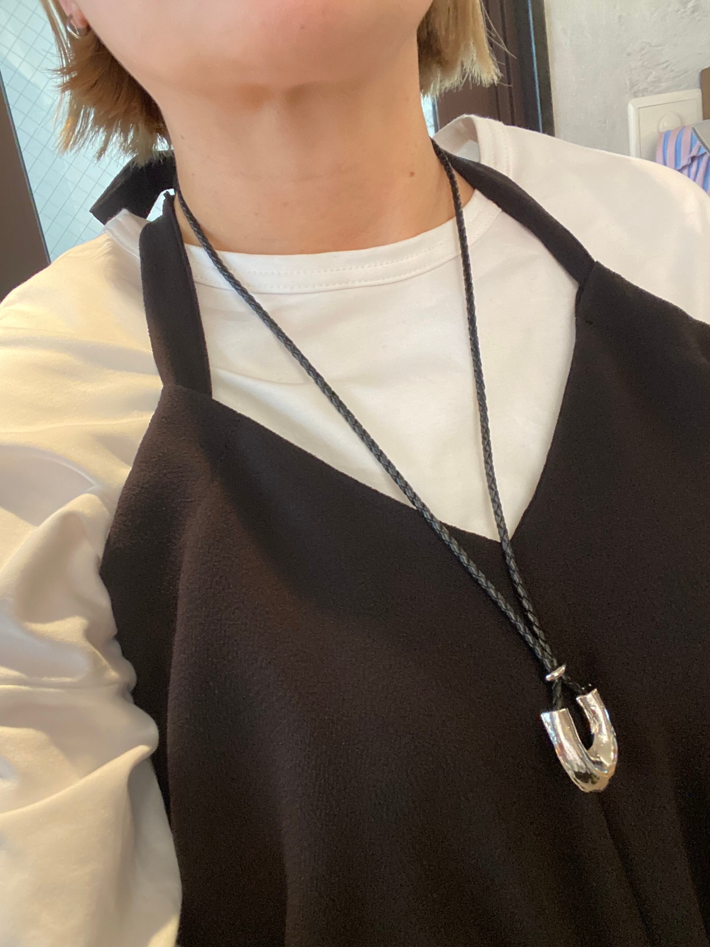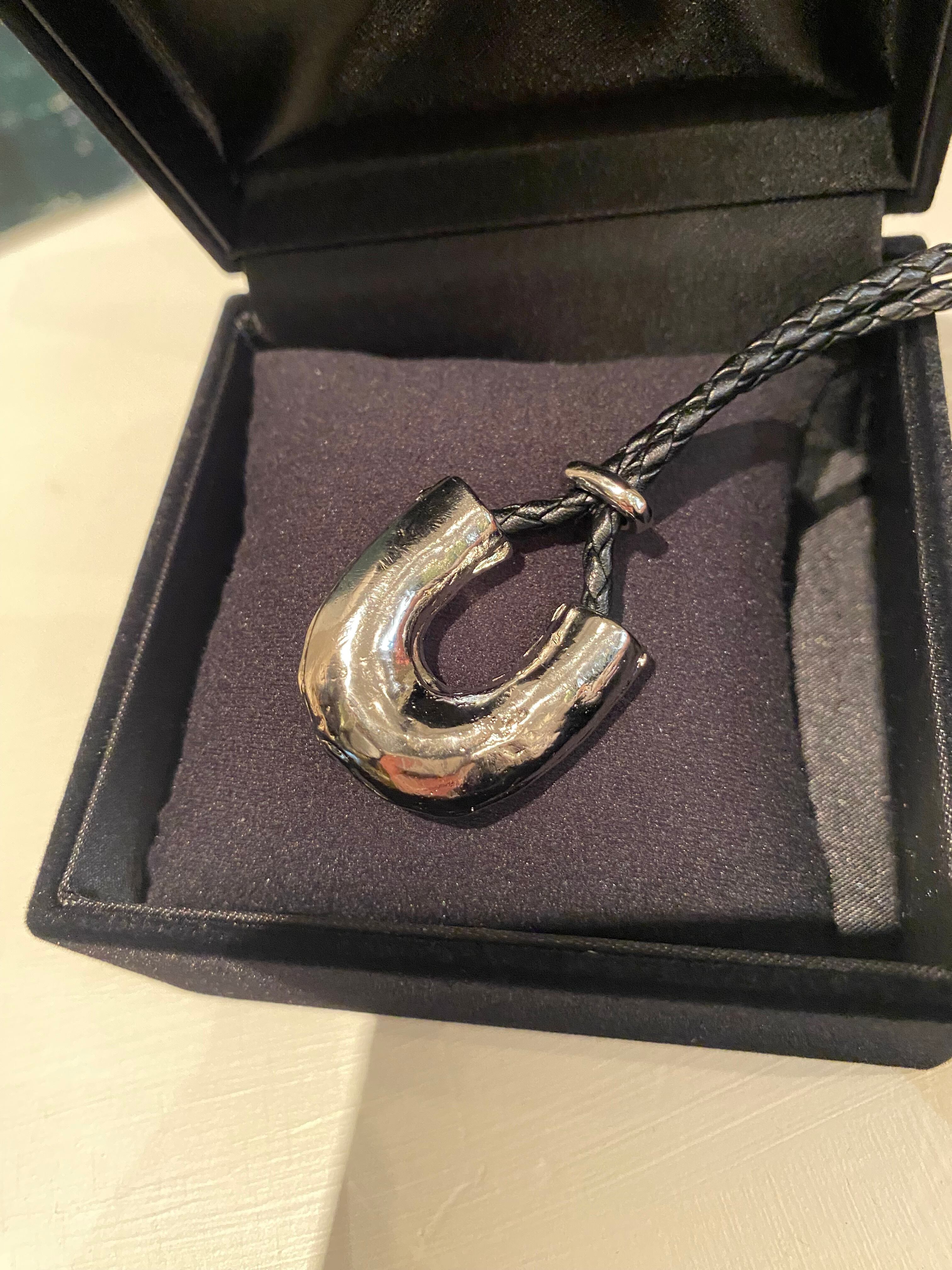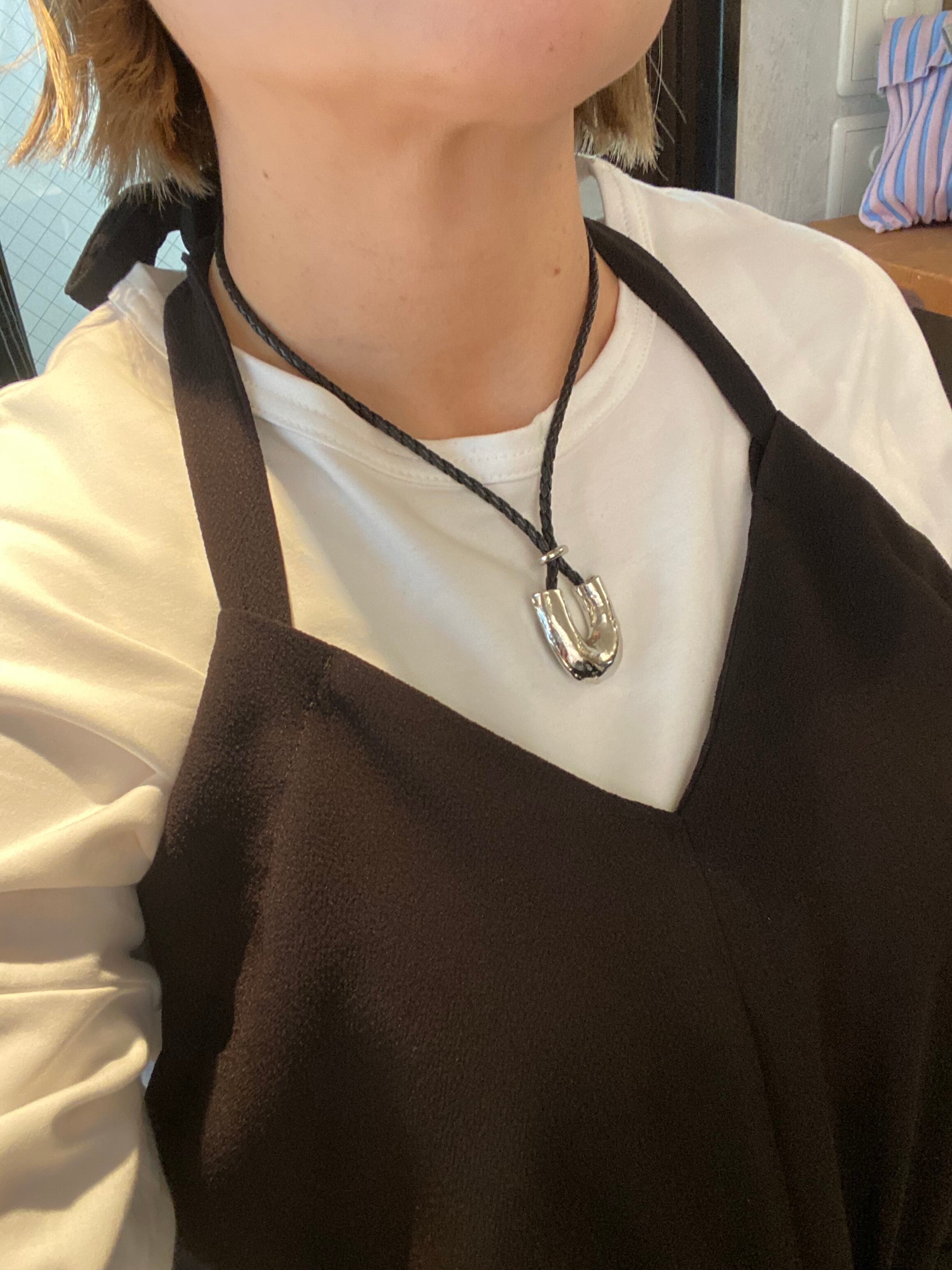 ネックレスは、海岸や浜辺に打ち上げられた漂流物を収集、観察するビーチコーミングをインスピレーションとしたシリーズです。ブランド名の頭文字であるUの字を模したデザインのグラスホルダーネックレスです。字を波や風に削られた海の漂流物のような独特な表面感が、自然が生み出す経年美を演出します。