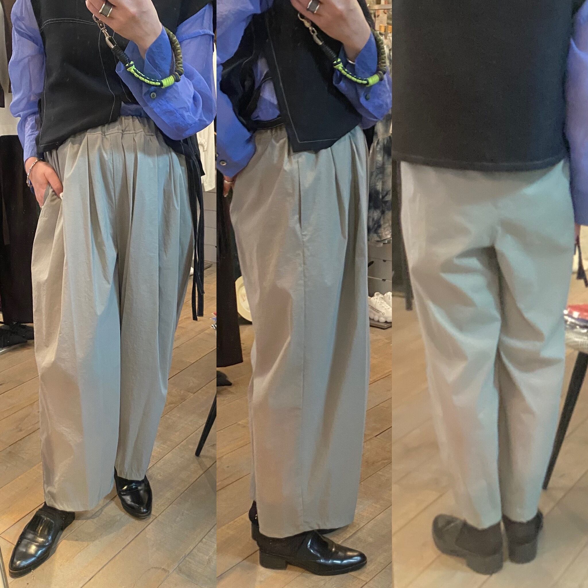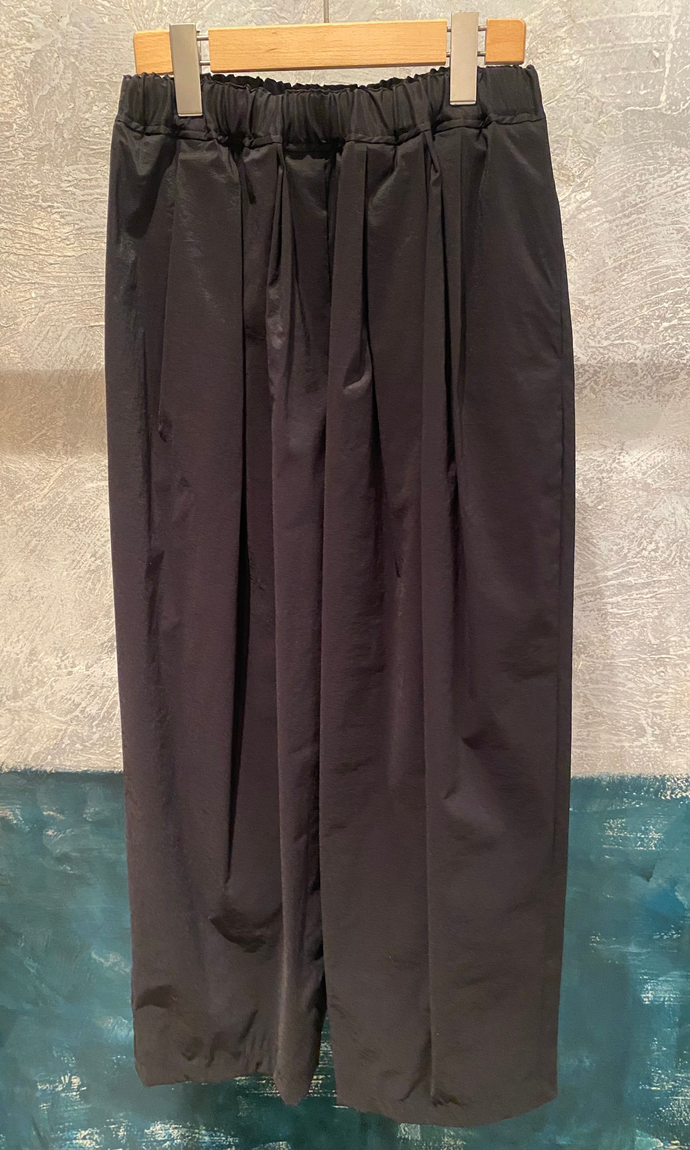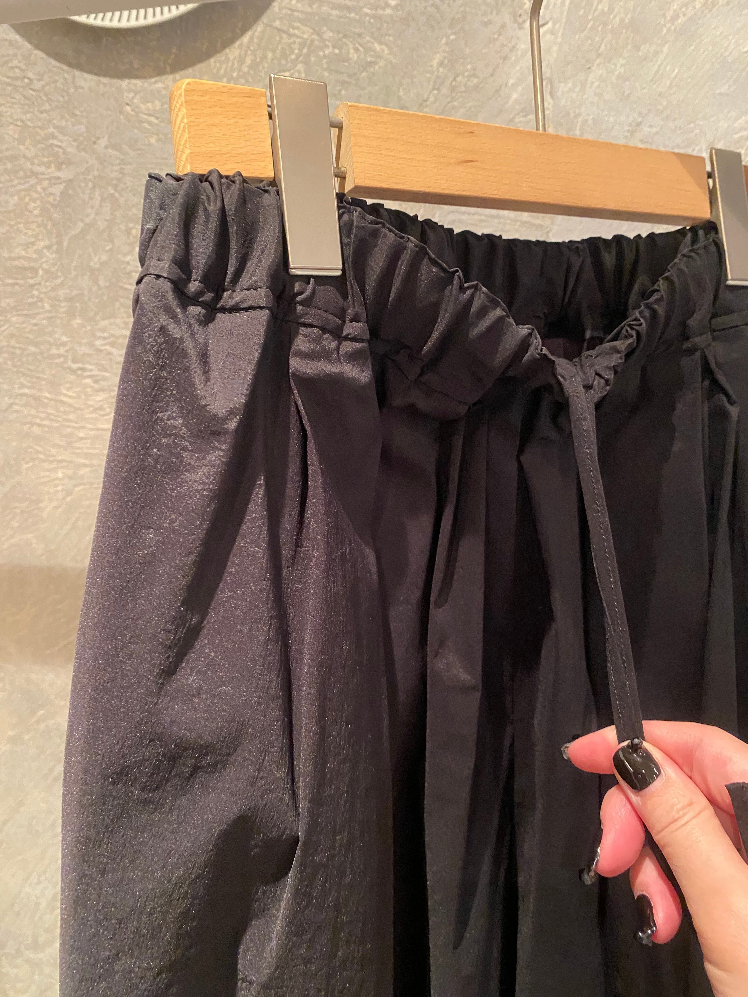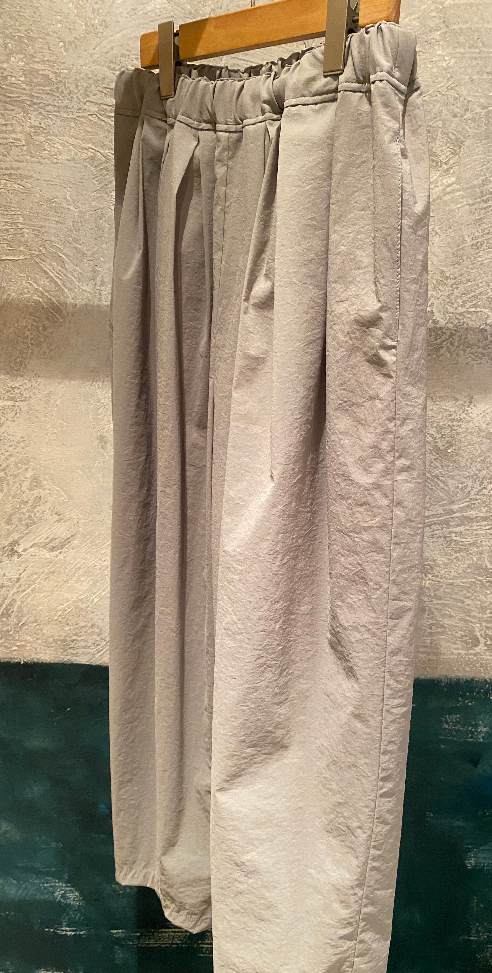 トレンド感のあるペーパーライクナイロン素材のタックギャザーパンツ。ボリュームのあるコクーンシルエットが特徴的で、とても軽く軽快な印象。カジュアルにもモードにも振れるデザインで、着回し力抜群アイテム。幅広い体型に対応できるフリーサイズです。