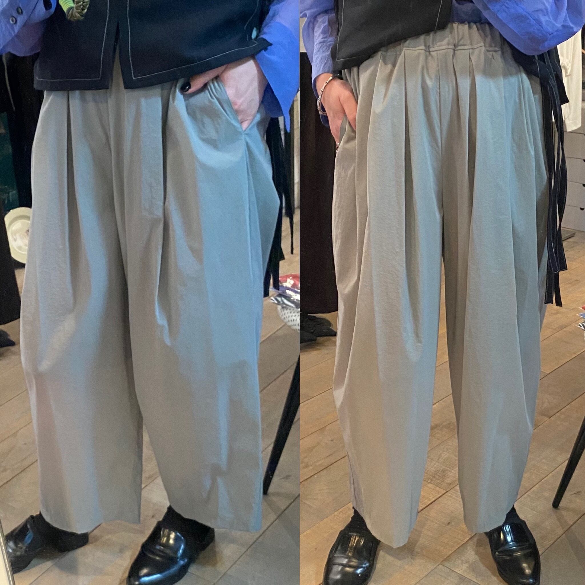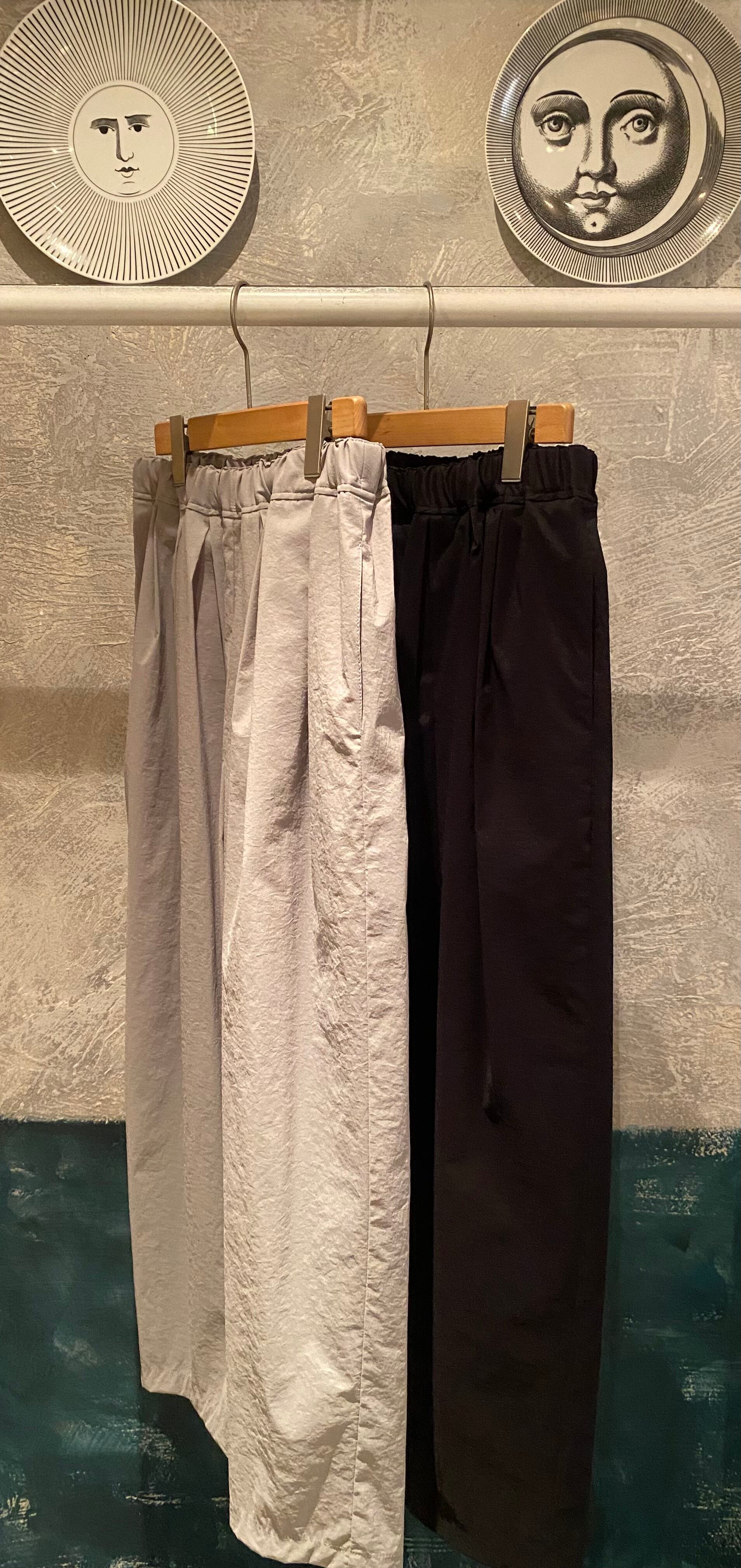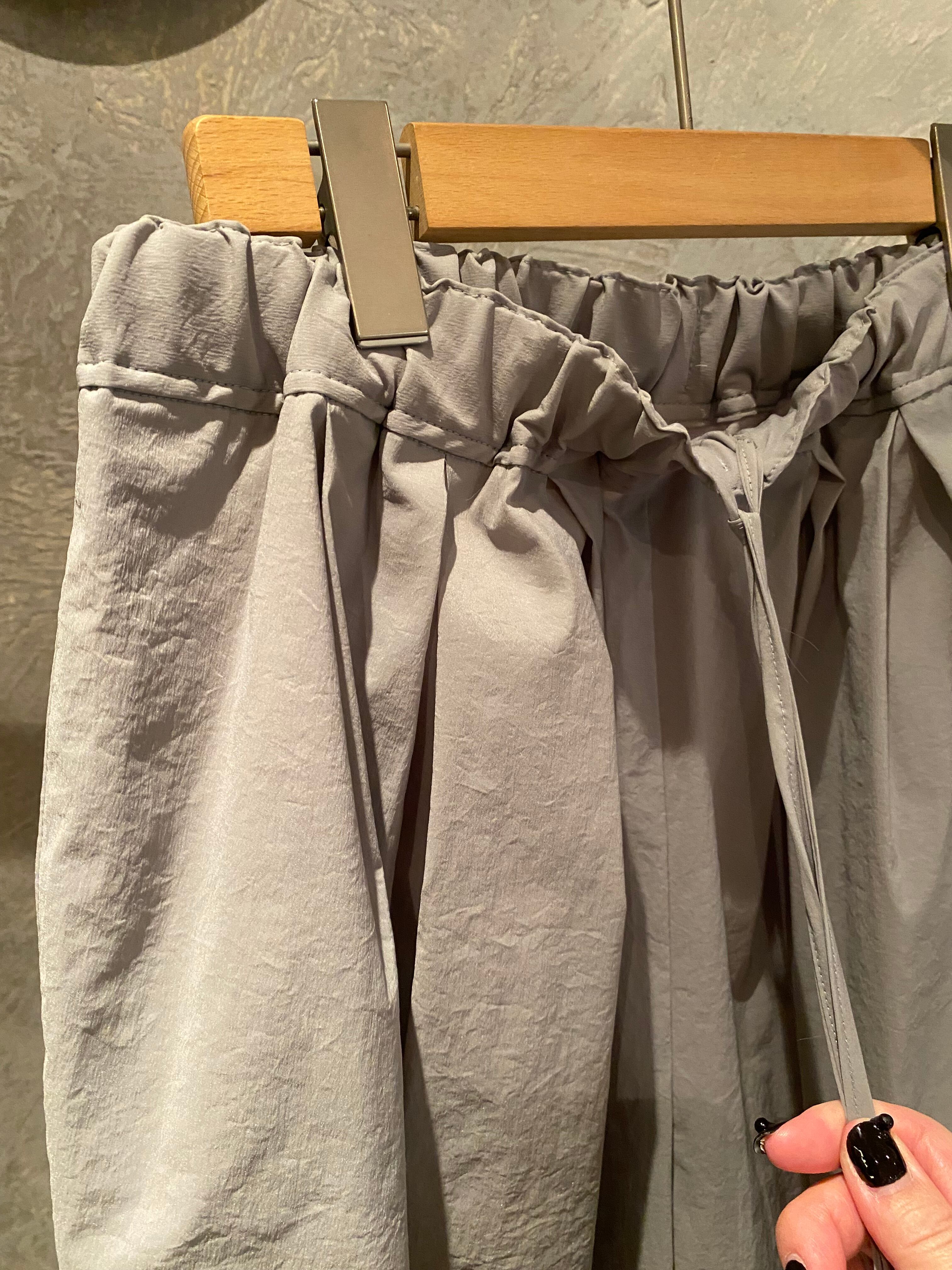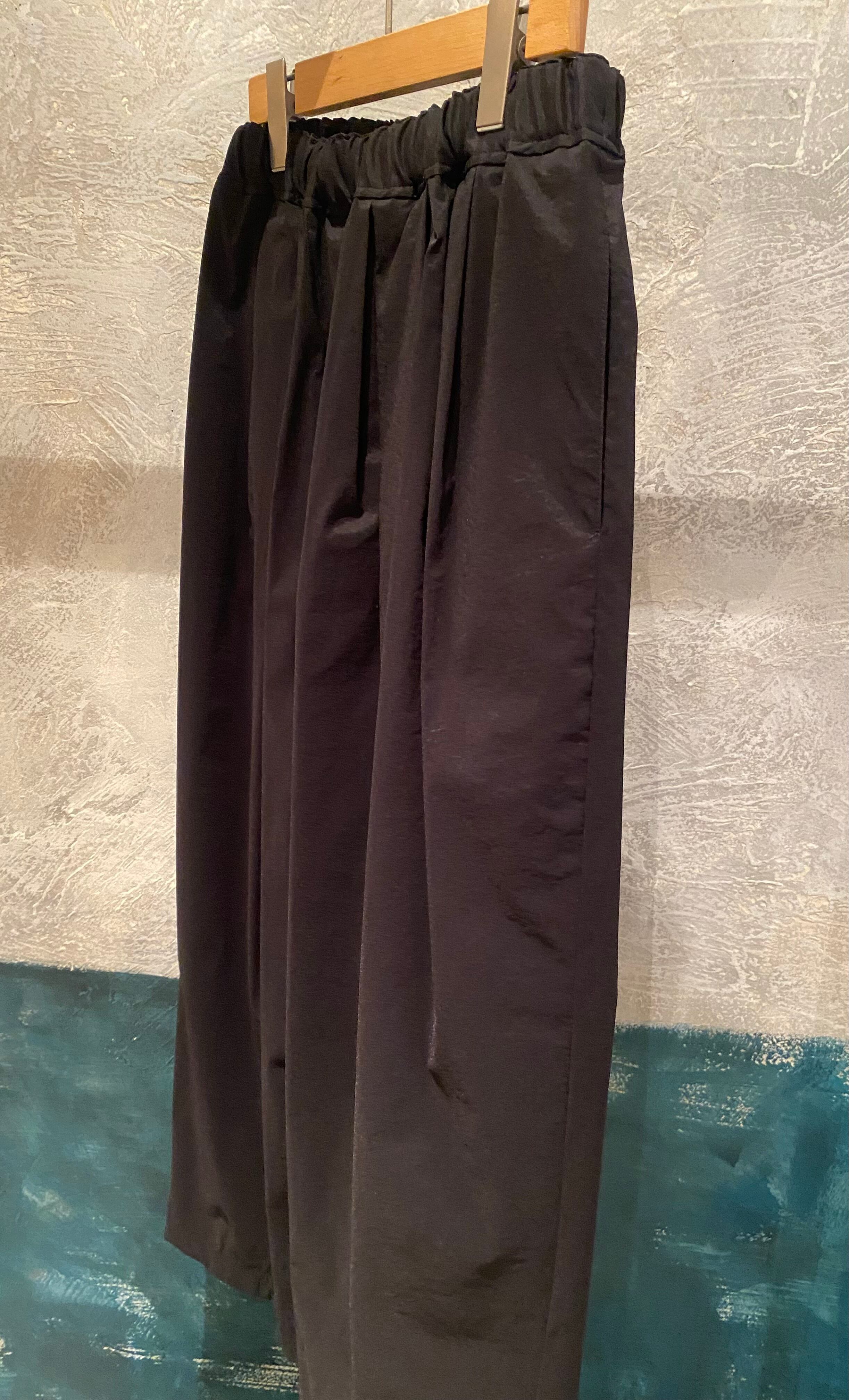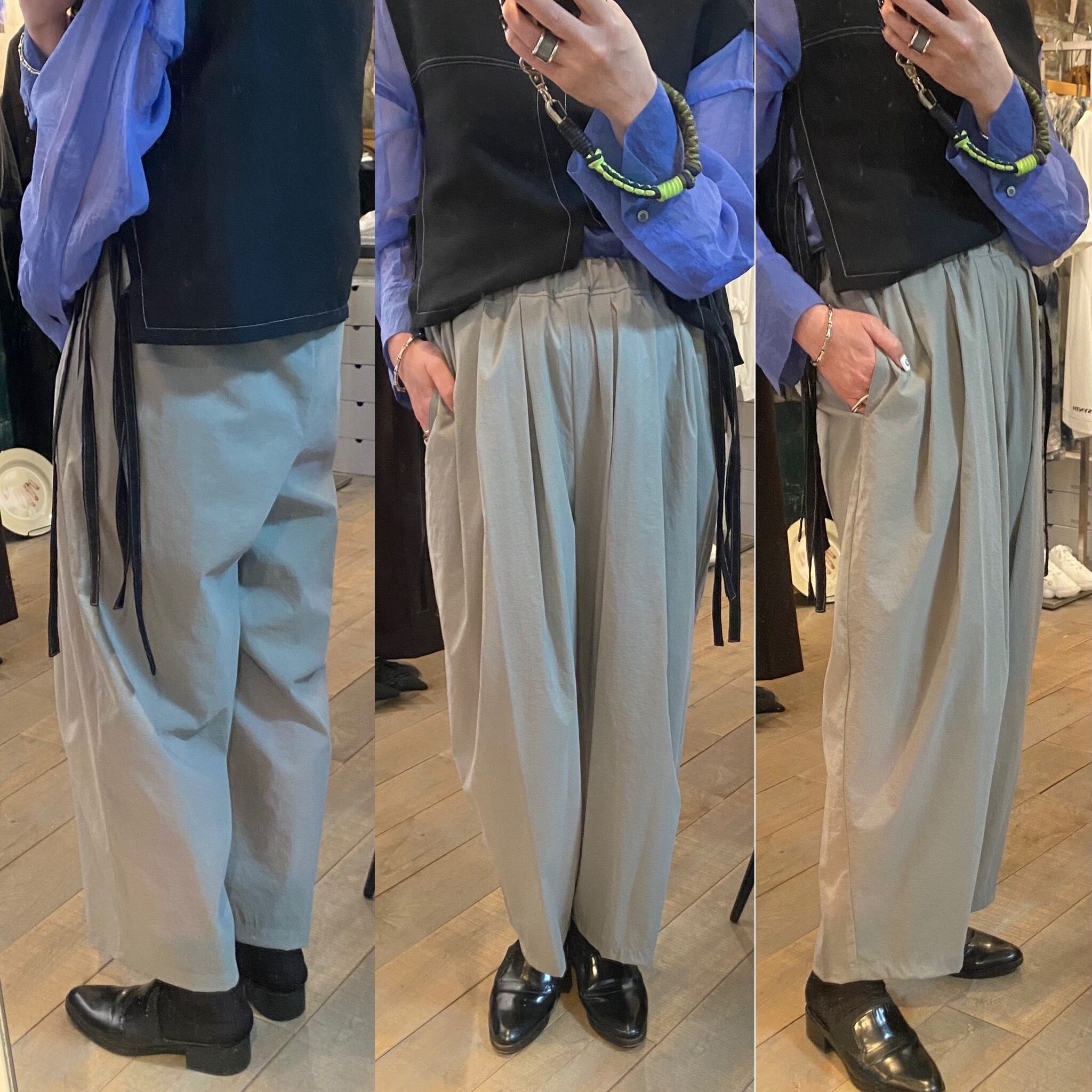 トレンド感のあるペーパーライクナイロン素材のタックギャザーパンツ。ボリュームのあるコクーンシルエットが特徴的で、とても軽く軽快な印象。カジュアルにもモードにも振れるデザインで、着回し力抜群アイテム。幅広い体型に対応できるフリーサイズです。