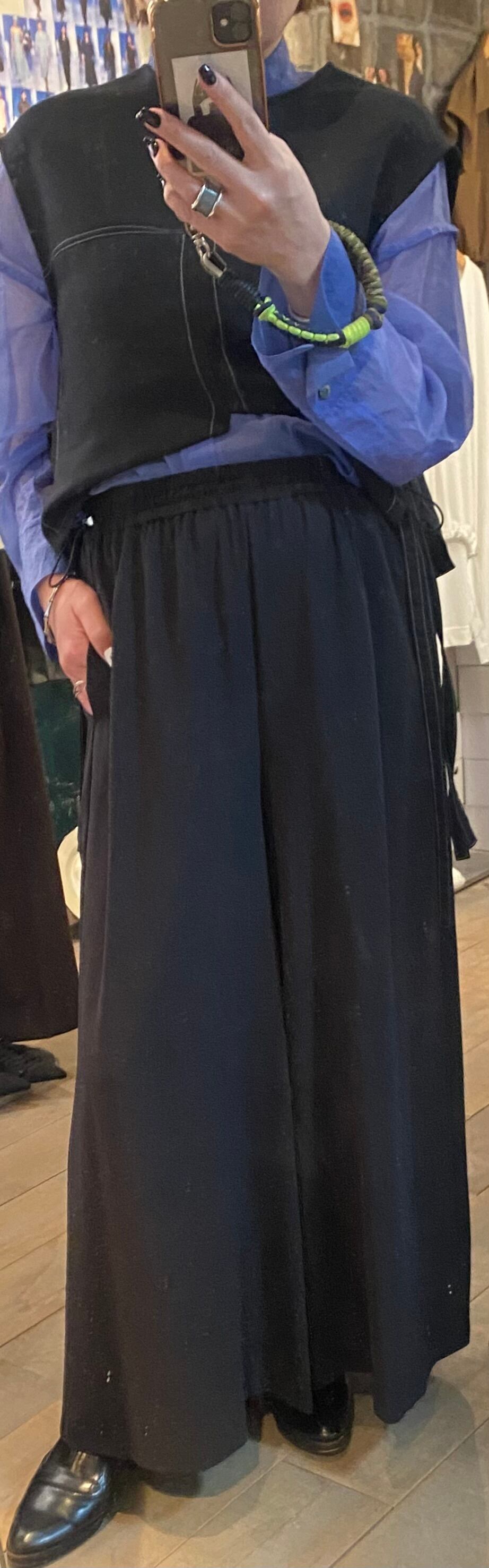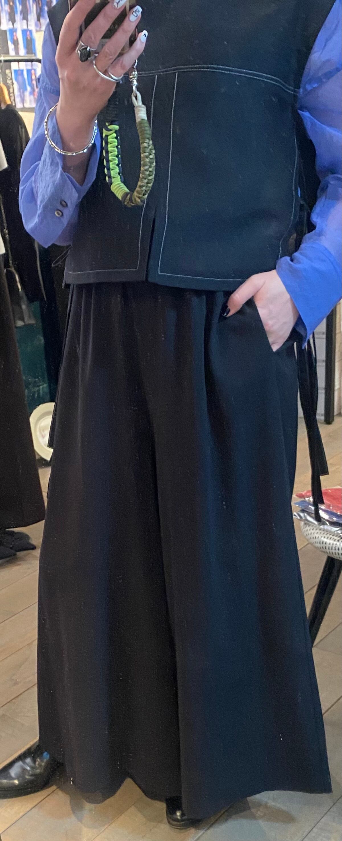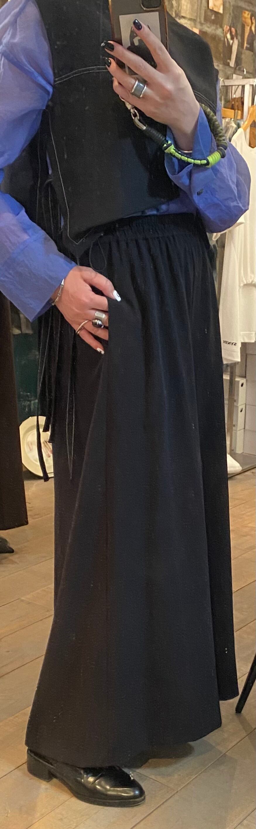 程よいドレープ感のあるジョーゼット素材のフルレングス丈のワイドパンツ。サラッとしたソフトな風合いでオールシーズン着回せます。上品なオチ感と、シボ(凹凸)による独特の陰影が高級感をプラス。カジュアル素材と合わせてもパンツが品良く見せてくれます。