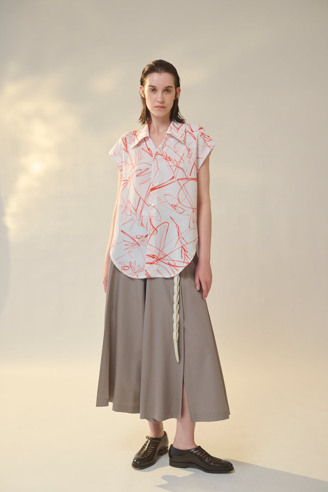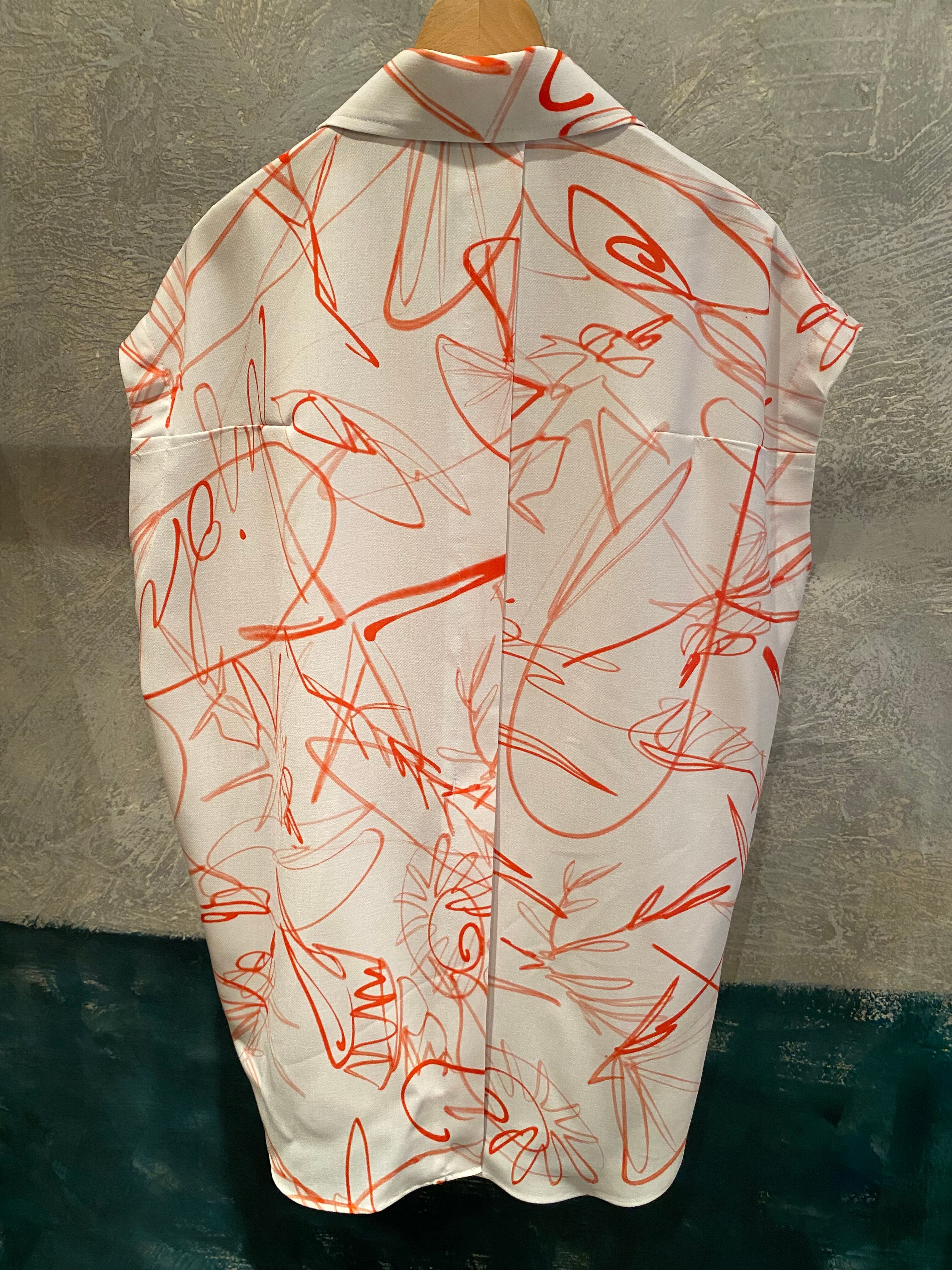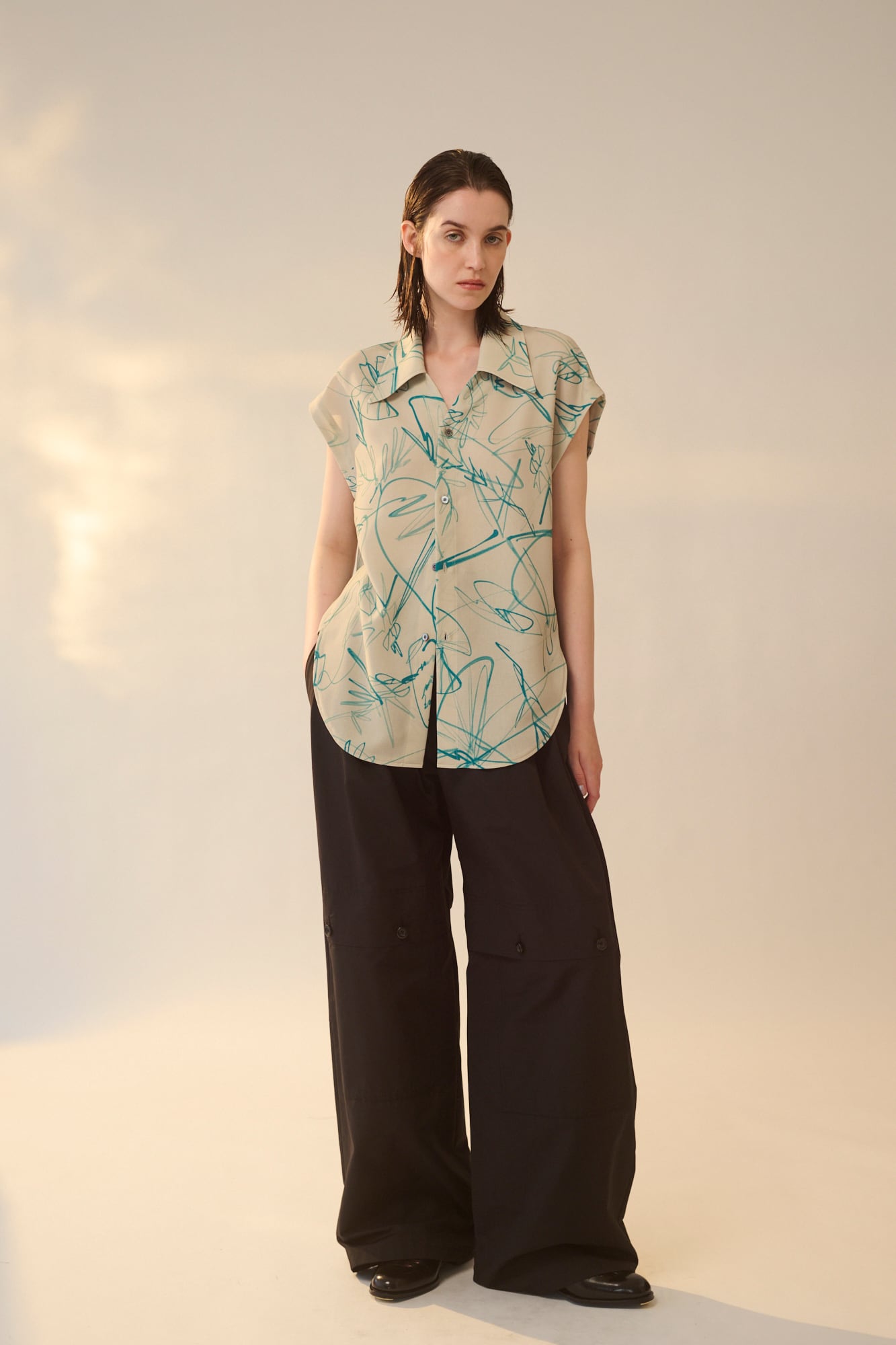 ストレッチツイル生地に、プリントを施した素材です。ビーチコーミングで拾い集めた貝殻と、夏の記憶を重ね合わせたモチーフを、一筆描きのようなラインで表現しました。繊細なドローイングがツイル特有の表情に映え、アート性の高いデザインに仕上がっています。