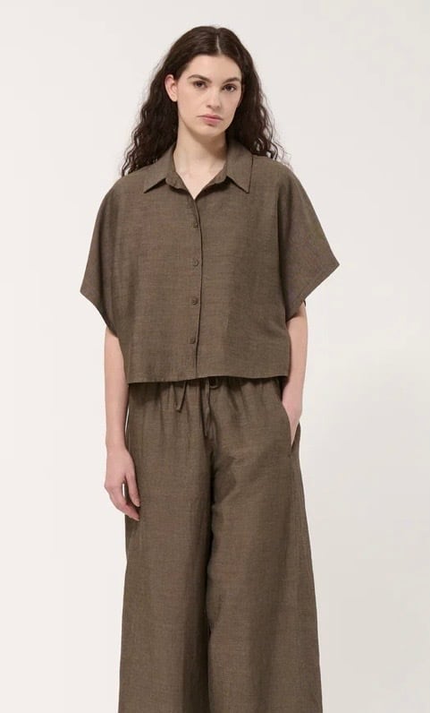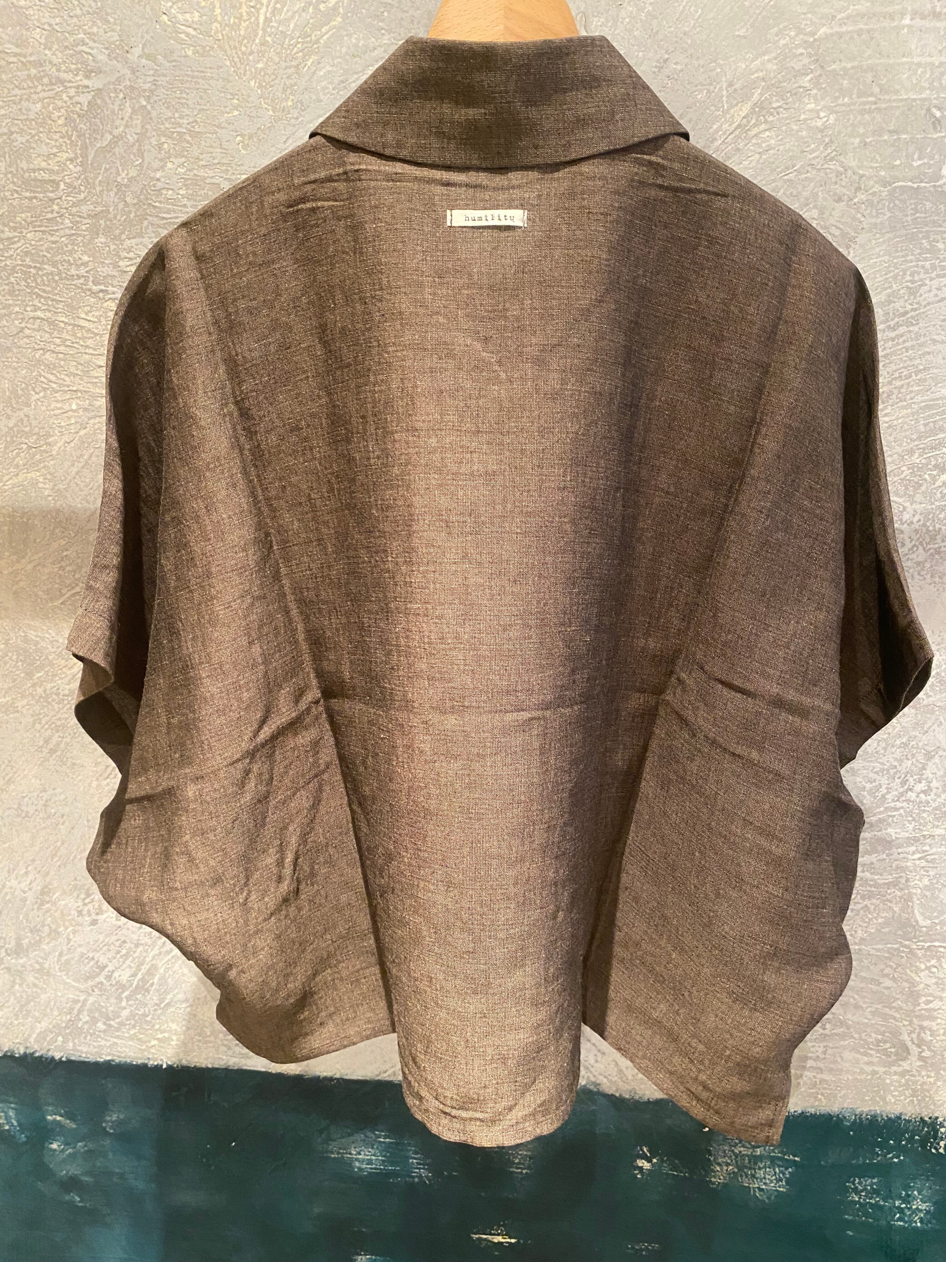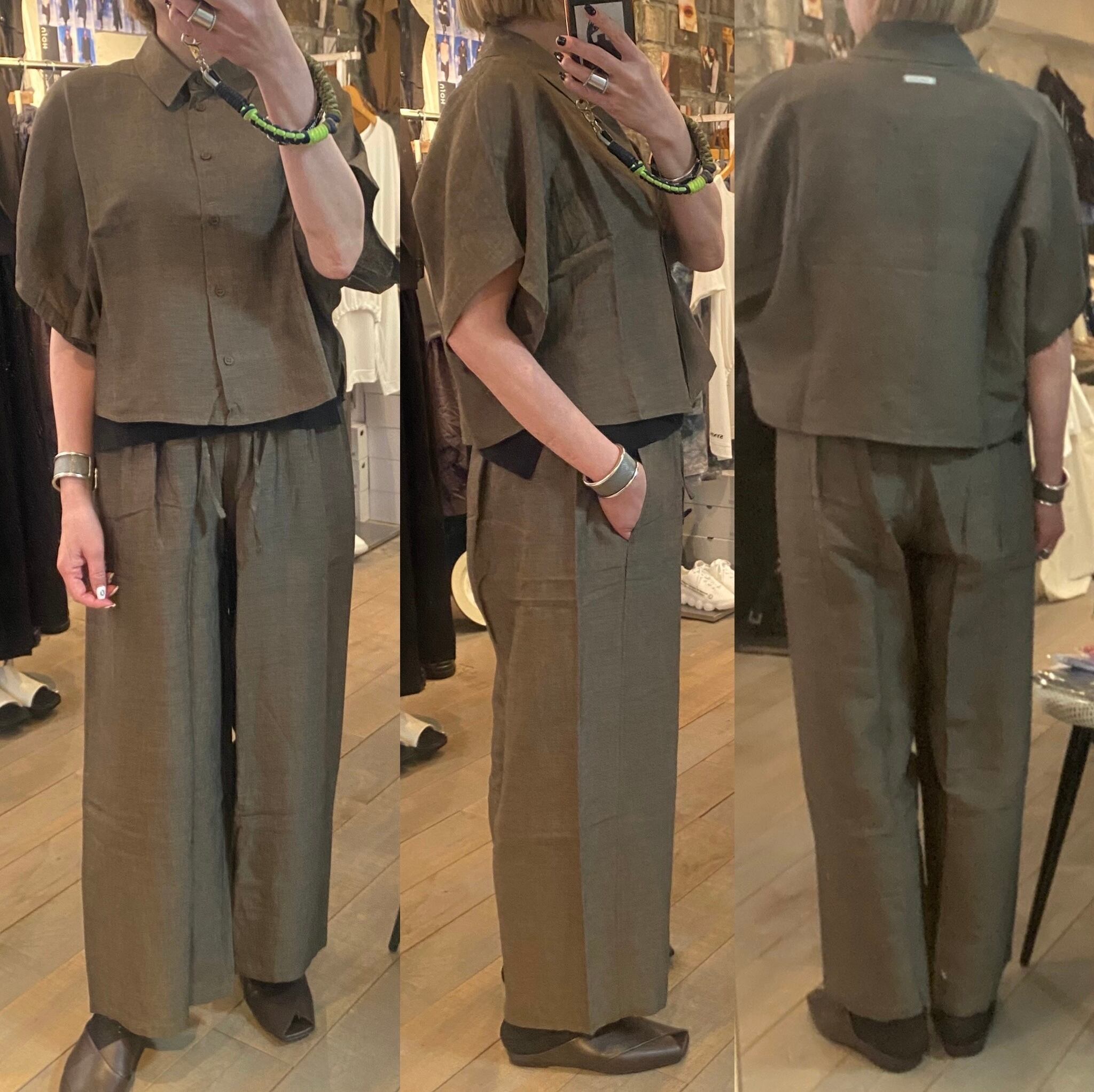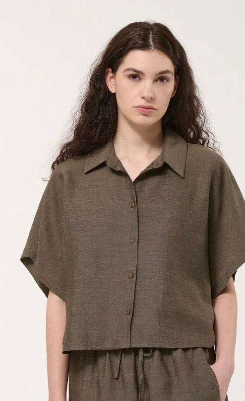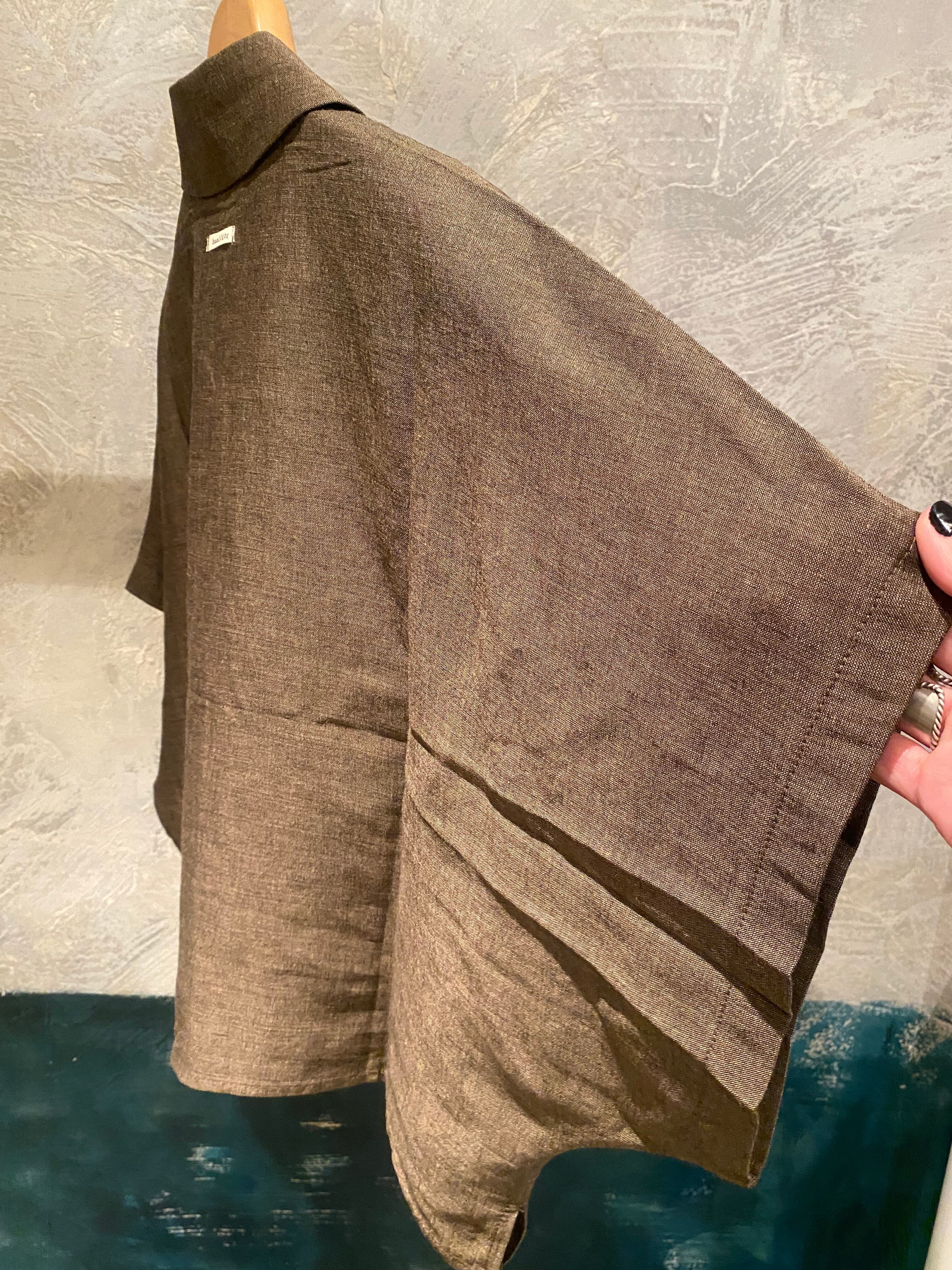 サラッと着て雰囲気の出るオーバーシルエットのブラウス。クロップド丈で合わせるボトムも選ばす、単品でもセットアップでも素敵です♪薄手でサラッとした素材感で真夏のヘビロテアイテムです。