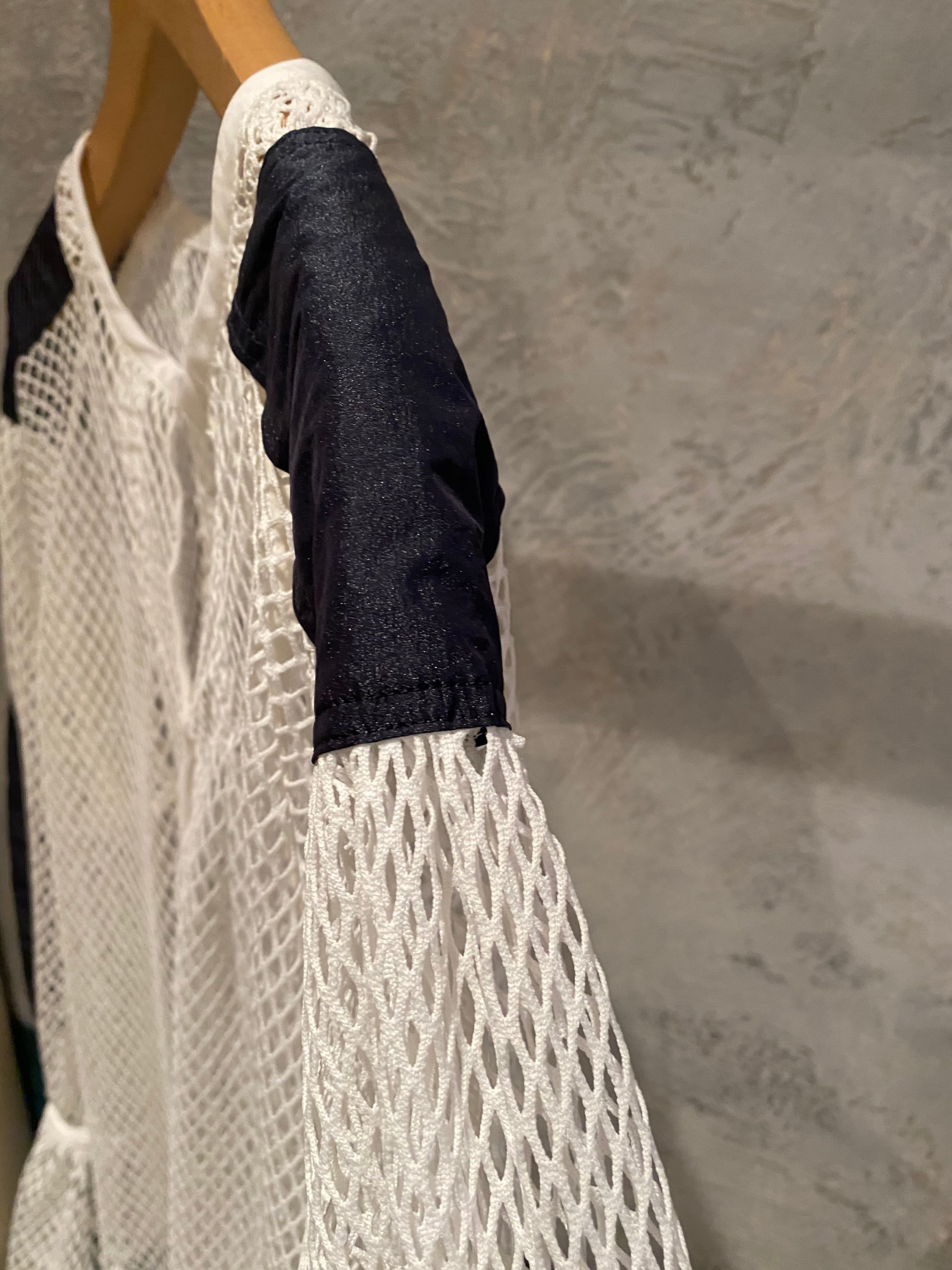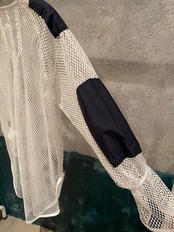 RUMBLEREDのファーストシーズンから続くコマンドセーター(イギリス軍が開発した1940年台から続くミリタリーセーター)のディティールを取り入れ、女性らしいデザインに昇華させたアイテム。適度に光沢のある質感のあるメッシュ素材を使用し、袖をバルーンスリーブにし、袖口のフリルがポイント。長めの丈感でフェミニンな雰囲気になっています。コマンドセーターのディティールである肩と肘のパッチがアクセントに☆RUMBLERED得意の女性らしくもミニタリー感のあるアイテムになります♪
