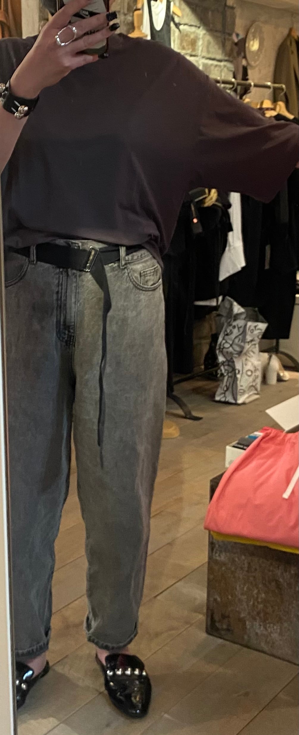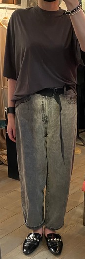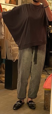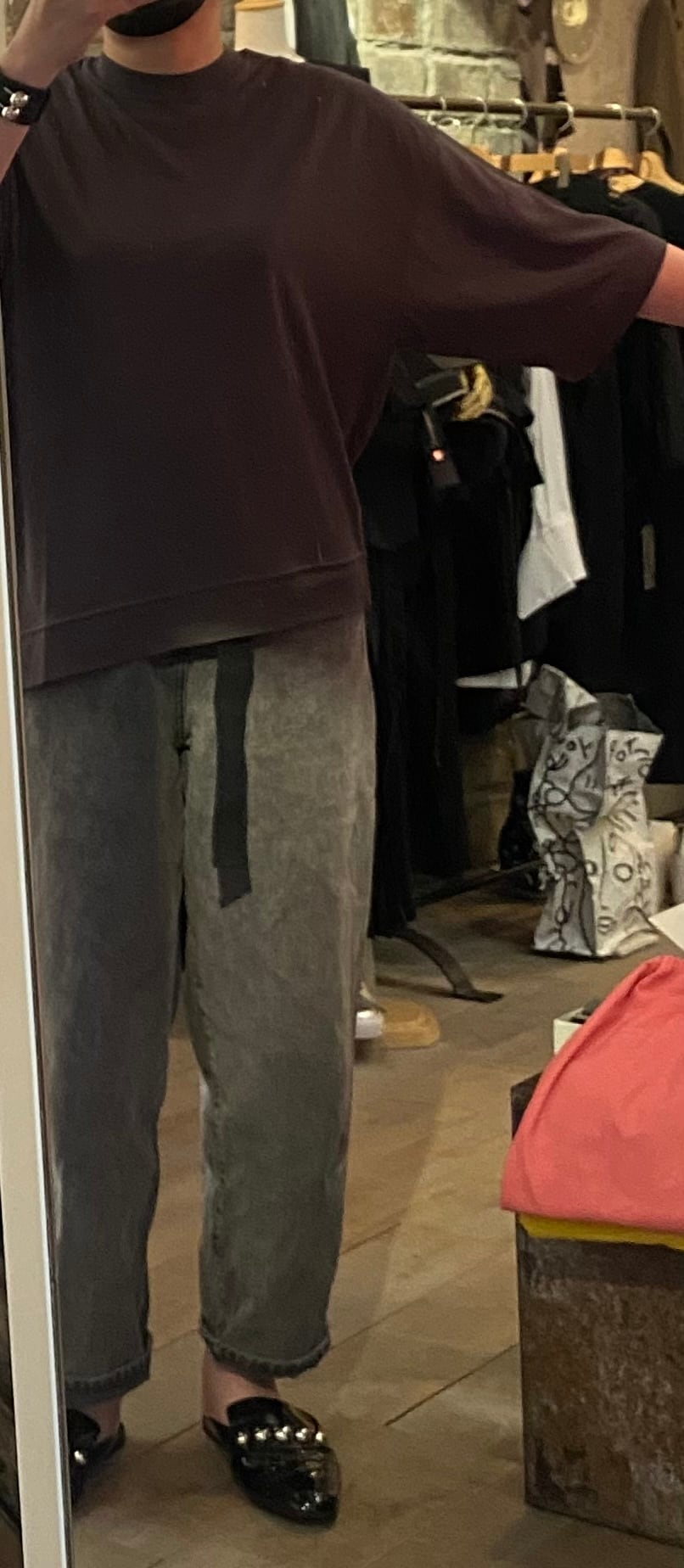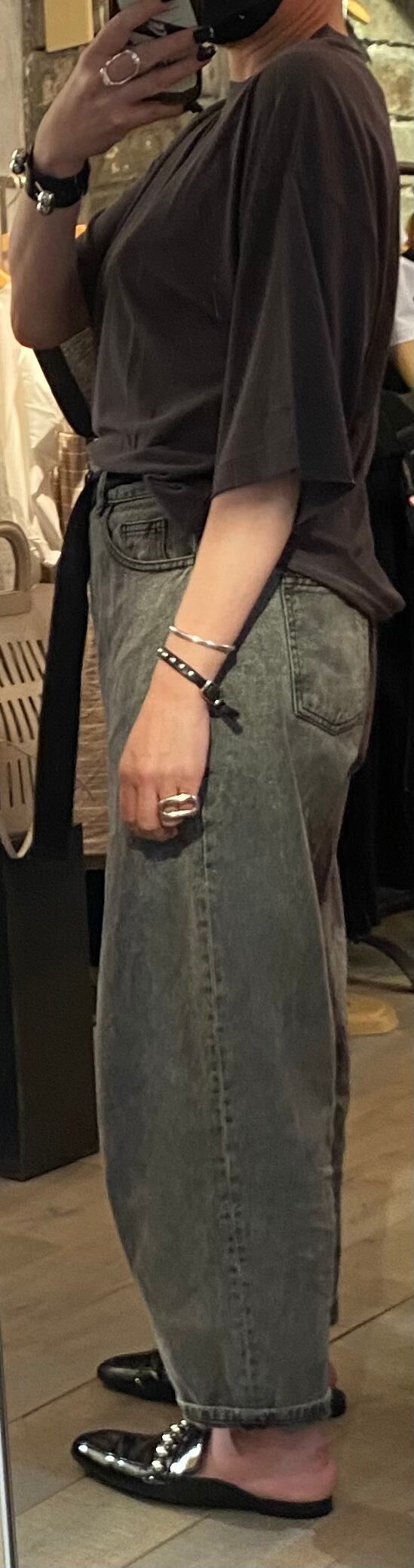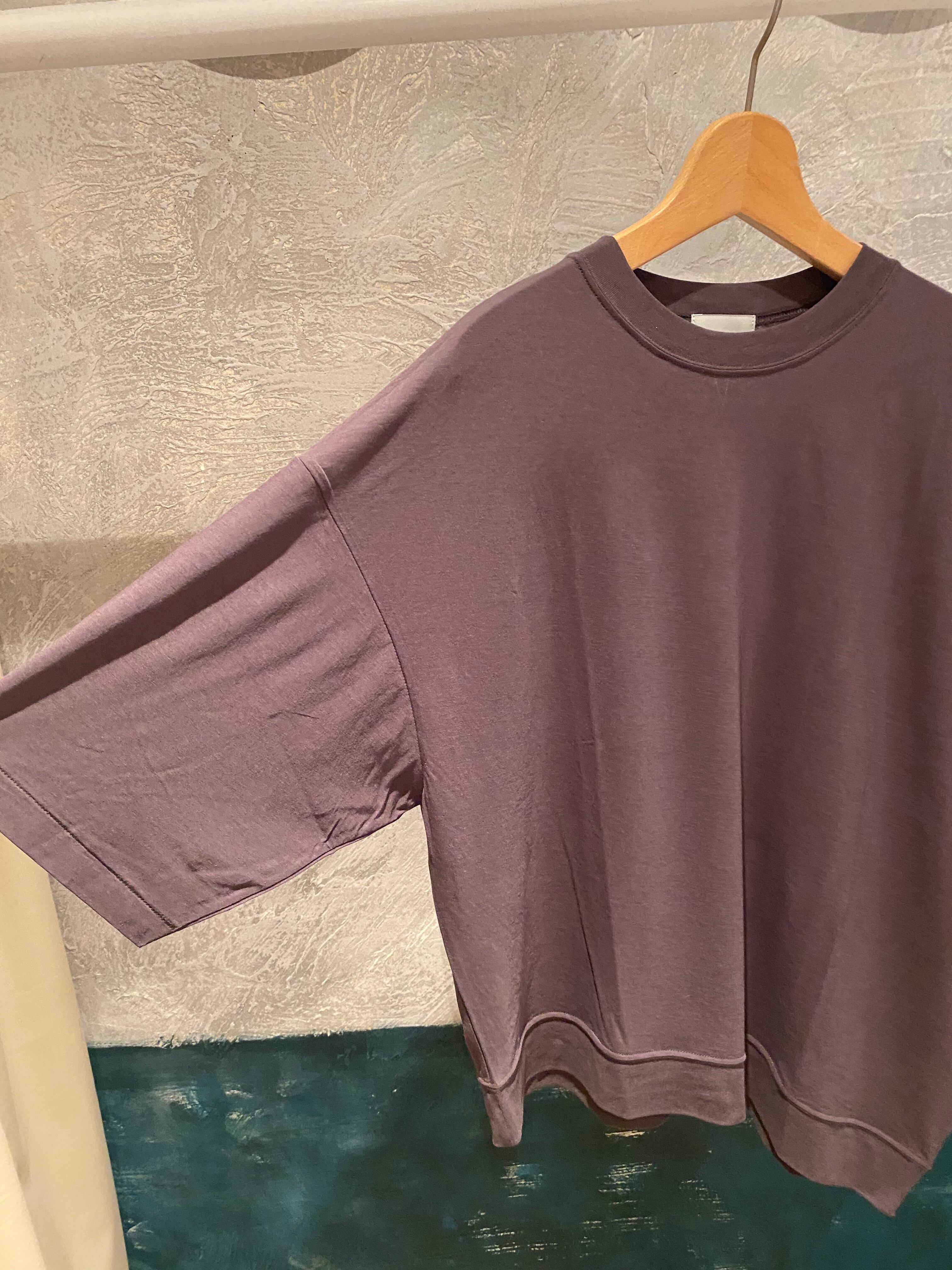 右見頃はドロップショルダーで大きめのサイズ感のルーズTシャツ。左見頃はケープのようなタップリとした身巾にドルマンスリーブのようなシルエット。裾は斜めにカッティングされたヘムライン。素材は追撚した糸をハイゲージで編む事でしっとりとした風合いと程よいシャリ感、柔らかな肌触りという絶妙なバランスに仕上がってます❗️