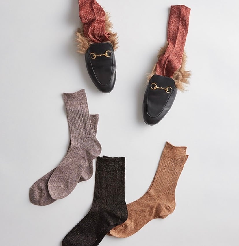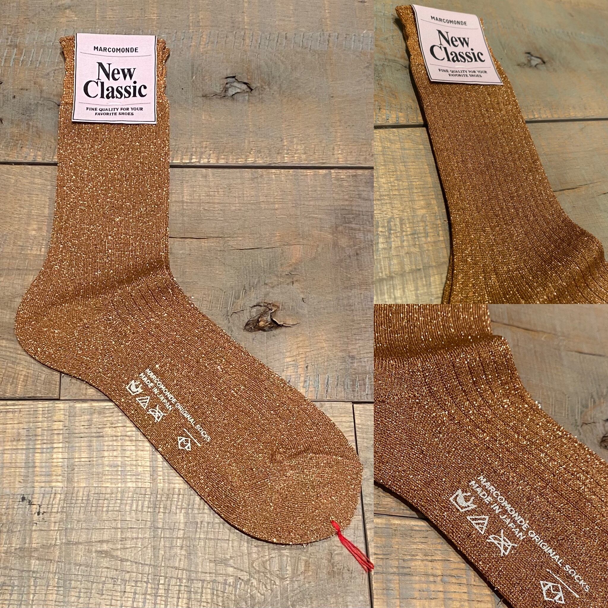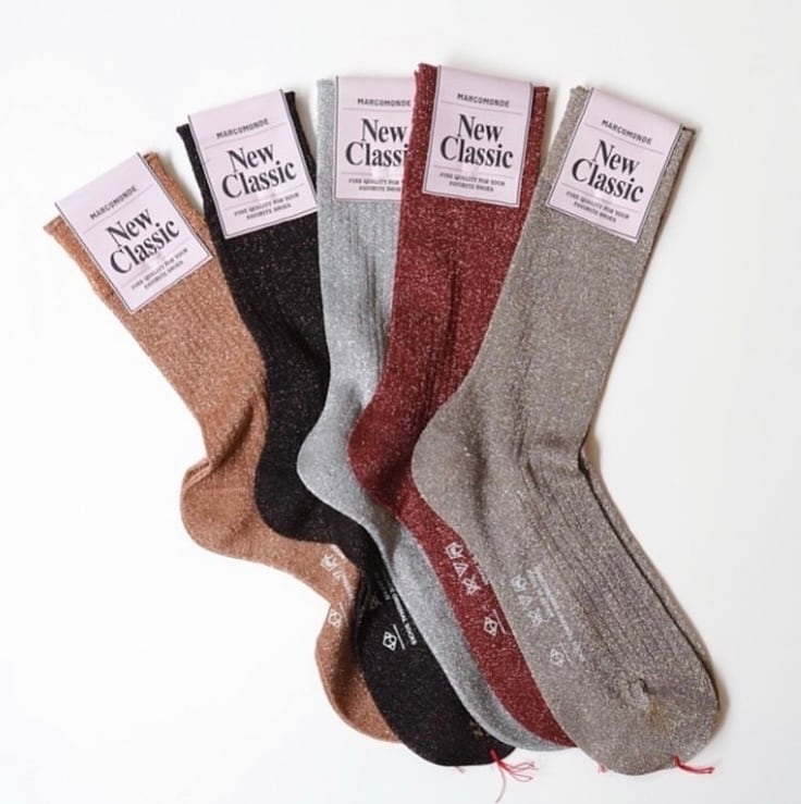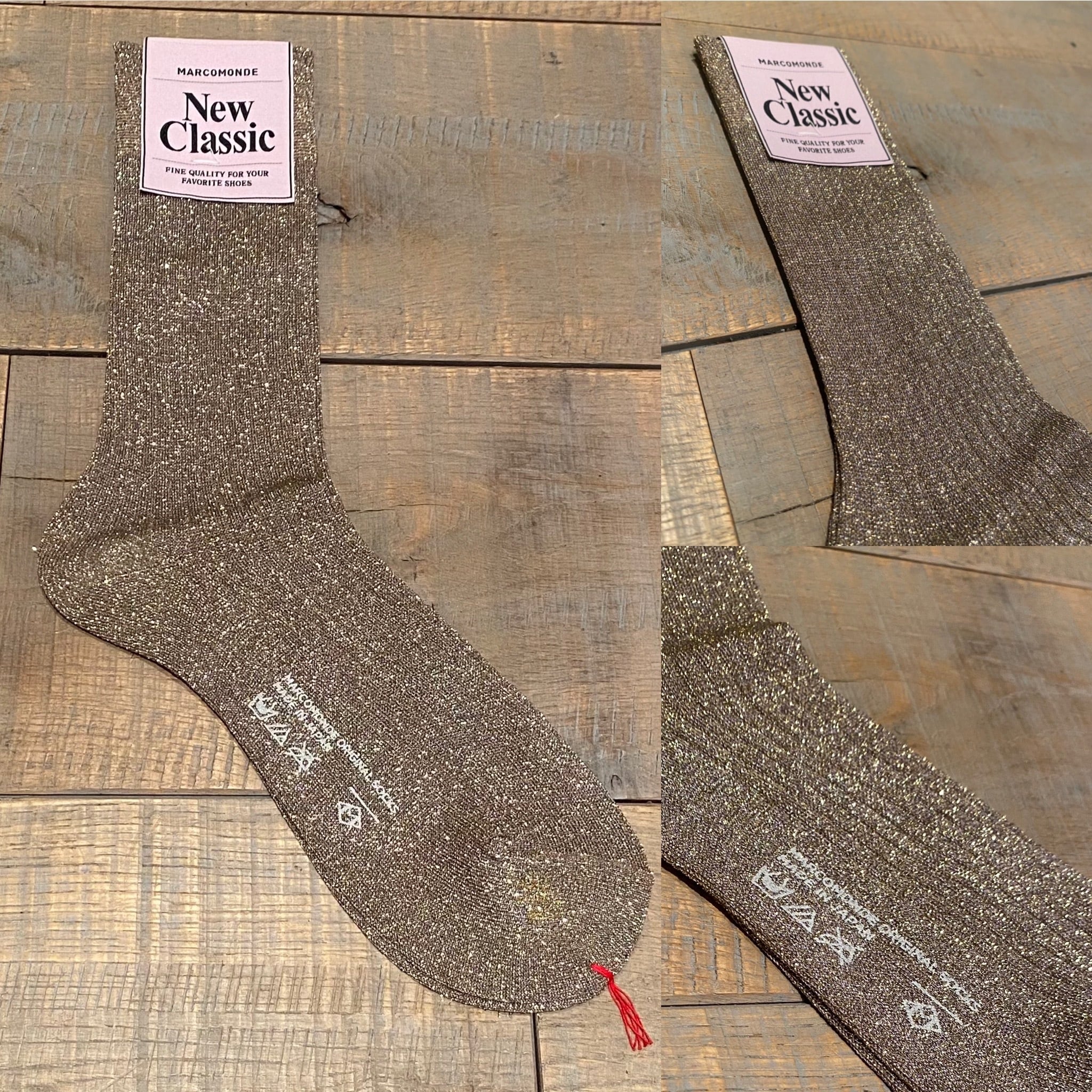 マニッシュな靴に良く合う女性的なラメ素材のハイゲージソックス。少し太めの5×1リブが甘さを抑えて大人っぽい雰囲気にコーディネートして頂けます♪