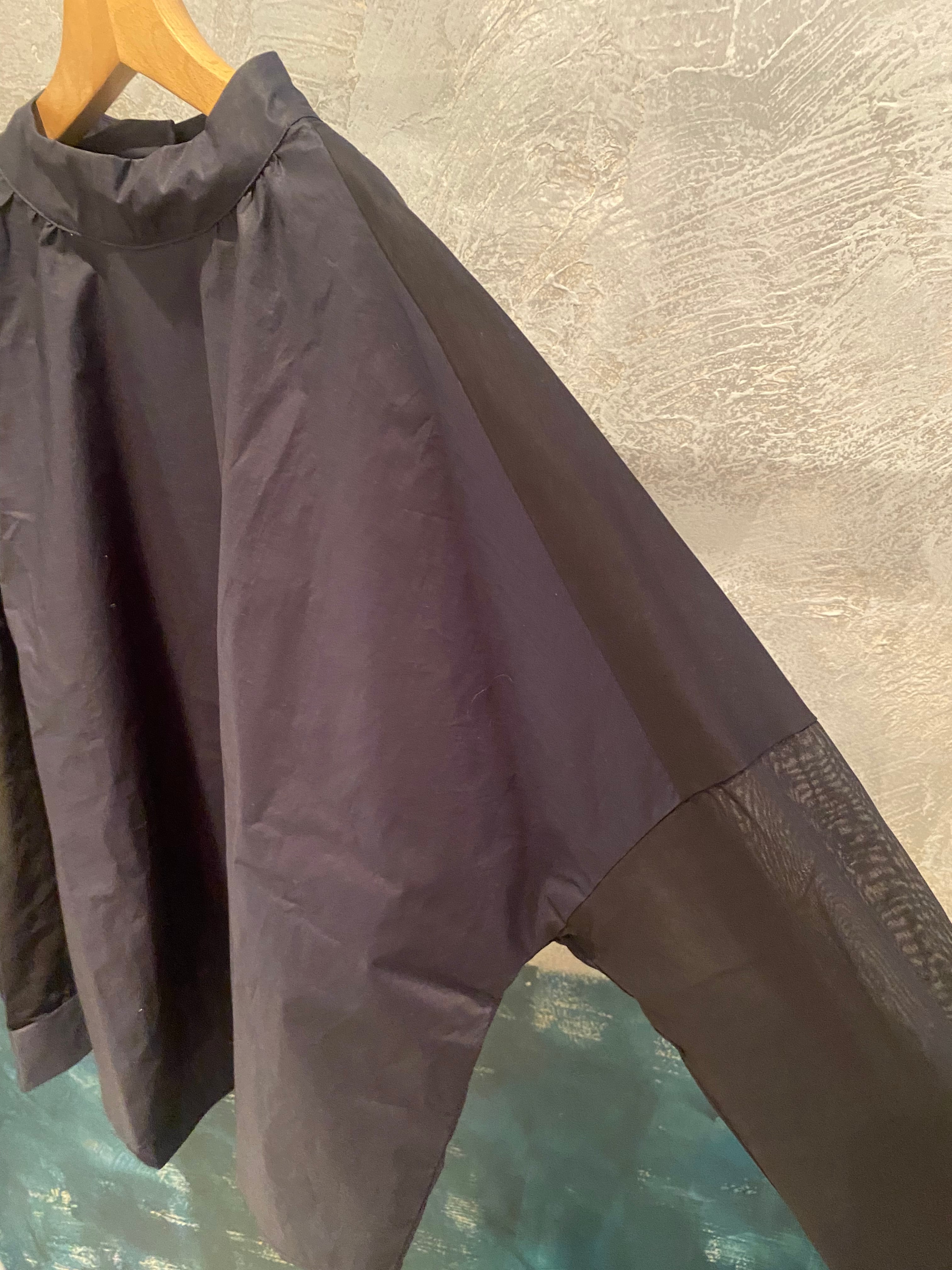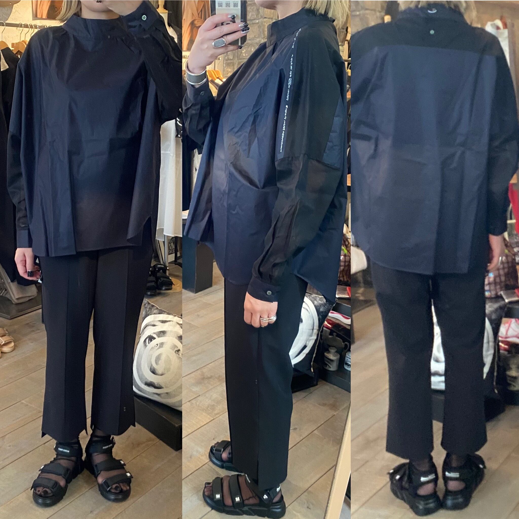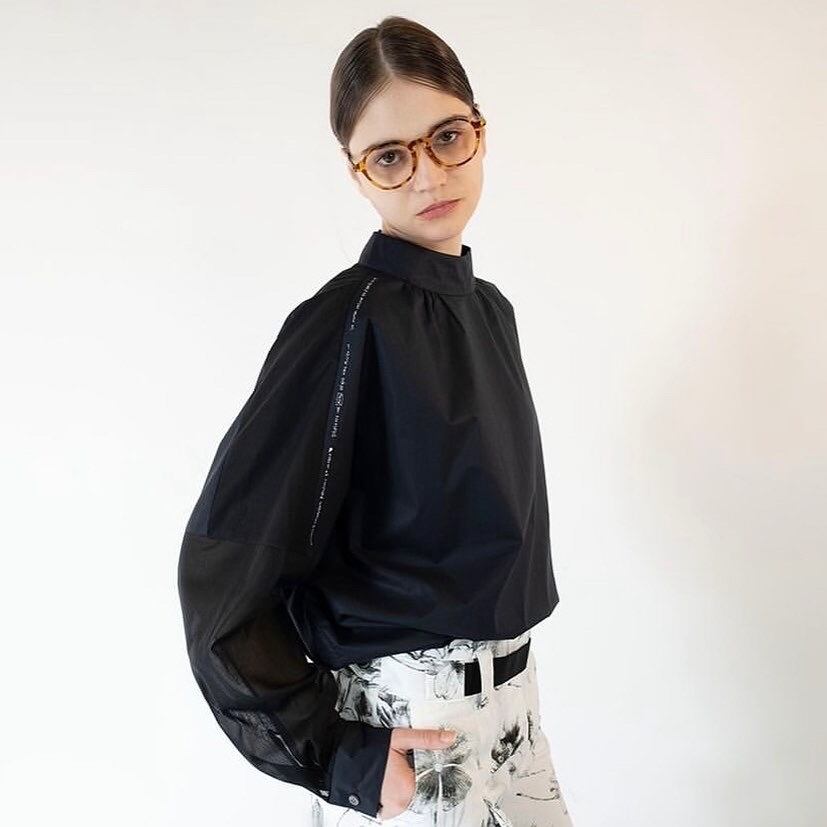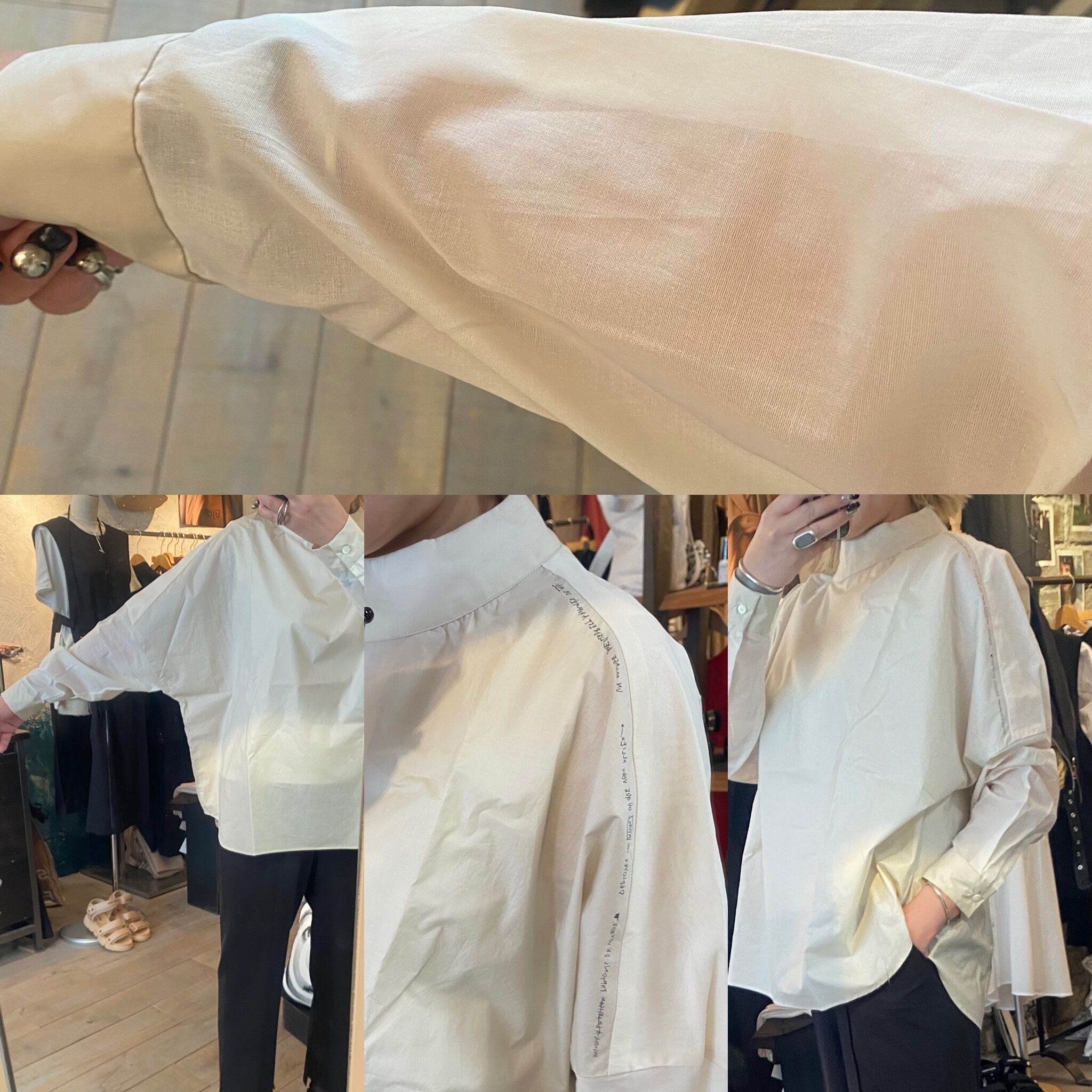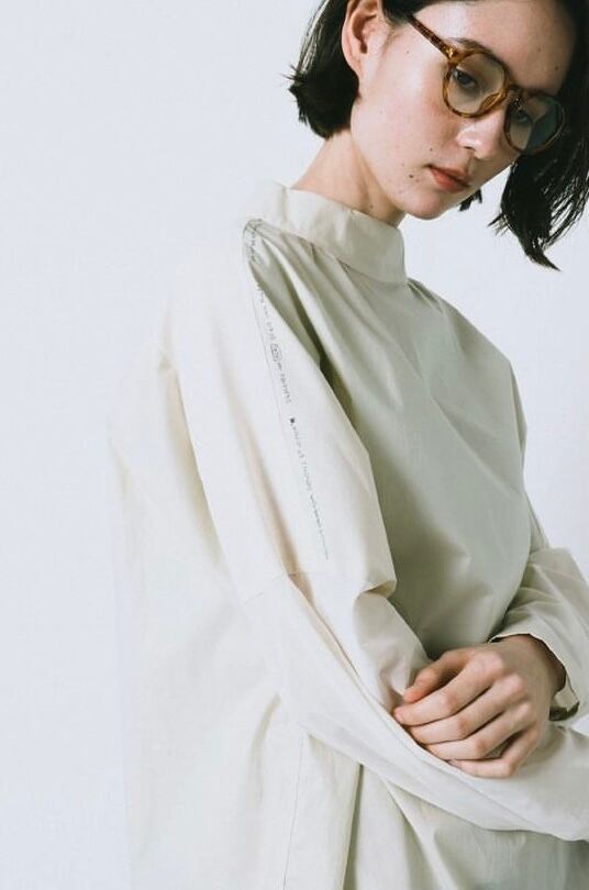 高密度に織り上げたタイプライターにオイルコーティングを施した素材と、100/2ガスボイルを組み合わせたハイネックブラウス。タックインした時の見頃のボリューム感と、袖の落ち感のバランスが絶妙。ショルダーラインにプリントされたメッセージロゴが程よい抜け感を演出します☆