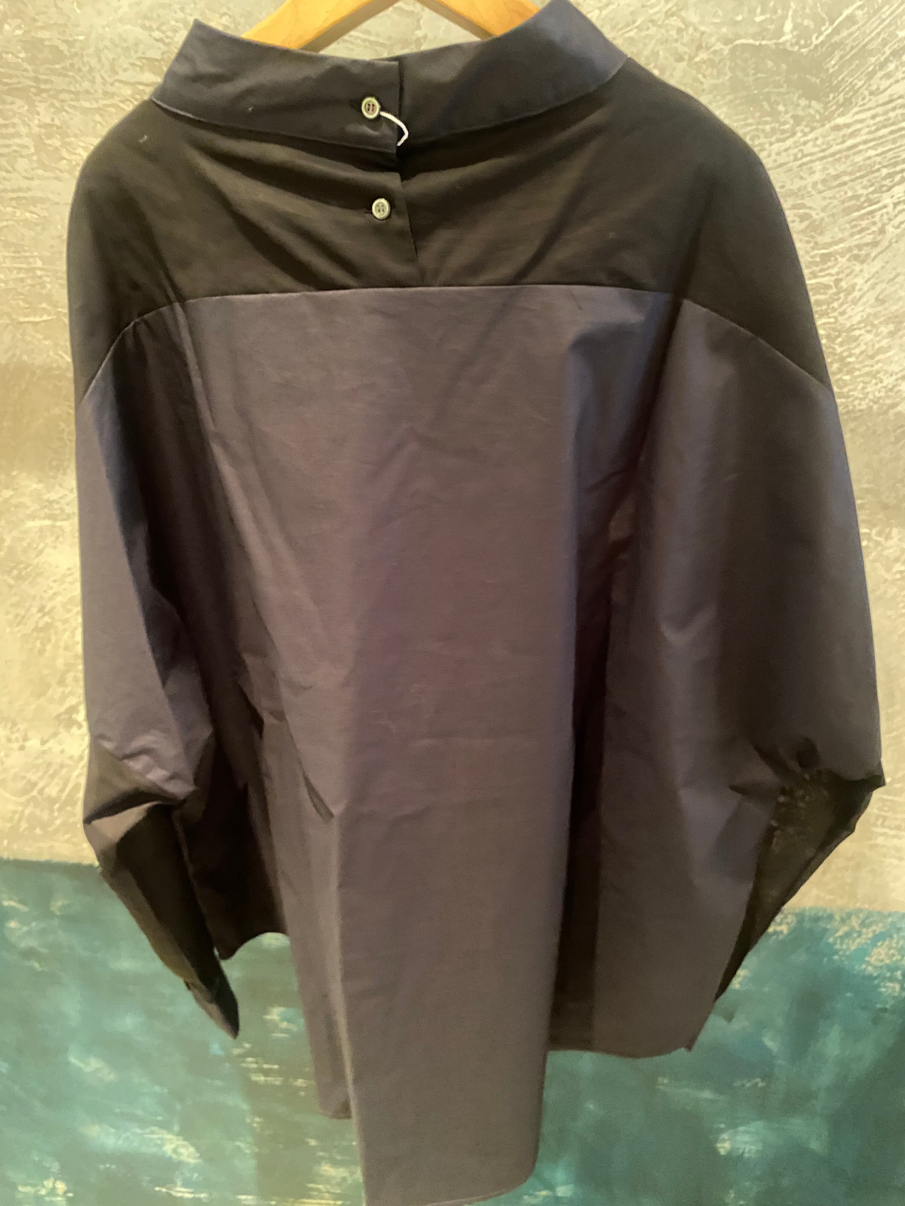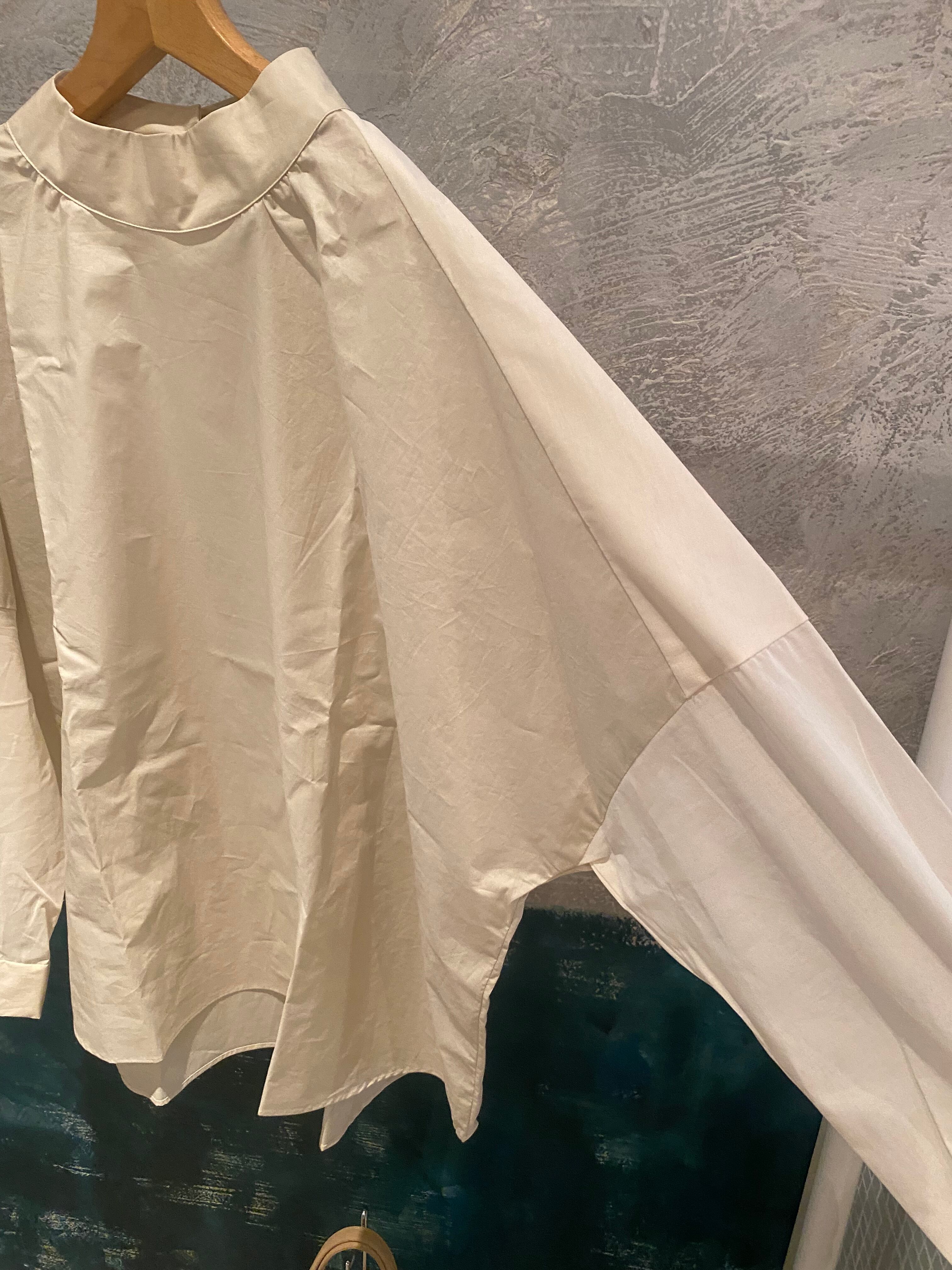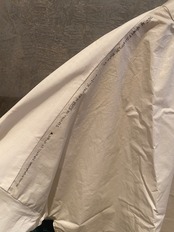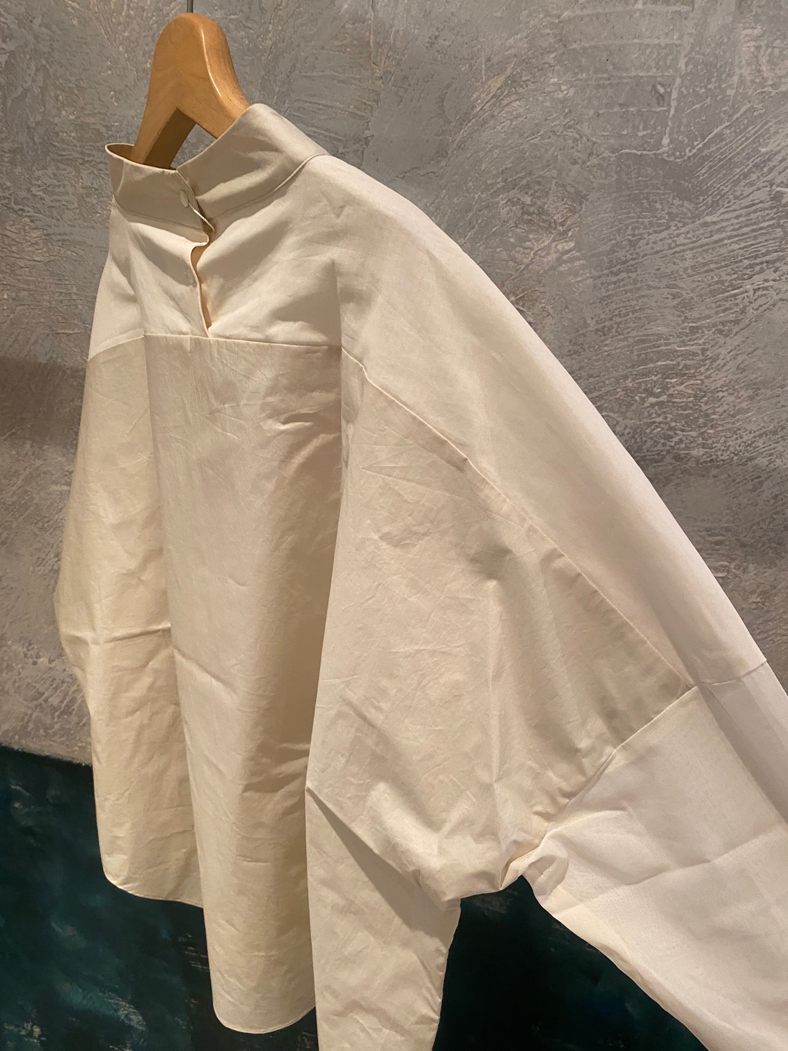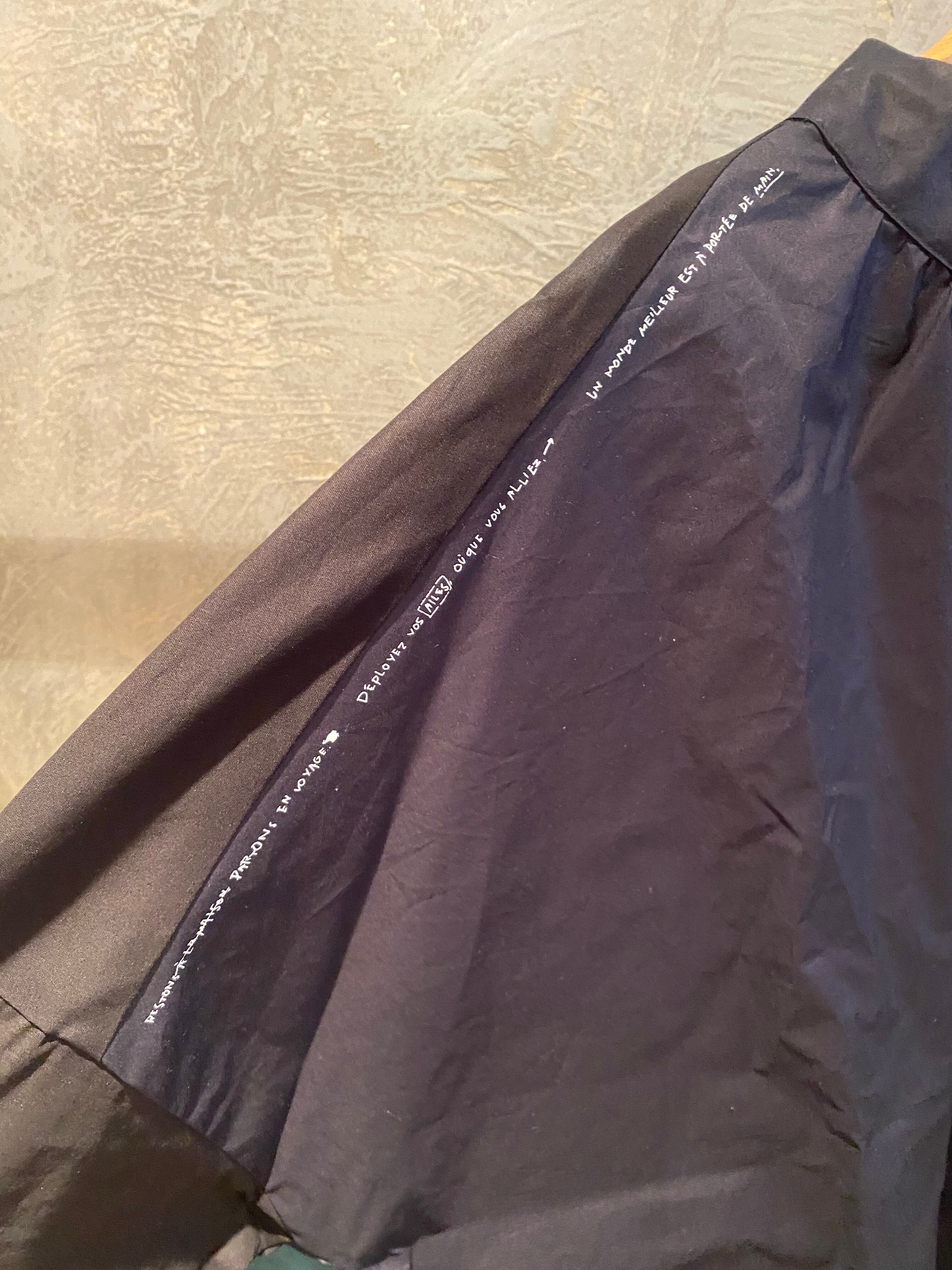 高密度に織り上げたタイプライターにオイルコーティングを施した素材と、100/2ガスボイルを組み合わせたハイネックブラウス。タックインした時の見頃のボリューム感と、袖の落ち感のバランスが絶妙。ショルダーラインにプリントされたメッセージロゴが程よい抜け感を演出します☆