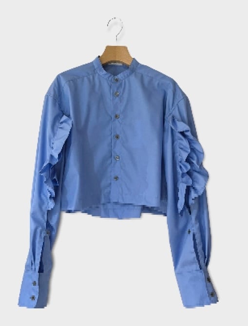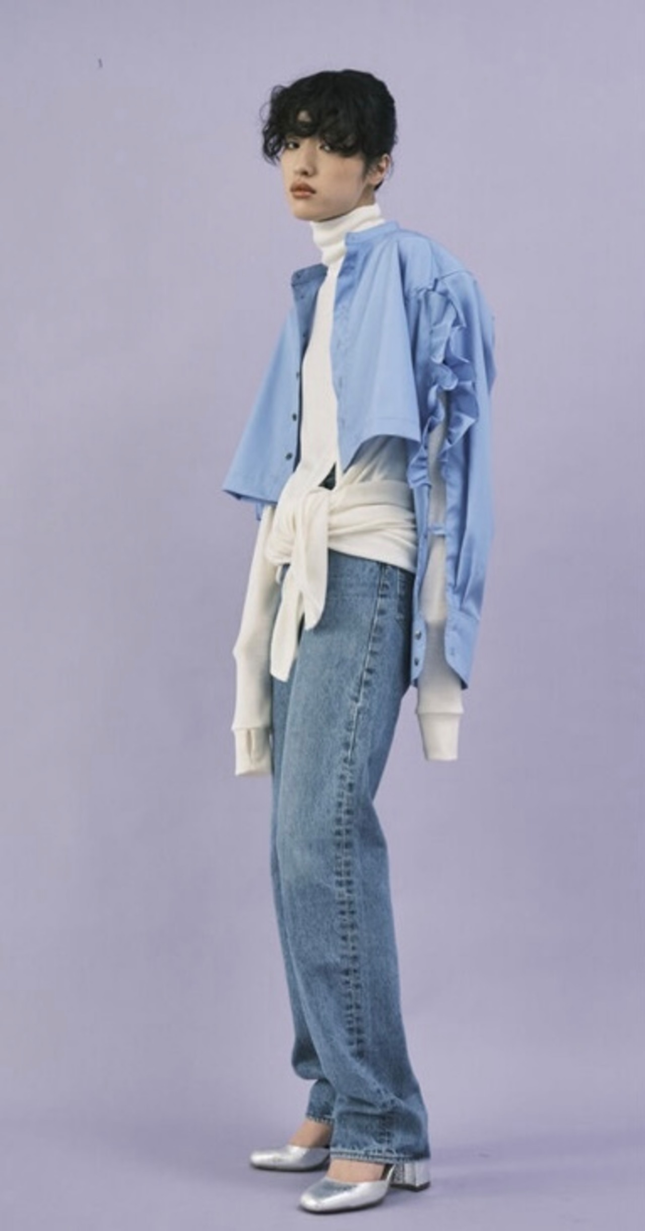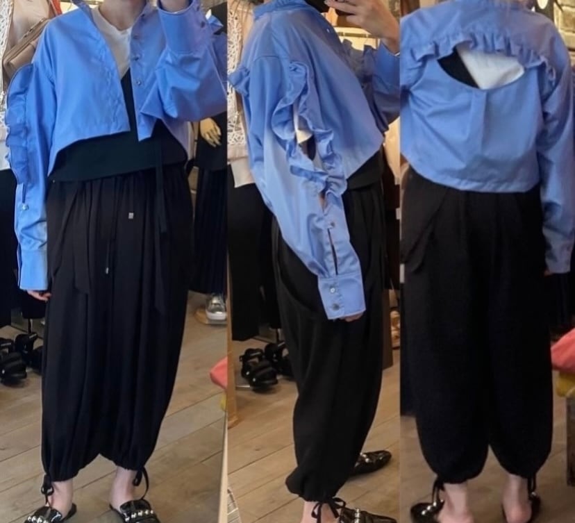 背中のフリルの下はカットされていて中に着ているものが見えるつくりとなっています。お袖も大きなスリットからフリルが出ていてとても遊び心のあるデザイン。