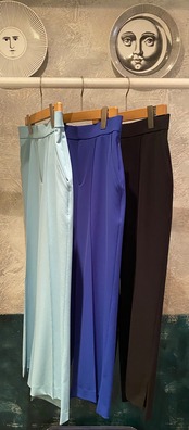 ストレートシルエットのアシンメトリーパンツは、人気のシルエット。今シーズンは、Whiteとroyal blueの新色が出ました!!前後差のある裾のデザインがポイントで、ヒールでもスニーカーでも裾がもたつきません。センターフロントのピンタックは、足を長く綺麗に見せてくれるのも嬉しいところ。履き心地抜群で、シーズンレスで着用可能のイージーパンツ。