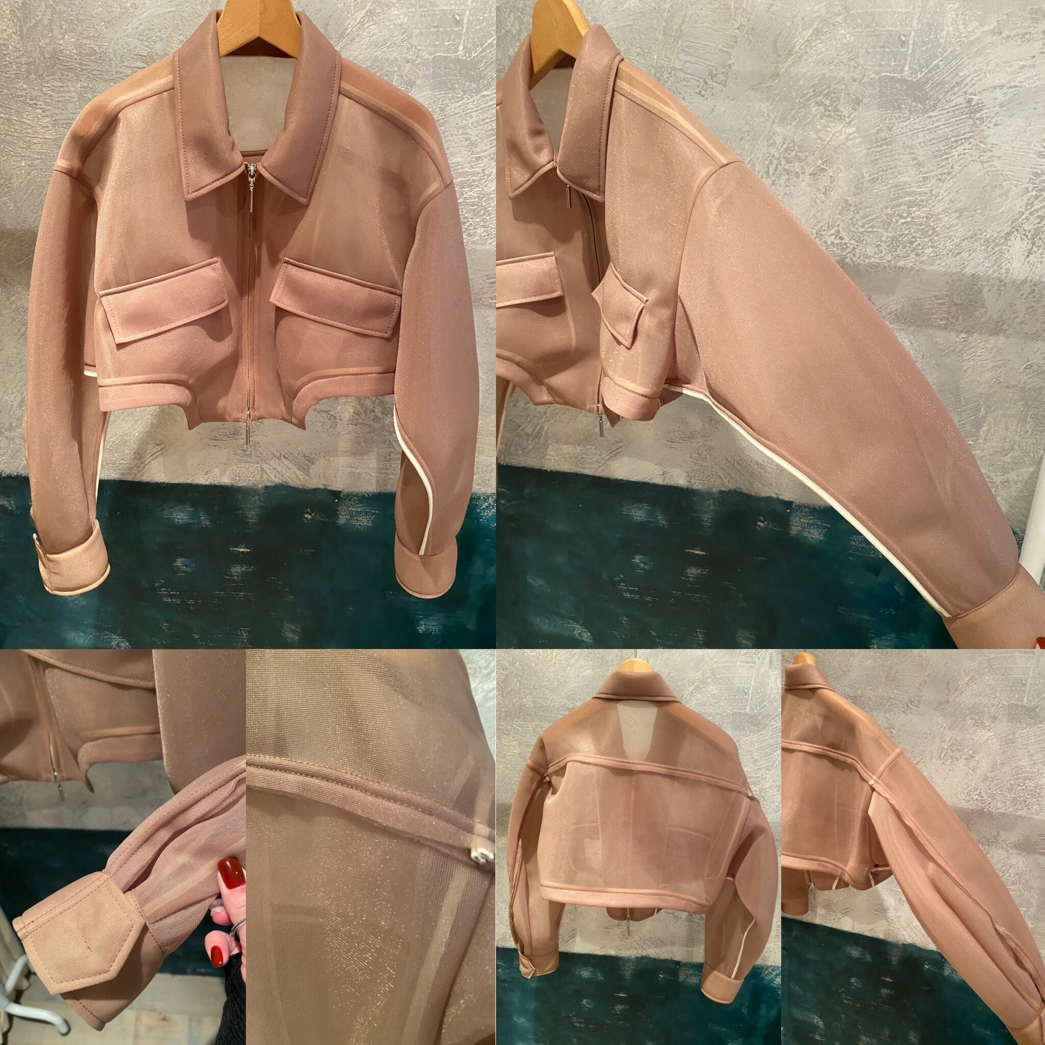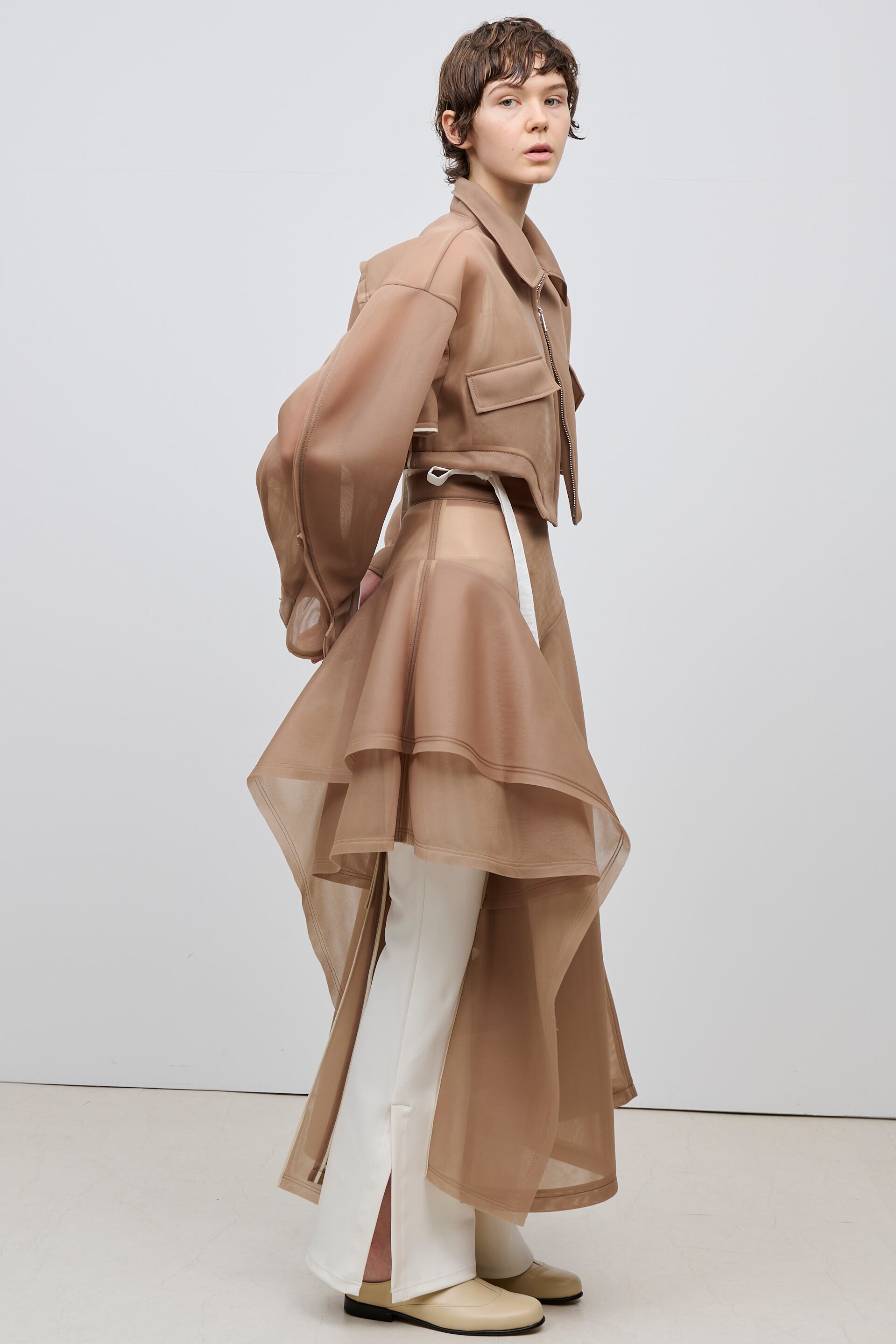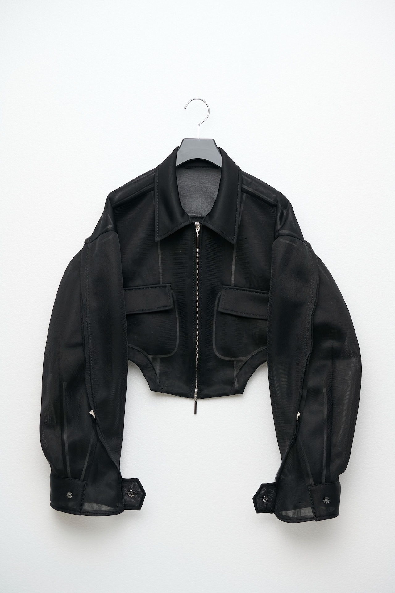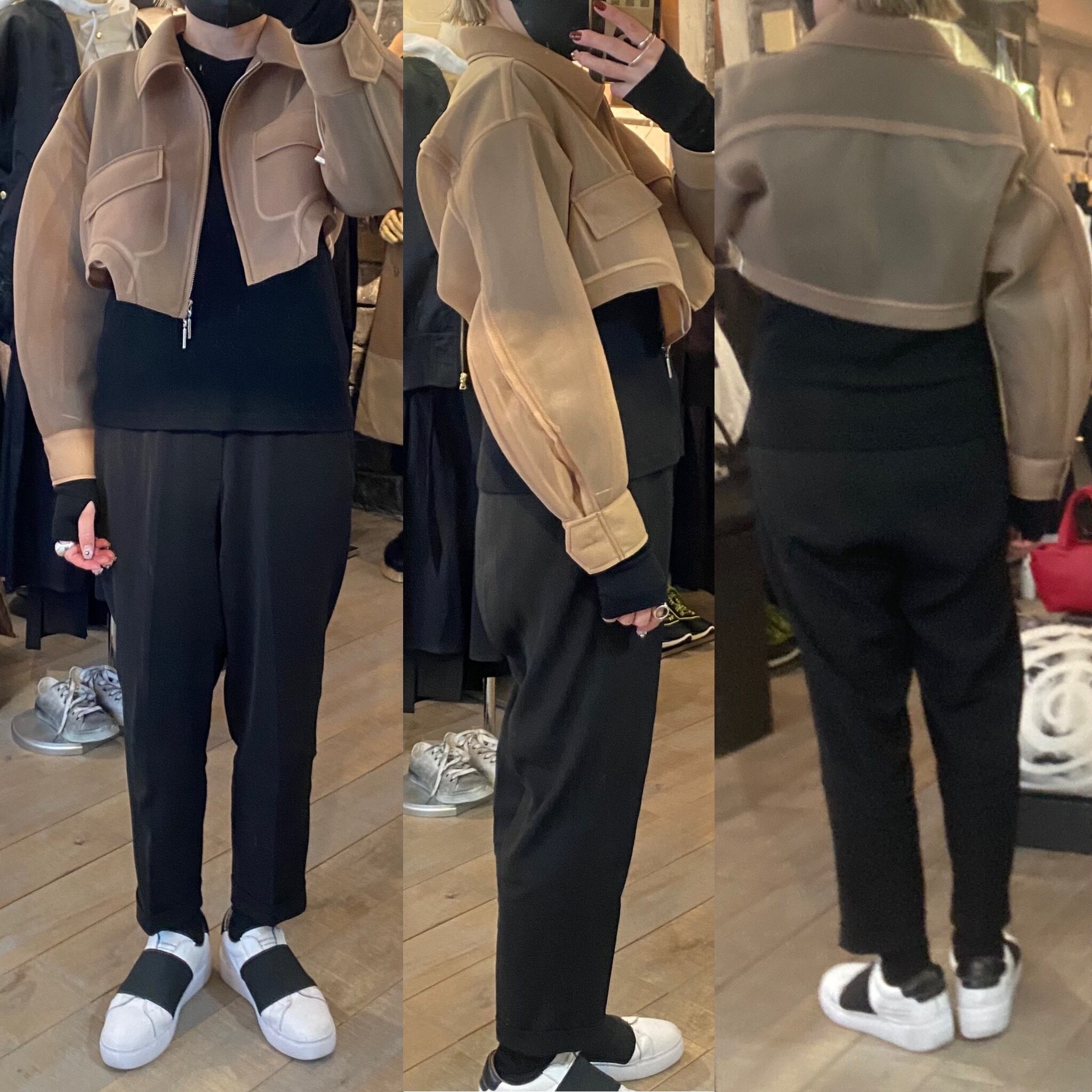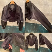 ボディーを大胆にカットしたショート丈が特徴のブルゾン。コンパクトな着丈やドロップショルダー、立体的なボリュームのあるお袖がスタイリングに丸みを出し、女性らしさを演出しています。