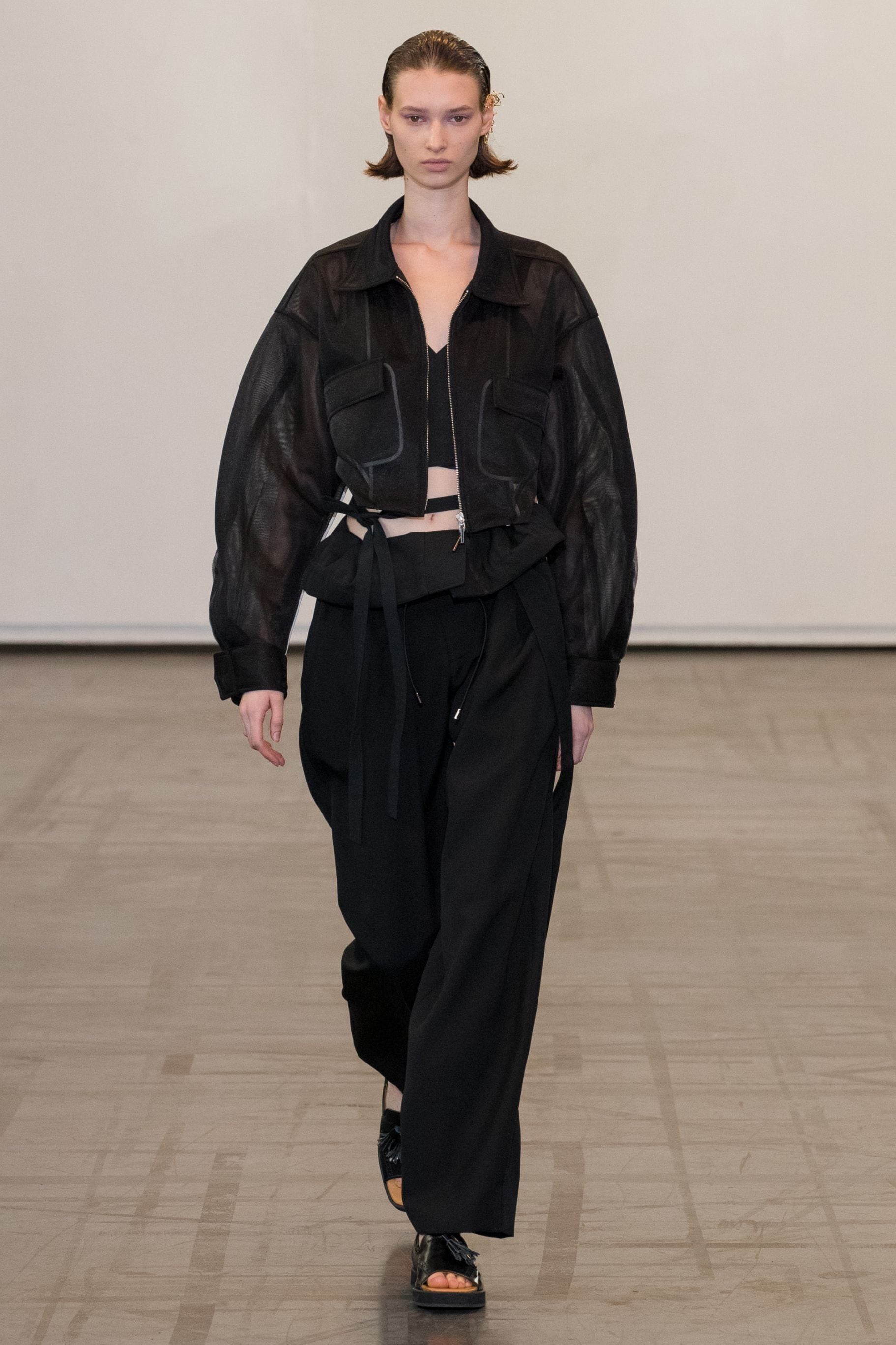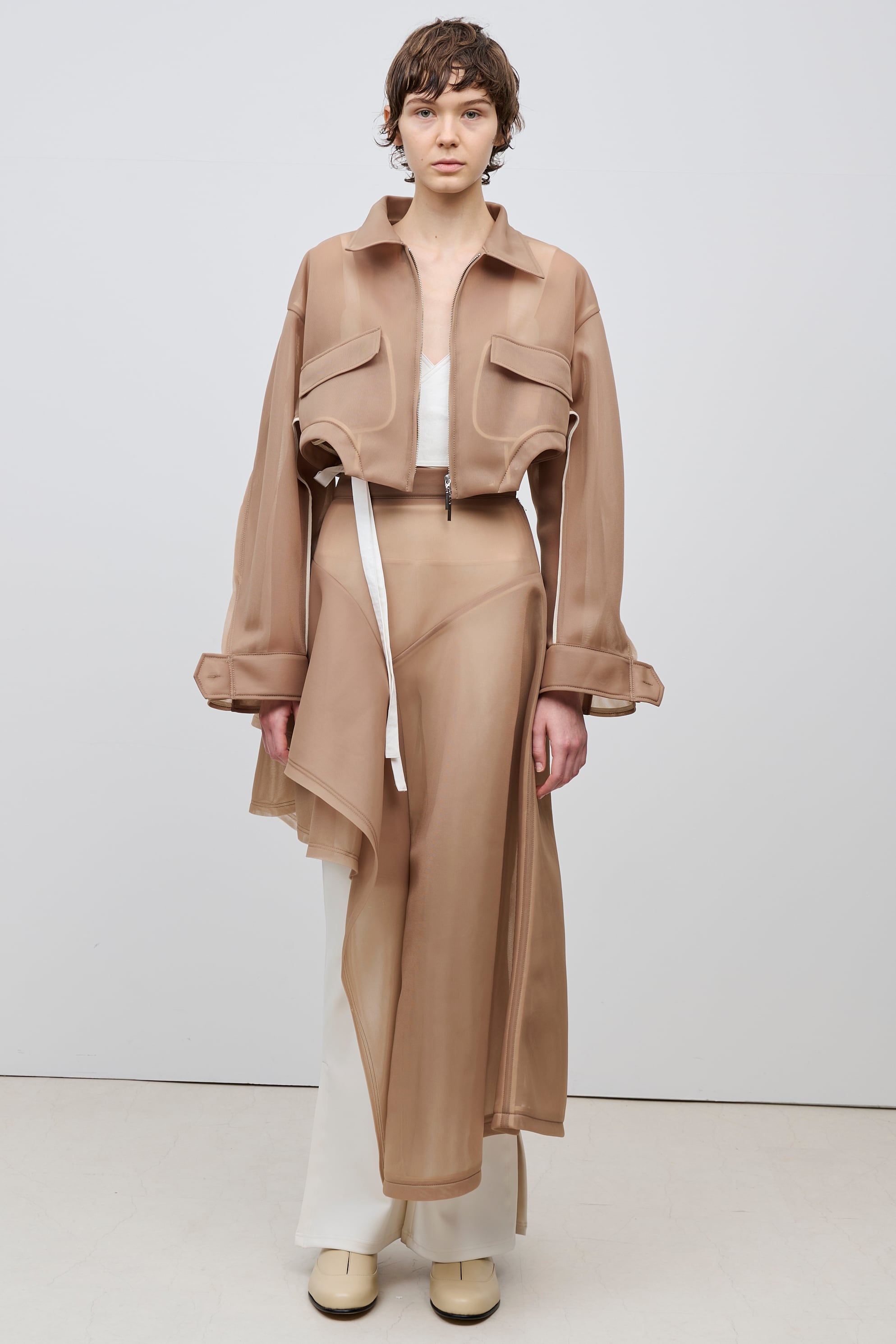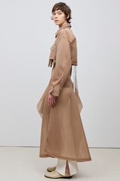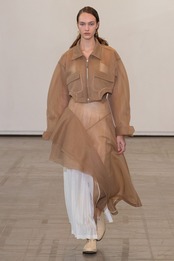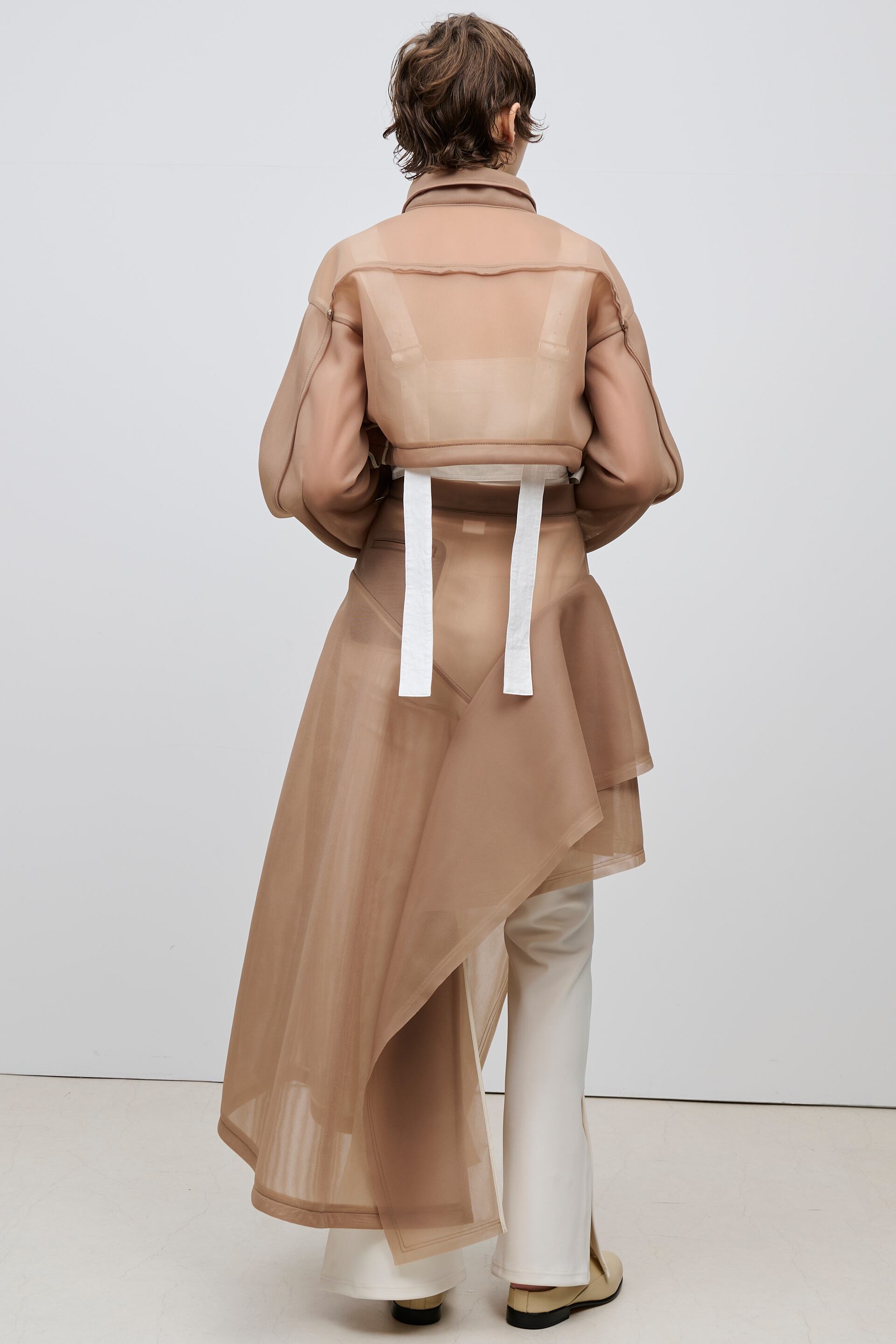 ボディーを大胆にカットしたショート丈が特徴のブルゾン。コンパクトな着丈やドロップショルダー、立体的なボリュームのあるお袖がスタイリングに丸みを出し、女性らしさを演出しています。