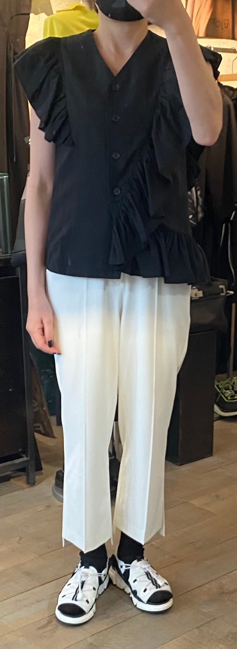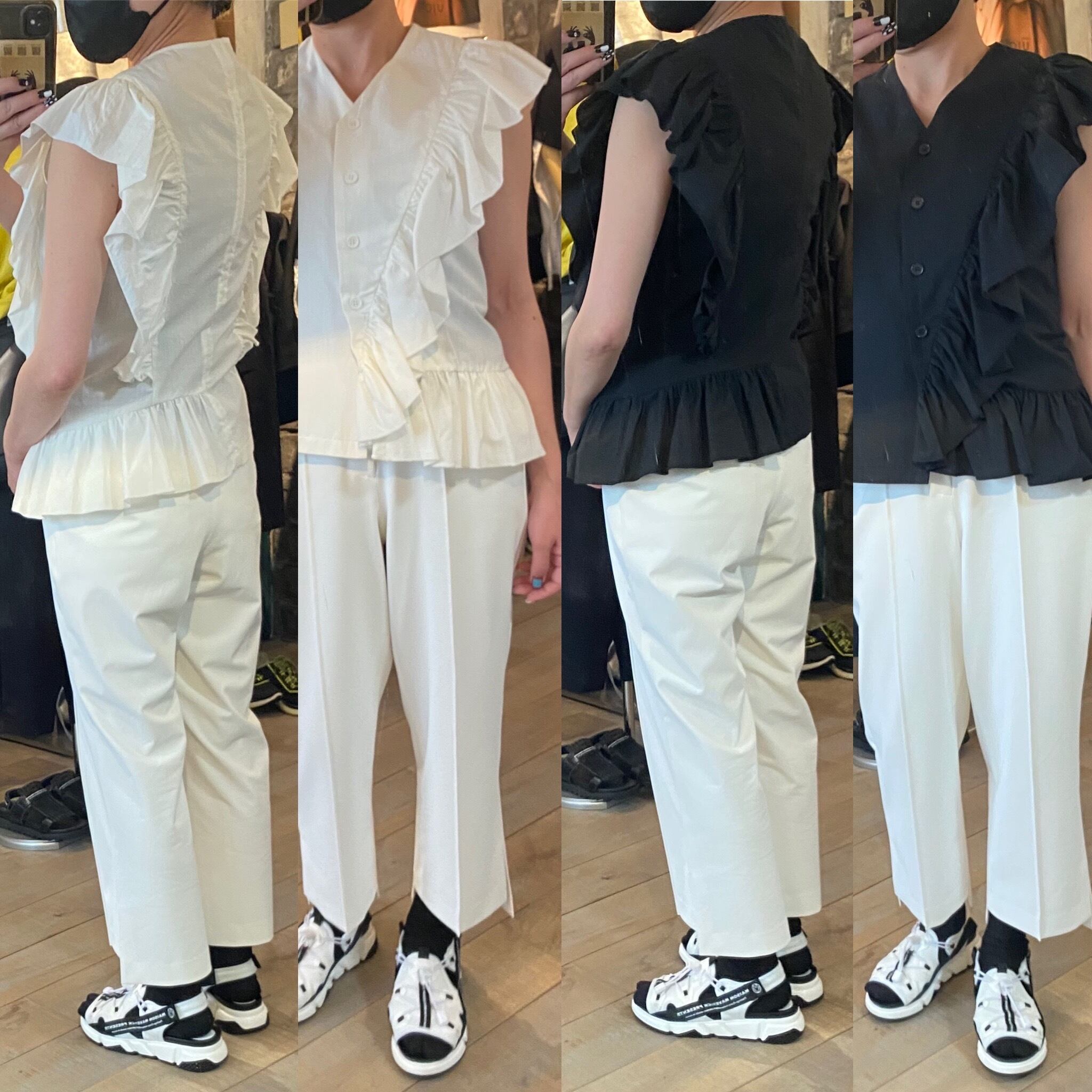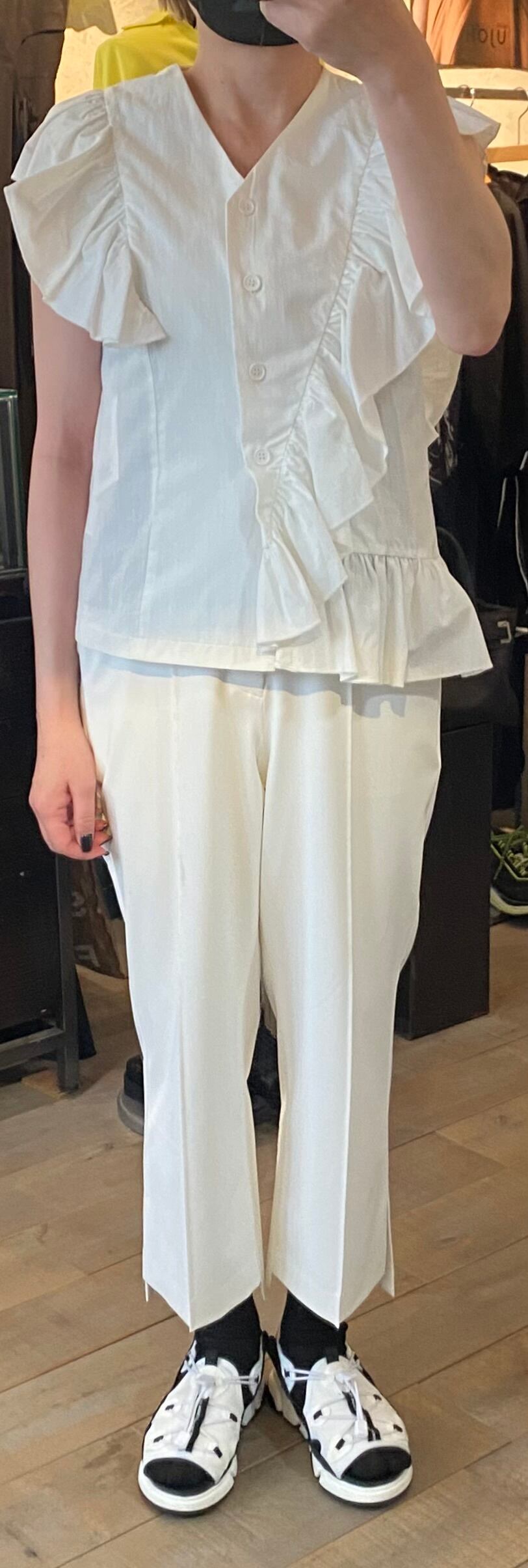 アシンメトリーにデザインされたフリルがポイントで、そこまで甘くならない感じなのも◎気になる二の腕もカモフラージュしてくれるのも嬉しいところ。サラッと着るだけでスタイリングを完結させてくれます♪