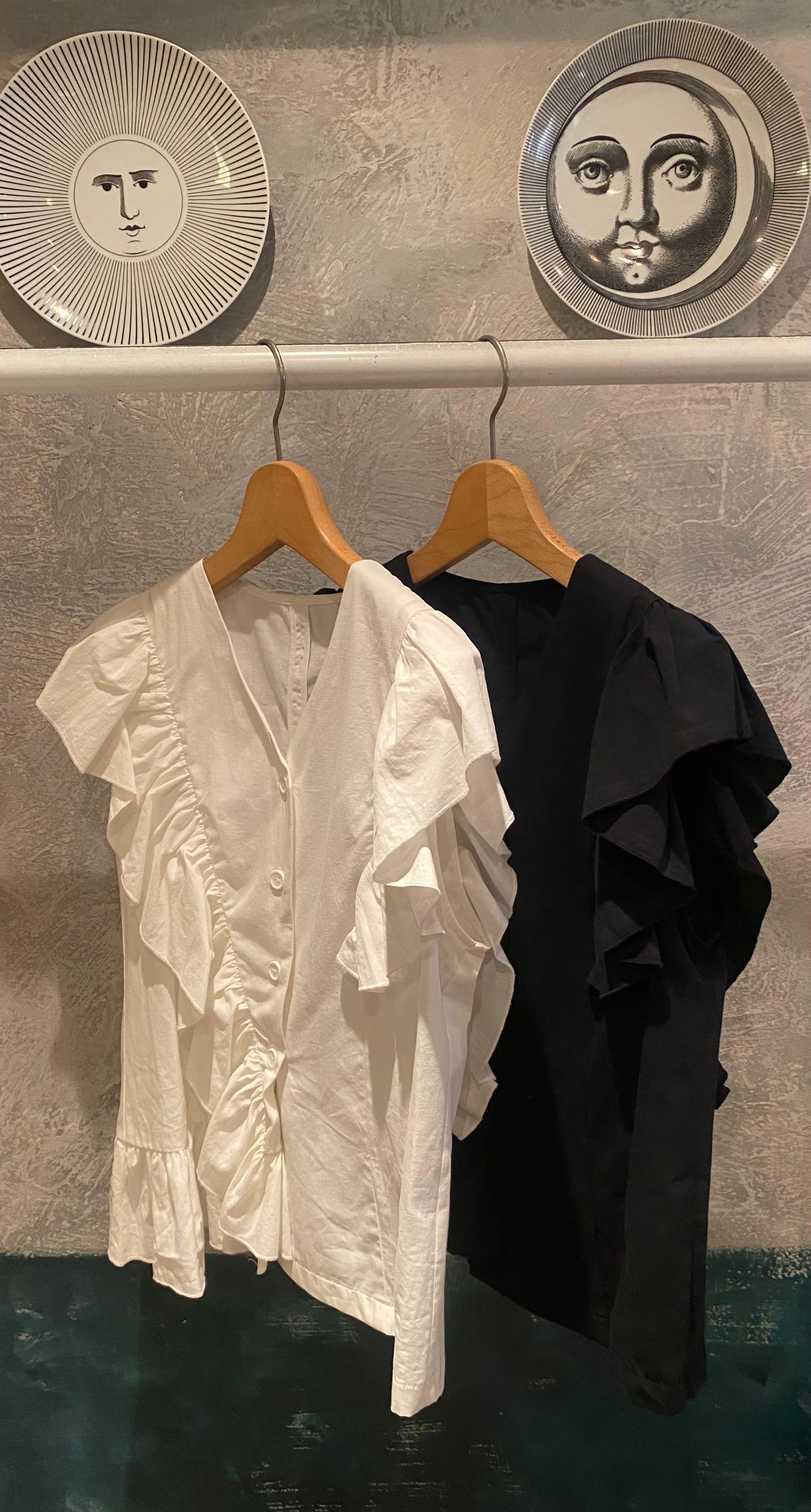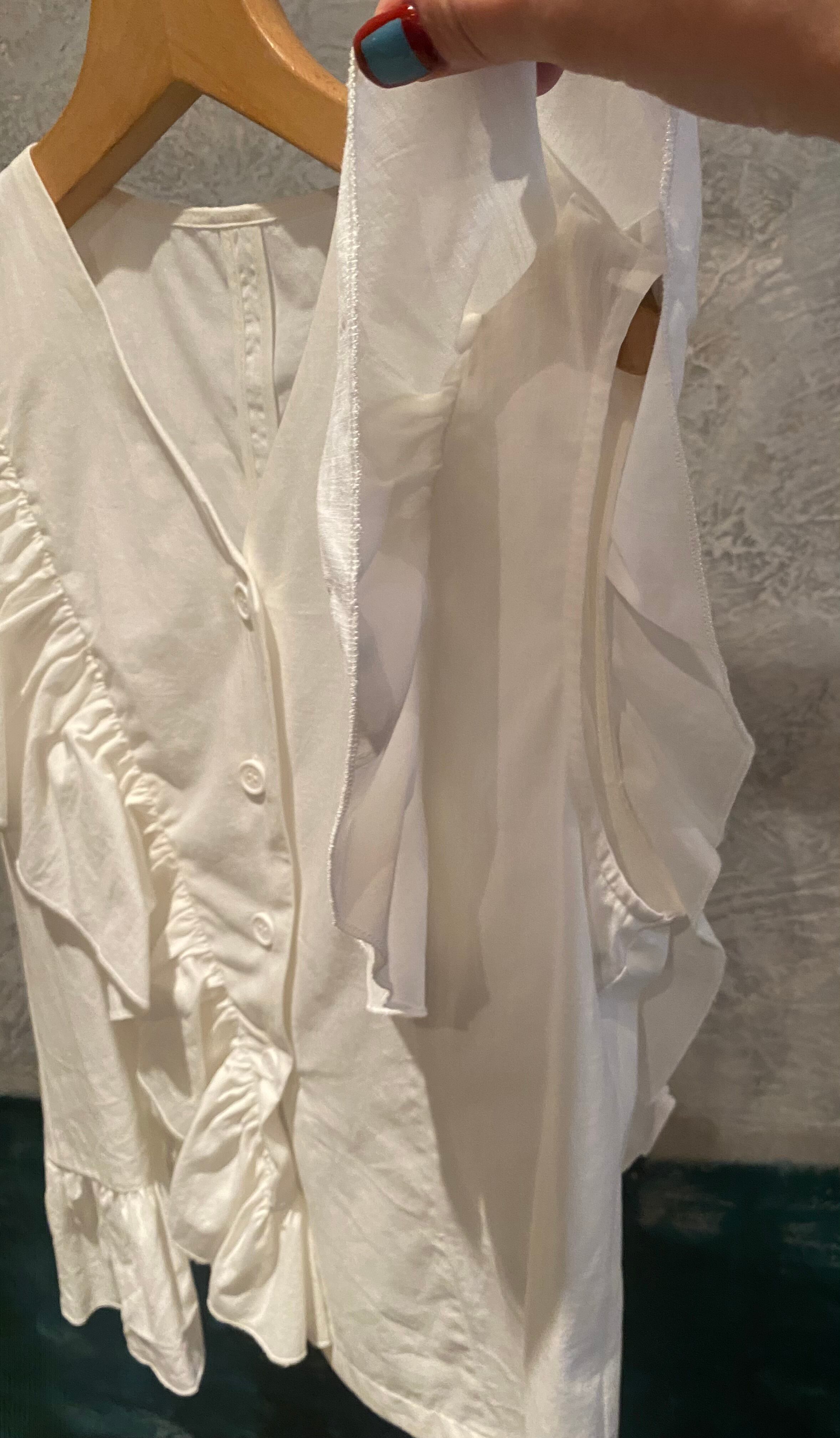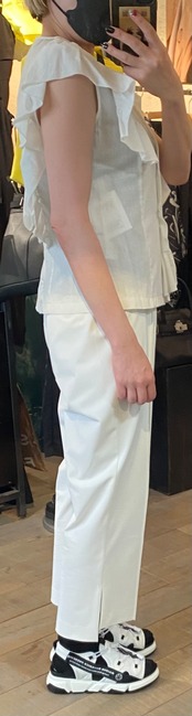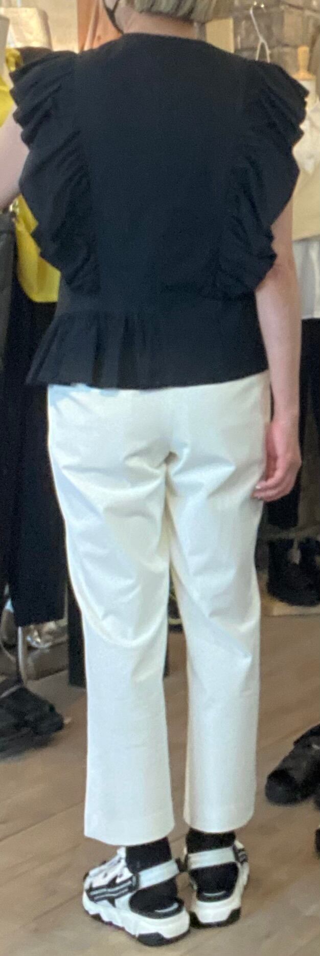 アシンメトリーにデザインされたフリルがポイントで、そこまで甘くならない感じなのも◎気になる二の腕もカモフラージュしてくれるのも嬉しいところ。サラッと着るだけでスタイリングを完結させてくれます♪