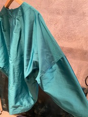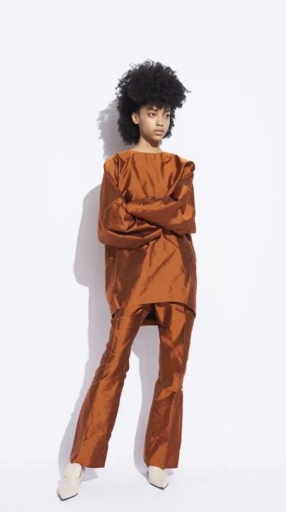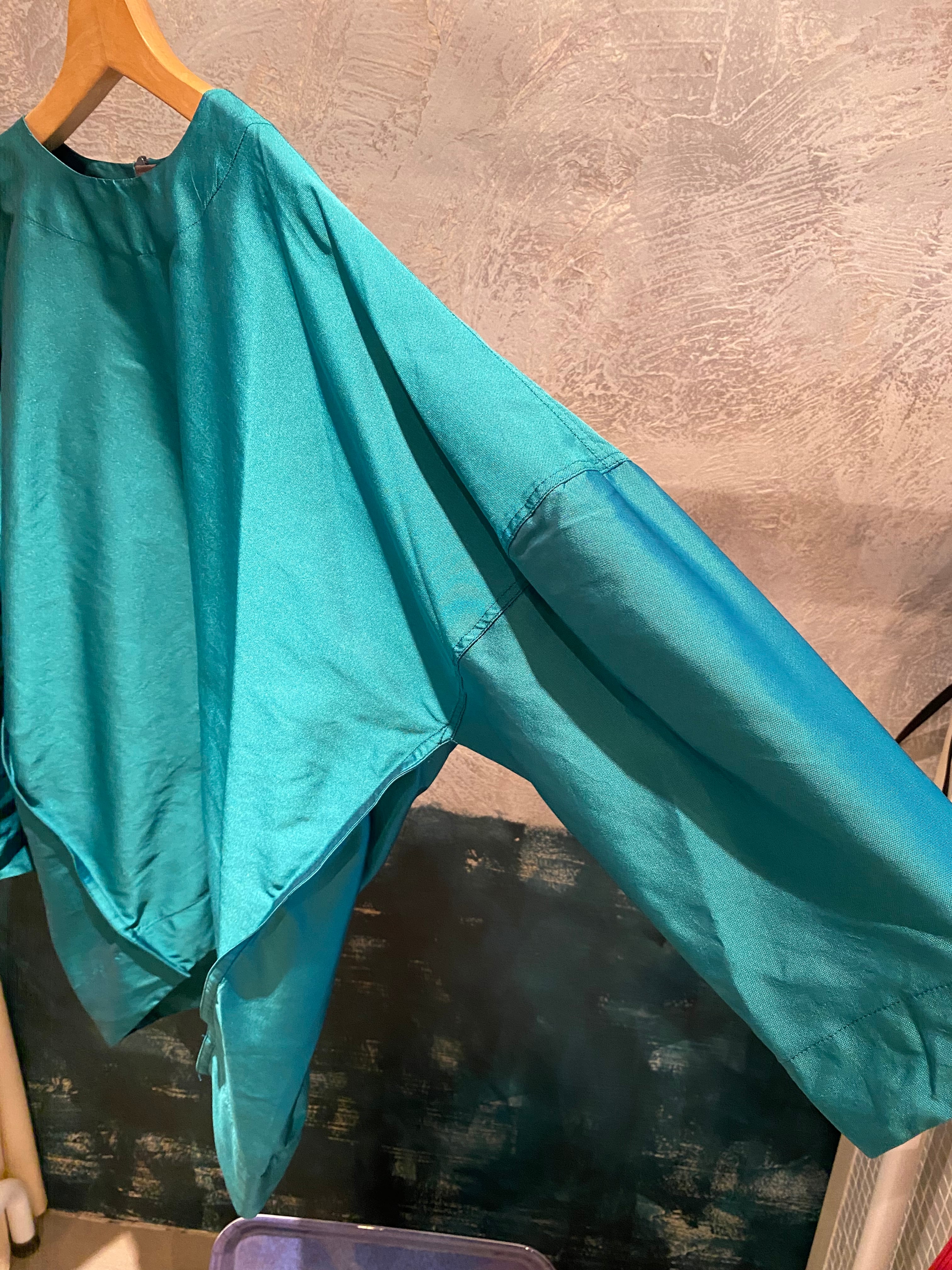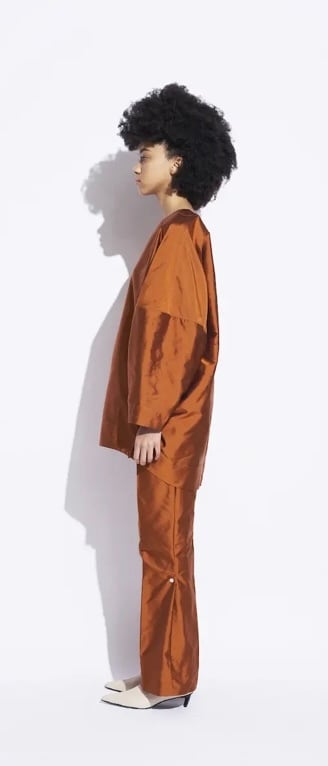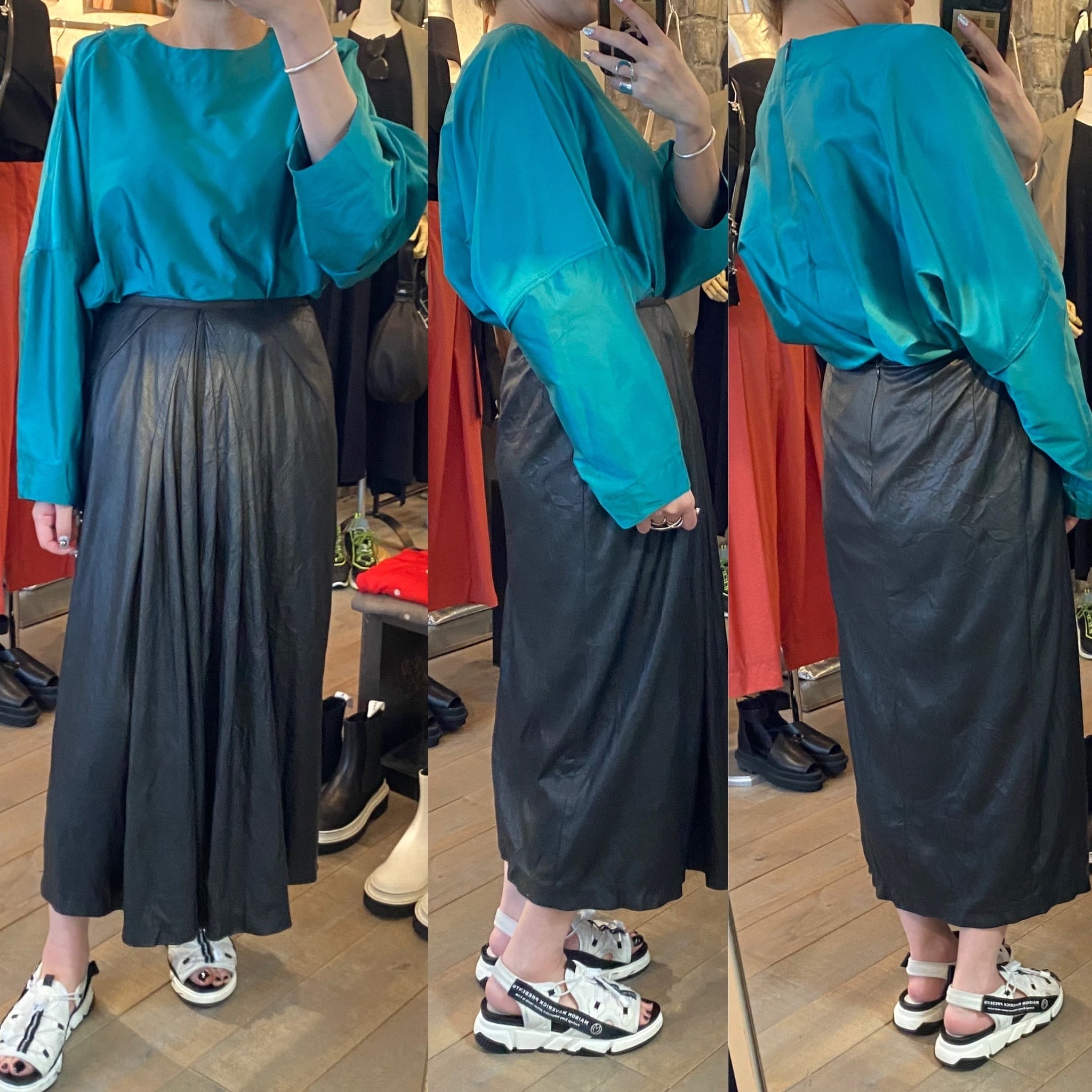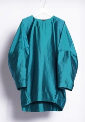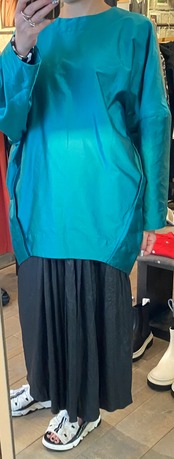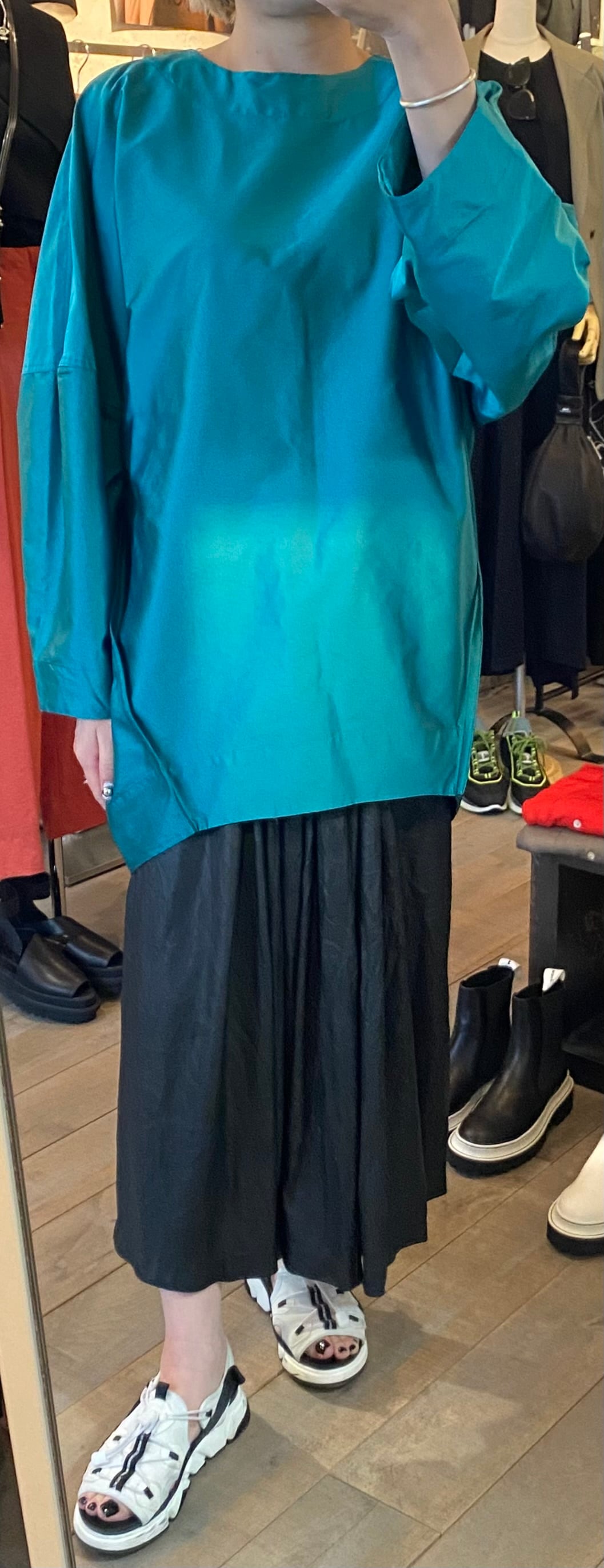 ゆったりとしたシルエットで、丈の長めのトップス。見頃と袖が膨らみながらも裾にかけてすぼまっていき、脇は袋縫いを表に出したデザイン。後ろコンシールファスナー開き。パサッと着ても、インする着方もできます。