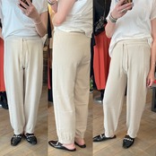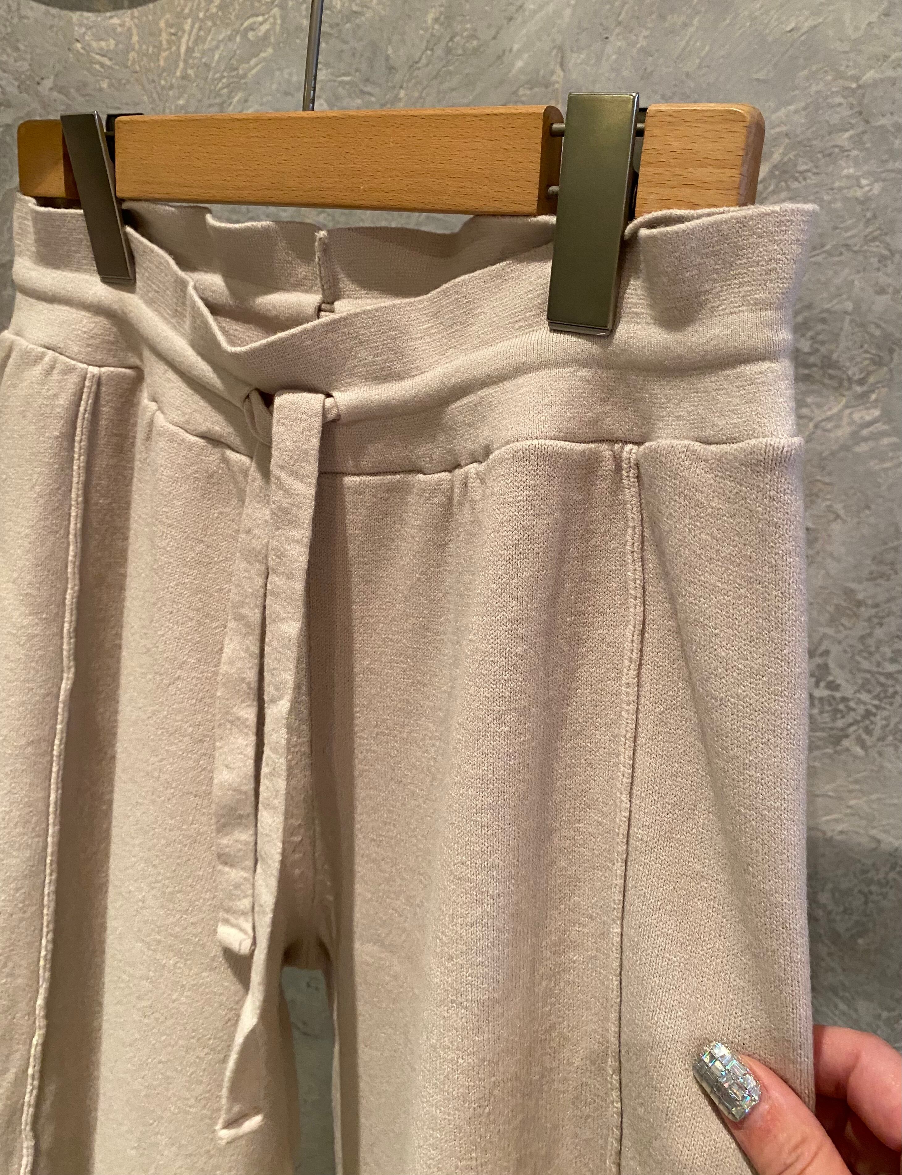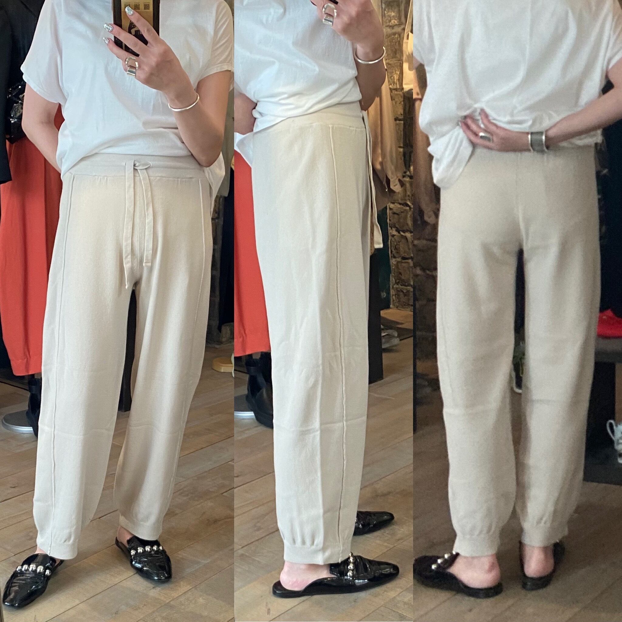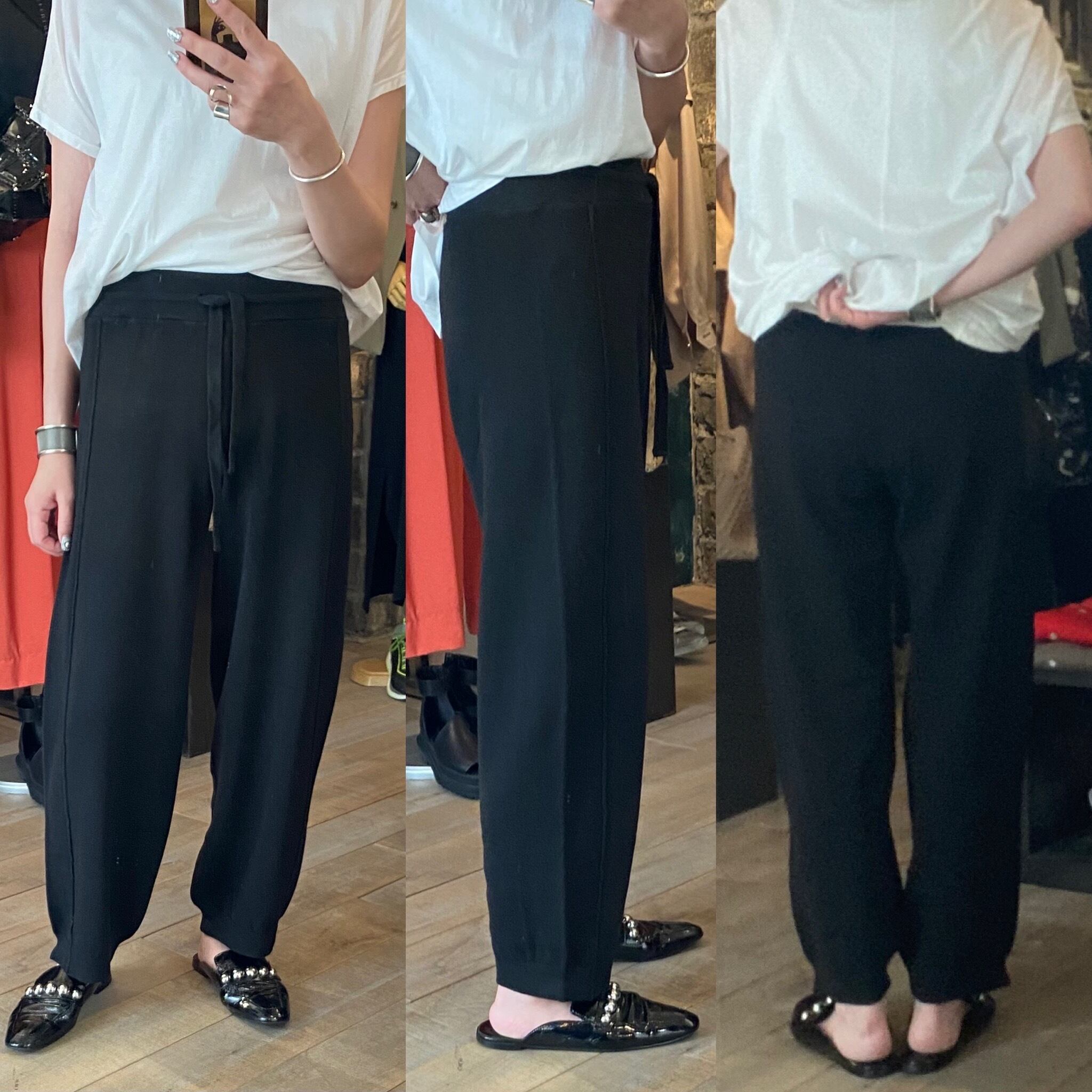 楽チンで履き心地抜群のパンツは、ウエストは紐で調節可能。裾が窄まったシルエットで、切り替えもポイントに。素材は、毎シーズントップスや、パンツなどをオーダーしている人気のウールレーヨン素材。ストレッチ素材も入っていて、イージーケアなのも嬉しいところ。
