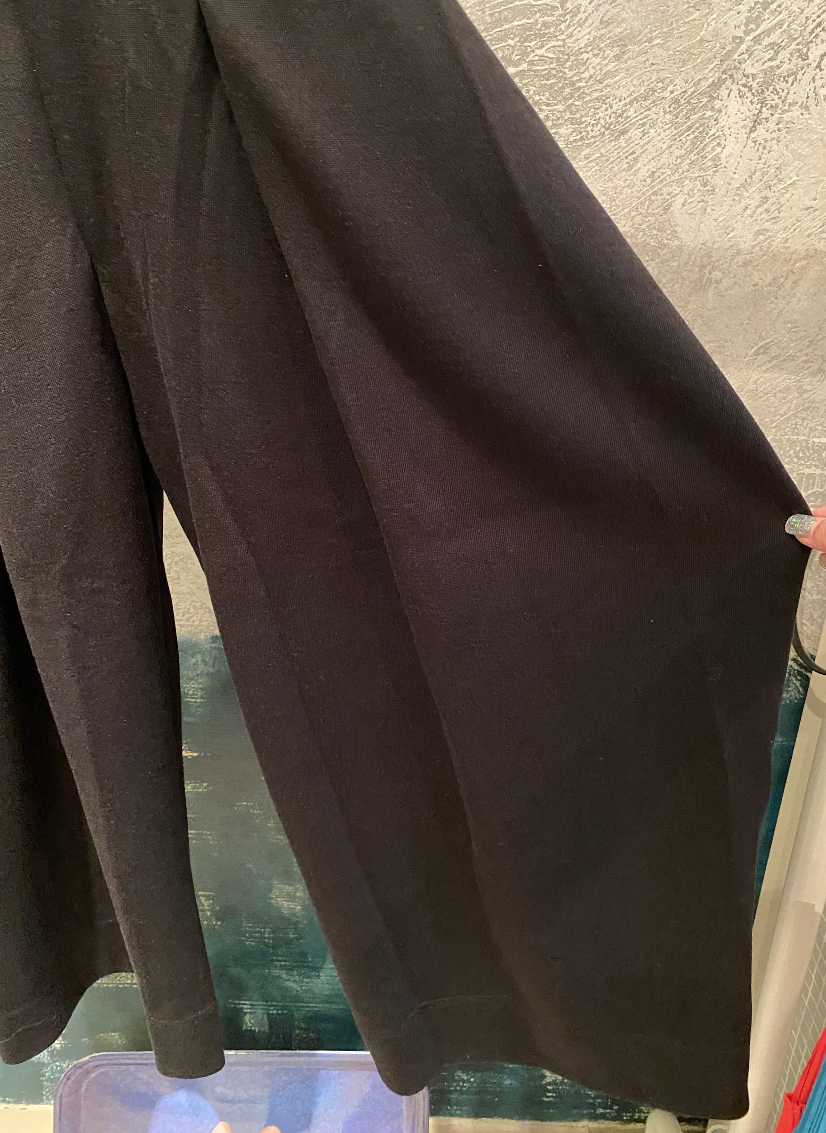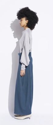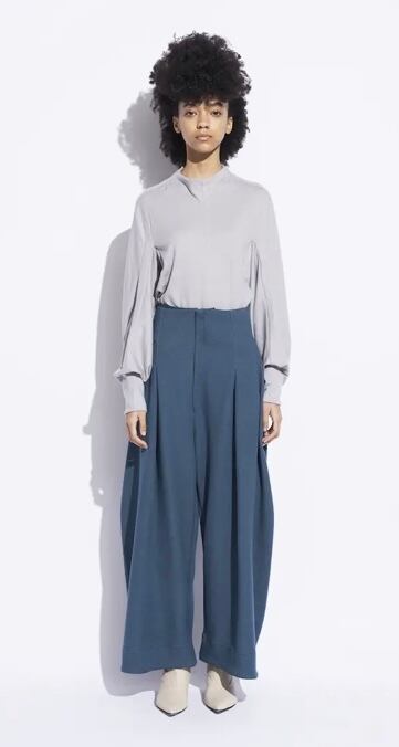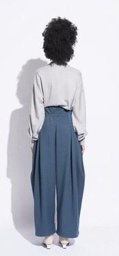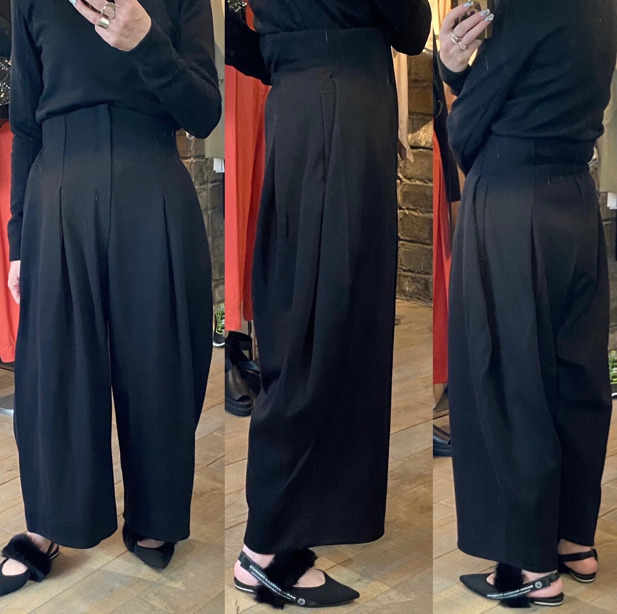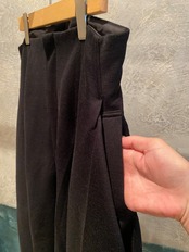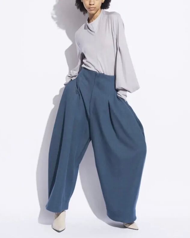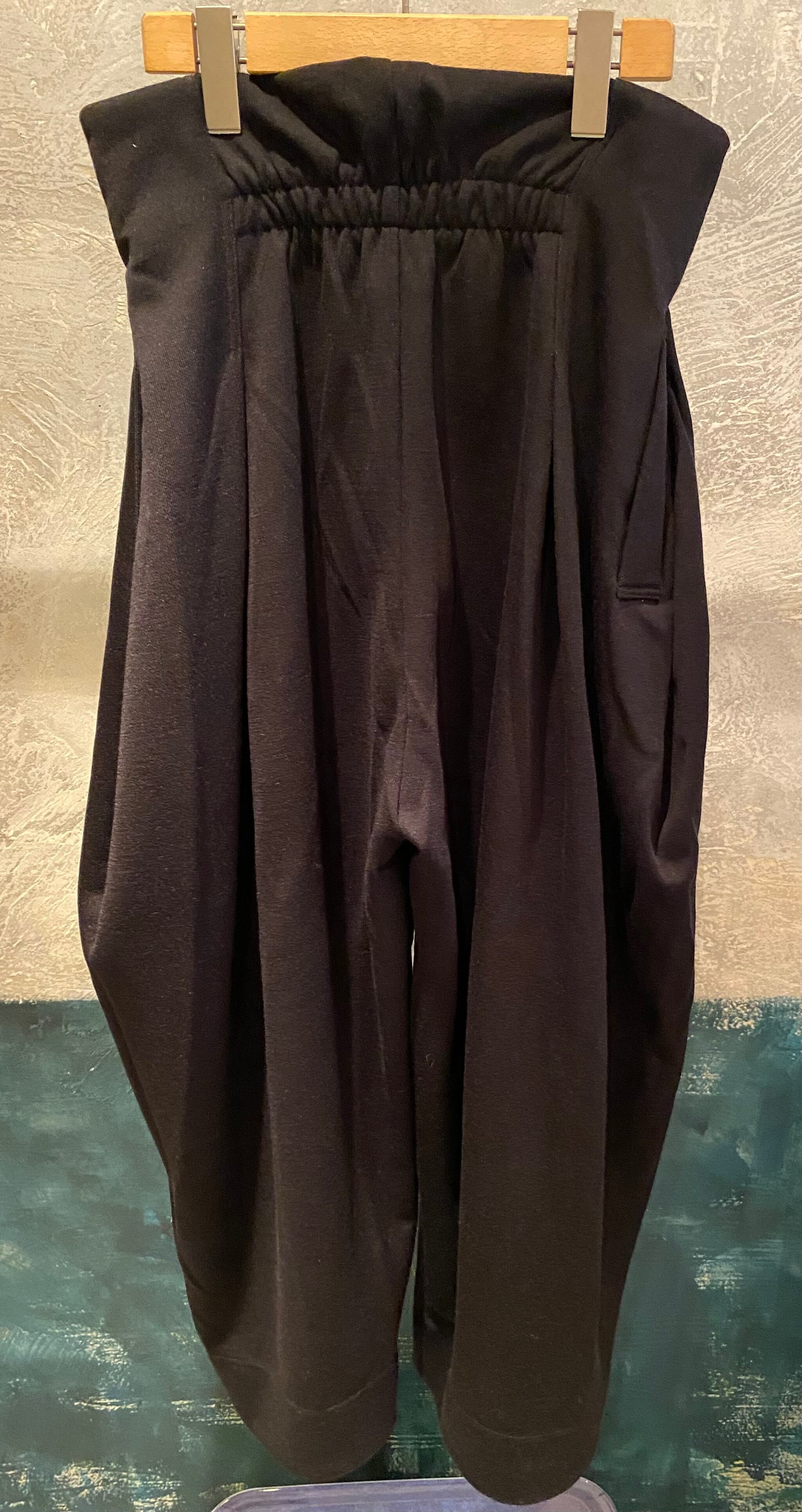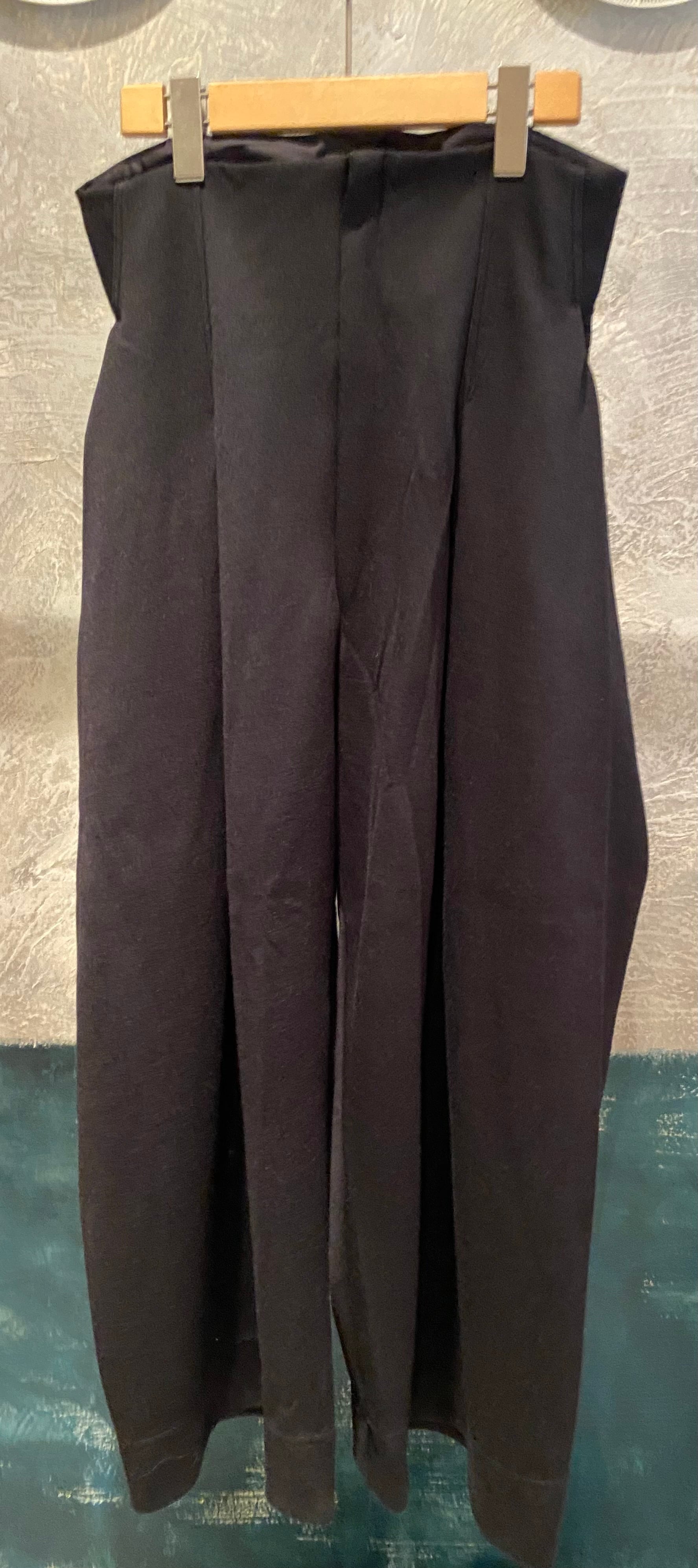 1枚のパターンで作られており、脇の大きなタックでボリュームを出した大きなシルエットのテーパードパンツ。少しハイウエストになっており、後ろにゴムが入っています。左右脇にポケット有り。前ファスナー開き。サラッとはくだけでスタイリングのキマルボトムです♪