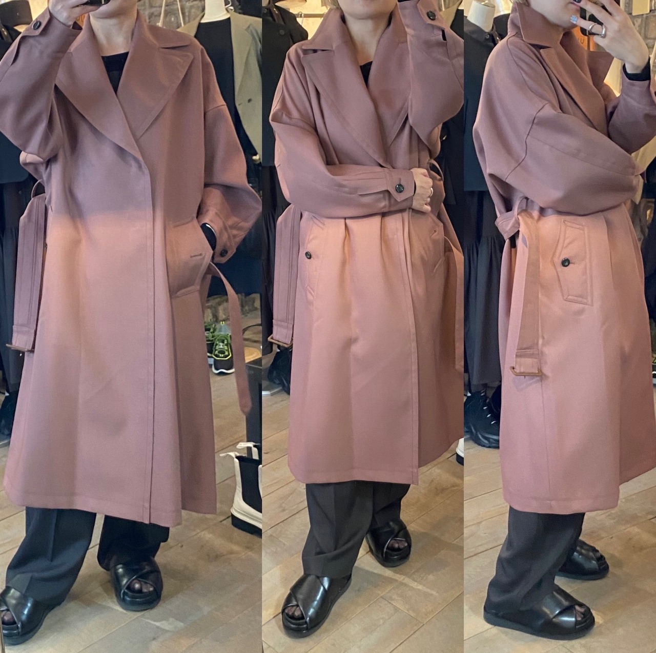 エレガントな雰囲気のあるオーバーシルエットコート。シンプルなルックスでたっぷりと生地を使用した分量感がインパクトのあるアイテム。オープンでパサッと羽織っても、ベルトでギュッと結ぶ着方も素敵です♪耐久性の高いウールサージの素材で、クリア仕上げによる光沢が上品な印象に仕上がっています。含浸加工による弾力とハリ感がありつつ、ウールならではのしなやかさを合わせ持った生地です。