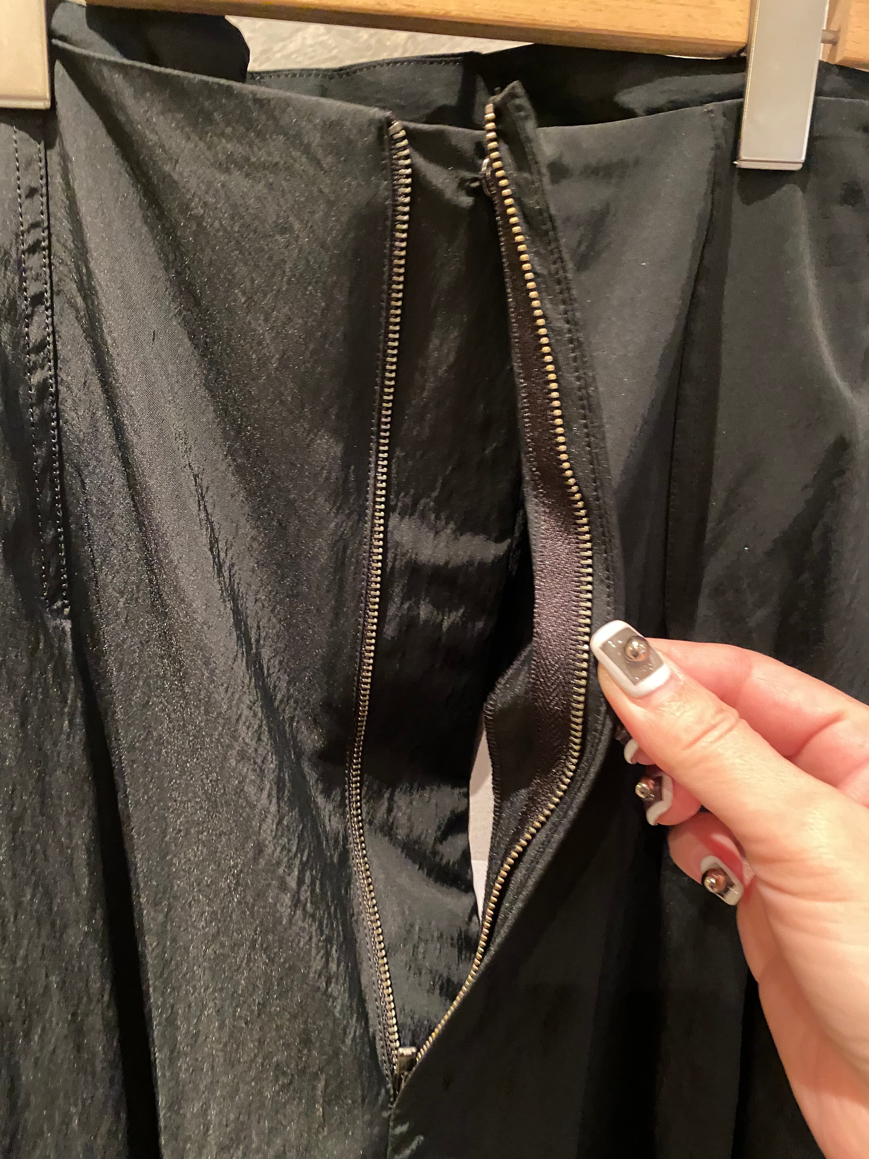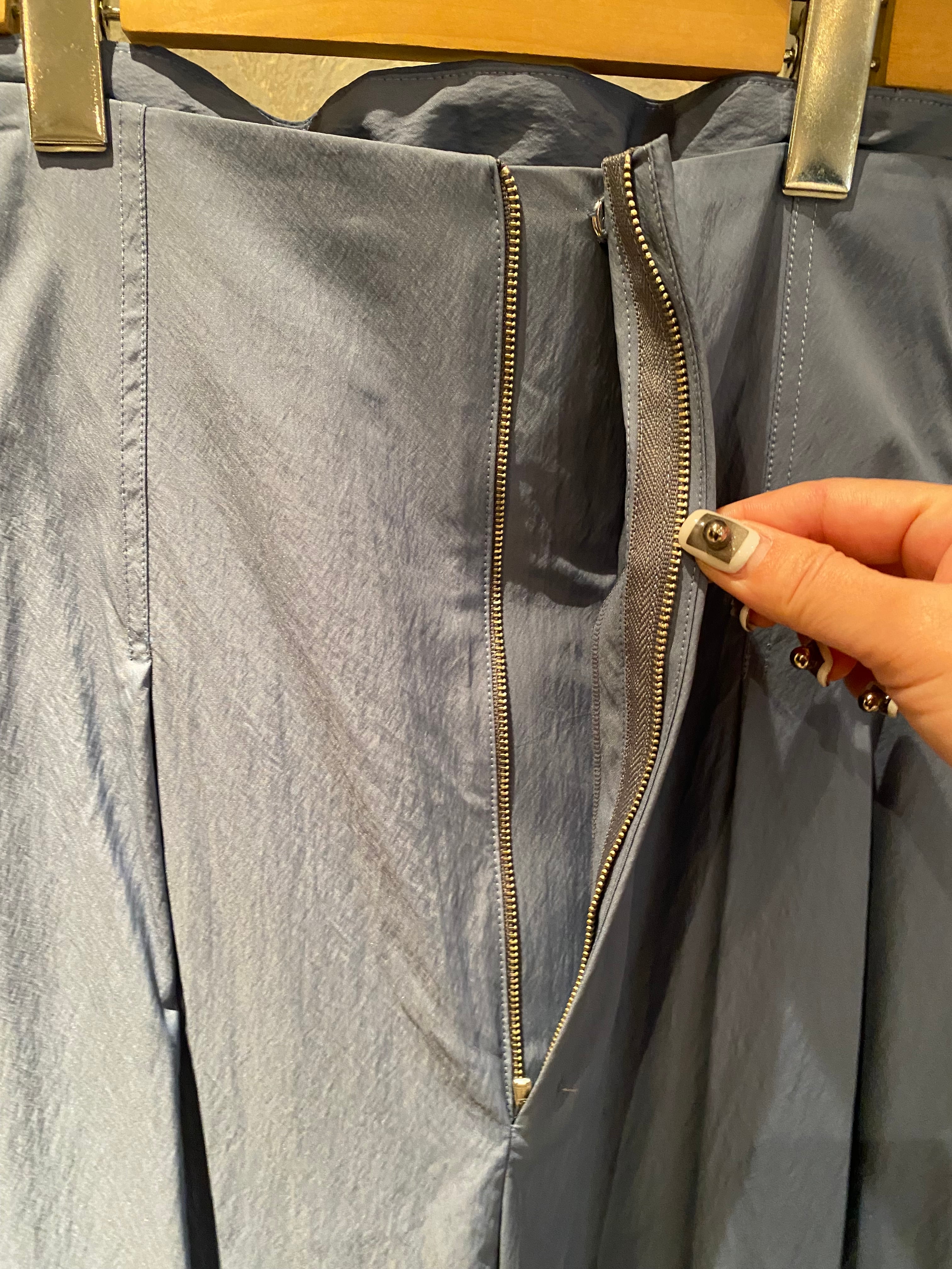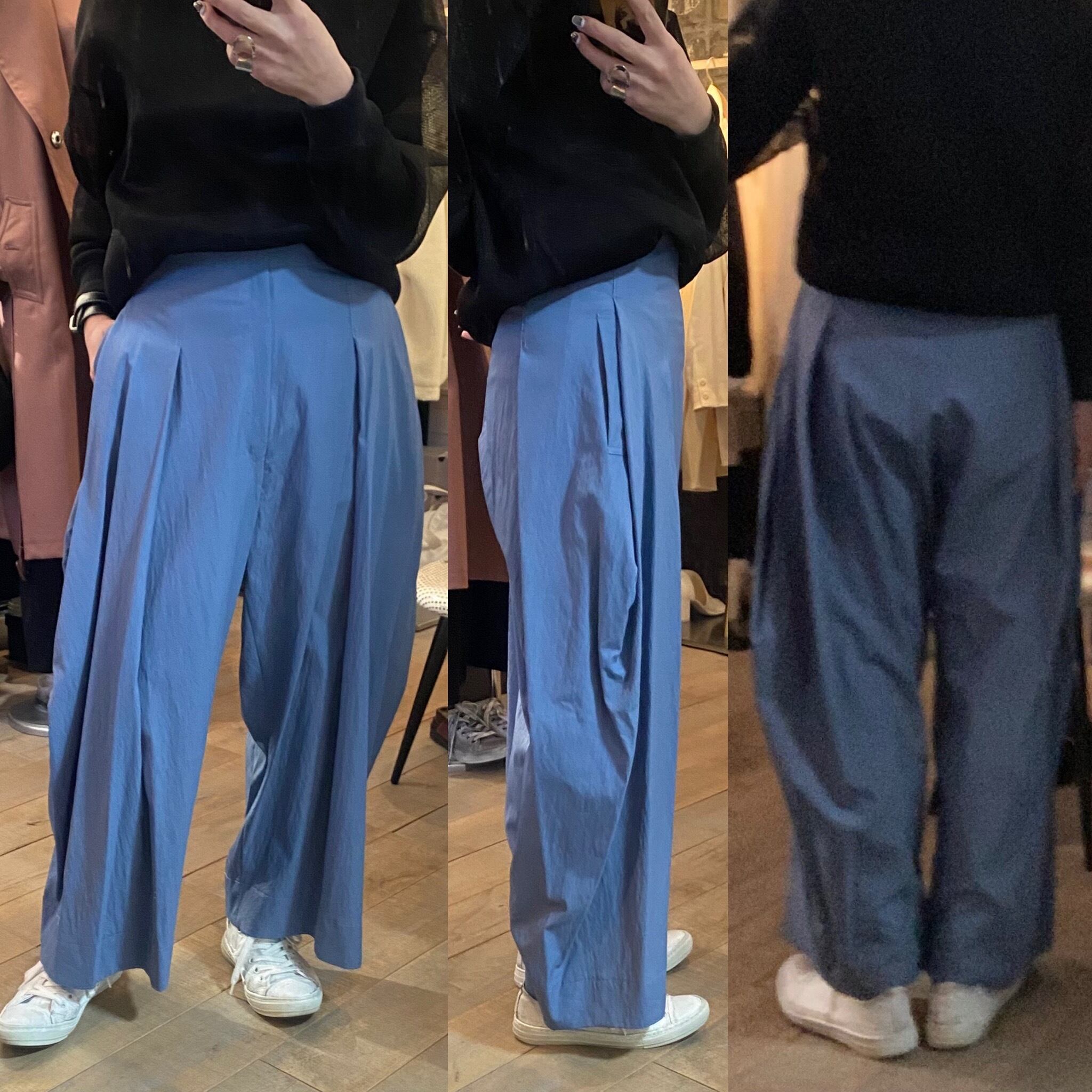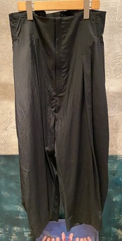 1枚のパターンで作られており、脇の大きなタックでボリュームを出した裾すぼまりの大きなシルエットのパンツ。少しハイウエストになっており、後ろのウエストにゴムが入っています。両脇にポケット有りの前ファスナー開きになります。光沢感のないレーヨンフィラメント糸とナイロンフィラメントを使用したマットなツイル素材。レーヨンの落ち感と、ナイロンのハリ感を合わせ持った独特な風合いを持っています。ナチュラルな艶があり、接触冷感の生地になります。