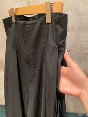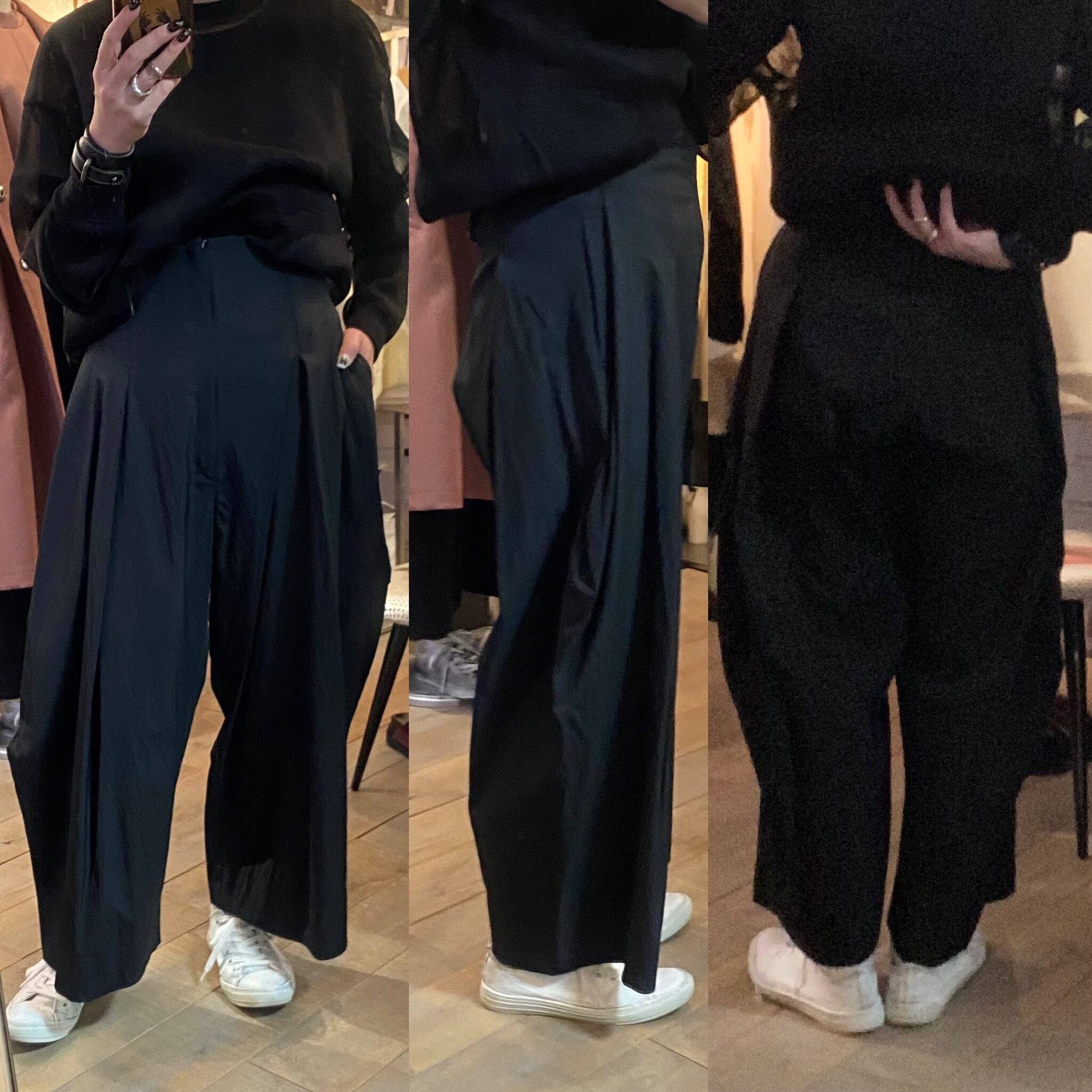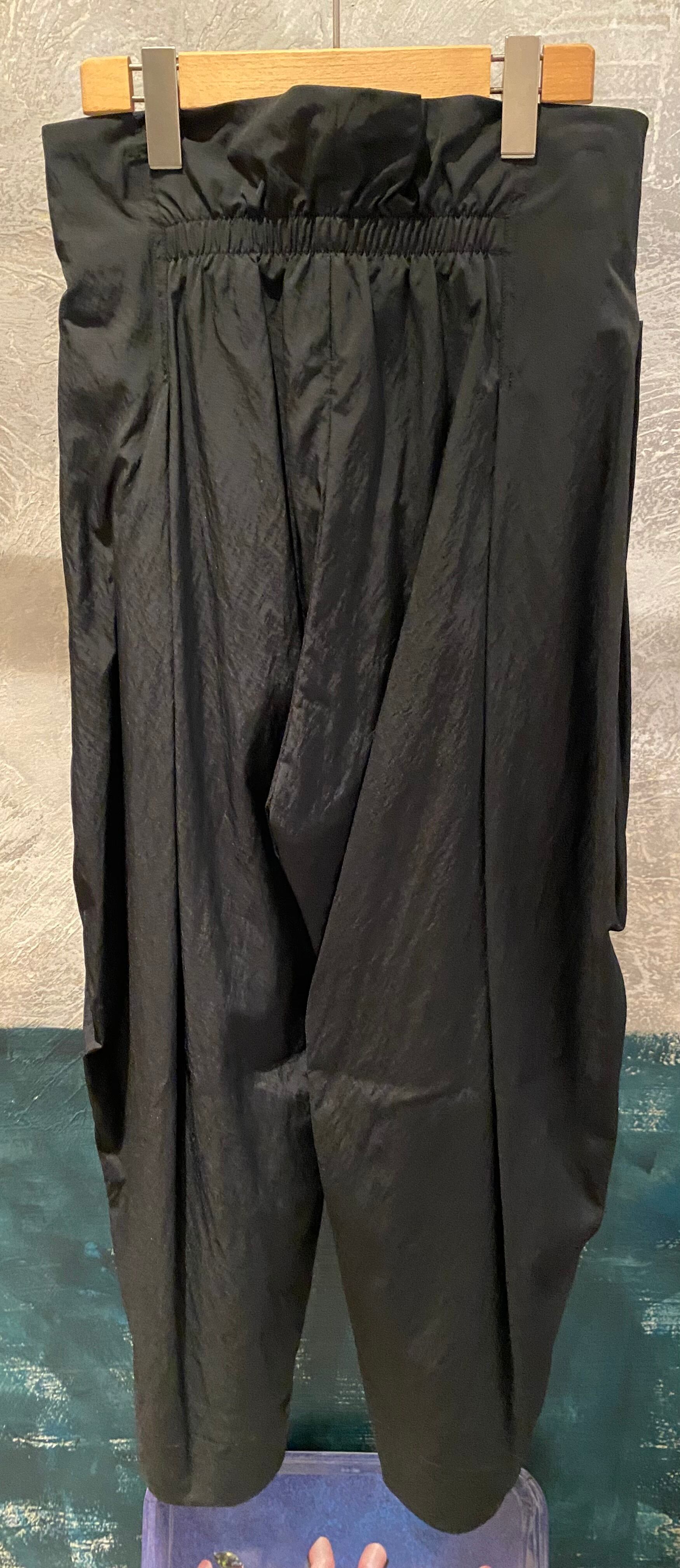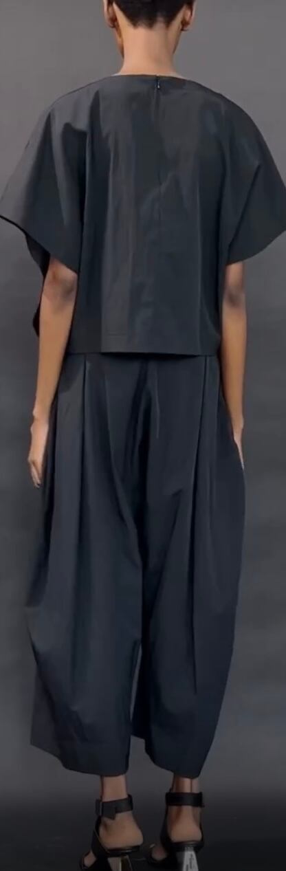 1枚のパターンで作られており、脇の大きなタックでボリュームを出した裾すぼまりの大きなシルエットのパンツ。少しハイウエストになっており、後ろのウエストにゴムが入っています。両脇にポケット有りの前ファスナー開きになります。光沢感のないレーヨンフィラメント糸とナイロンフィラメントを使用したマットなツイル素材。レーヨンの落ち感と、ナイロンのハリ感を合わせ持った独特な風合いを持っています。ナチュラルな艶があり、接触冷感の生地になります。