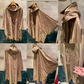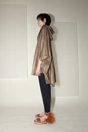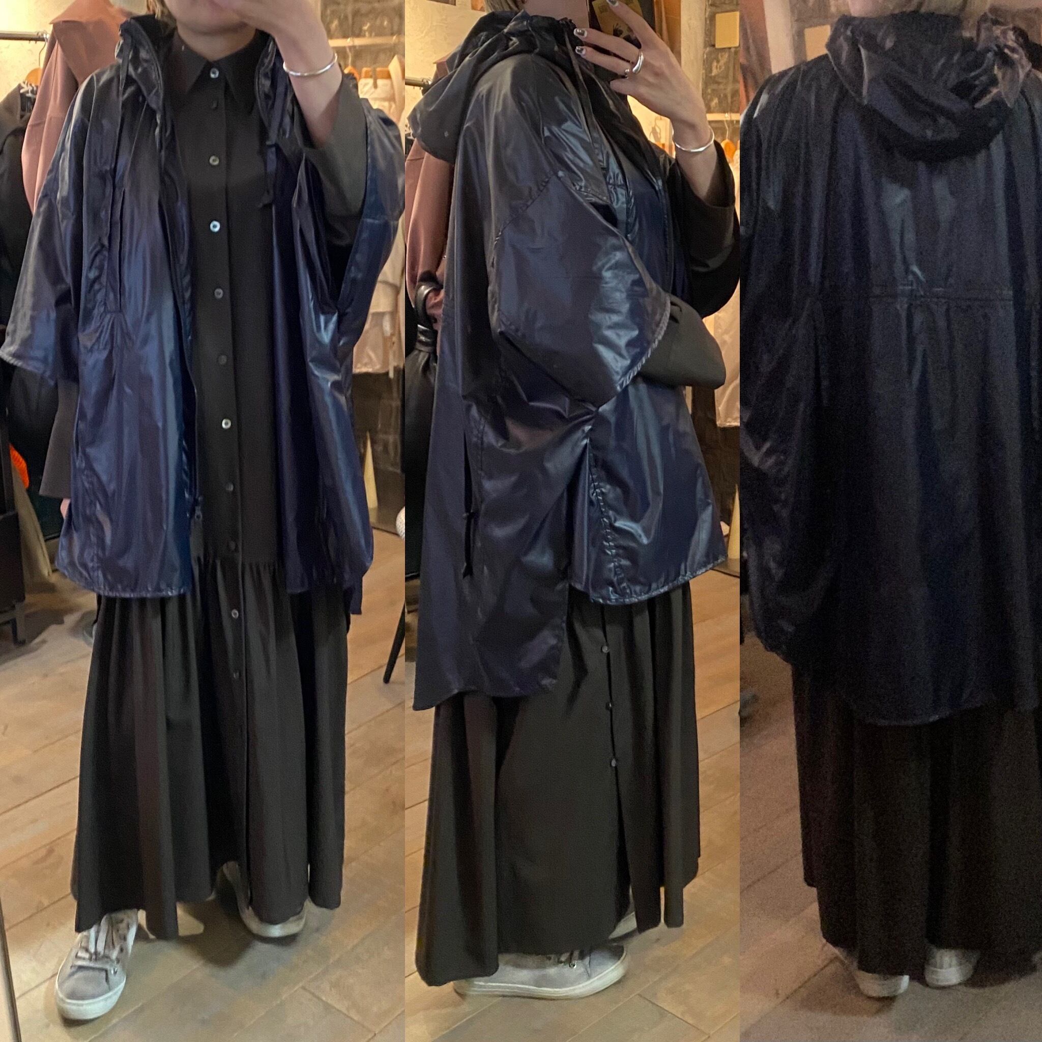 ふわっとなびく裾の前後左がダイナミックなポンチョレインコート。分量感はありますが、非常に軽量なコート。前は膝上、後ろは膝ぐらいの着丈、ゆったりとした大きな身巾にドロップショルダー、8部ぐらいのお袖丈です。後ろウエストにドローストリング付きでシルエットの変化を楽しめます。前中心ダブルファスナー仕様、前見頃両サイドに片玉縁ポケット、見頃切り替えシームポケット付き。前見頃二重仕立て、その他一重仕立て。立ち上がりのあるフードもポイントに。