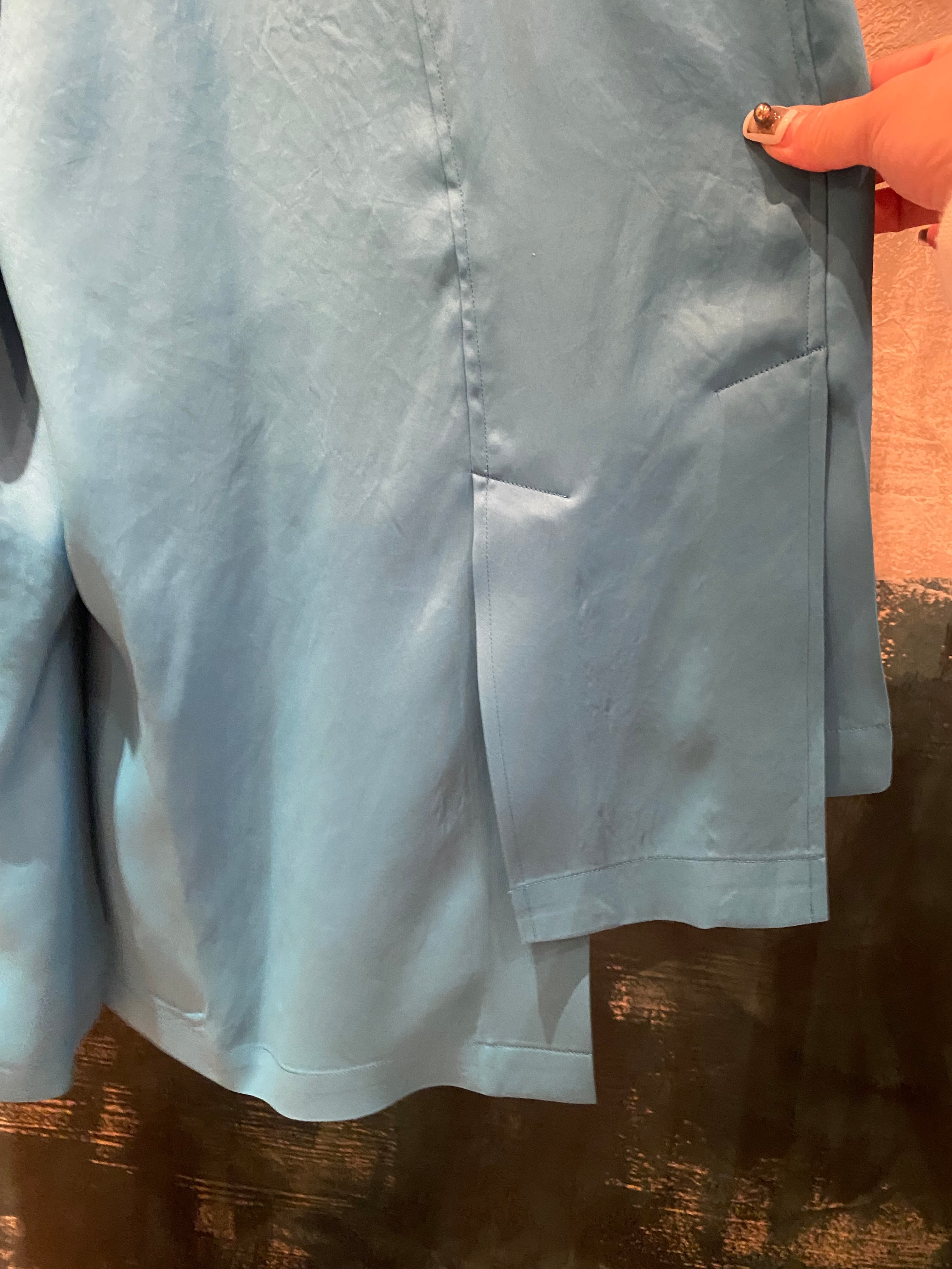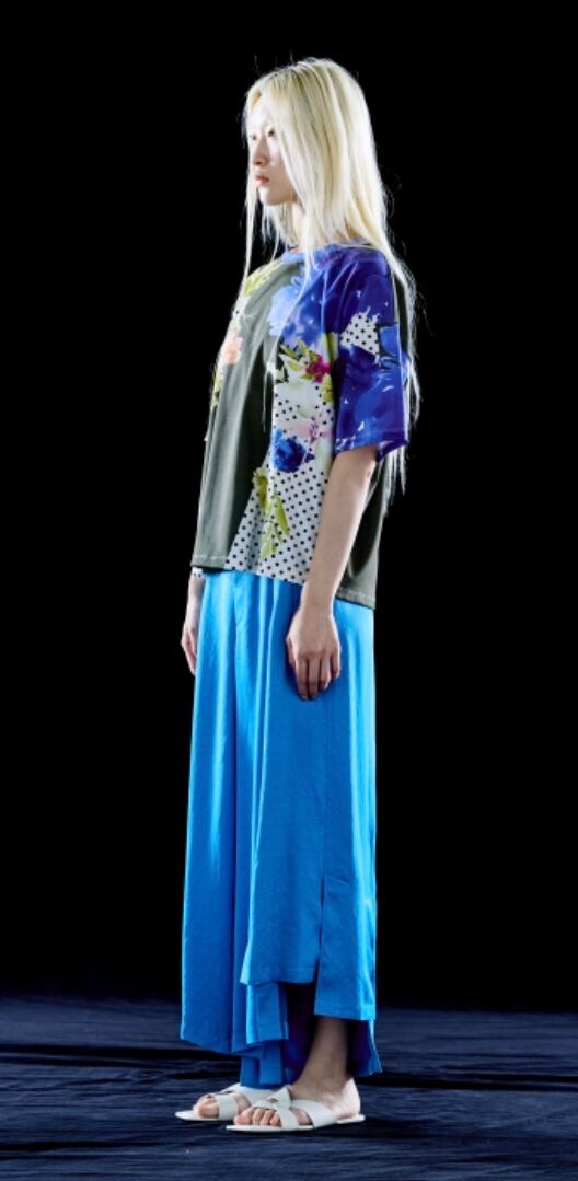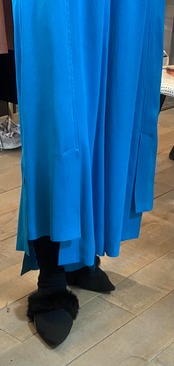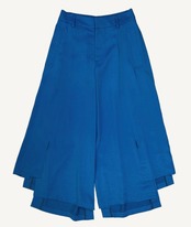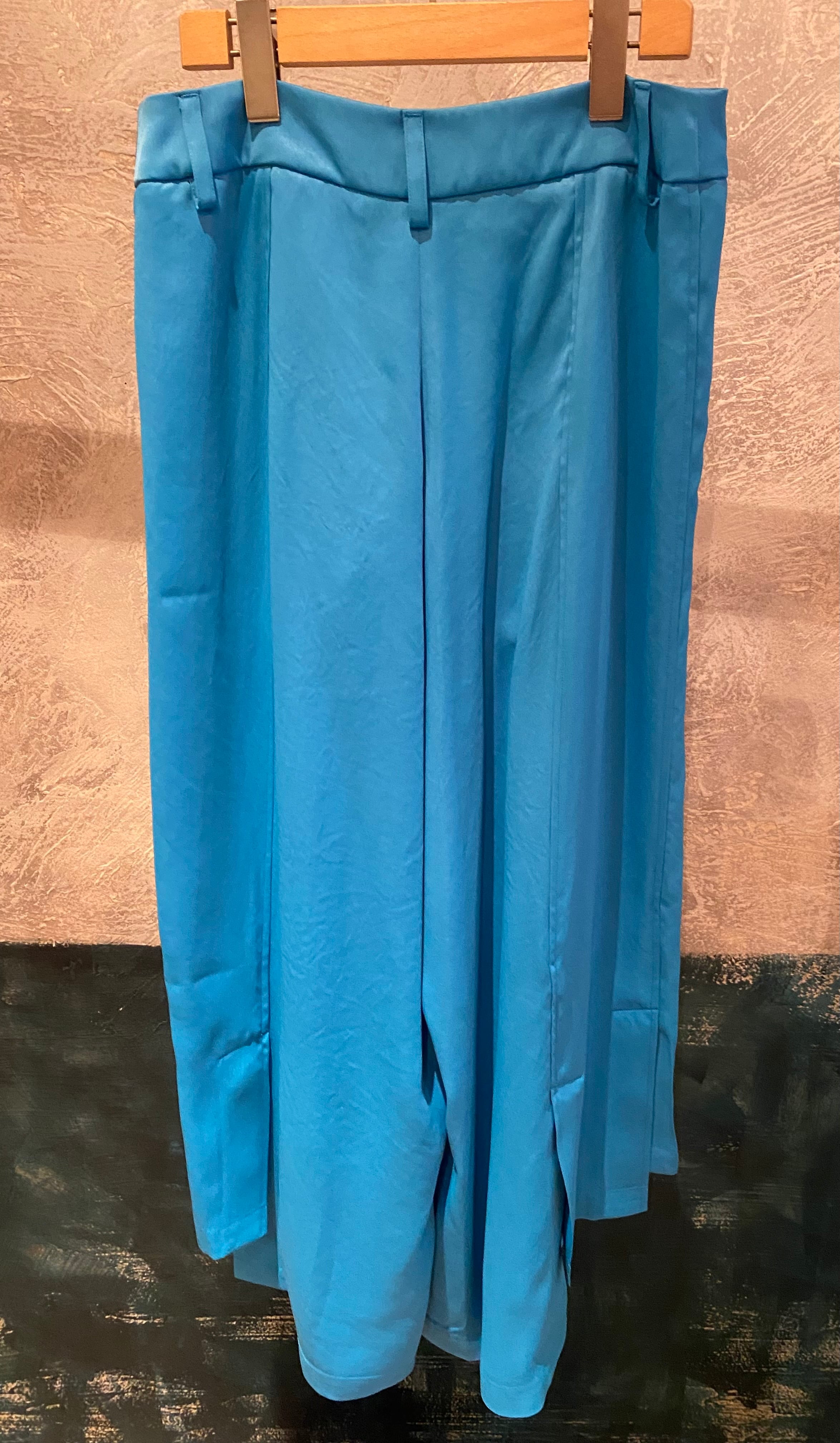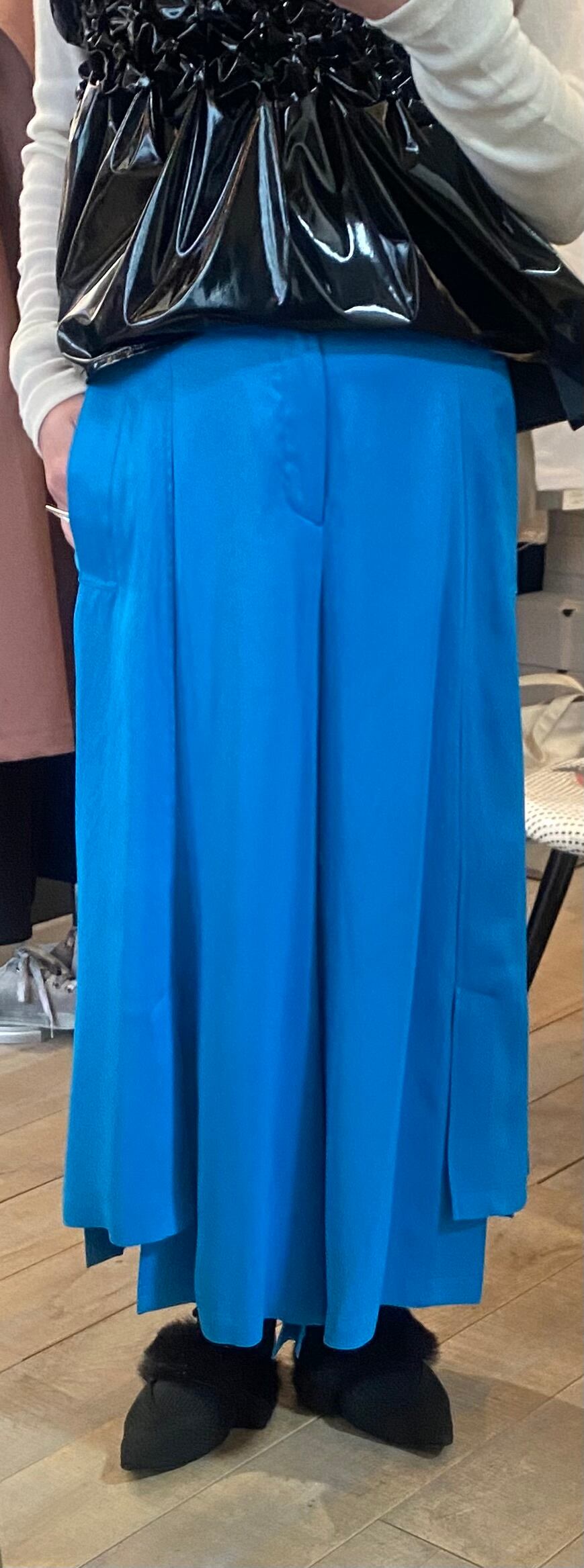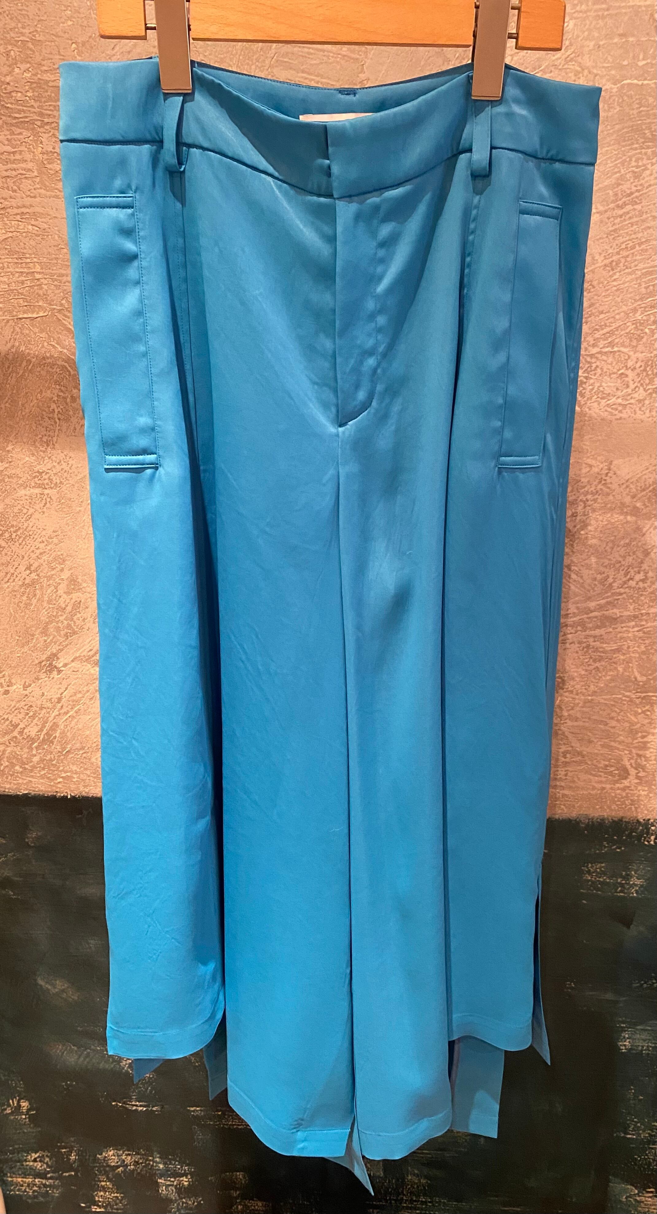 上品な光沢感で、オチ感がキレイなパンツ。裾の段差のあるデザインがポイント。歩くたびに動きが出るデザインが素敵。発色も綺麗で、スタイリングのポイントに♪