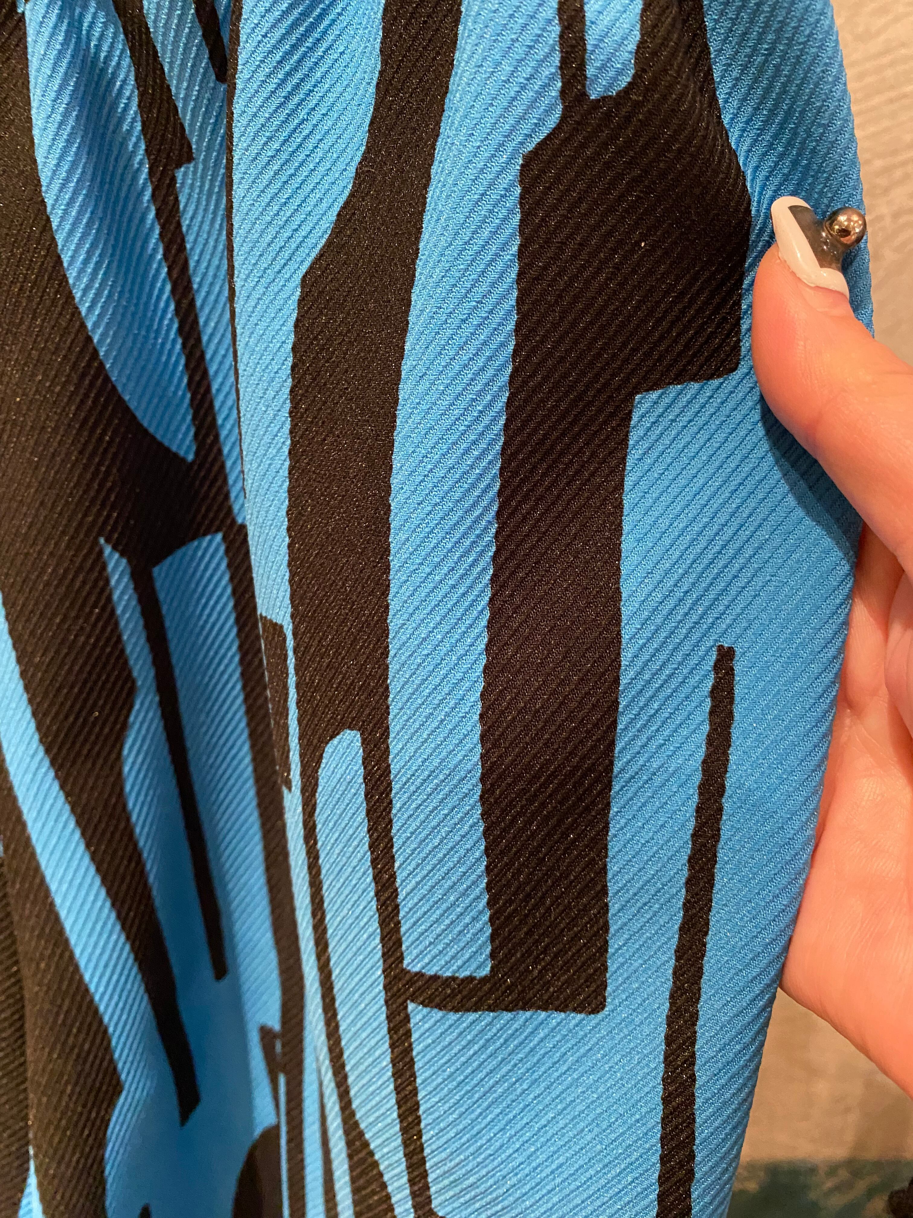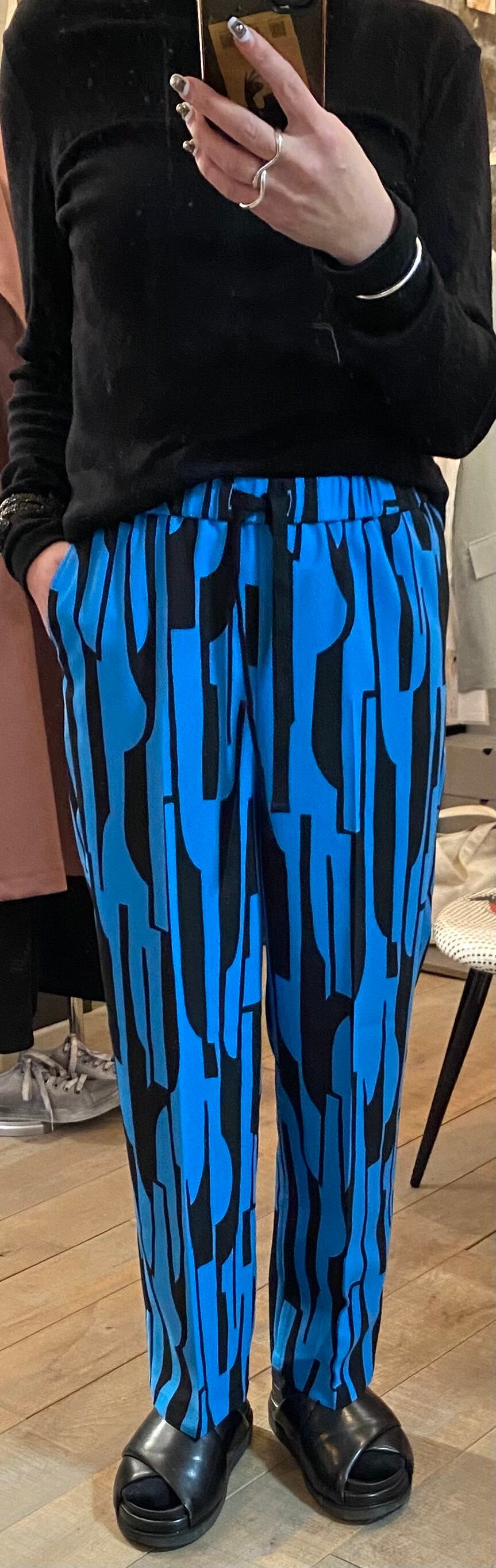 大胆な幾何学プリントが印象的なパンツ。ゆゆとりのあるストレートシルエットで、脚のラインを拾いにくく程よいリラックス感のあるパンツ。程よい肉感の素材で綾目がはっきり出ているので、素材に立体感があります。ナチュラルストレッチで履き心地も良く、シーズンレスで着用可能。スタイリングのポイントに♪