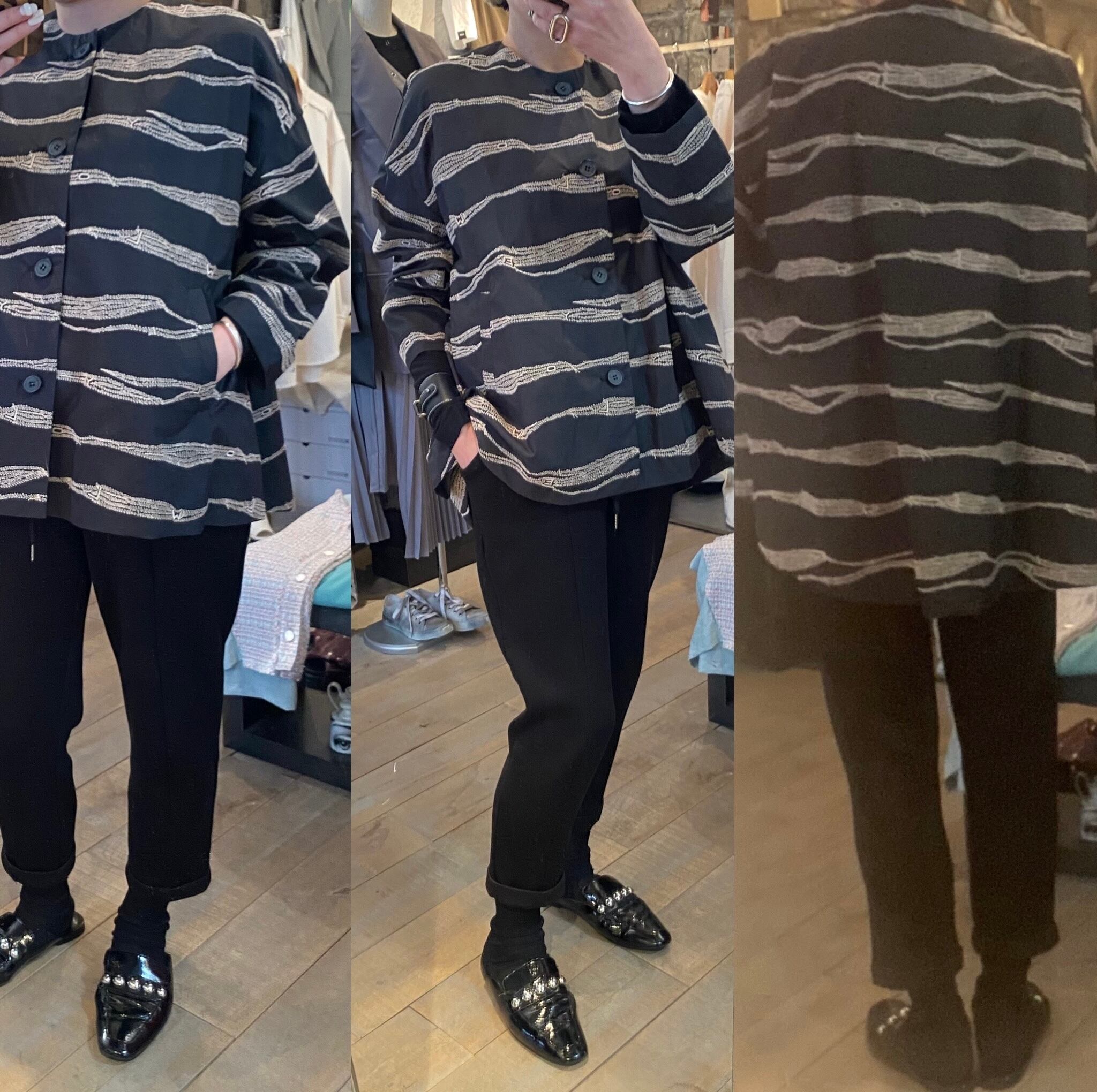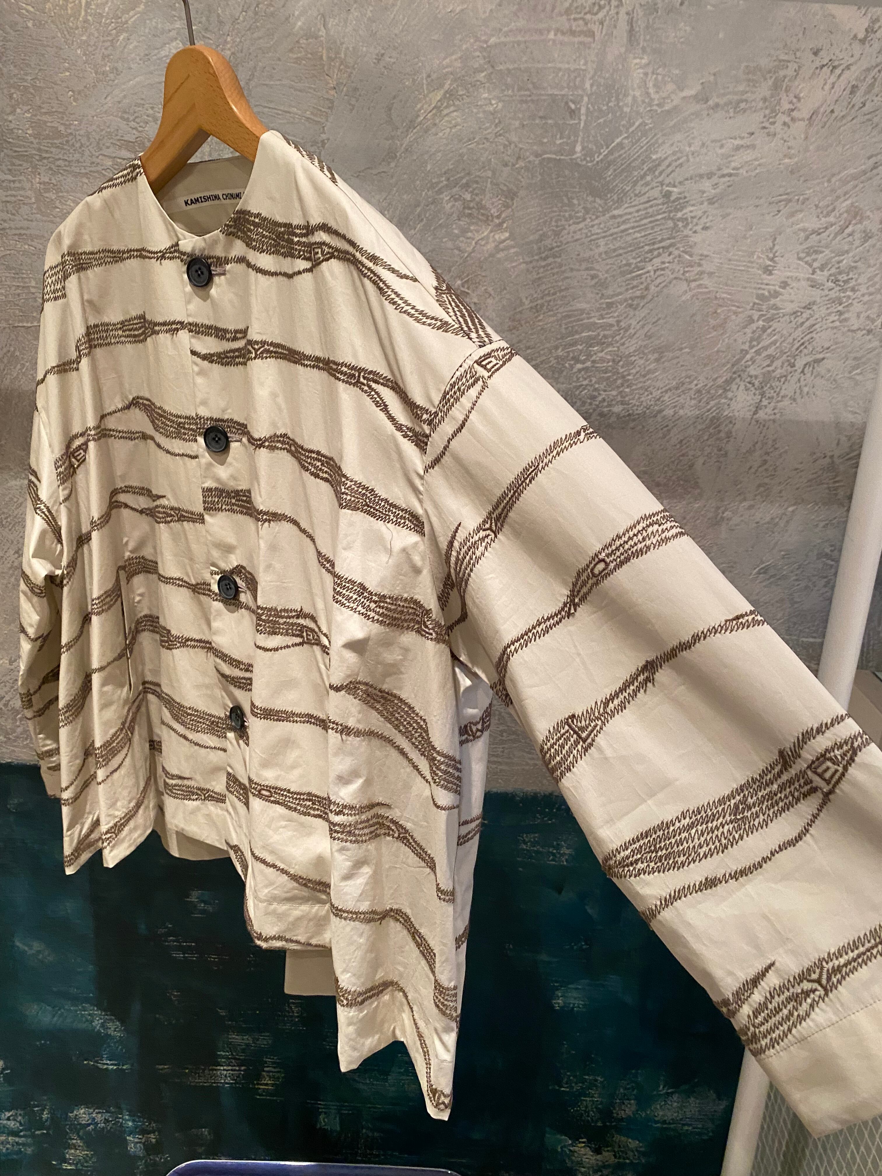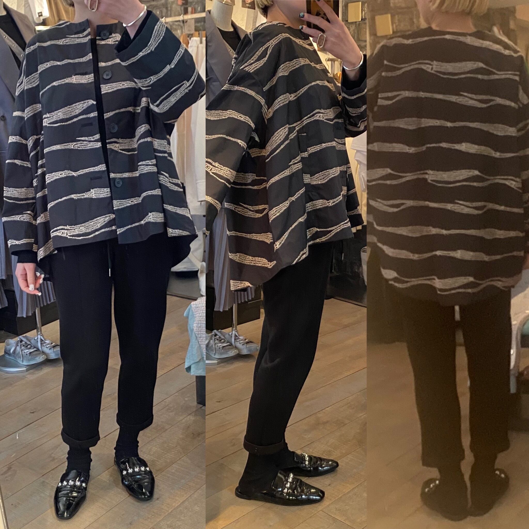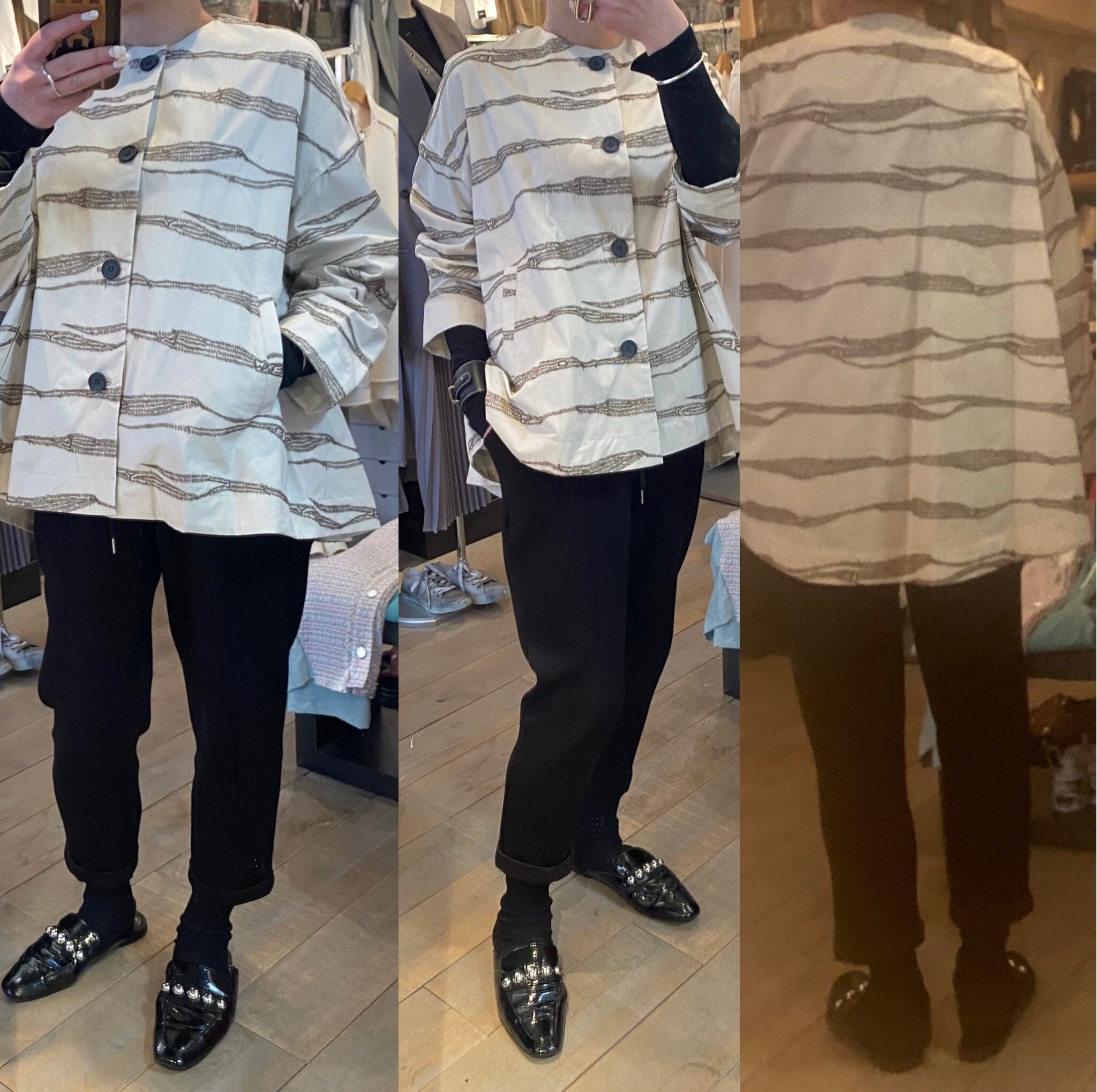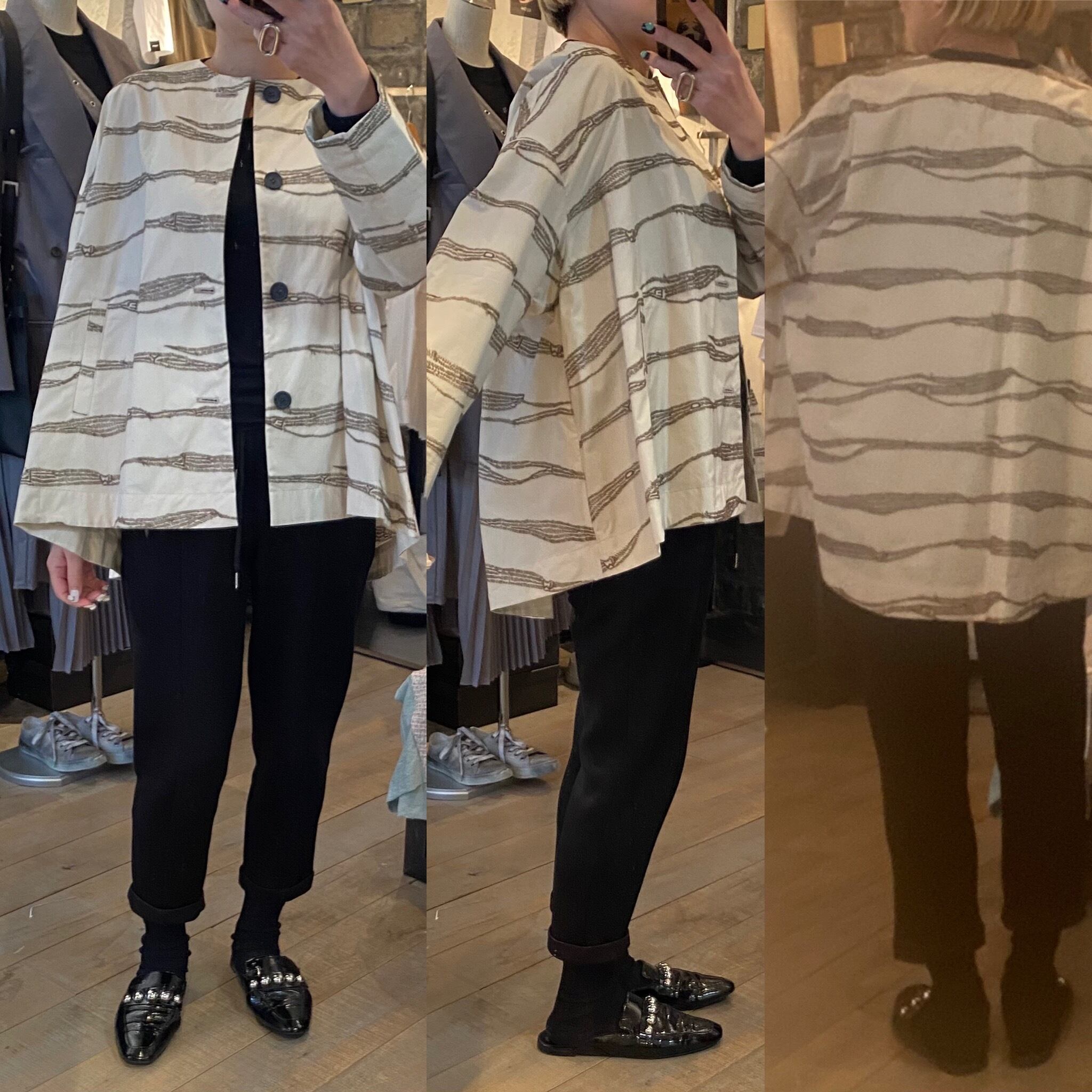 ノーカラービッグフレアブルゾン。ダイナミックに広がる裾ラインが特徴です。前後差のあるヒップの隠れるラウンドカットの着丈、ゆとりのある身巾、ドロップショルダーです。袖は袖口から肘にかけてダーツの入った長袖になっています。ボリューミーな分量感ながら、軽快は素材感のため、パッと羽織って頂けます。両サイド片玉緑ポケット付き、裏地はなく一重になり、総パイピング仕上げになっています。とても軽めの素材でカーディガン感覚で羽織れるブルゾンです♪