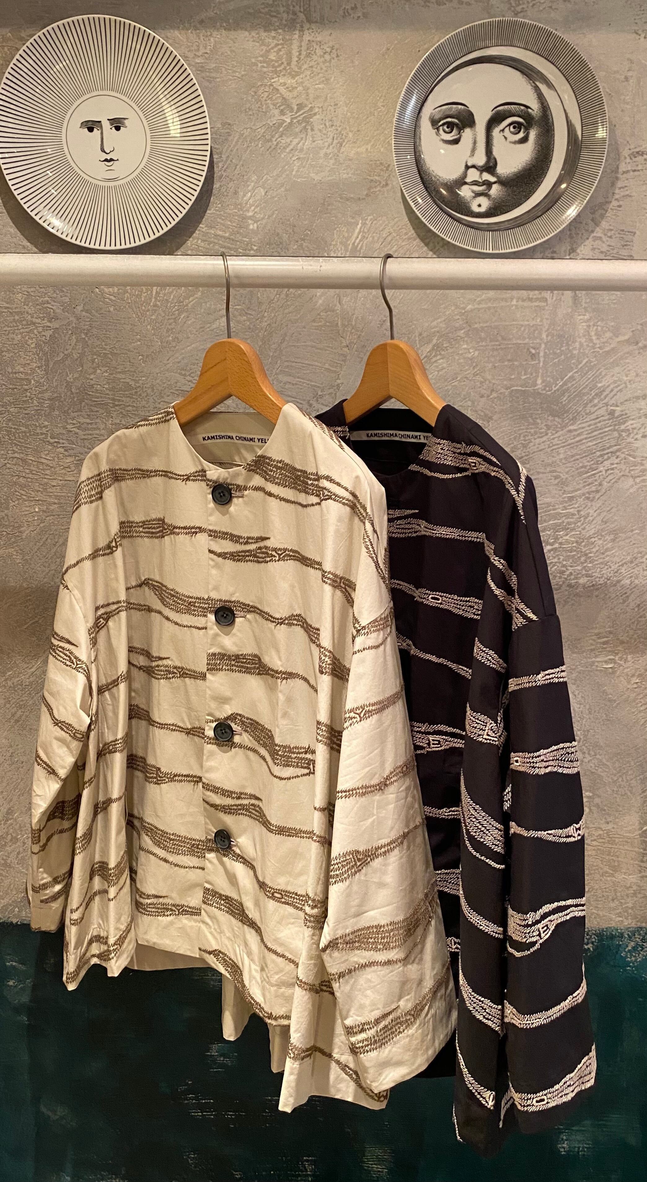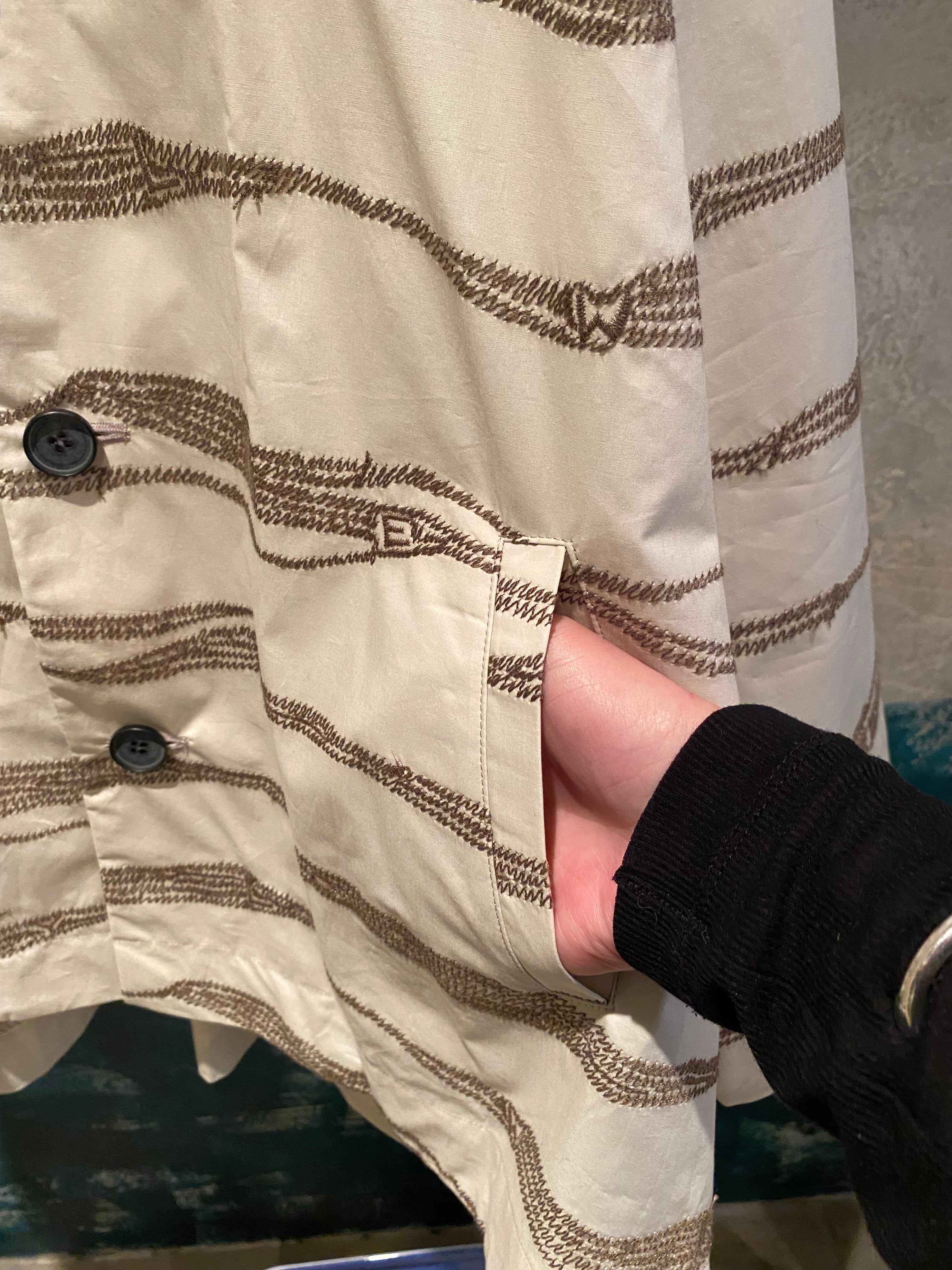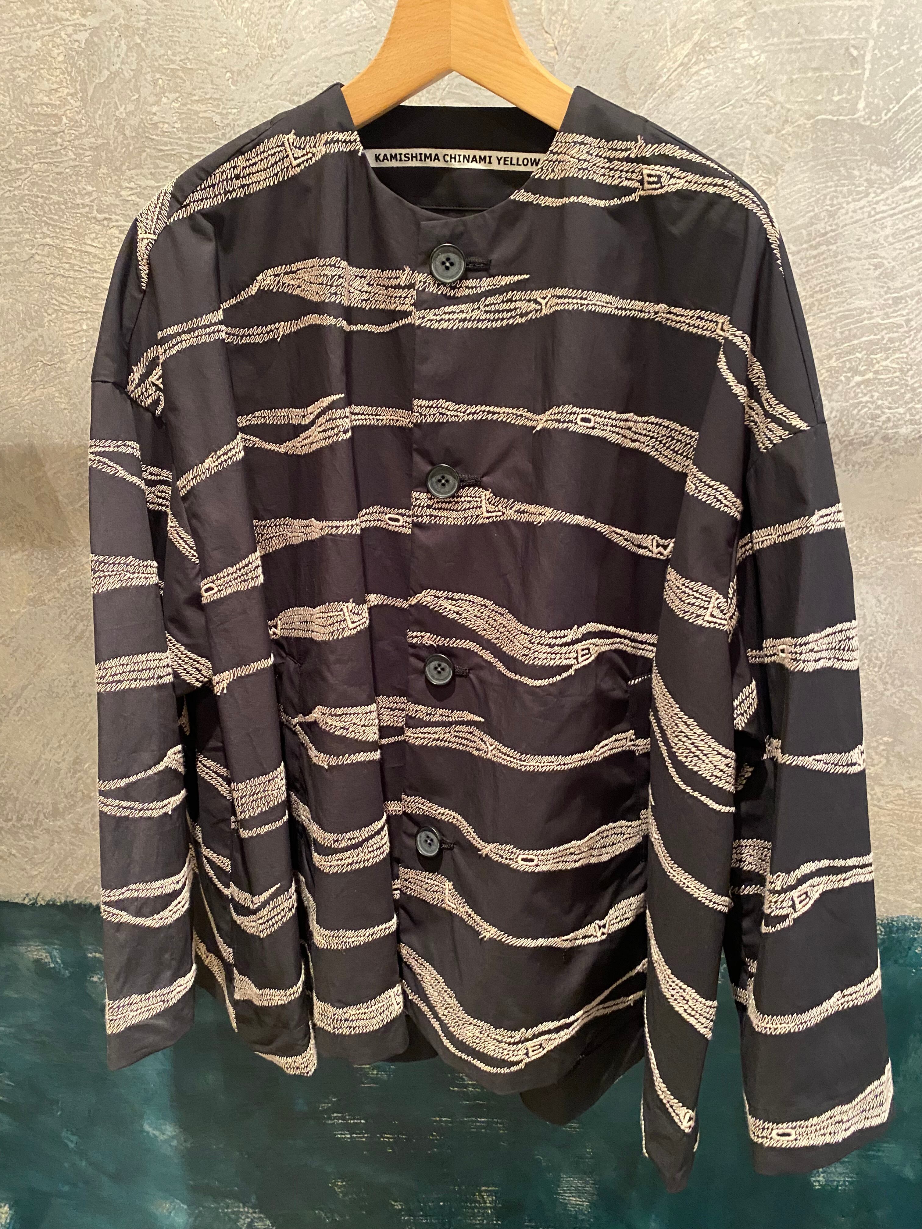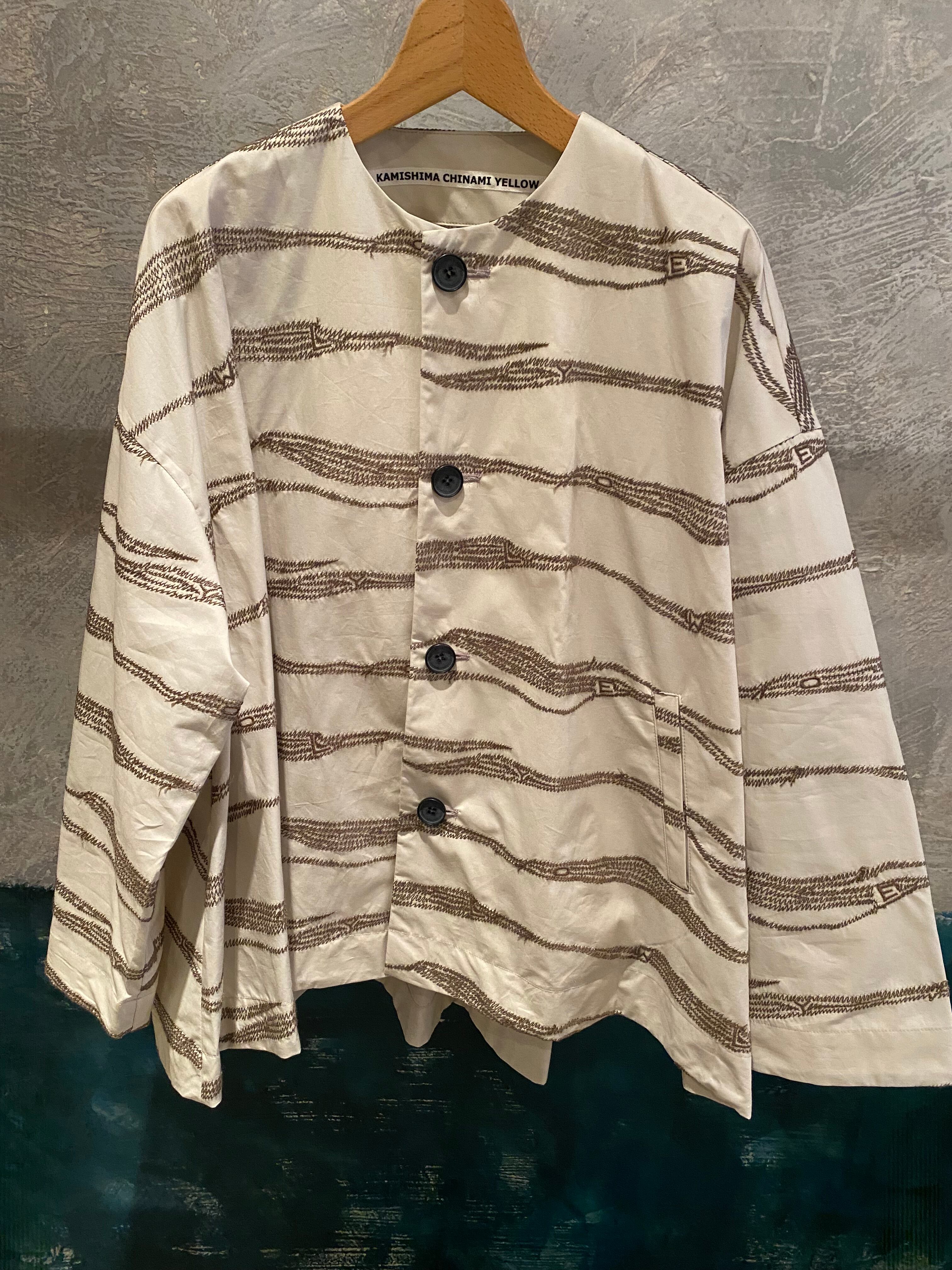 素材は、超長面スーピマコットンを使用し、経160本、緯130本を打ち込んだ高密度タイプライター素材に極太のポリエステルマット糸でオリジナル刺繍を施しました。手書きのギザギザゼブラ模様の中に「YELLOW」の6文字を所々に忍ばせた遊び心ある刺繍柄です♪