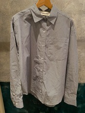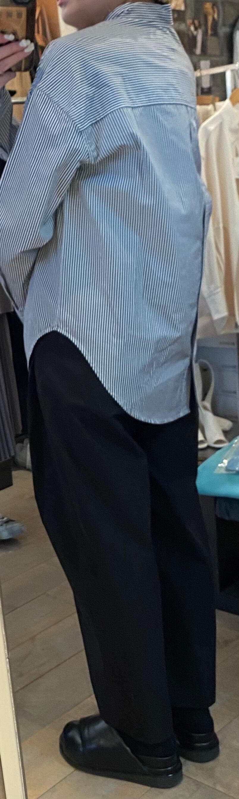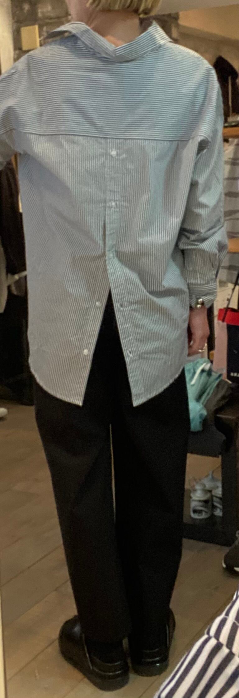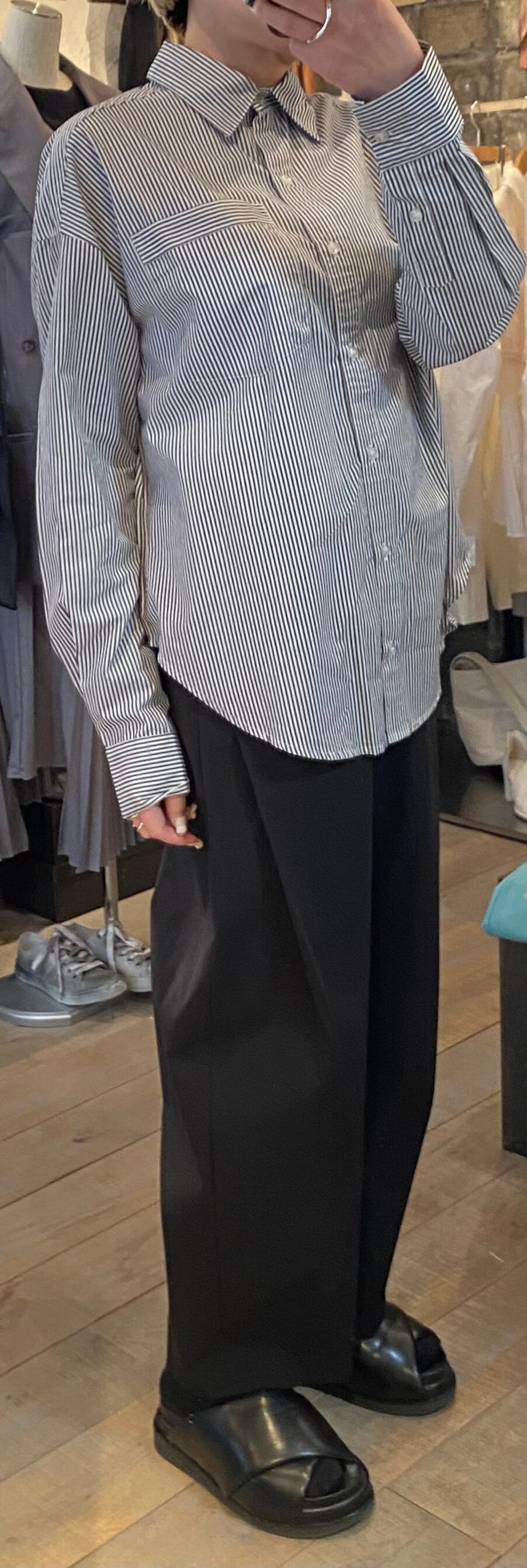 ベーシックなストライプシャツをベースにバックスタイルでボタンが開閉できるデザインになっており、お好みの位置までスリットを開けて頂ける shirt。シーズンレスで着回せるのも嬉しいところ。