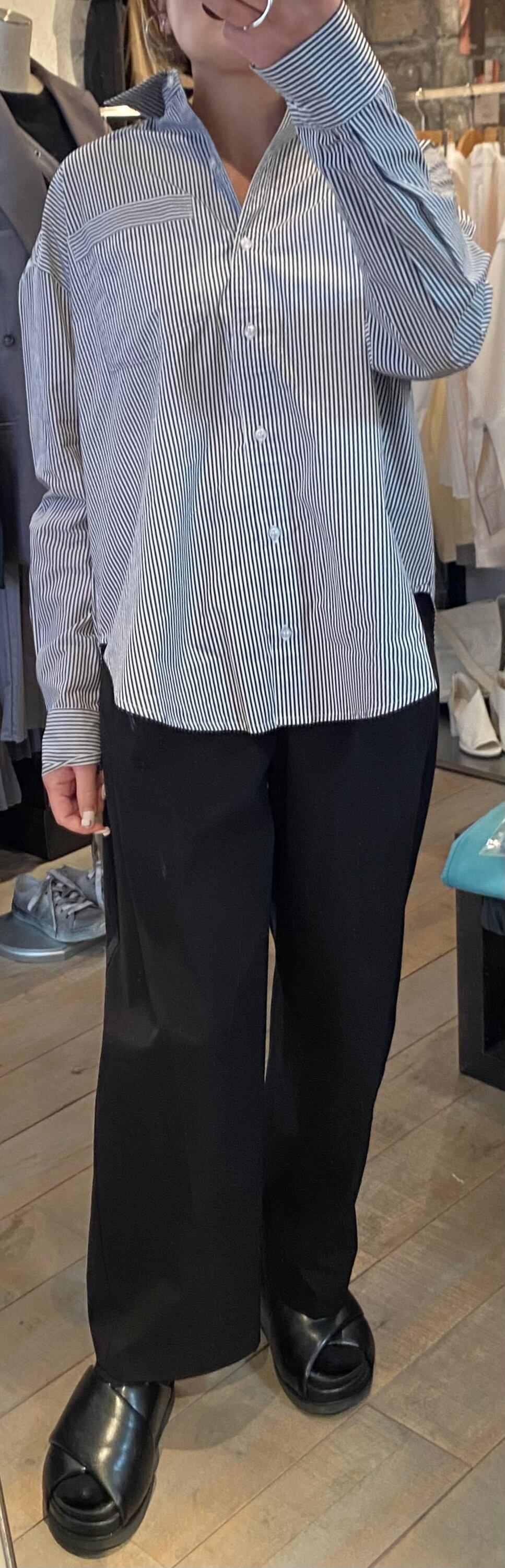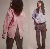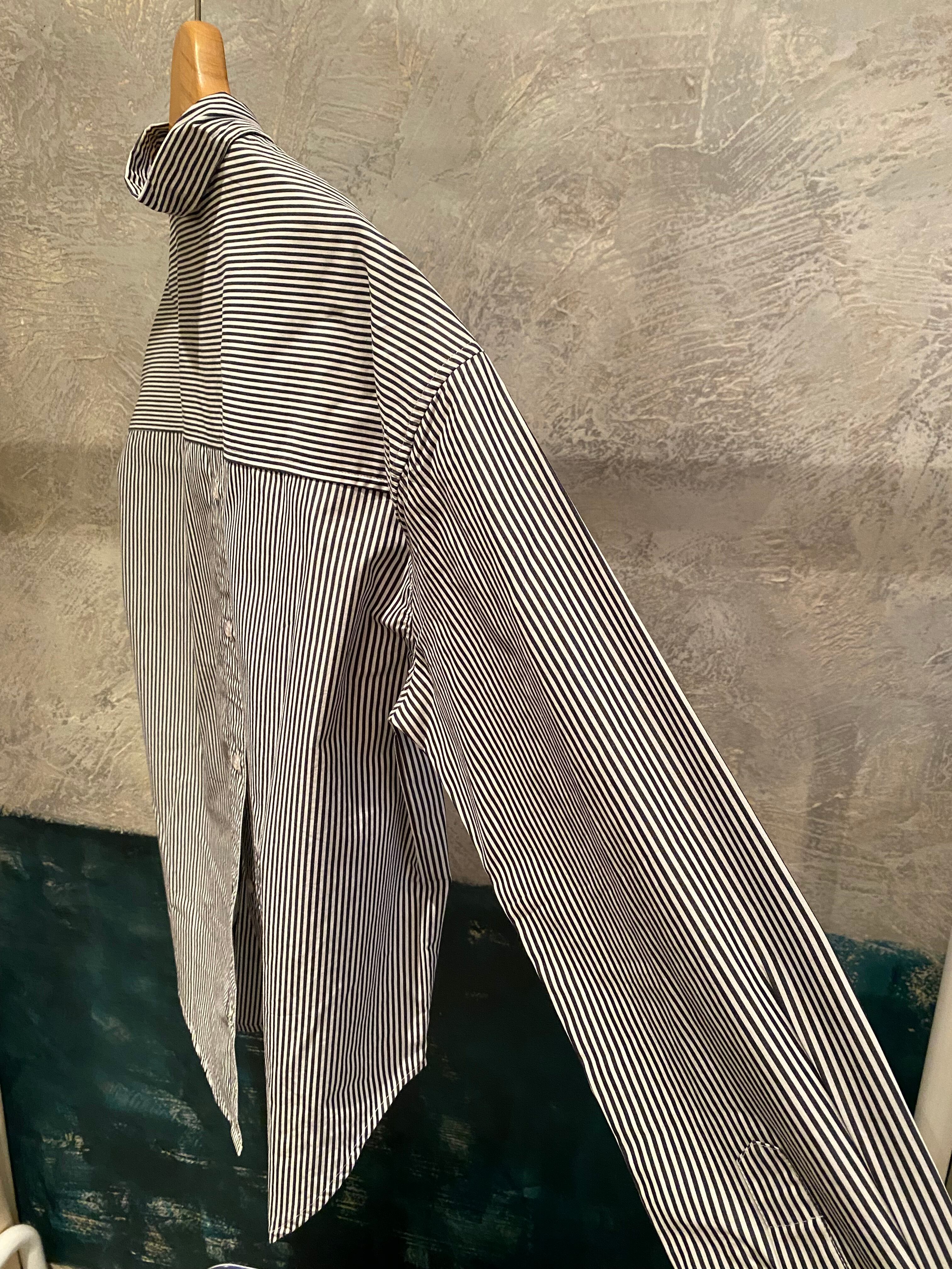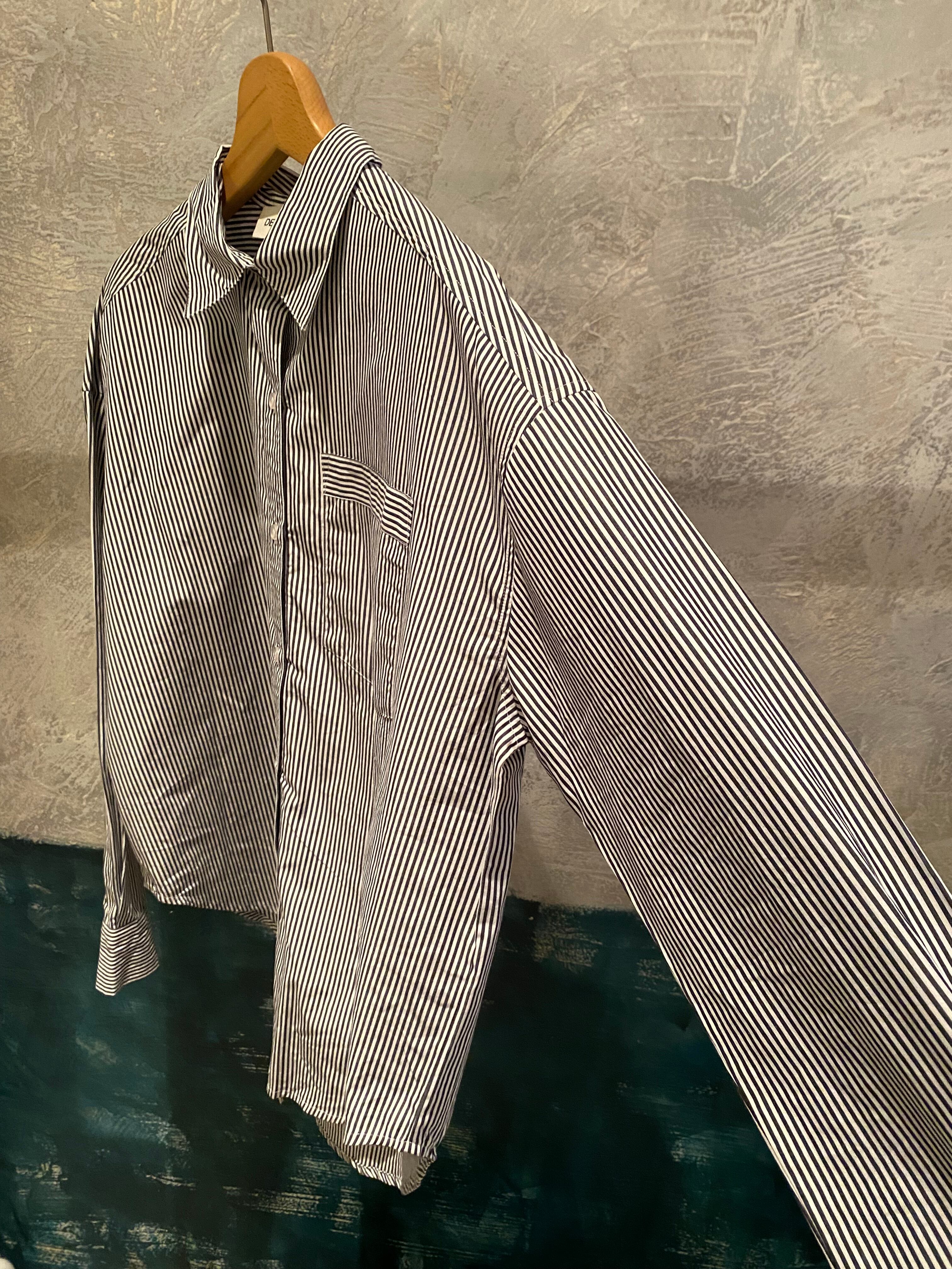 ベーシックなストライプシャツをベースにバックスタイルでボタンが開閉できるデザインになっており、お好みの位置までスリットを開けて頂ける shirt。シーズンレスで着回せるのも嬉しいところ。