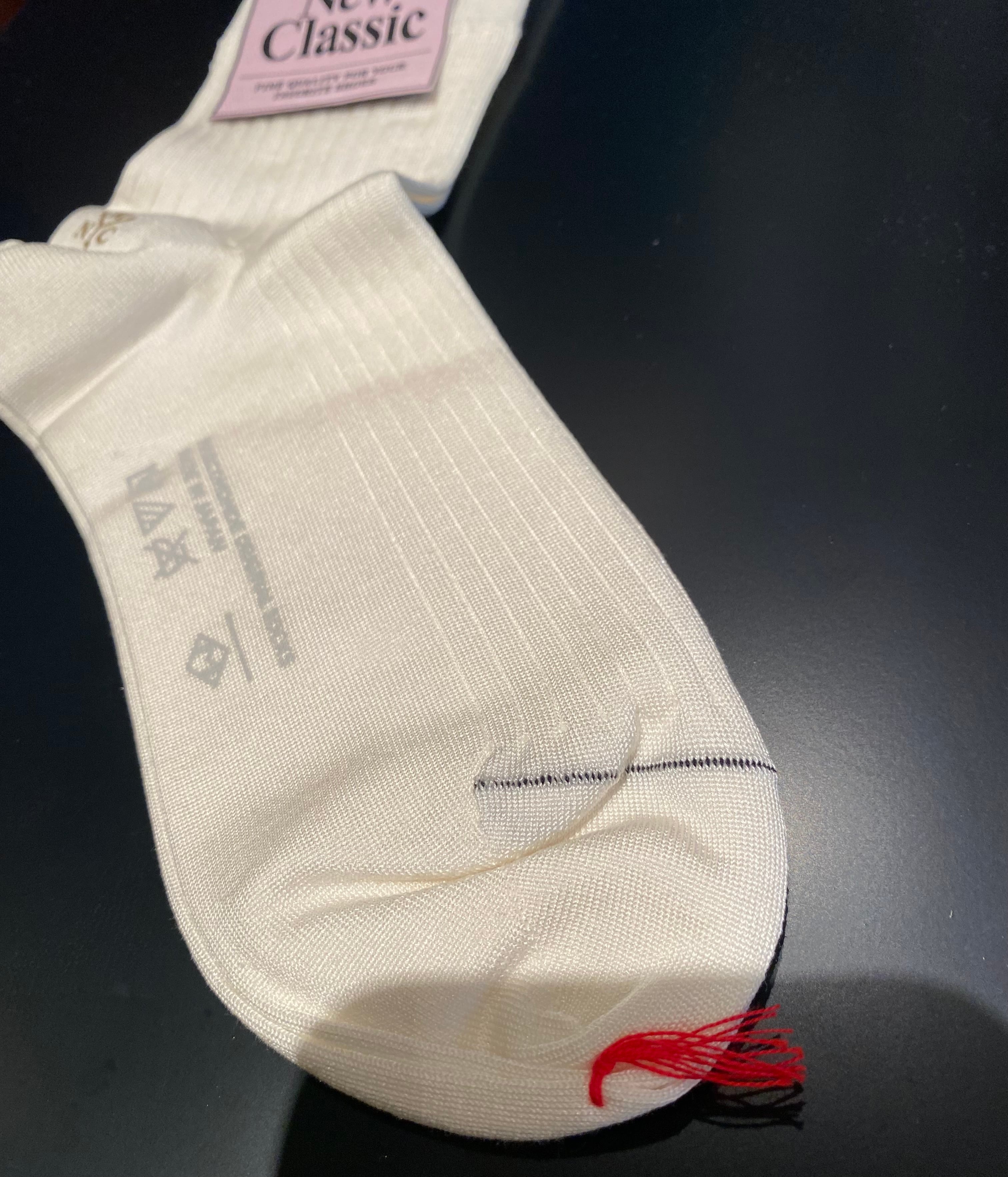 シルクの中でもハイクオリティーとされる、国内で染色された上質な光沢のあるシルク(100%)を表糸に使用したソックス。お気に入りの靴を履くときに是非選んで頂きたい特別なソックスです。配色になっている爪先のリンキングもポイントです♪